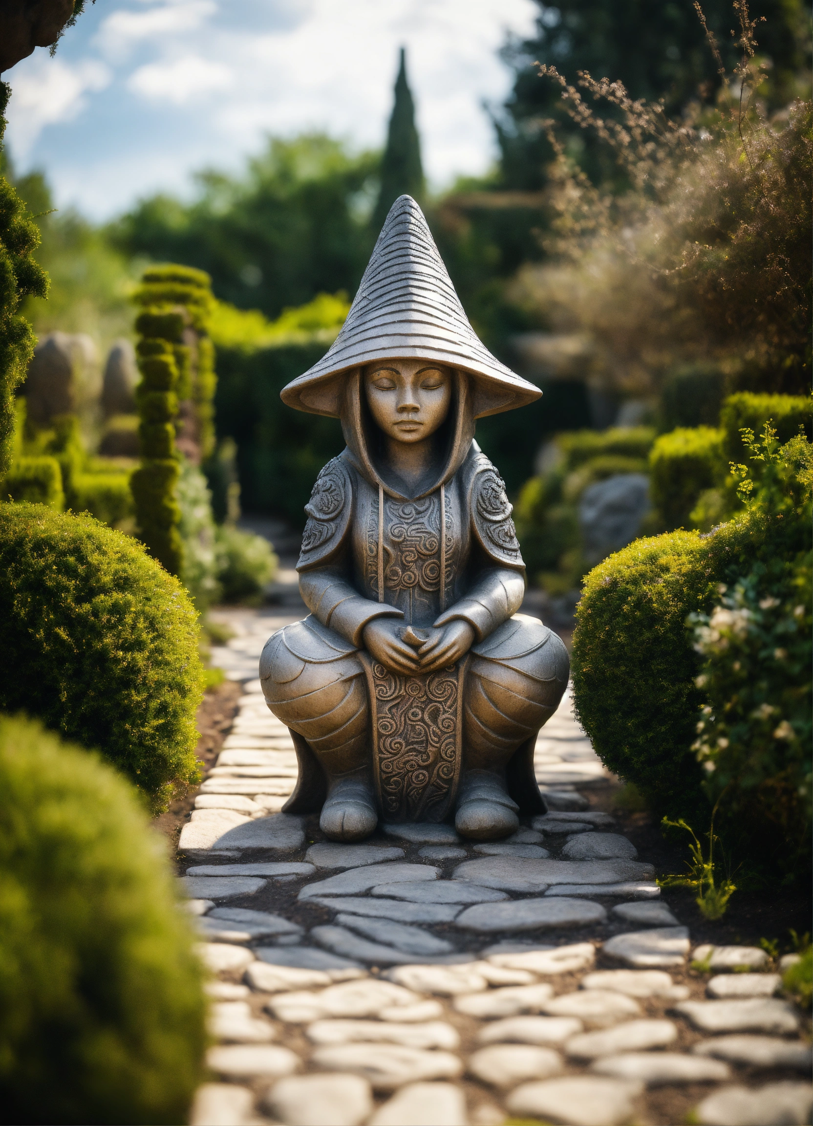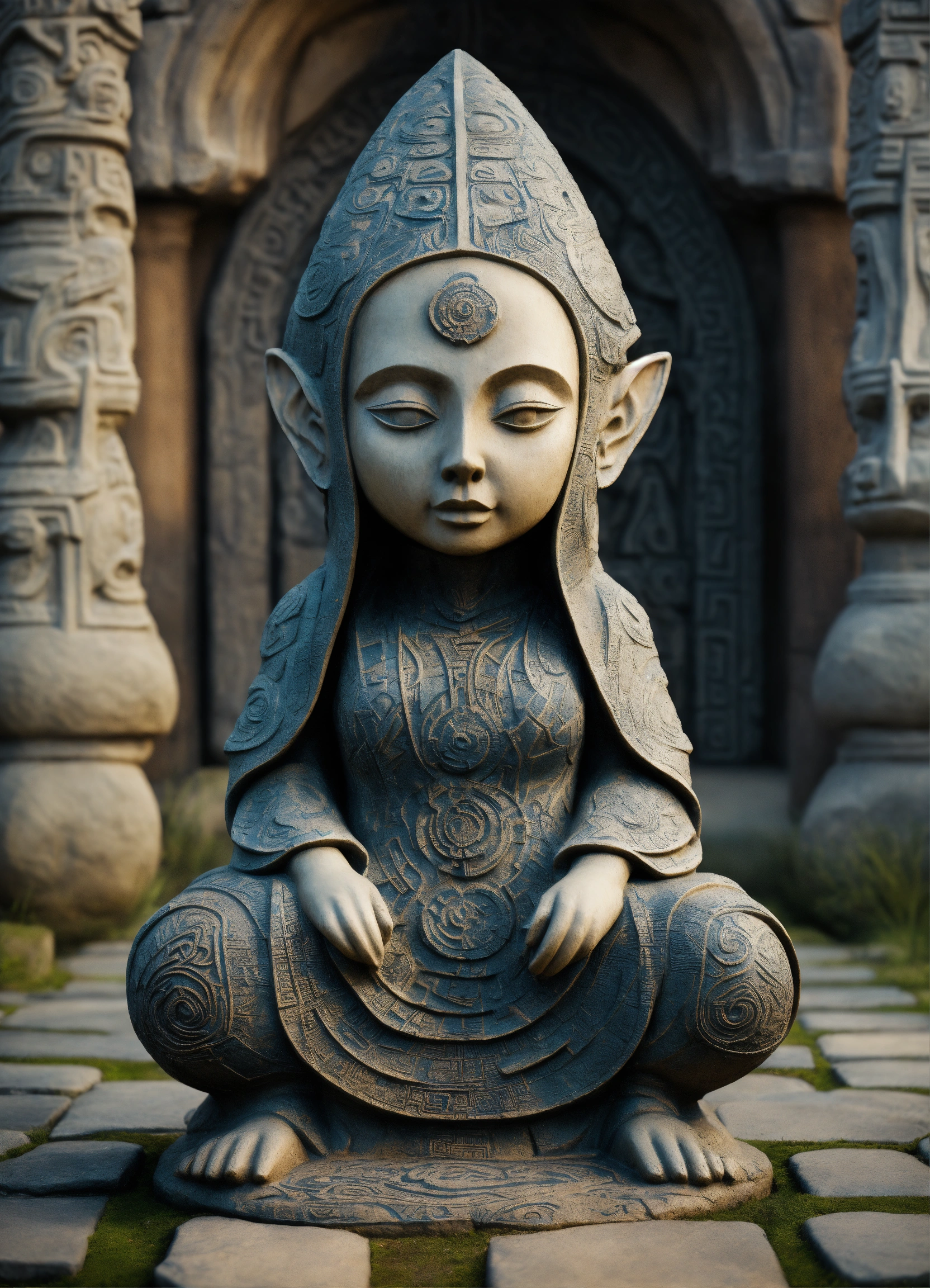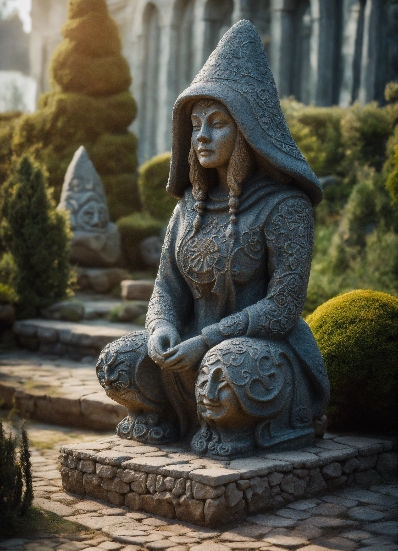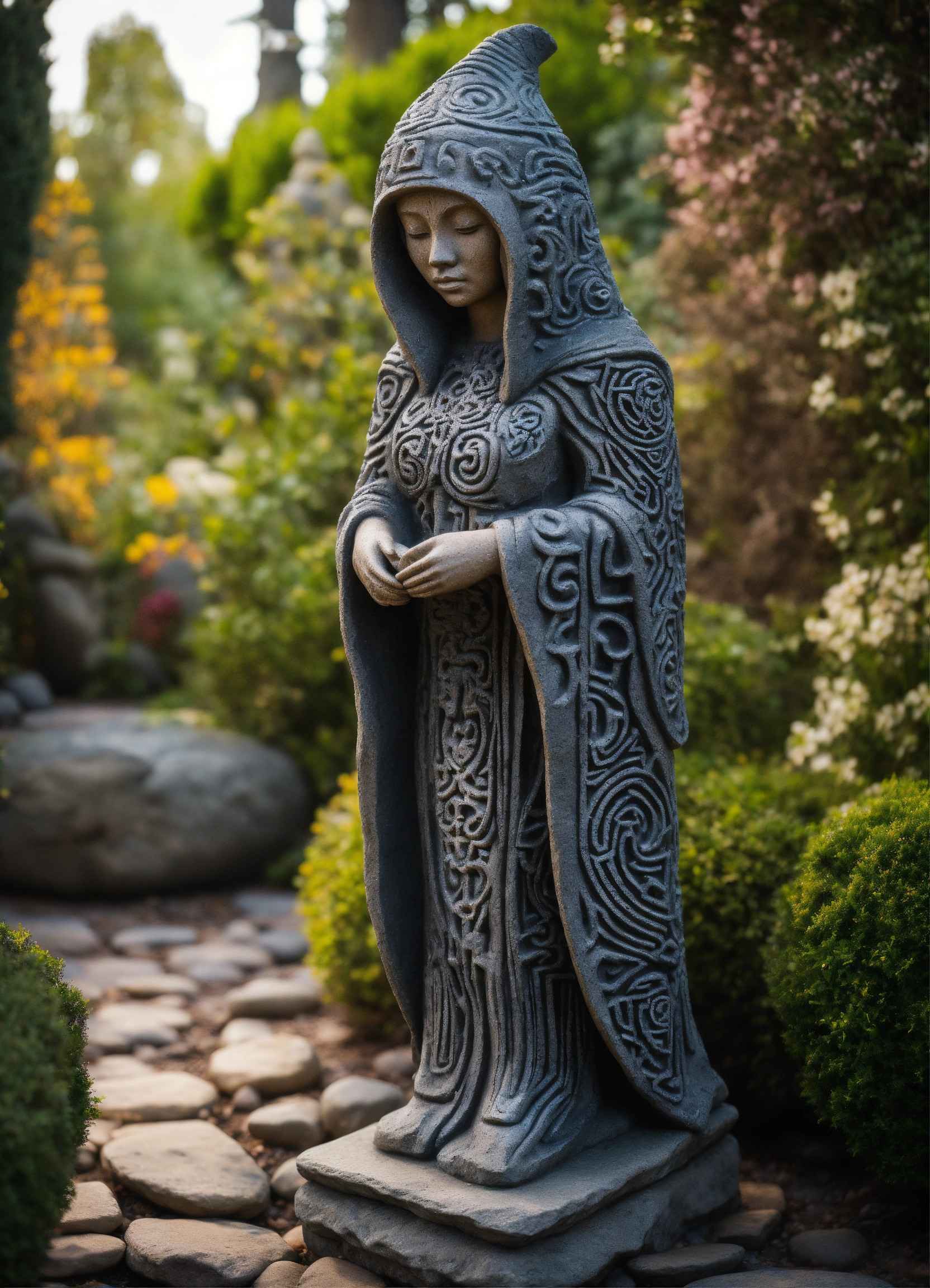 An ancient spiritual hooded female gnome, stone pathway rock garden.sculptured . style of alex grey, giger.unreal engine.totem sculptures. patterned stone pathway, labyrinth.courtyard.meditative.