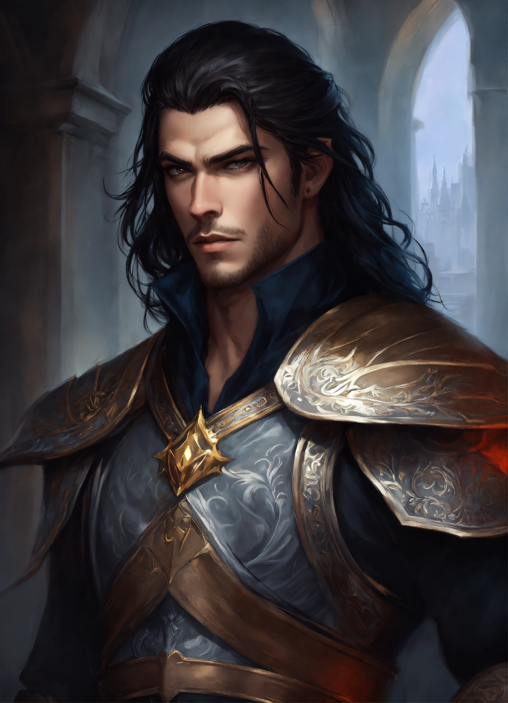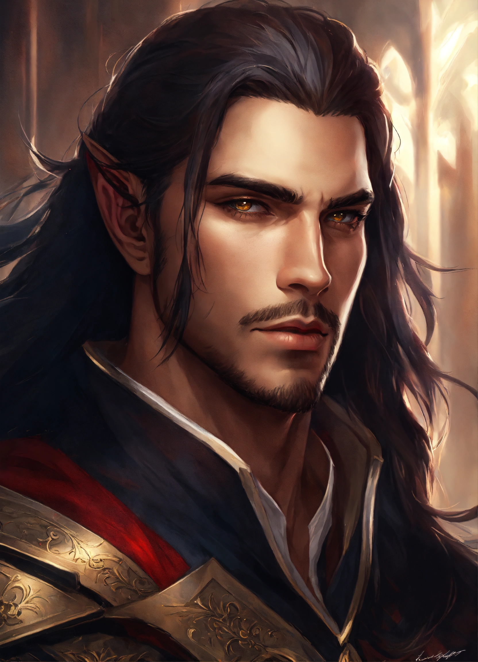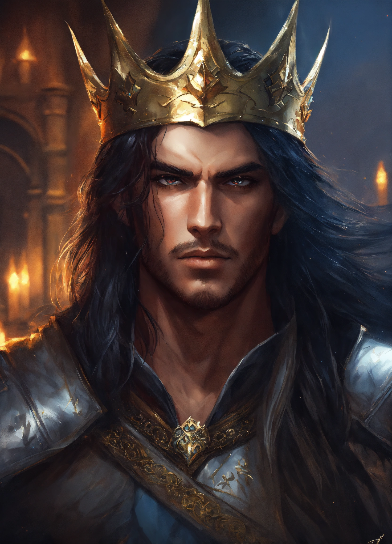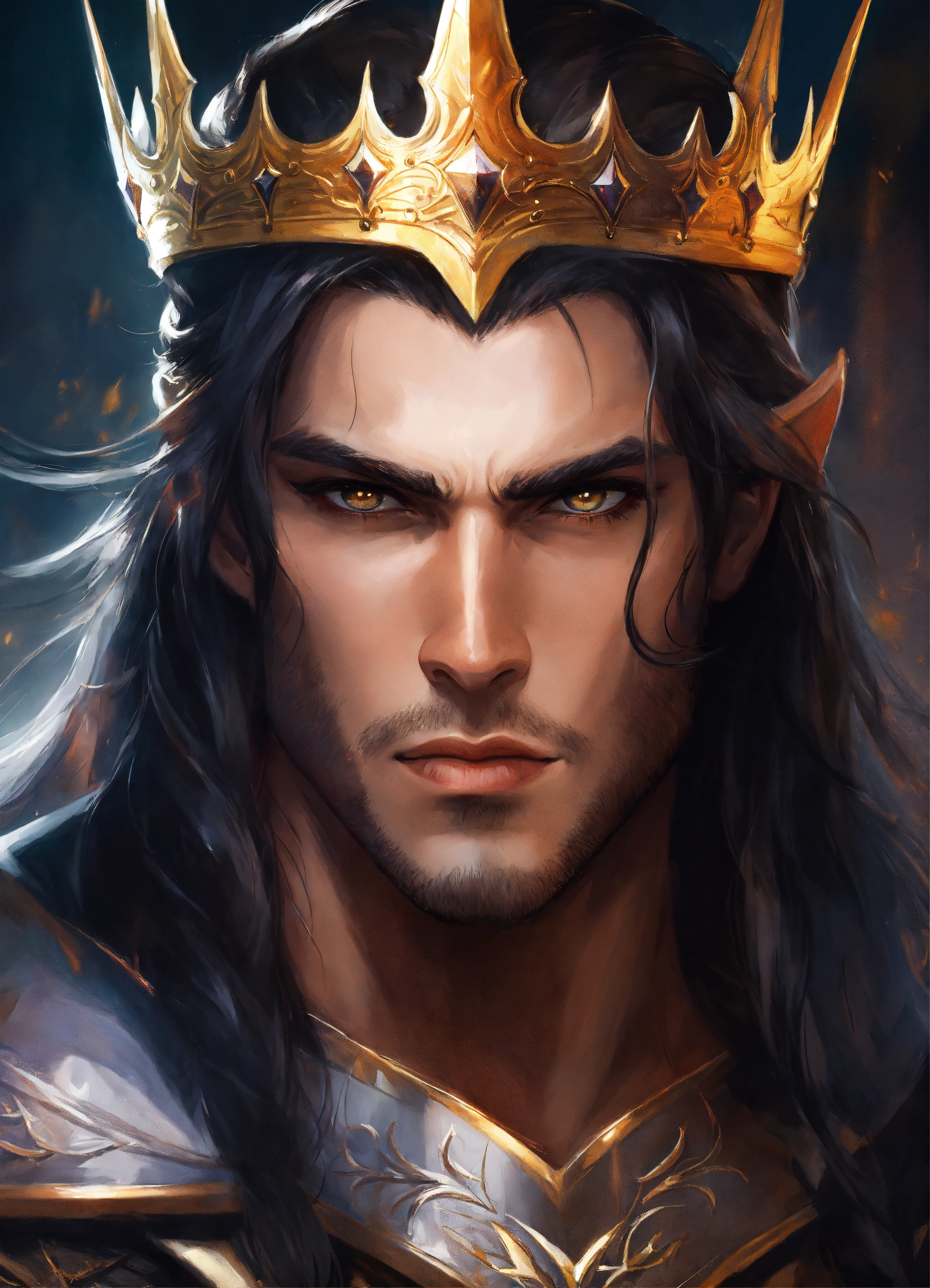 Medieval fantasy, fierce, digital art, art by artgerm, prince, male, rugged, king, evil, handsome man, long hair, crown, black hair, royalty, elf