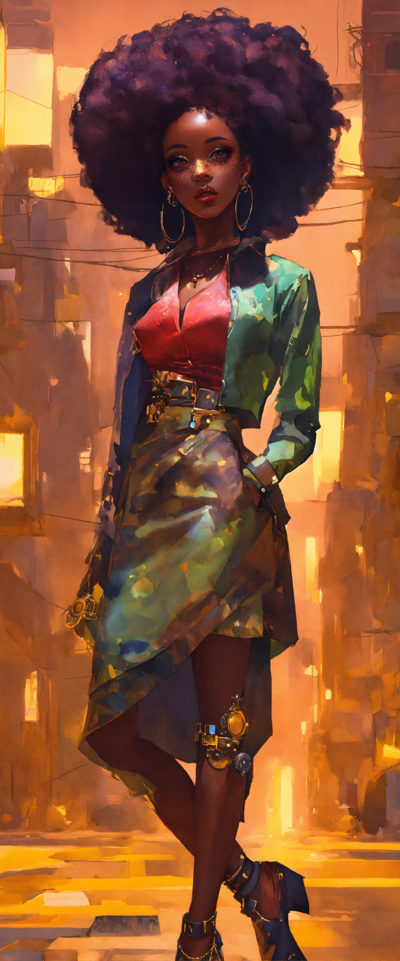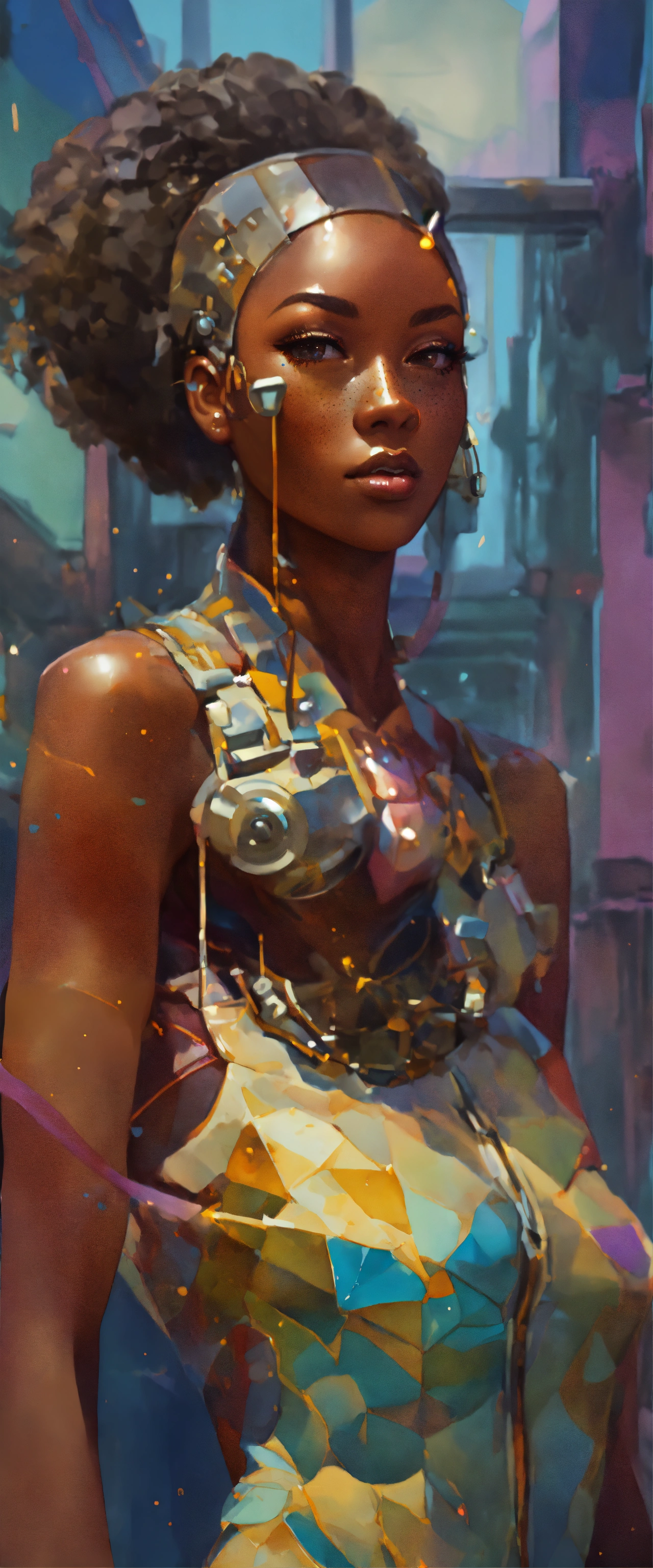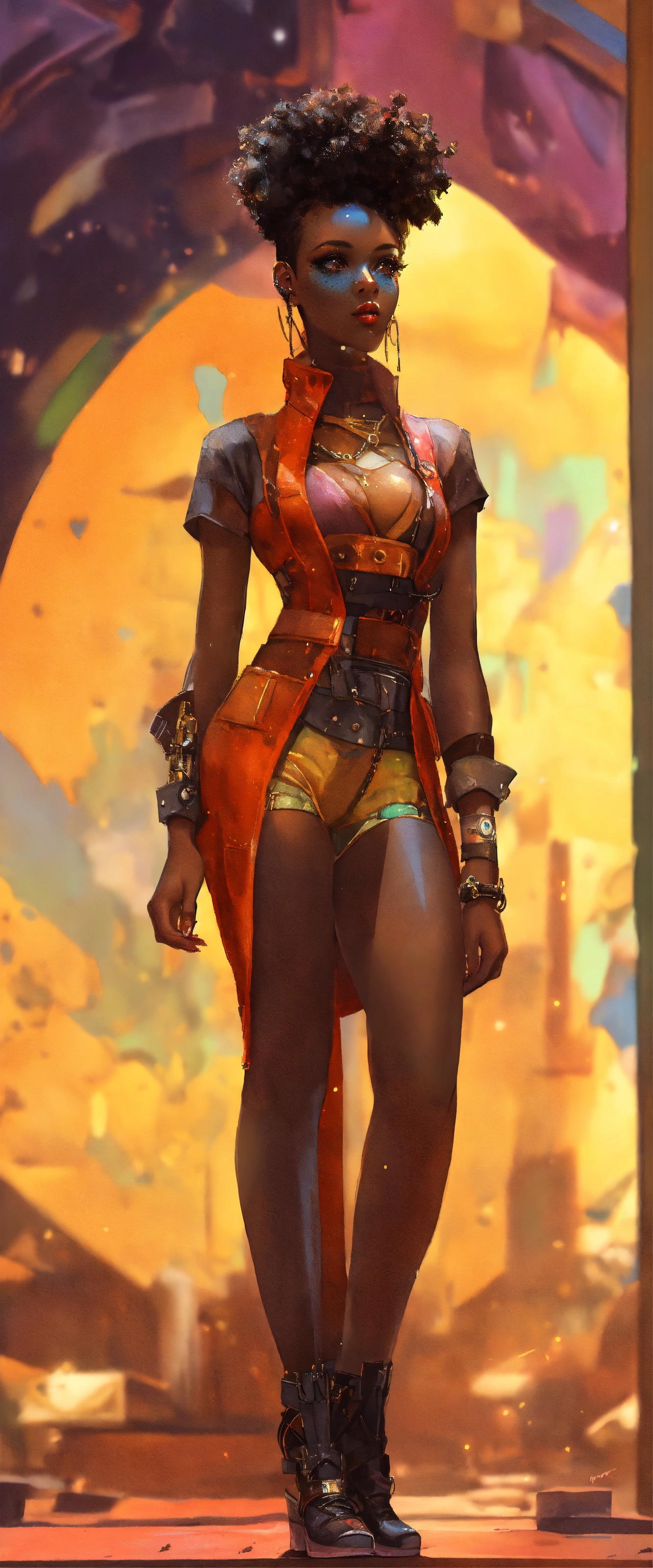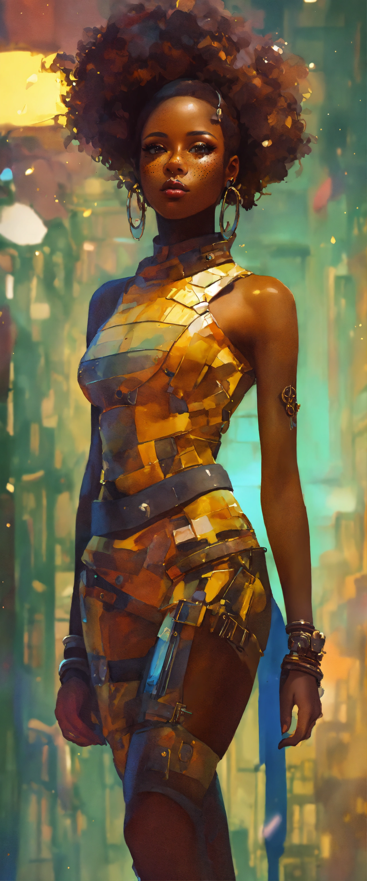 Full length portrait, surreal mechanical punk, fully clothed dark nigerian complexion african american plus full figure woman, rich surreal glasslike skin with a smattering of freckles, beautiful woman, extreme makeup aesthetic, hyper realistic, warm cam, sharp detail, back twinkle lighting, fractured low poly watercolor background, ghibli cartoon style, rule of thirds