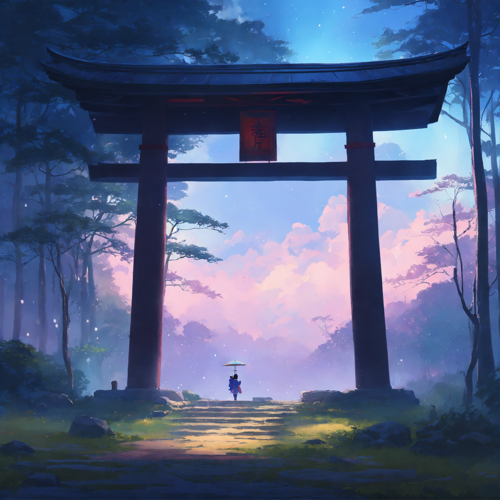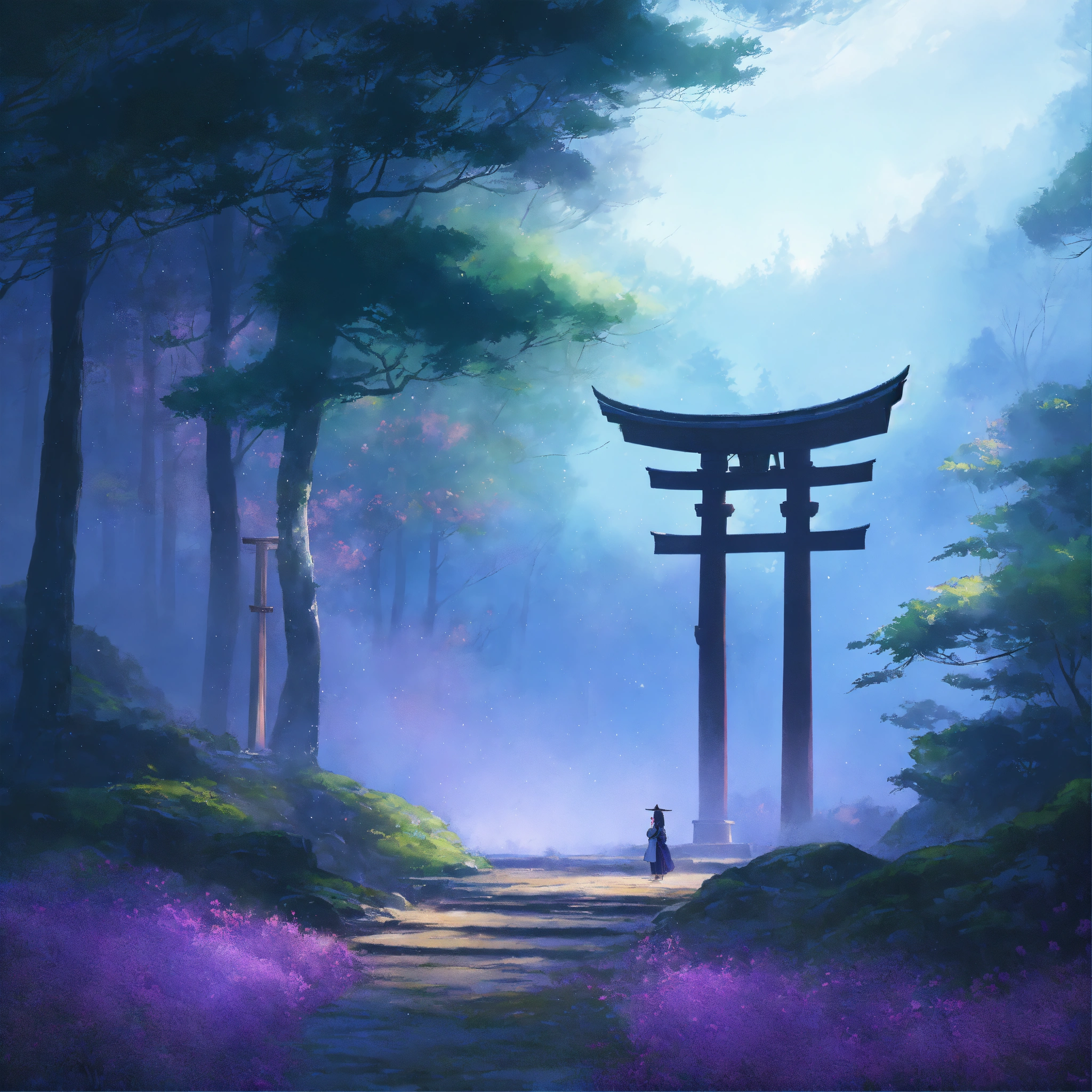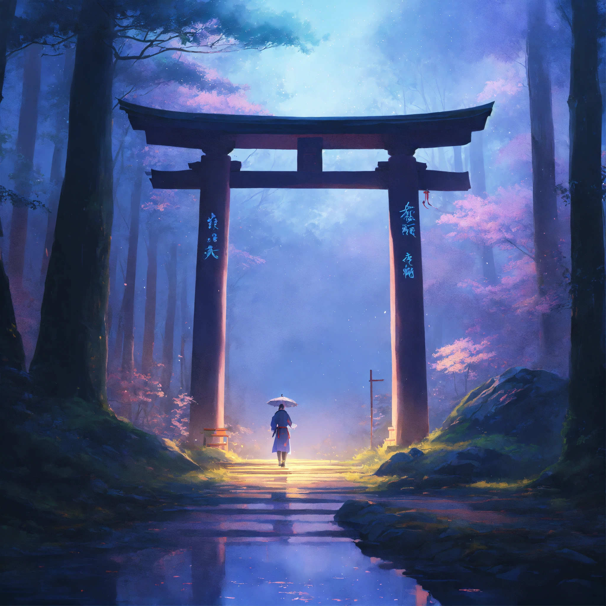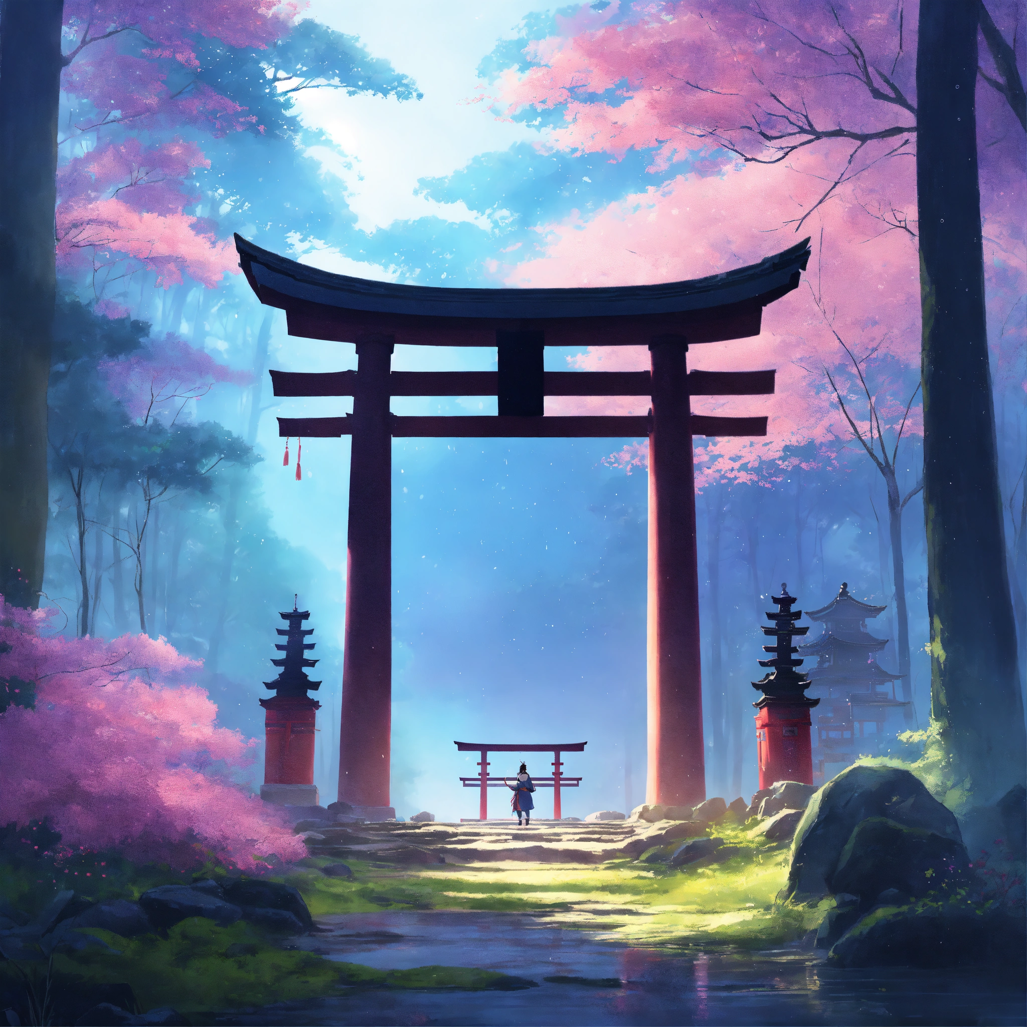 Place an ancient, large weathered stone of a samurai warrior and torii gate in the middle of a forest, partially covered by mist, surrounded by a dreamy, pastel-colored backdrop. the scene exudes a sense of peace and contentment despite the rain. digital art painting by makoto shinkai and ghibli studio, diffuse lighting, cinematic, lighting, highly detailed, incredible quality gazing up at a starry night sky. soft hues of blues and purples dominate the color palette, creating a dreamy atmosphere.
