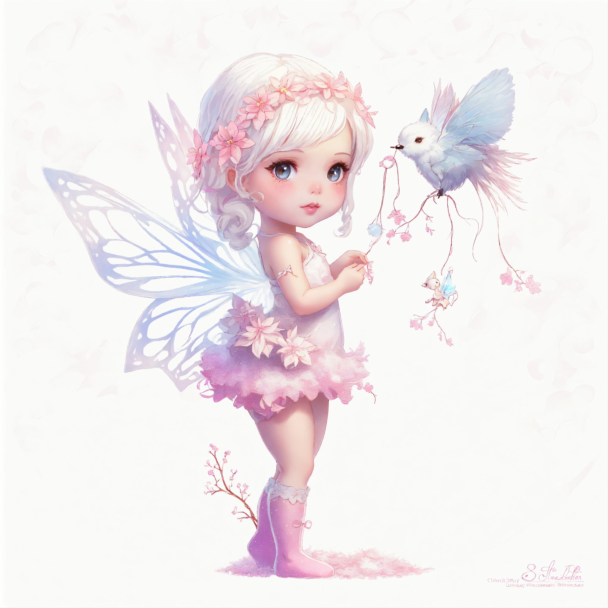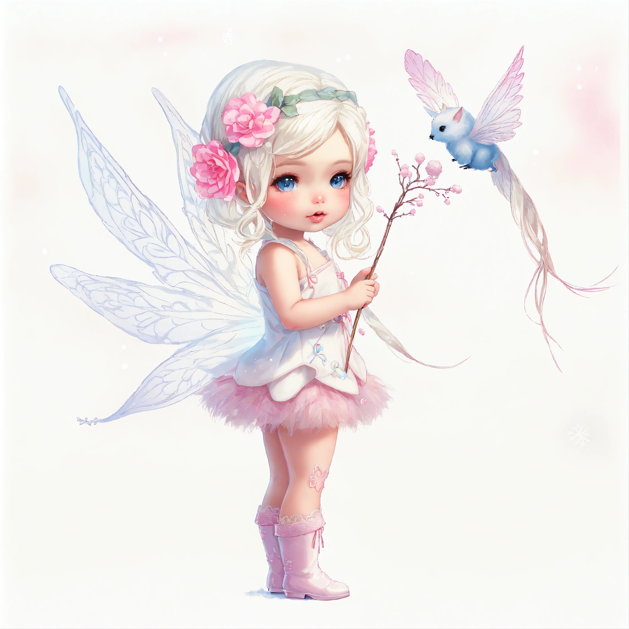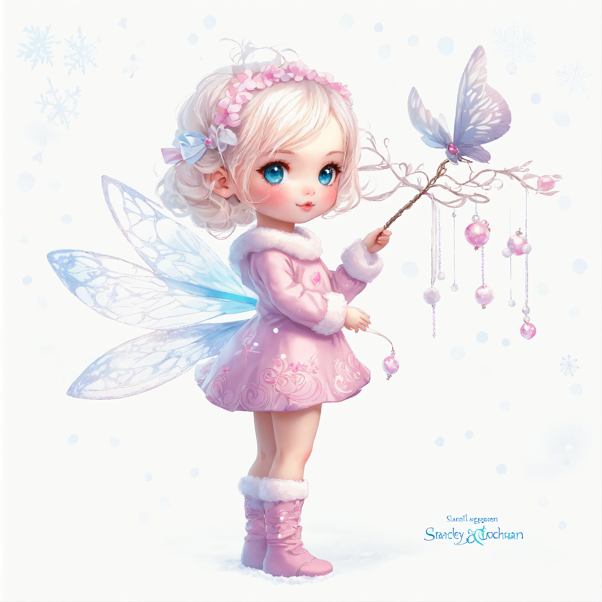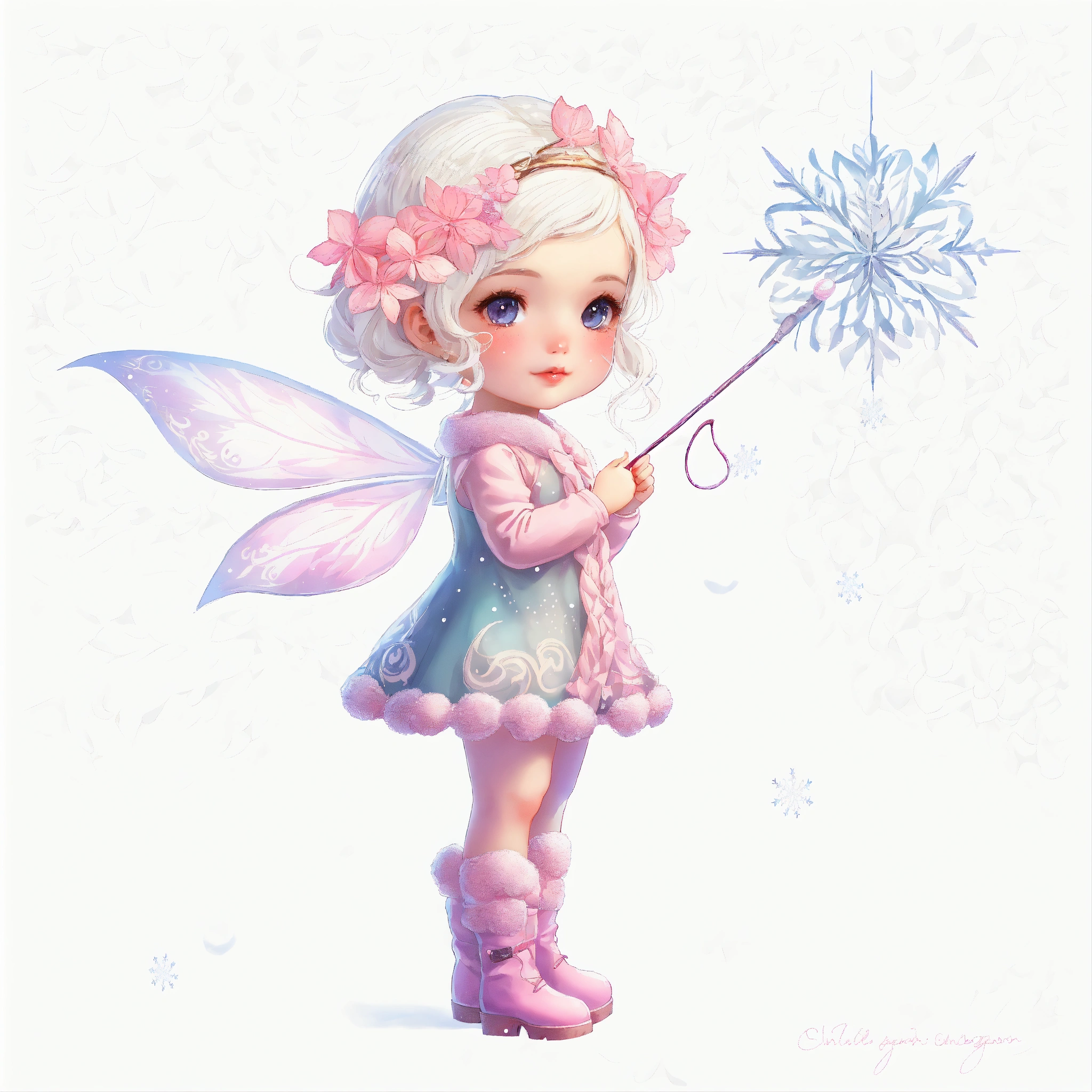 Full body of a realistic sweetness baby chibi snow fairy girl winter freckled two braids in her long white blonde hair she is playing in a enchanted winter magic garden, clipart digital art style, pink colors, very detailed, by stanley artgerm and tom bagshaw, 32k