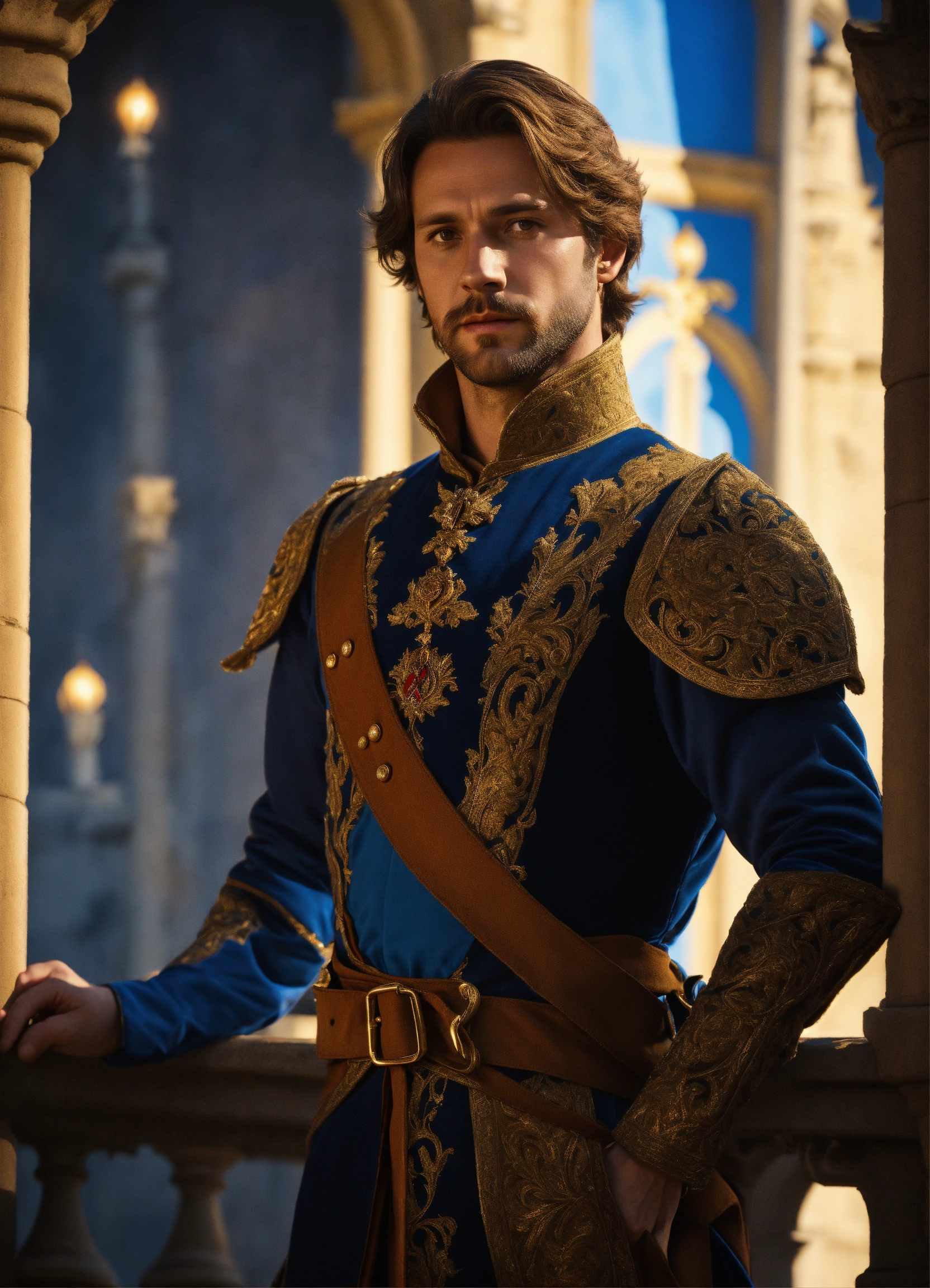 Realistic, slim prince, 35 years old, light brown hair, short beard, blue and gold royal medieval clothes, features of an evil person, on the balcony of a royal castle, energetic, cinematic lighting