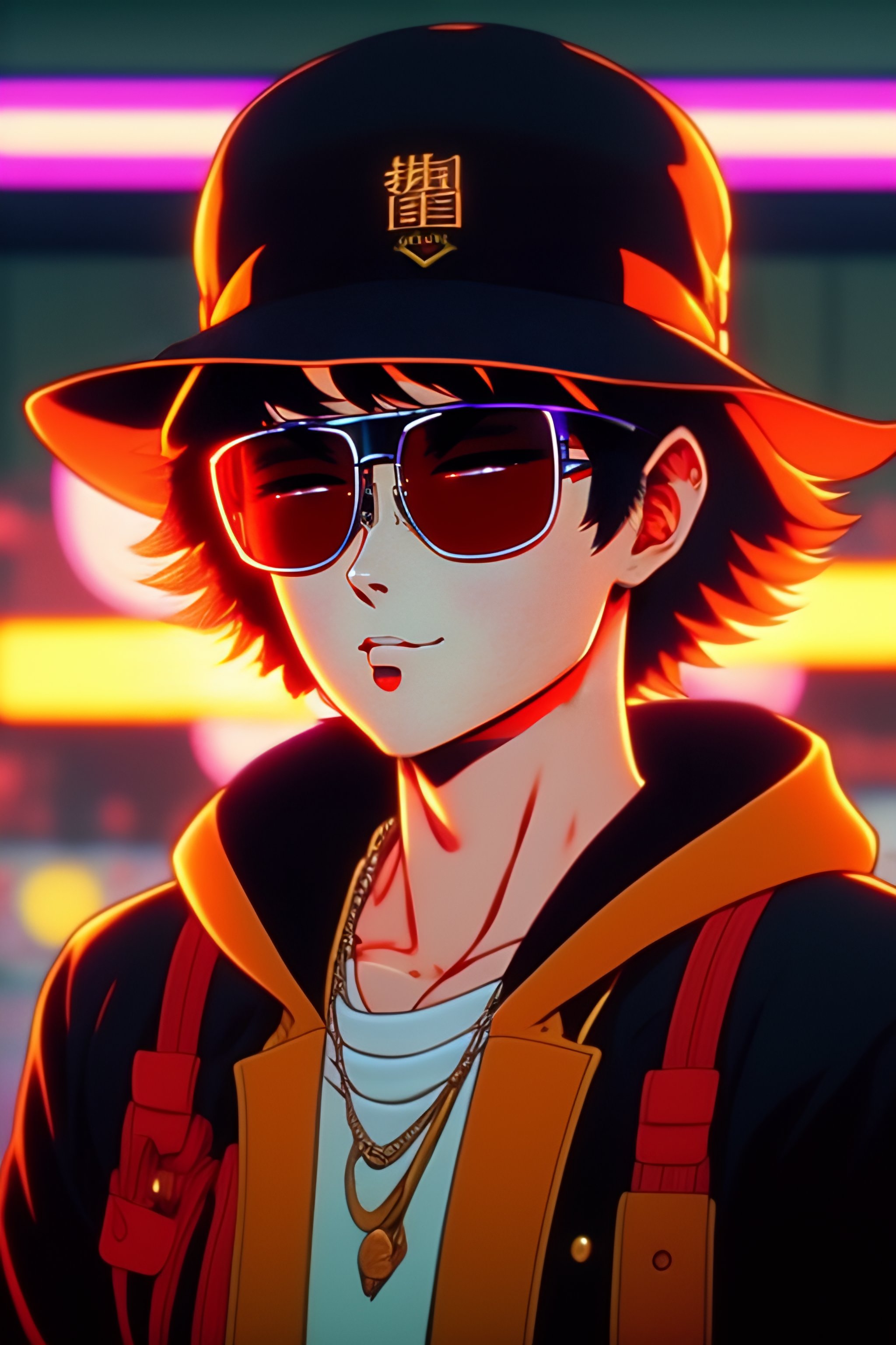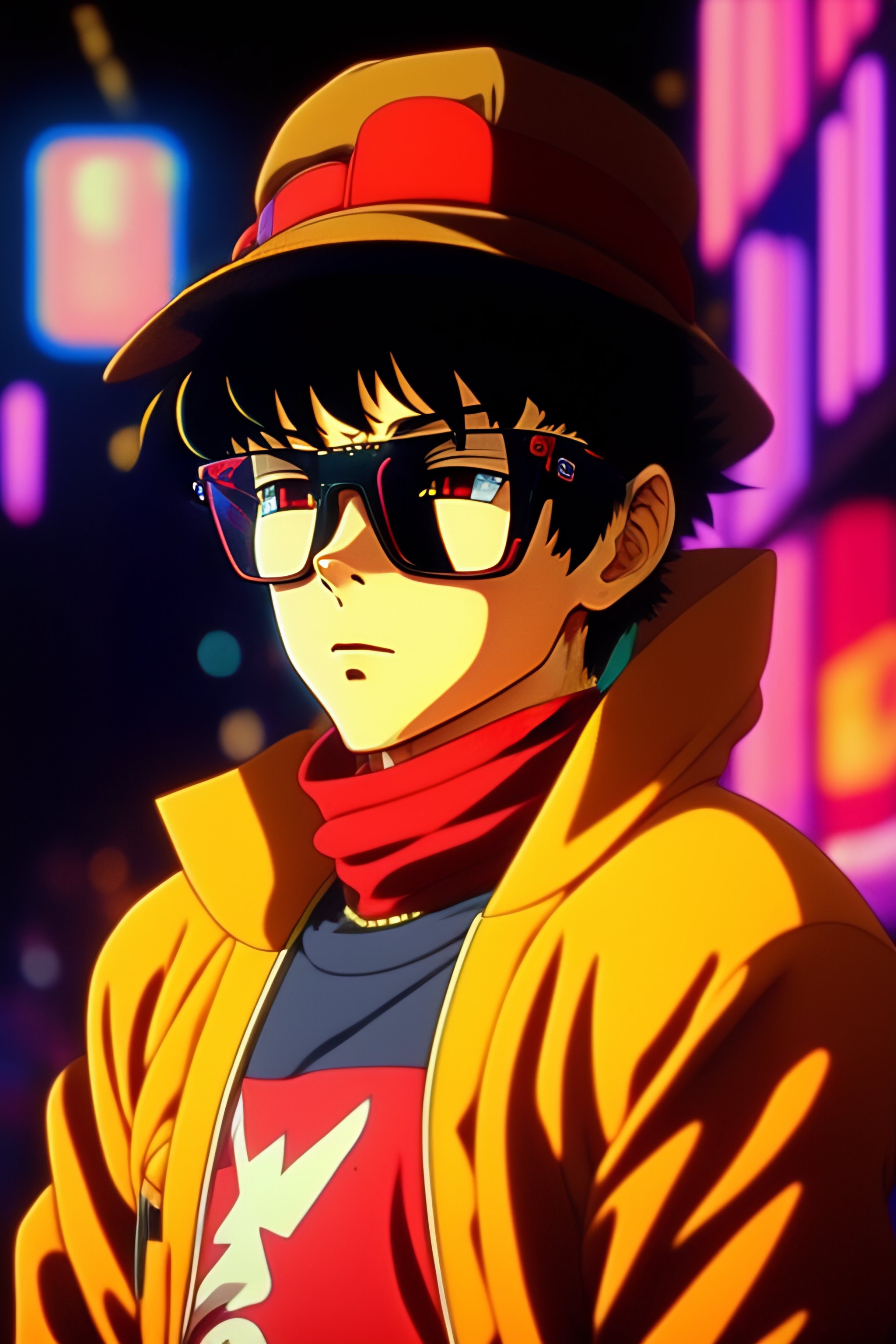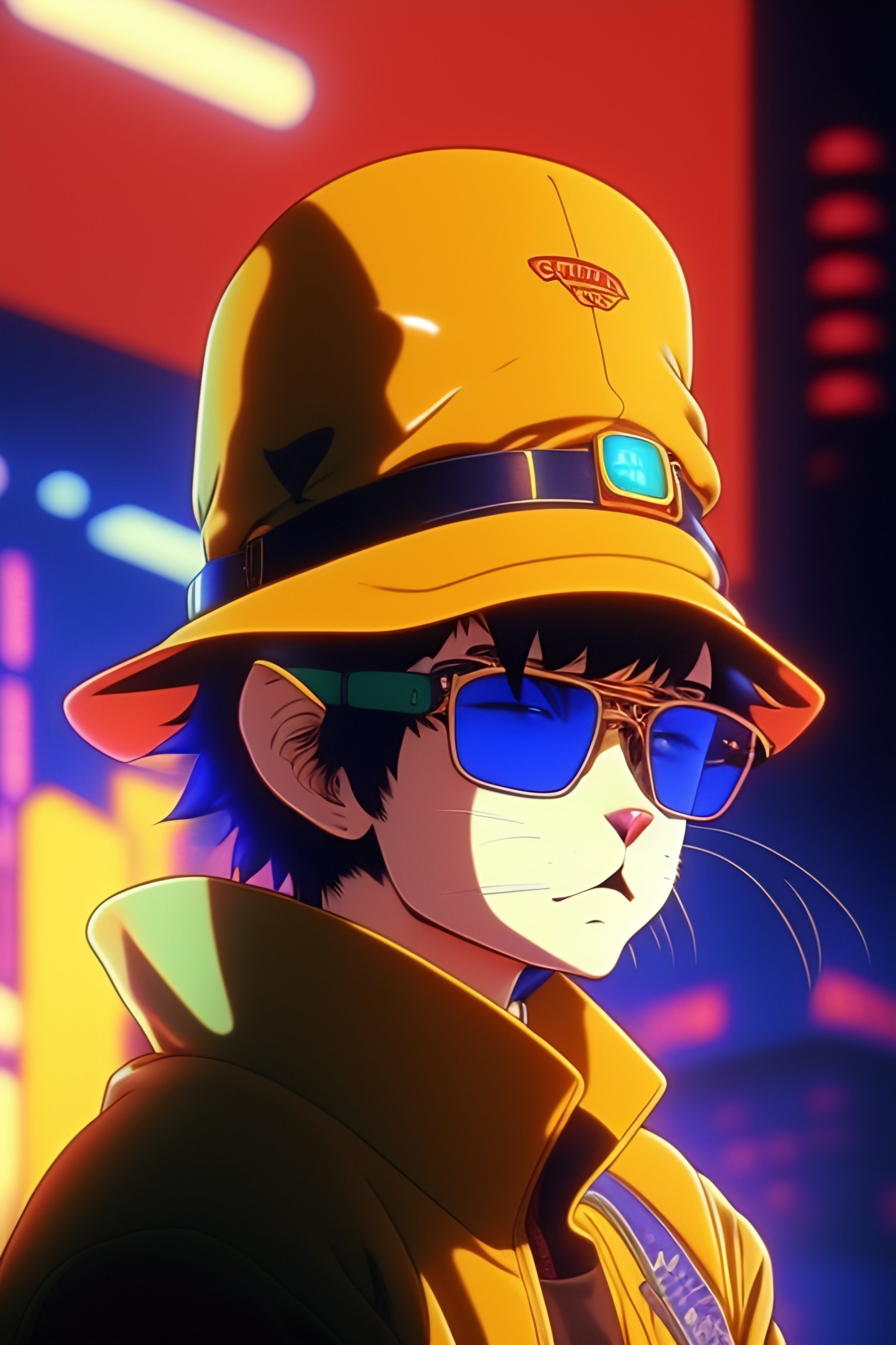 Vintage anime screenshot from akira, 90’s anime aesthetic. a cat with round dark glasses and a bucket hat, covering himself from the light very cyberpunk
