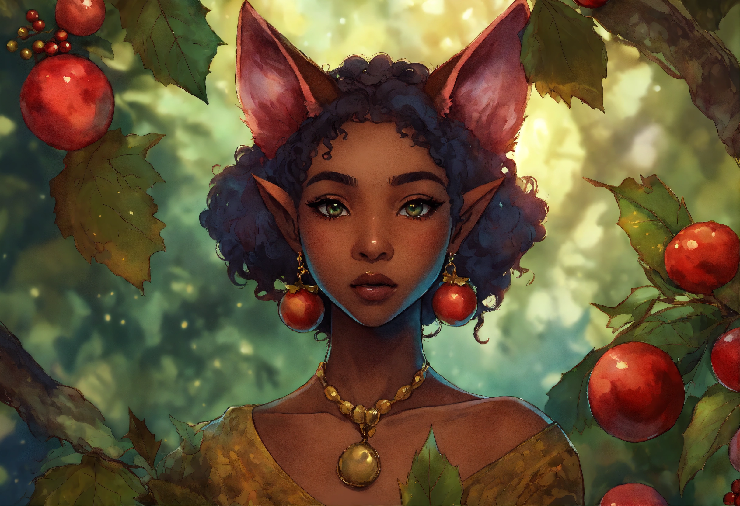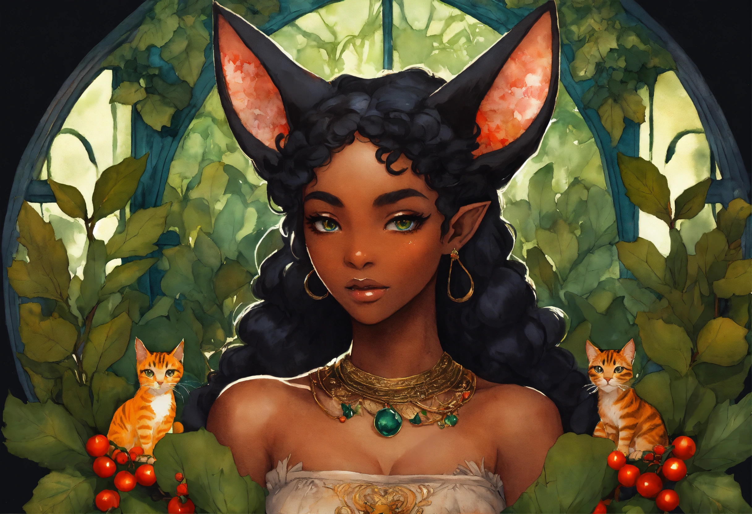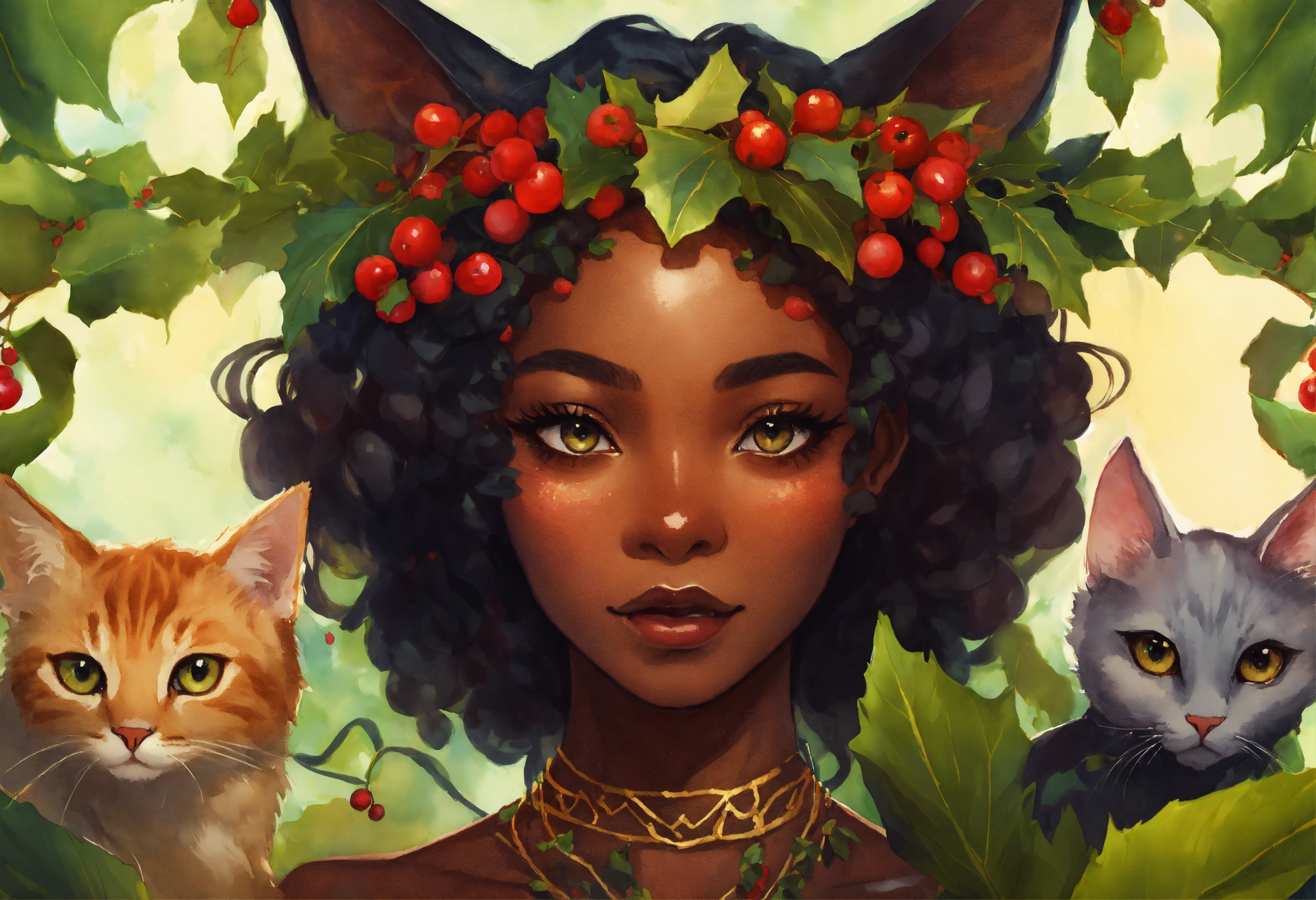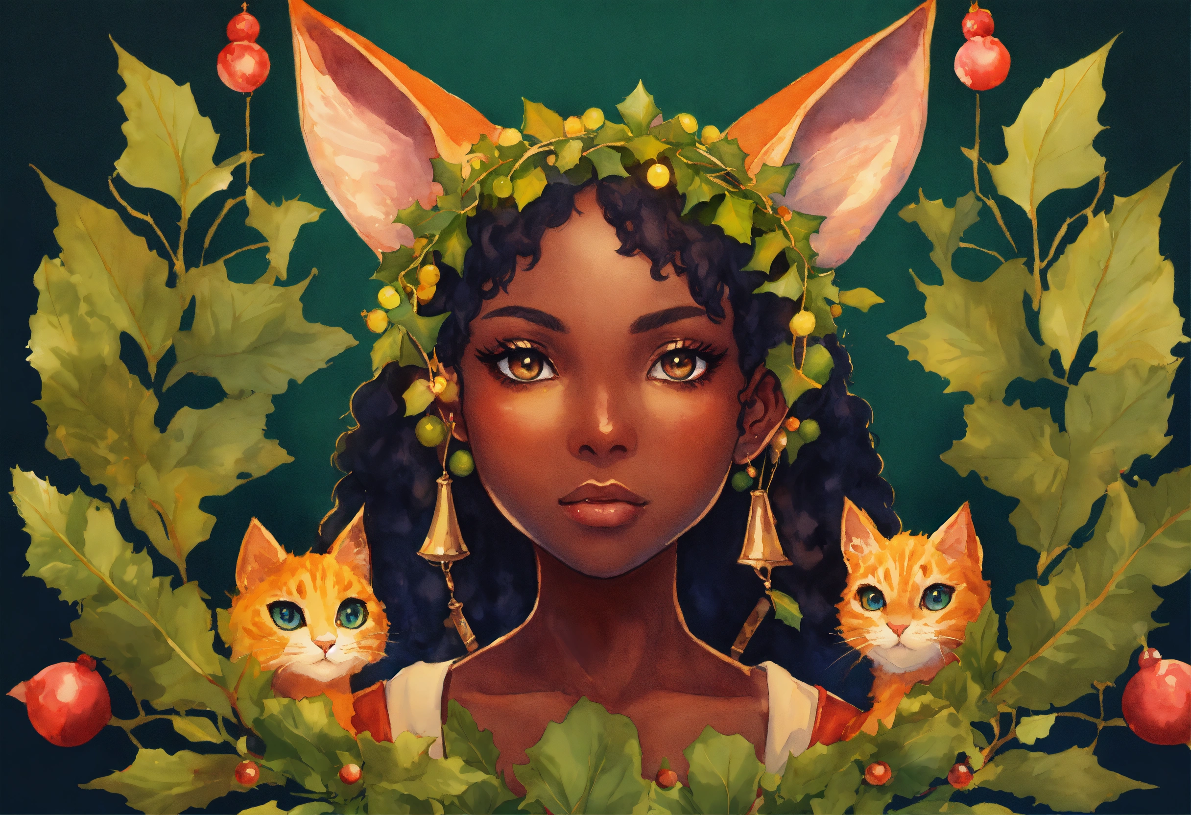 Deep complexion extremely pointed eared black woman elf with a second set of cat ears standing next to an array of feline species, bright moist and soulful eyes, dreamlike fantasy fractal watercolor within a holly berry garland vignettes, storybook ghibli style, rule of thirds