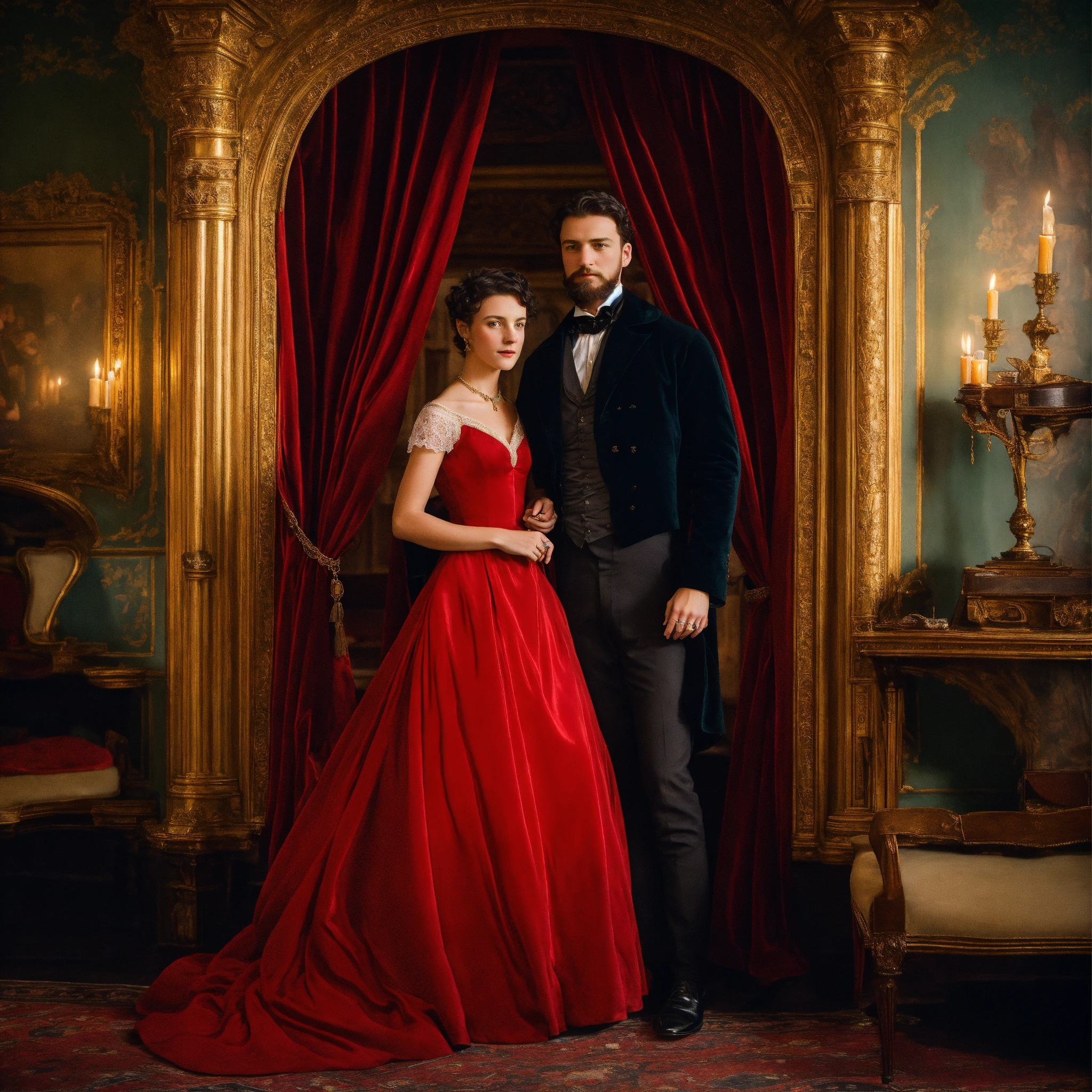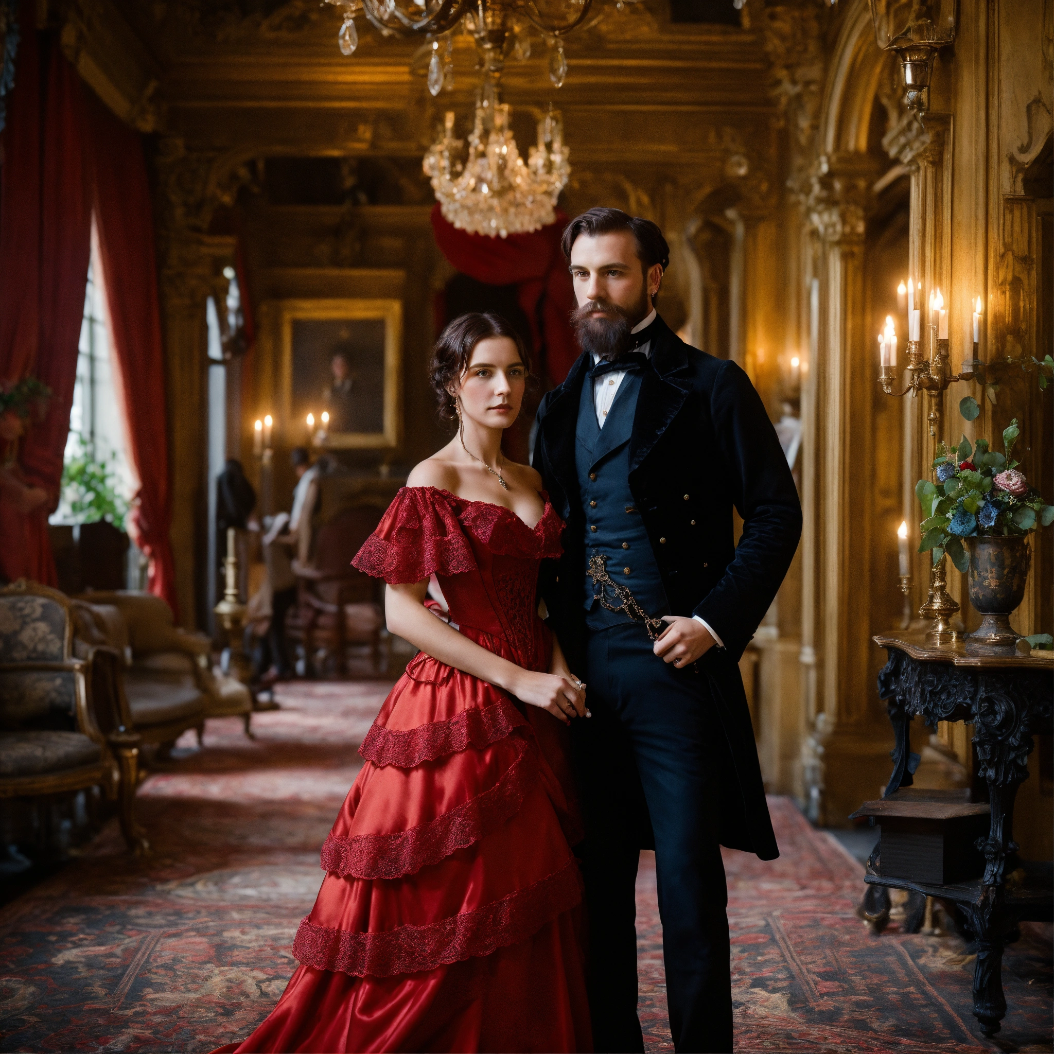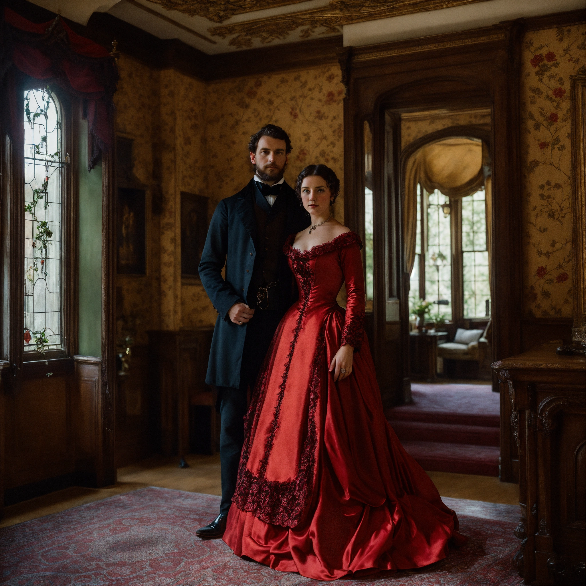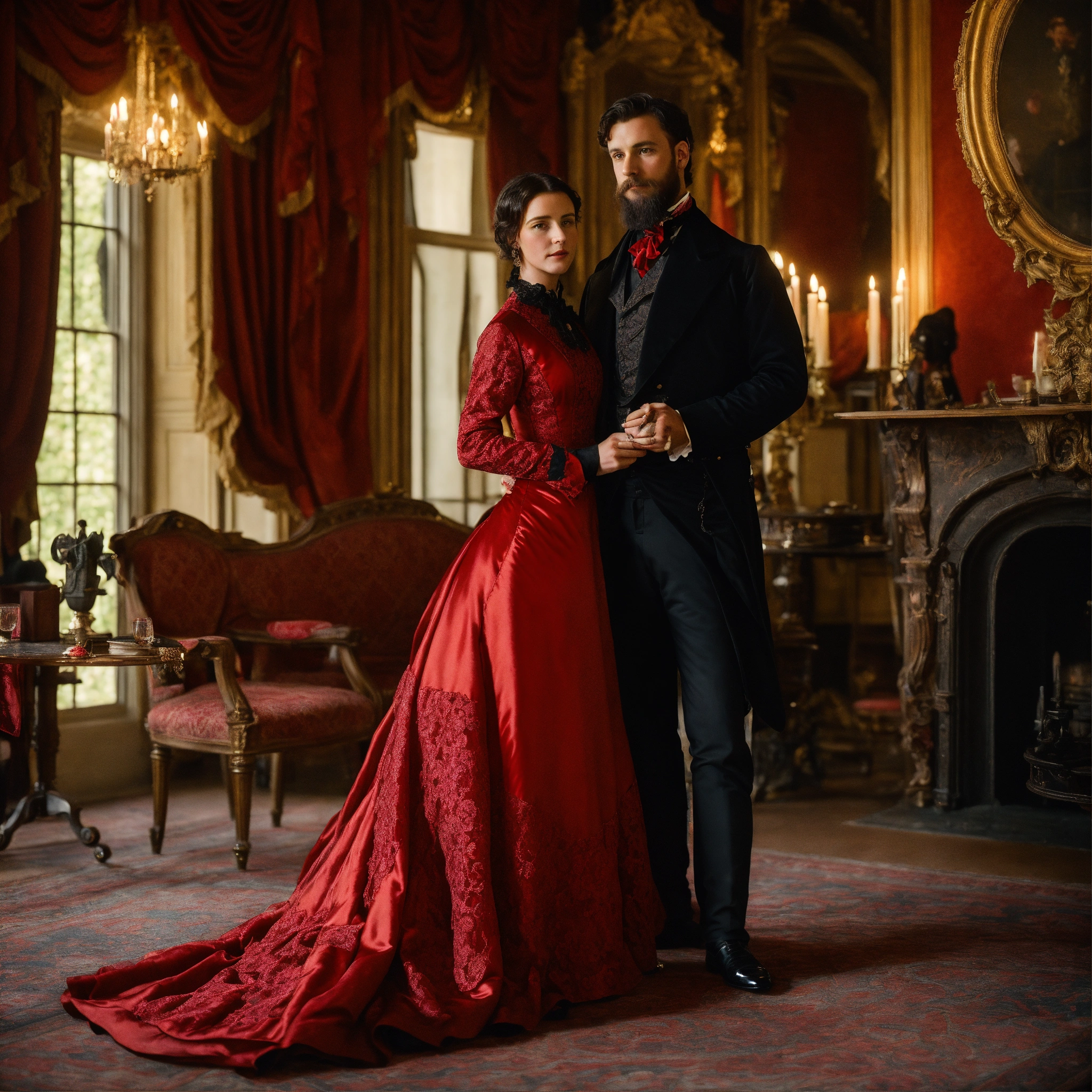 Photograph of a 19th century couple inside a gothic style victorian mansion, the woman is wearing a red gown, the man has short dark hair and a short beard