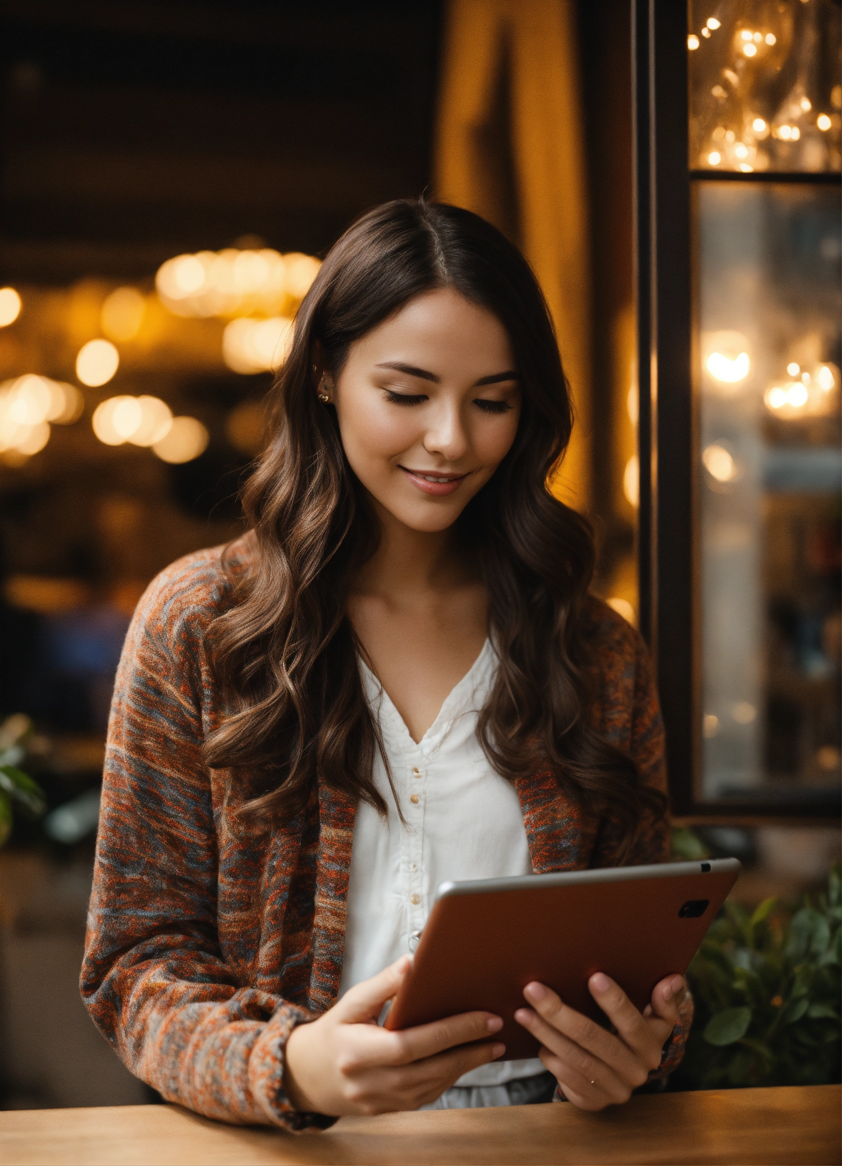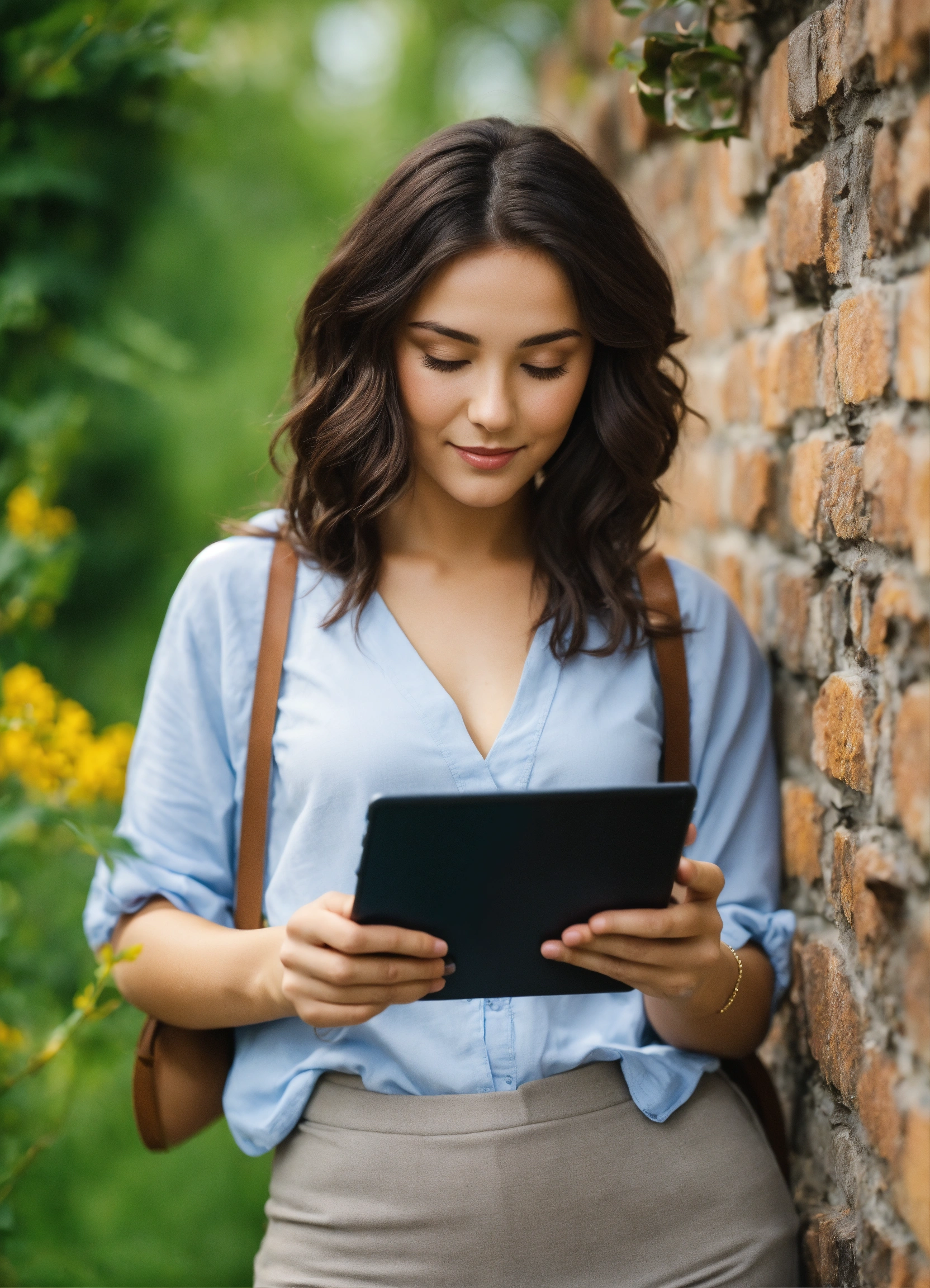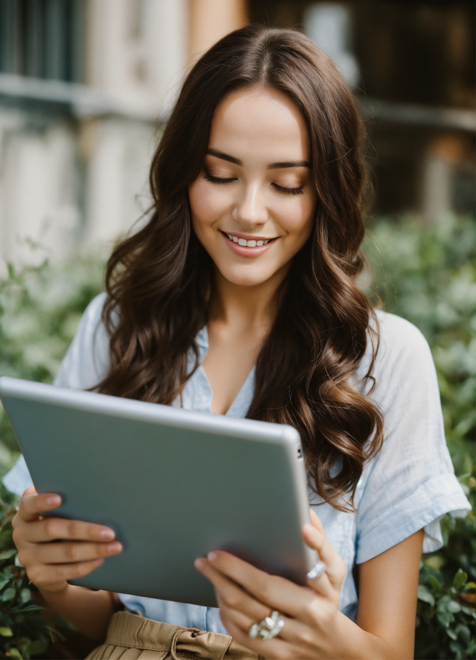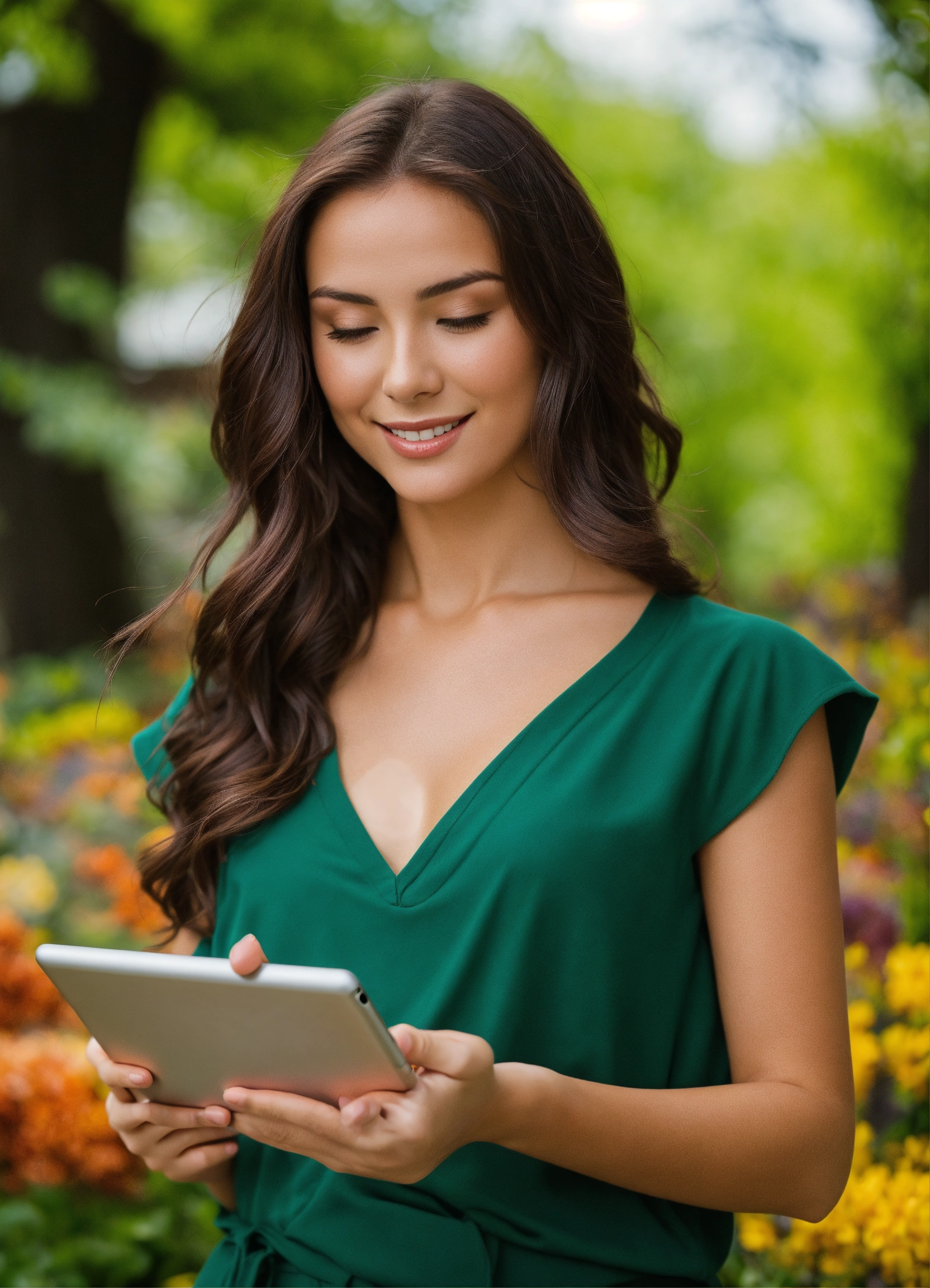 A cute brunette woman with a tablet in his hands