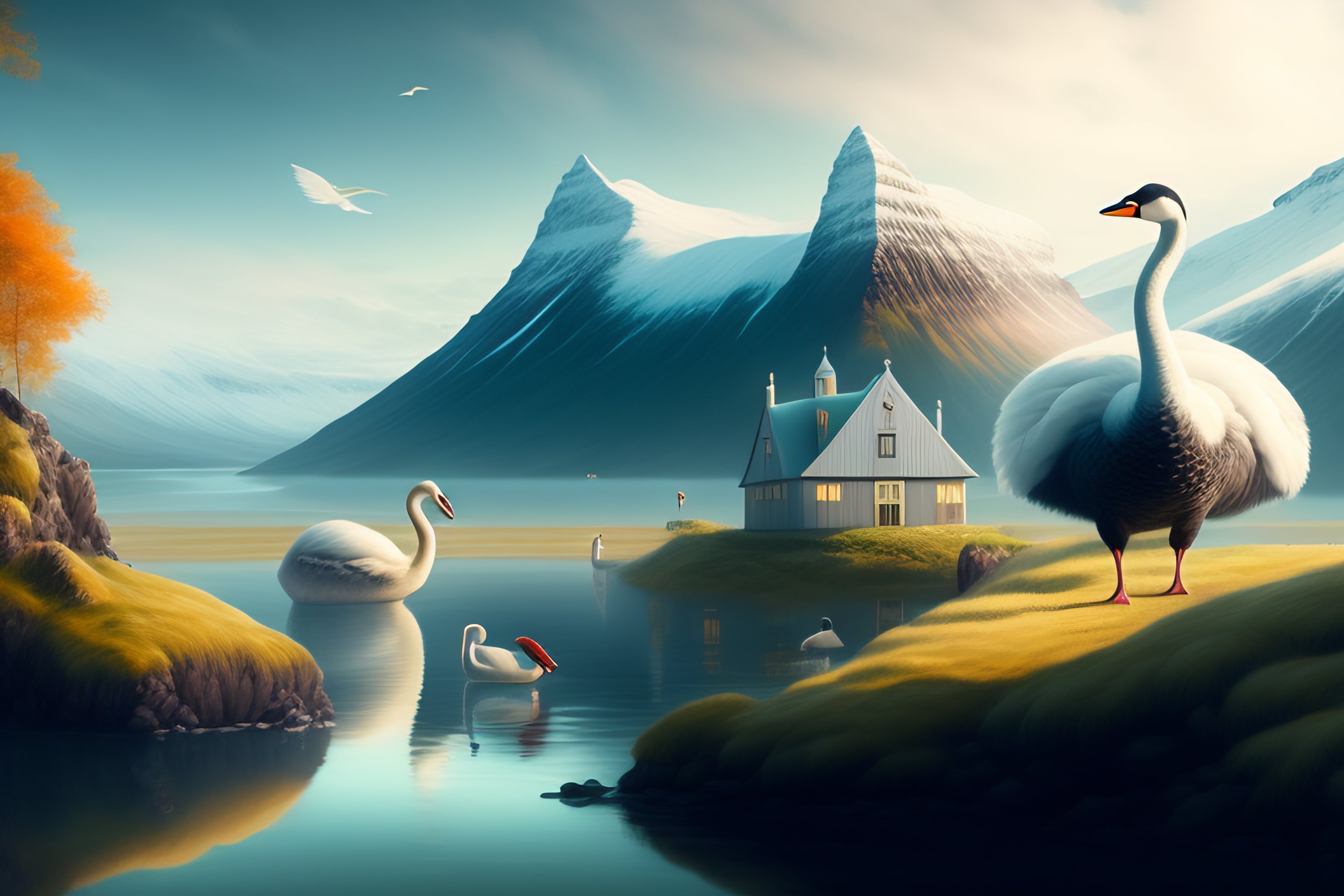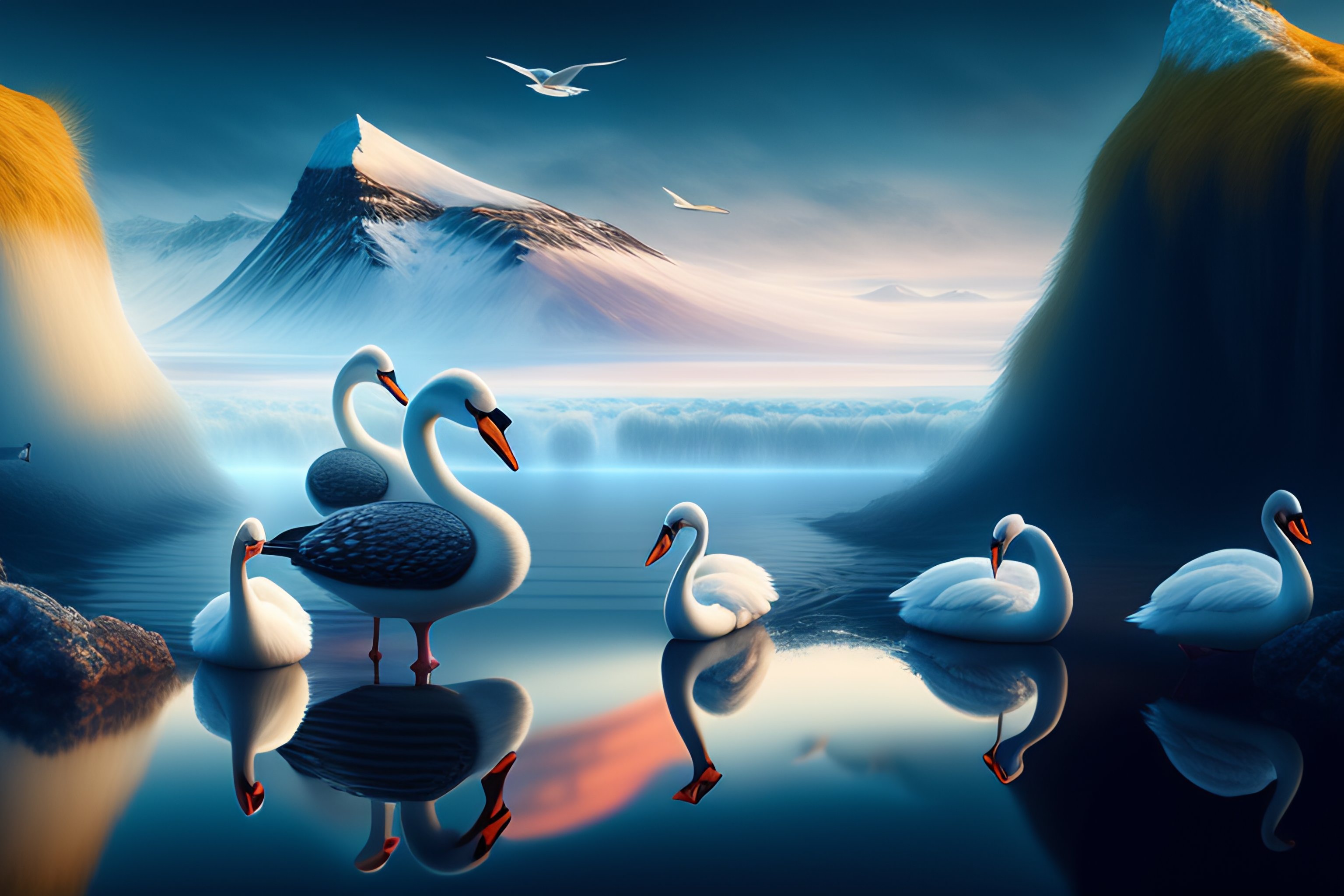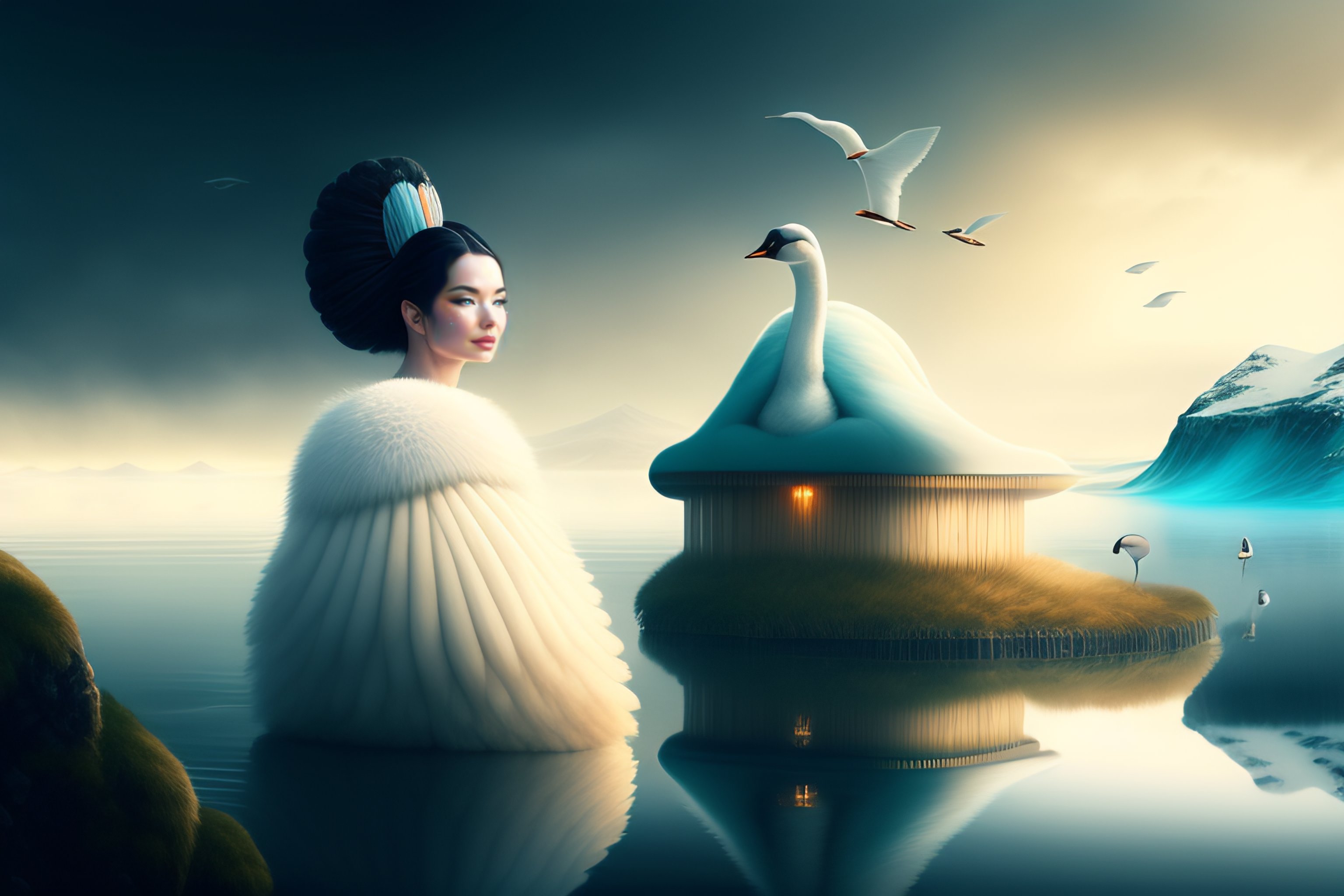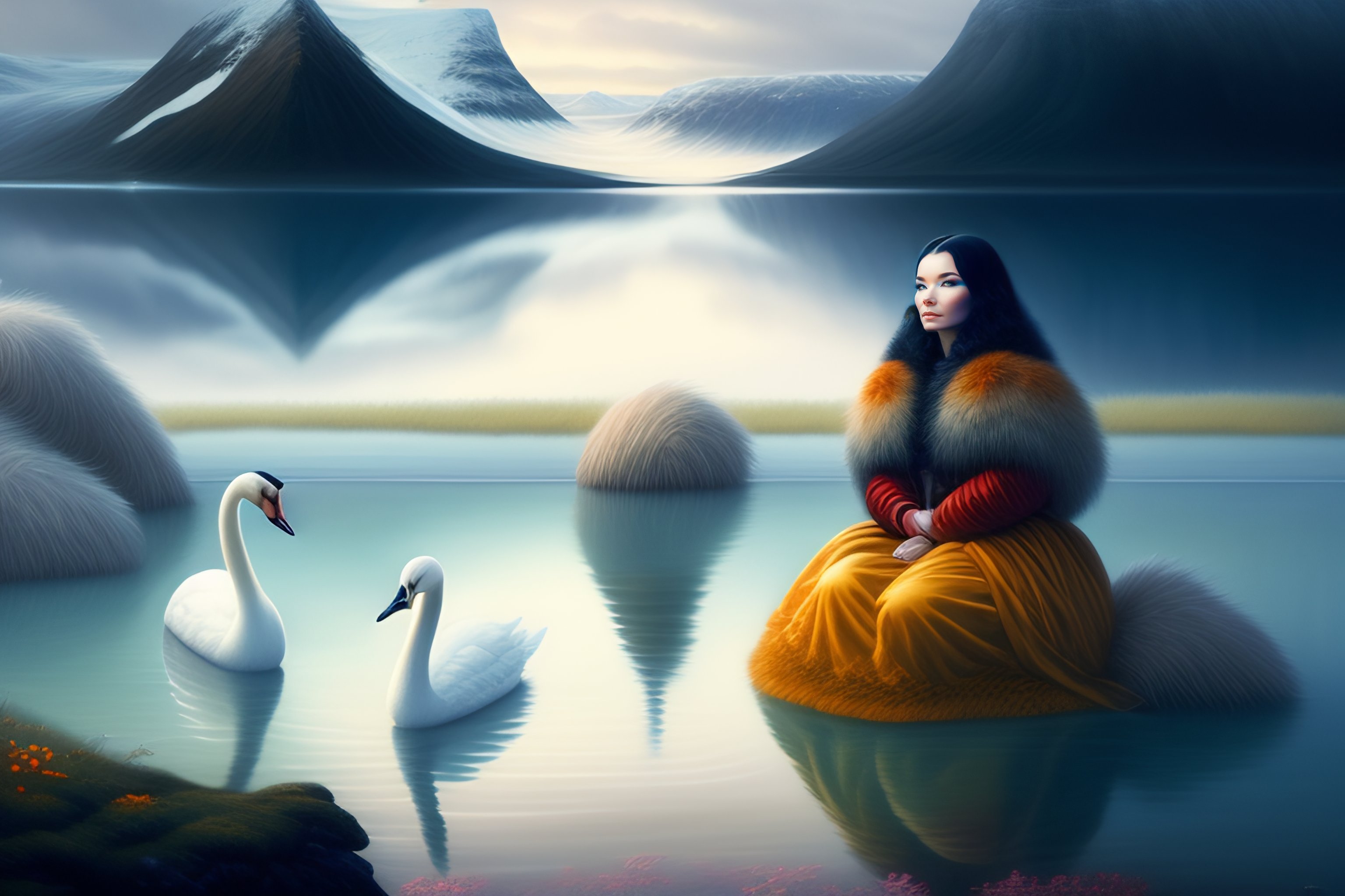 Beautiful bjork with swans in iceland by hubert robert and lee madgwick and roger dean and jacek yerka, dan mumford and alex grey style, soft lighting, 4 k hd wallpaper illustration concept joy atmospheric lighting