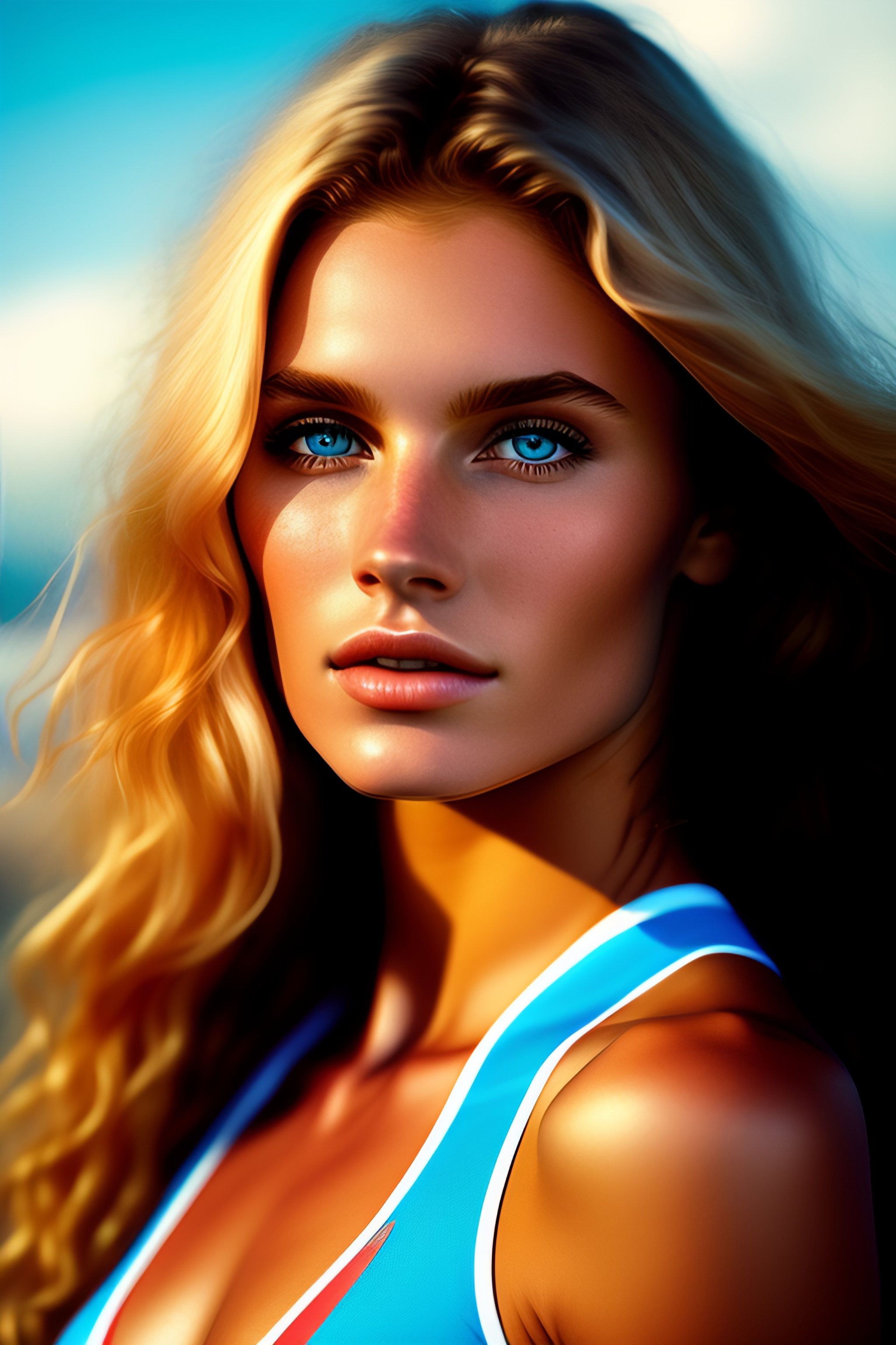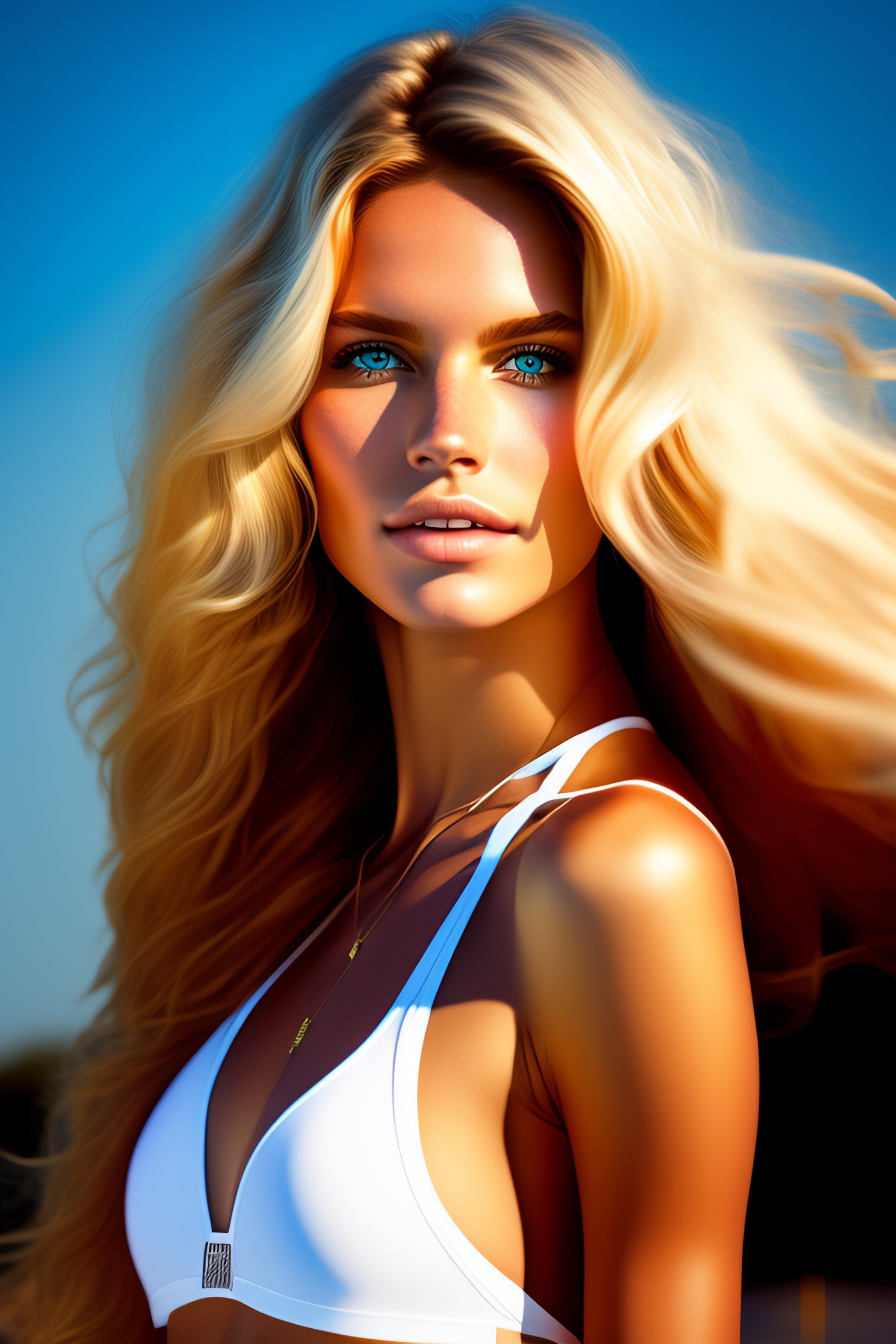 A very beautiful russian tennis girl, youthful, full body and face, long wavy blond hair, sky blue eyes, full round face, short smile, bikini, miniskirt, highly detailed, photograph