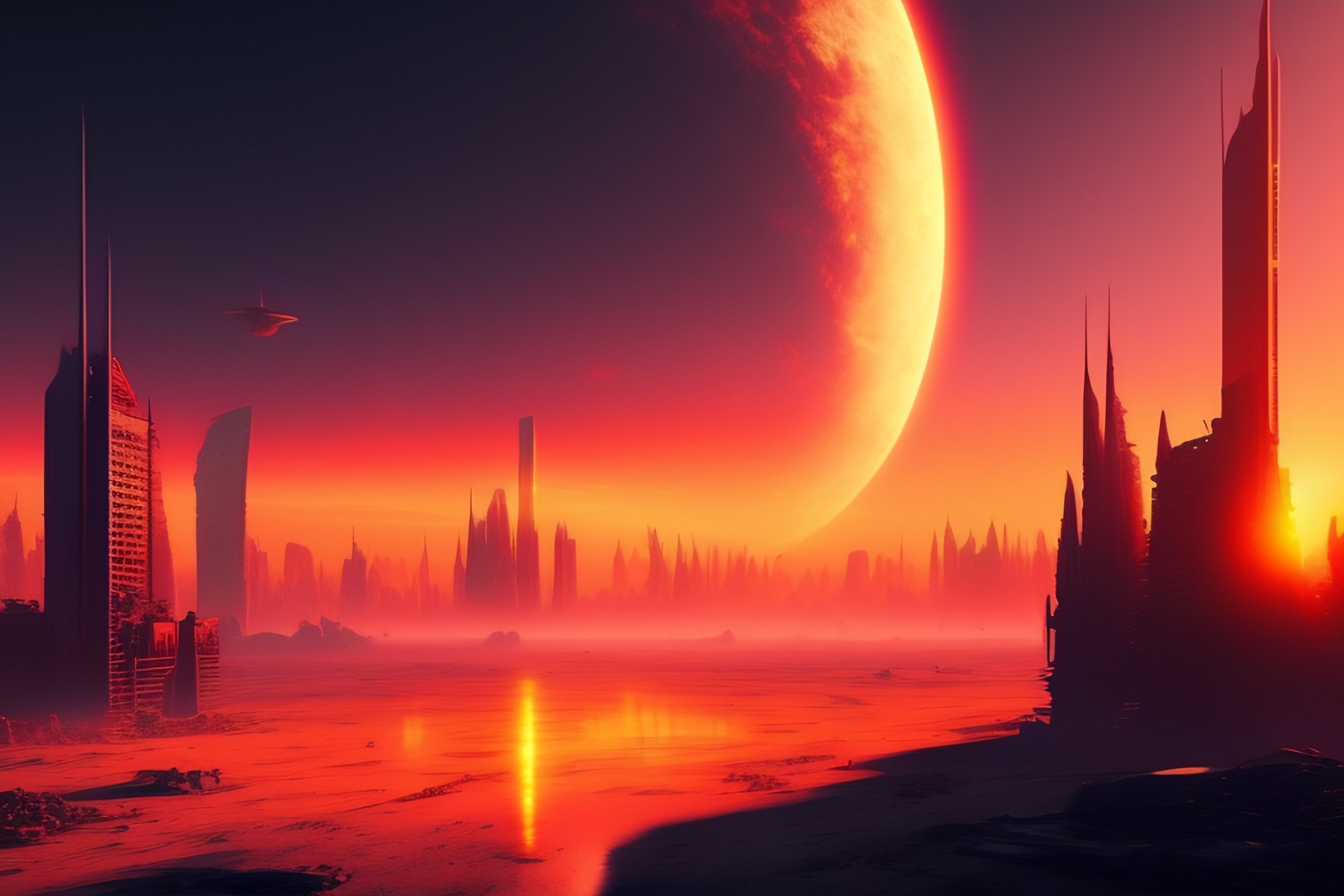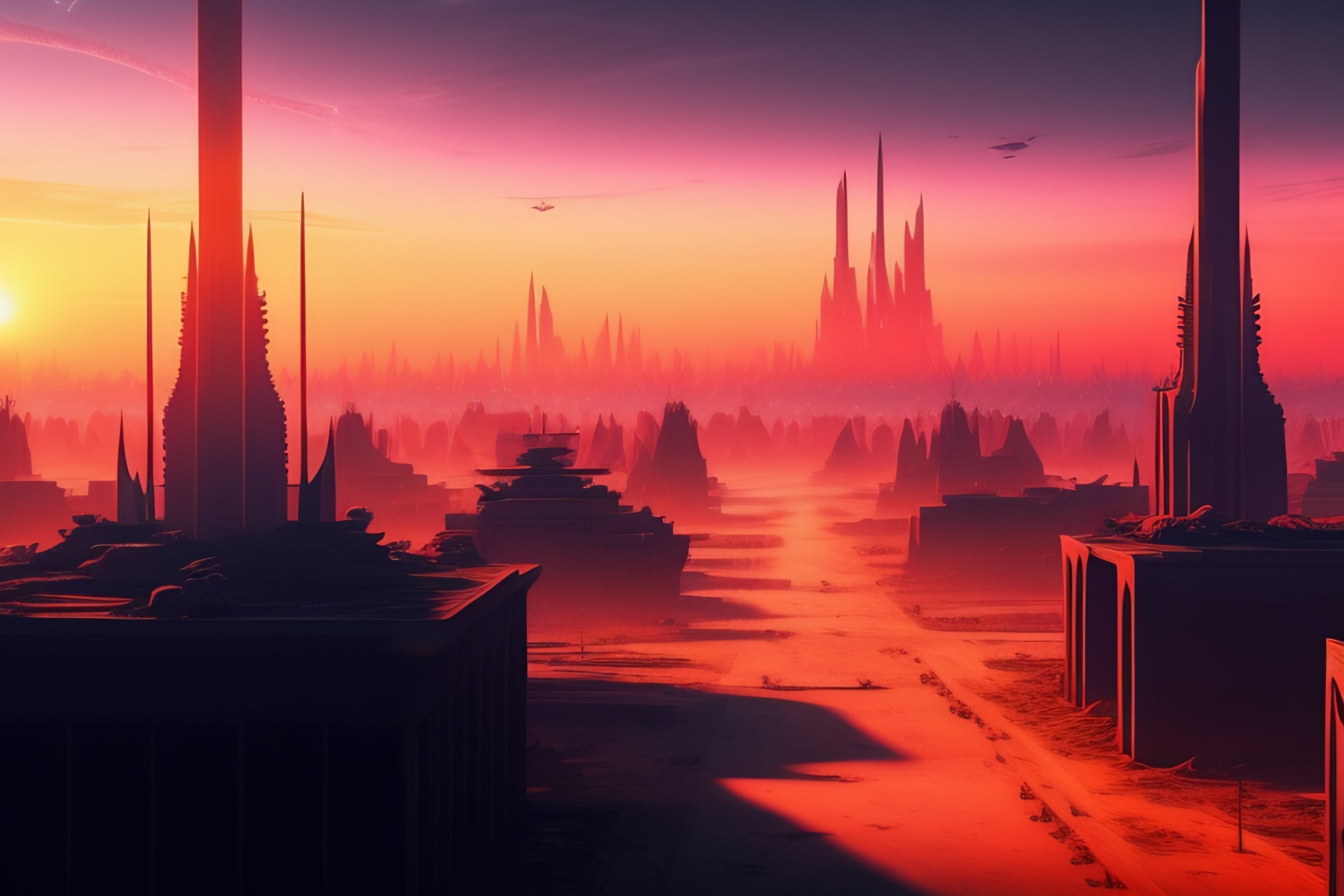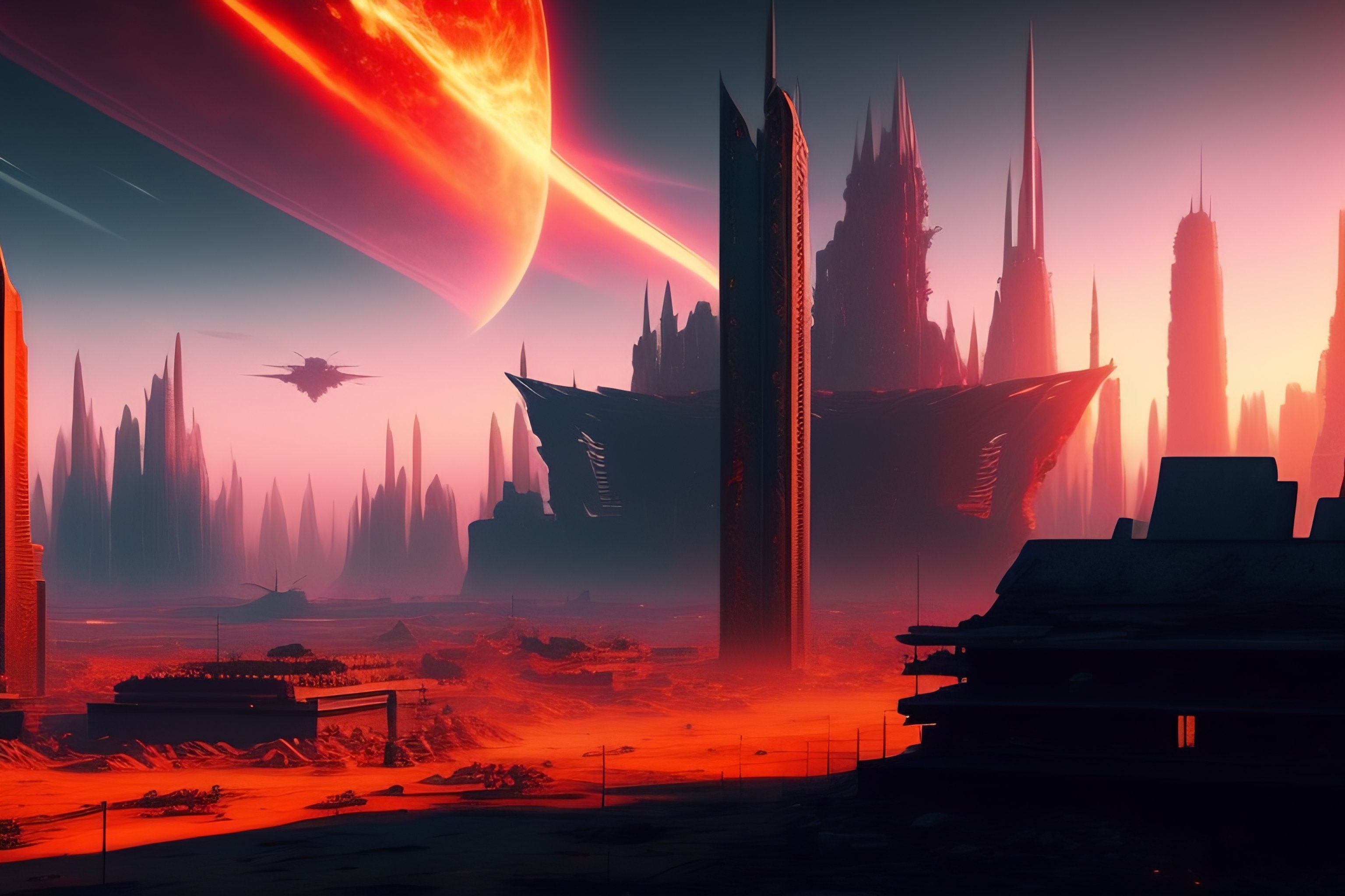 Day of judgement, buildings destroyed, demons roaming, painting style, 8k, ruined futuristic city, post-apocalyptic, red sky, 2 suns, abstract