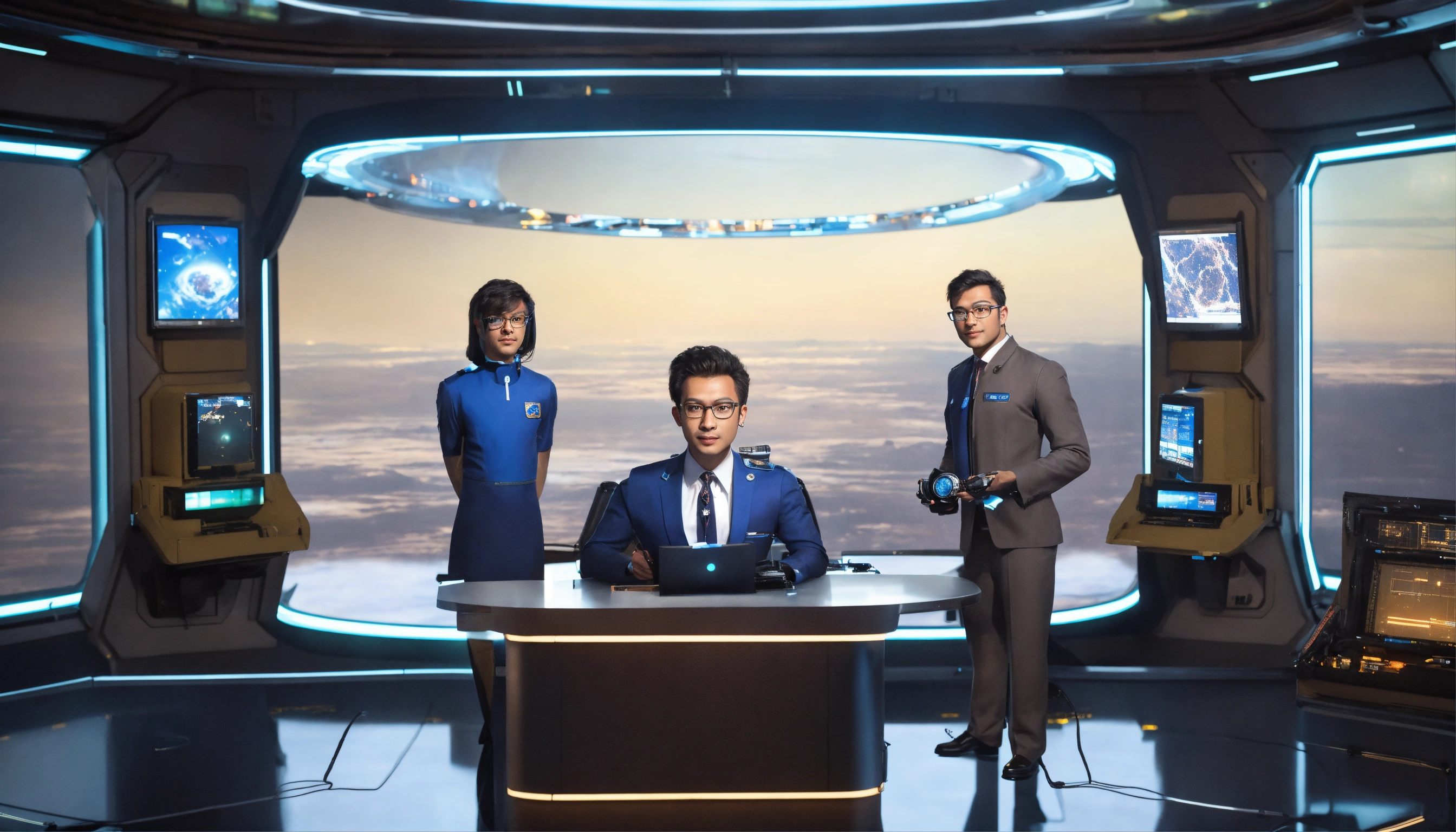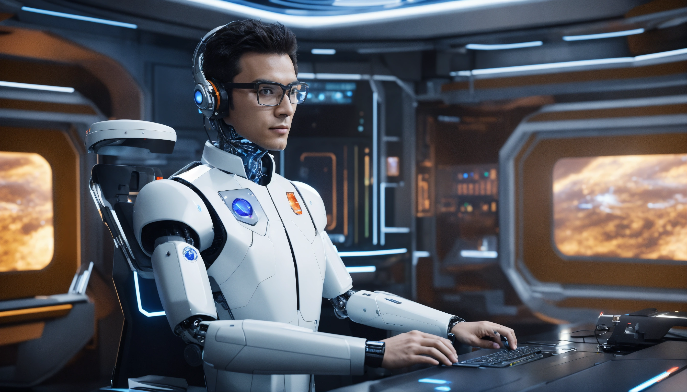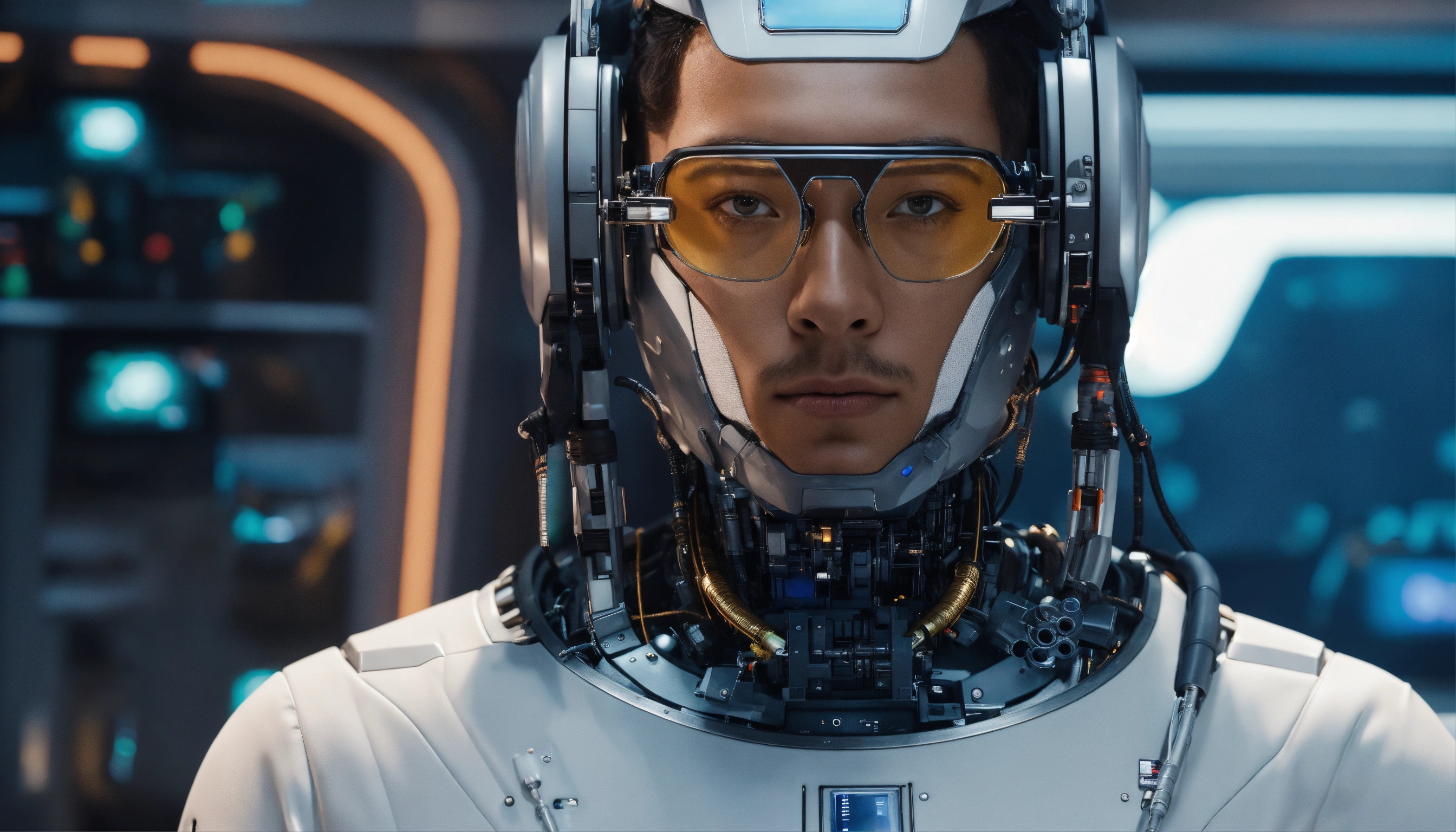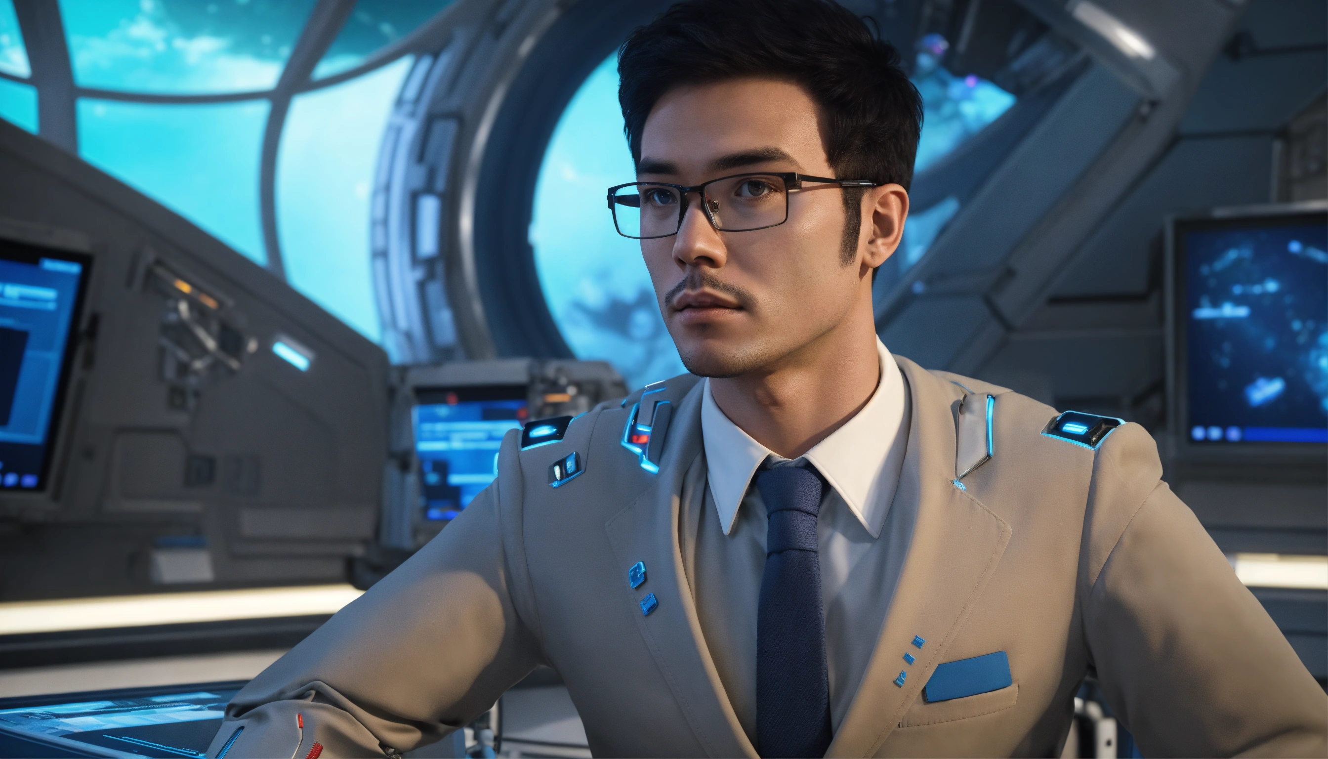 Futuristic space news anchor who is half-robot and half-human, with a face that closely resembles that of a typical human, wearing glasses. a professional news anchor working at a space station in the future. he has a unique appearance, being part robot and part human.