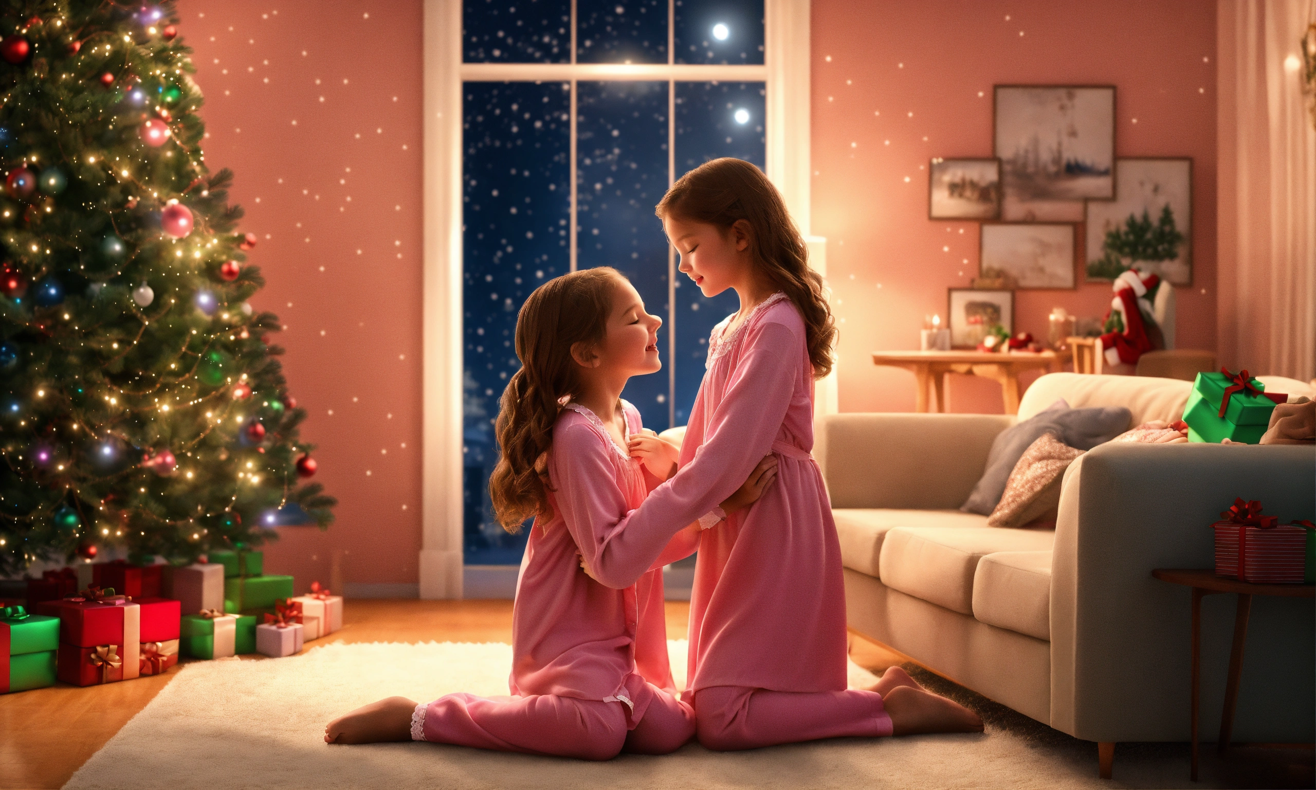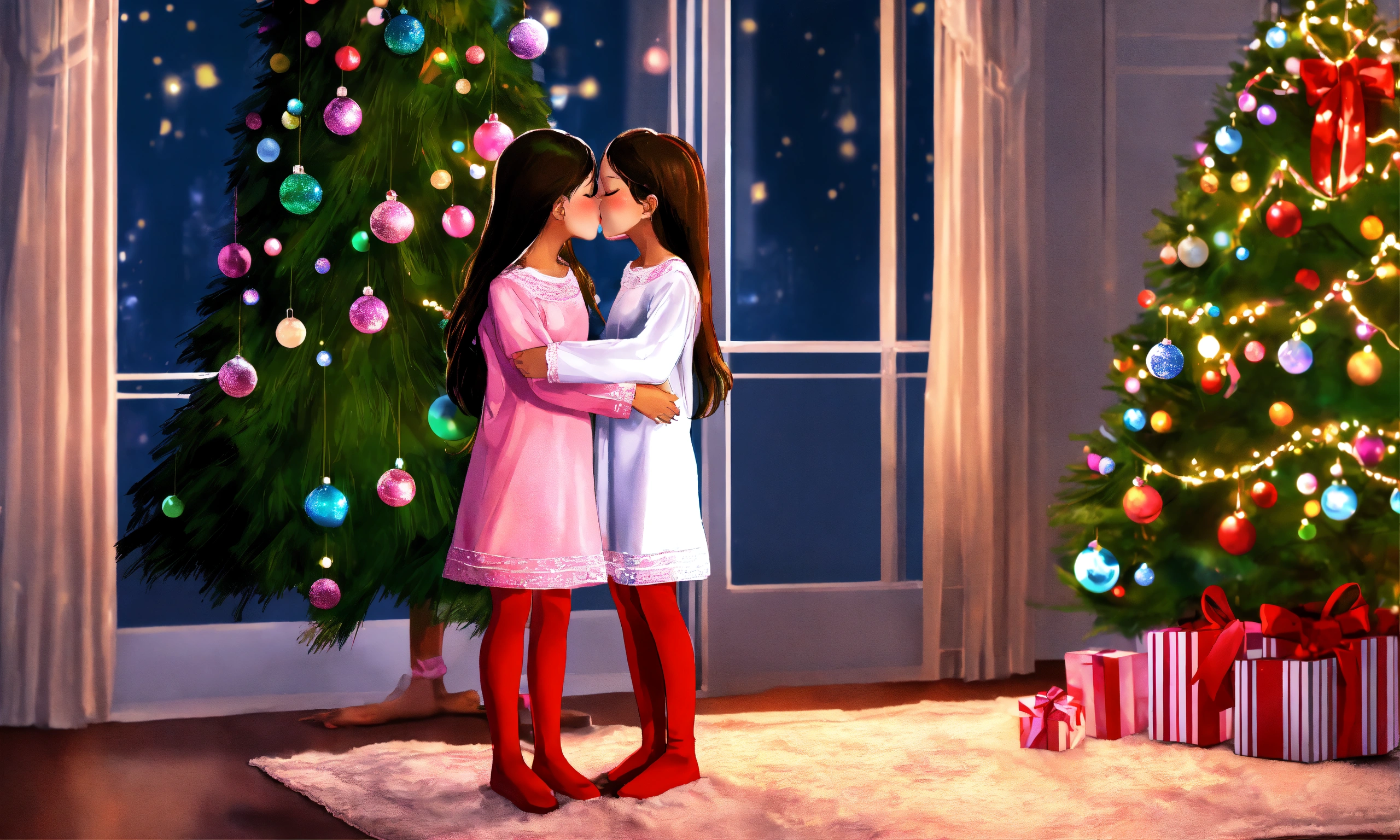 Two 10-year-old sisters hug and kiss each other goodnight because it's christmas eve, they stand in front of a living room with a christmas tree, intimate and loving, in the style of a romance novel cover, one girl wears pink pajamas, the other wears a simple white nightgown, full body render, realistic