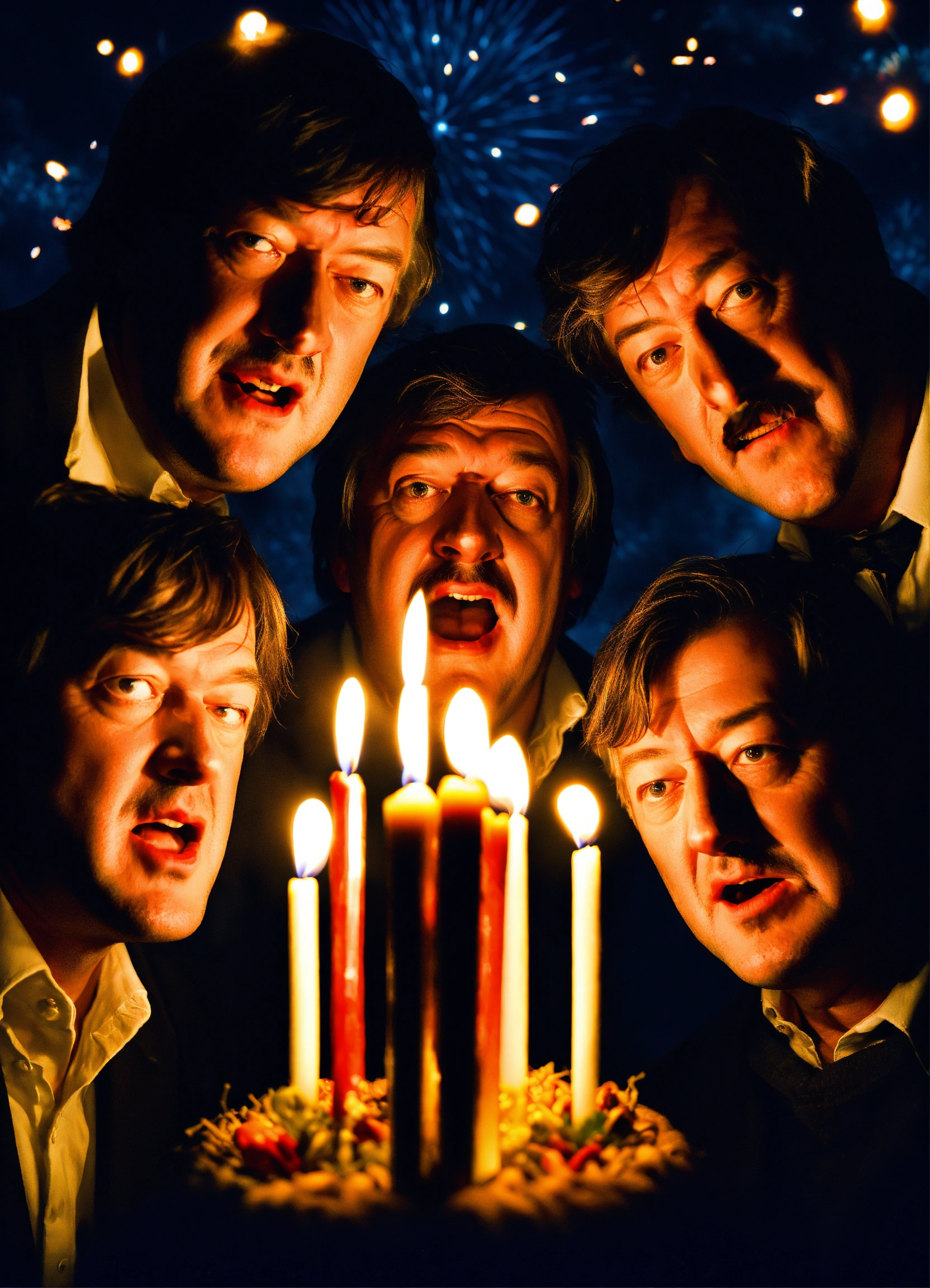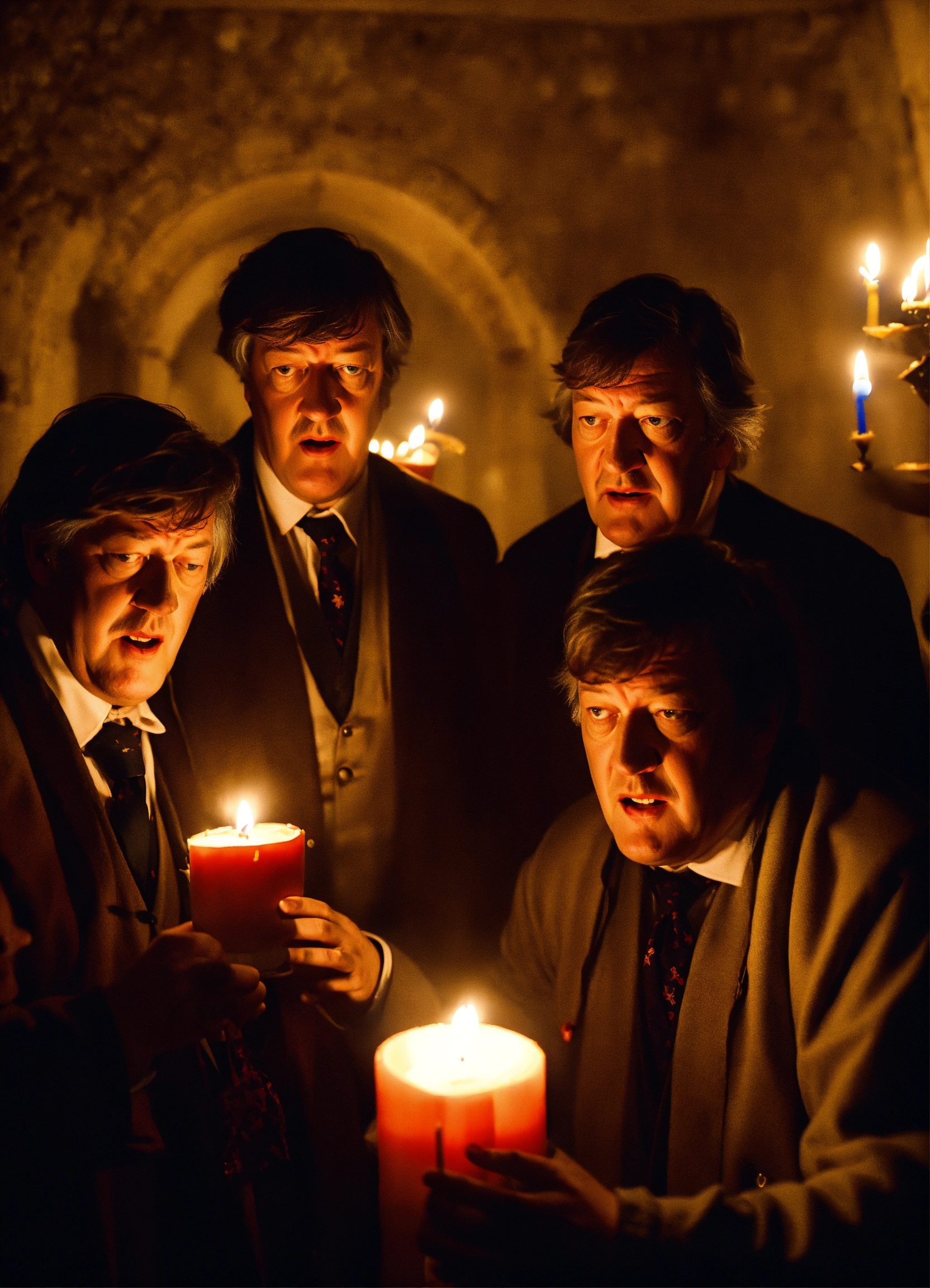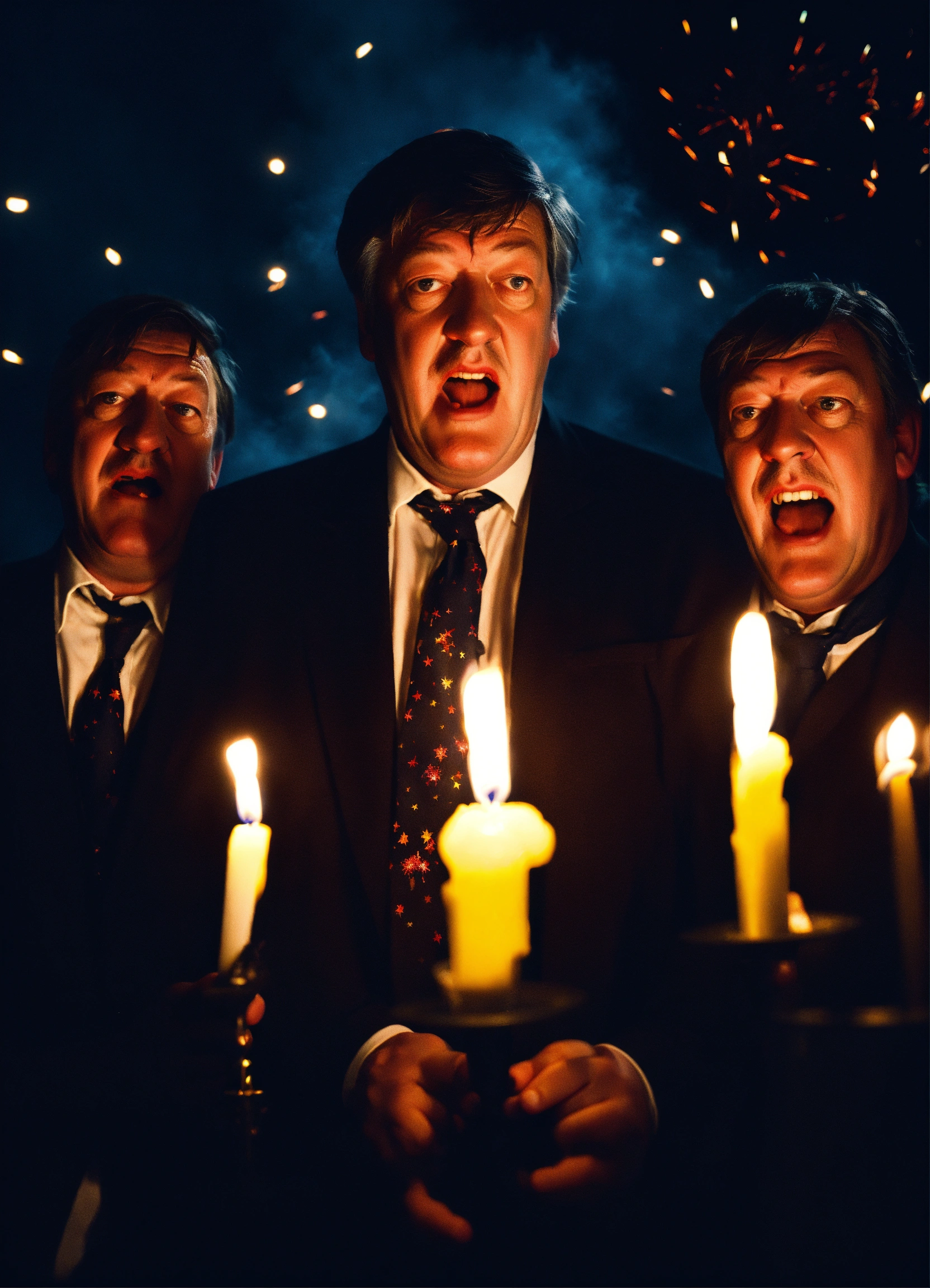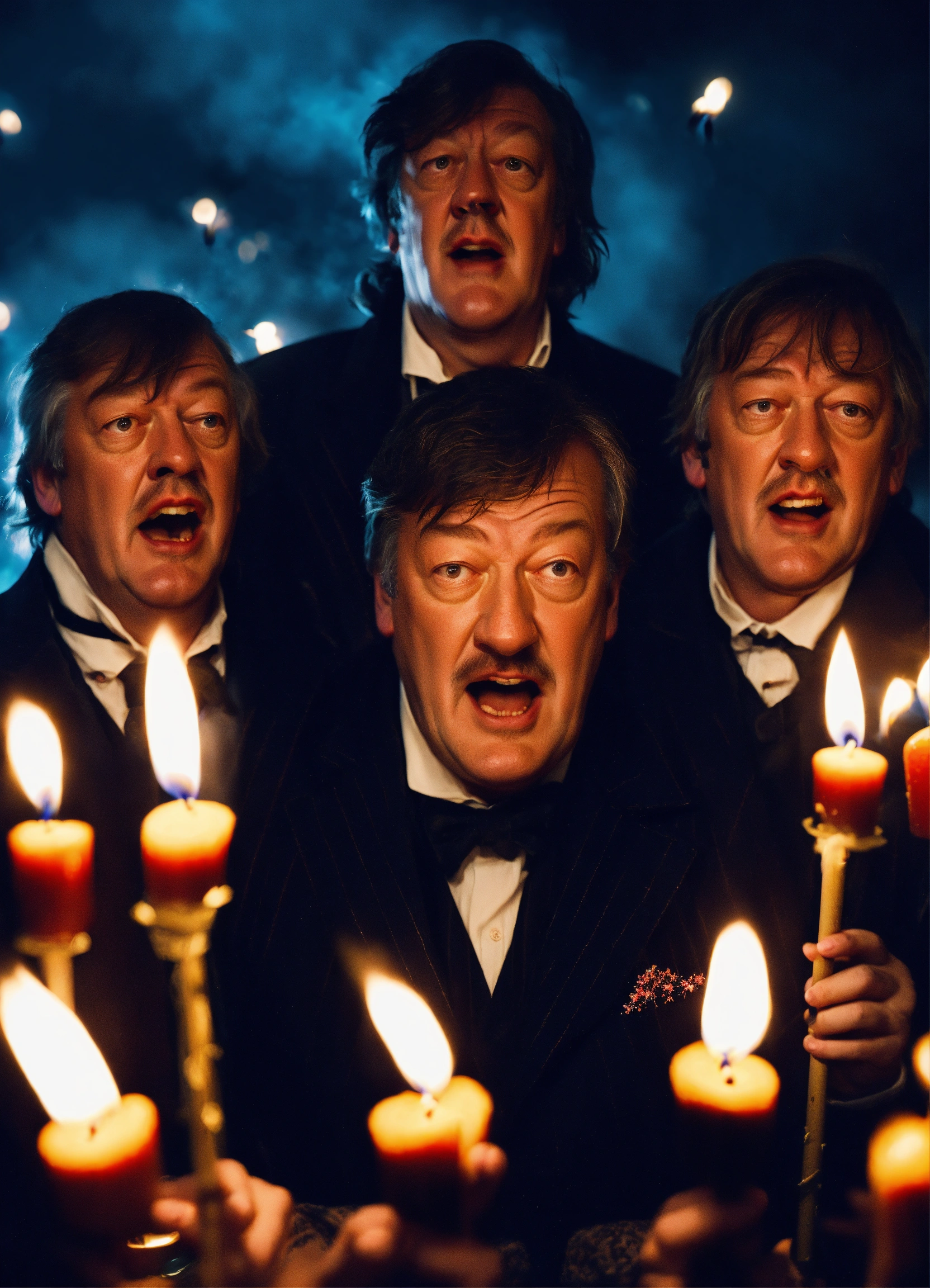 Cinematic portrait of stephen fry and 30 identical twin brothers menacingly gathered round a candle, singing, bonfire night, fireworks, singing, portrait, spooky dim lighting, lit from below, portrai
