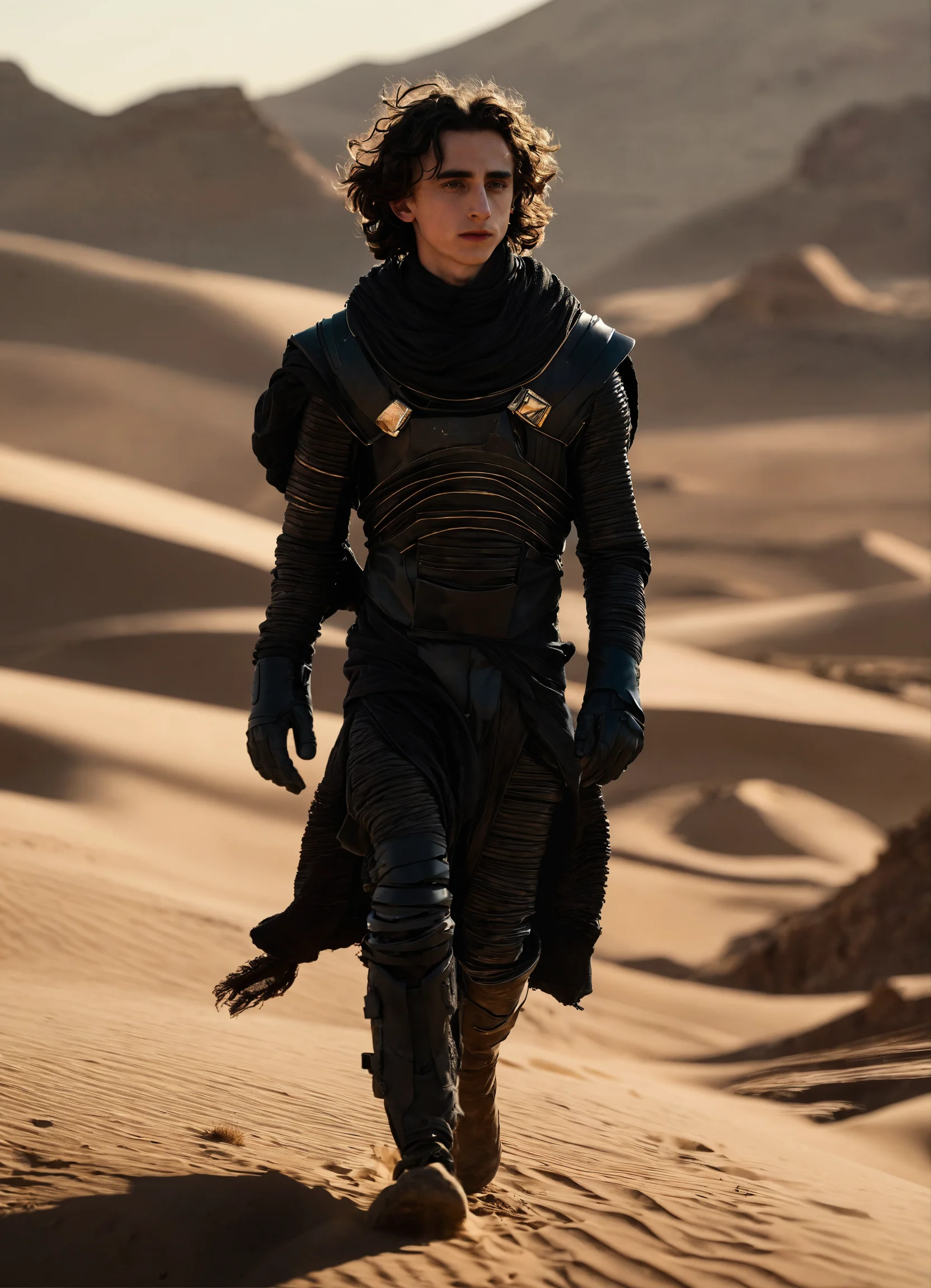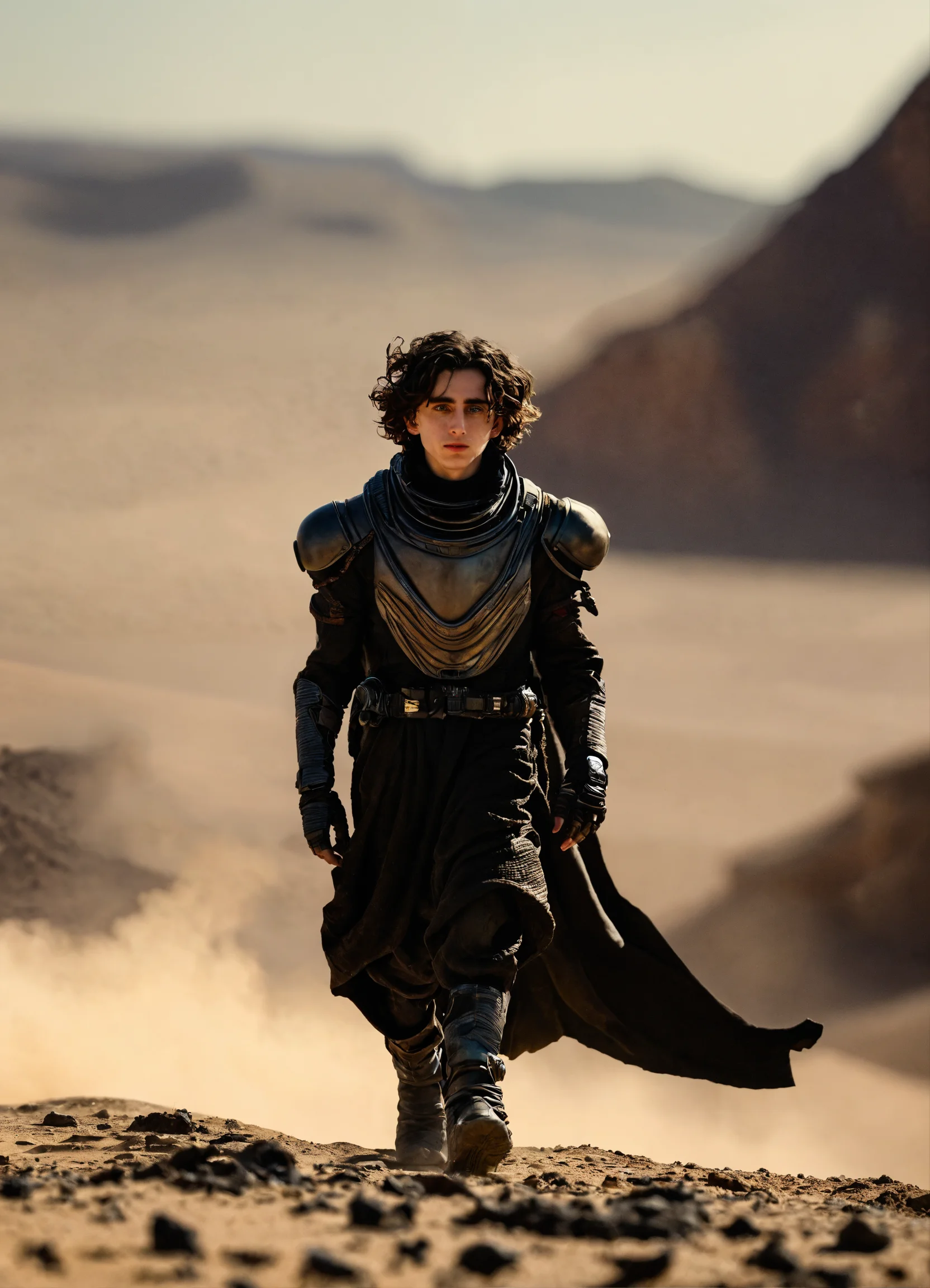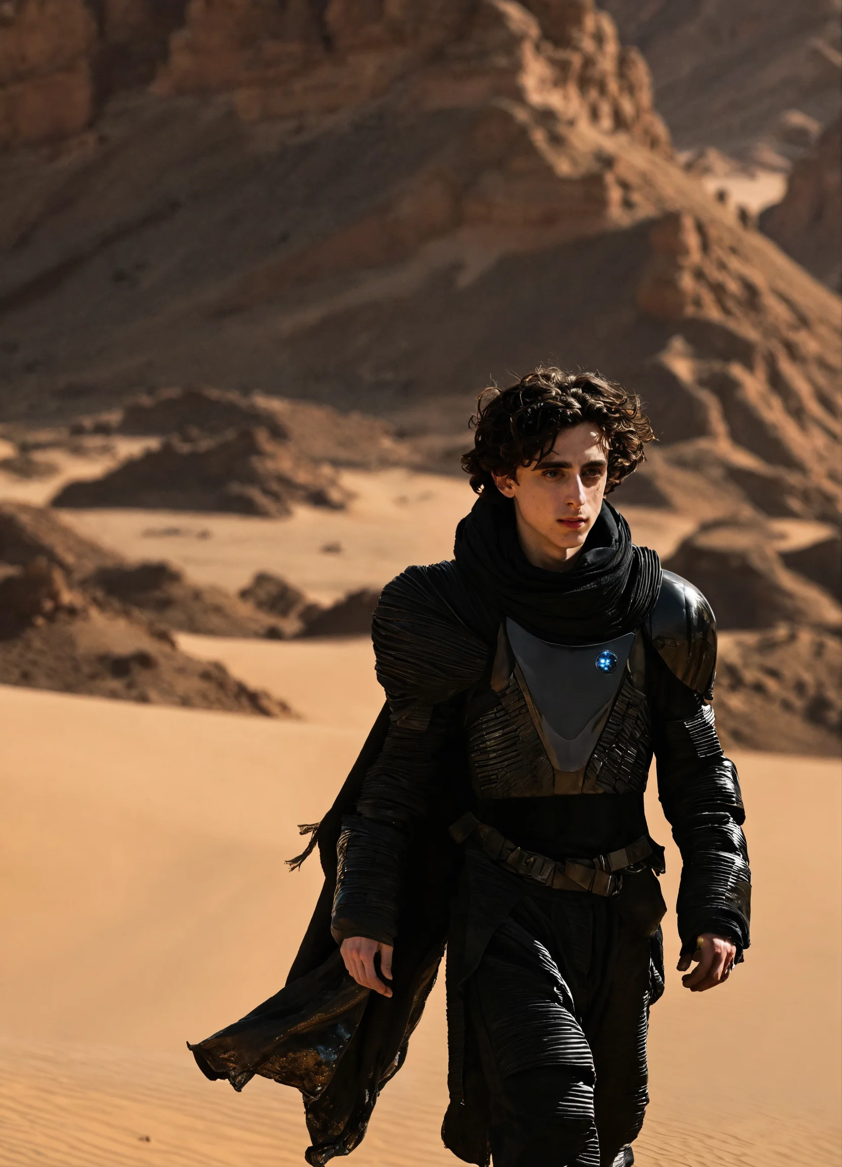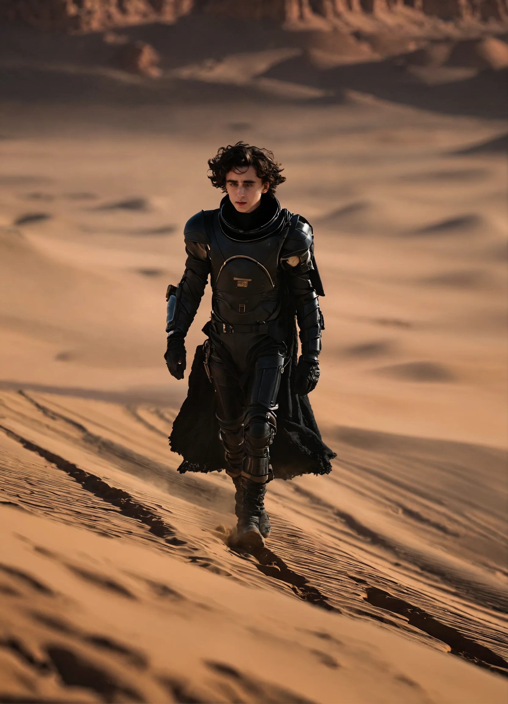 Timothee chalamet walking at a far distance, ultra high resolution, black armor outfit with robe, desert background in space