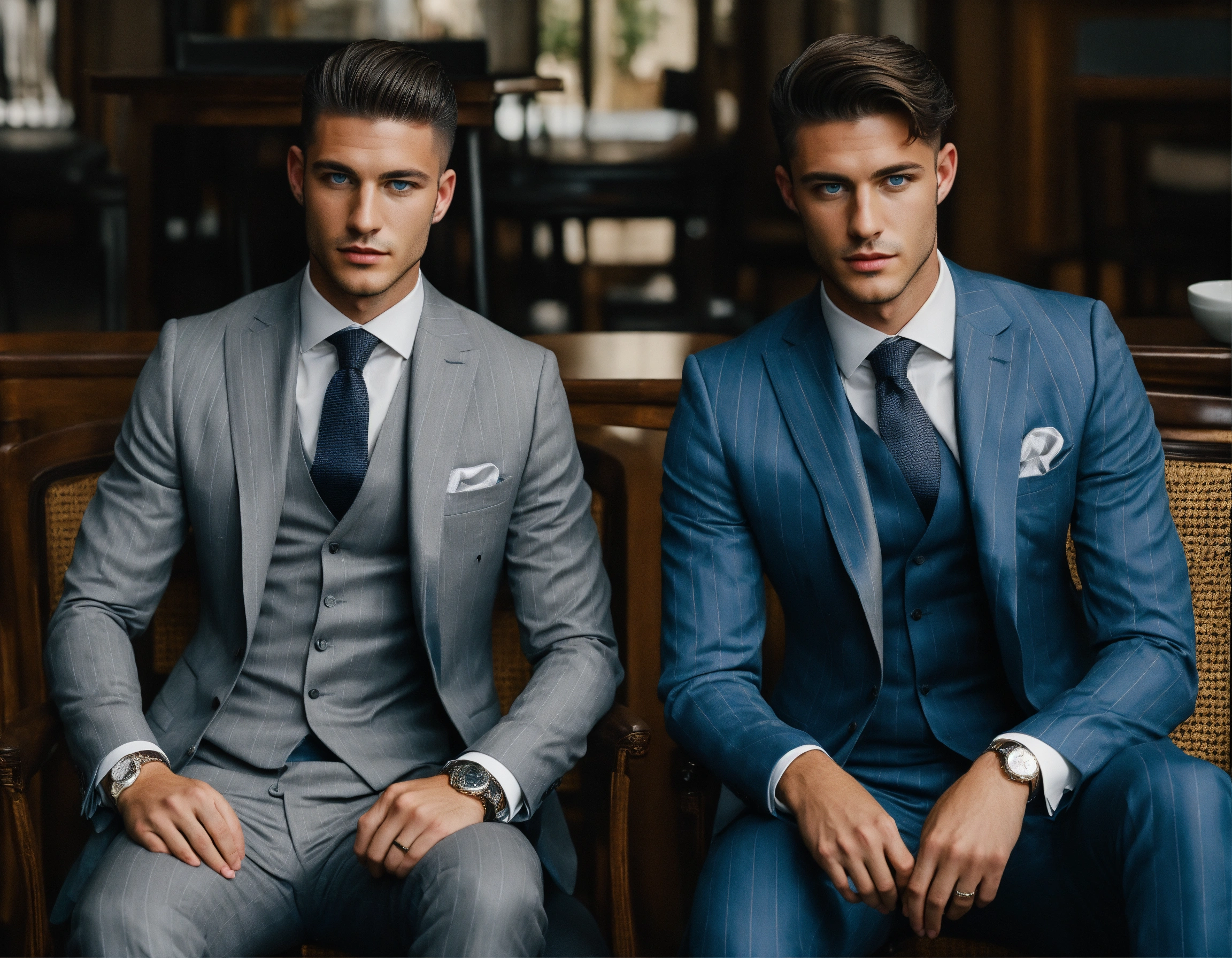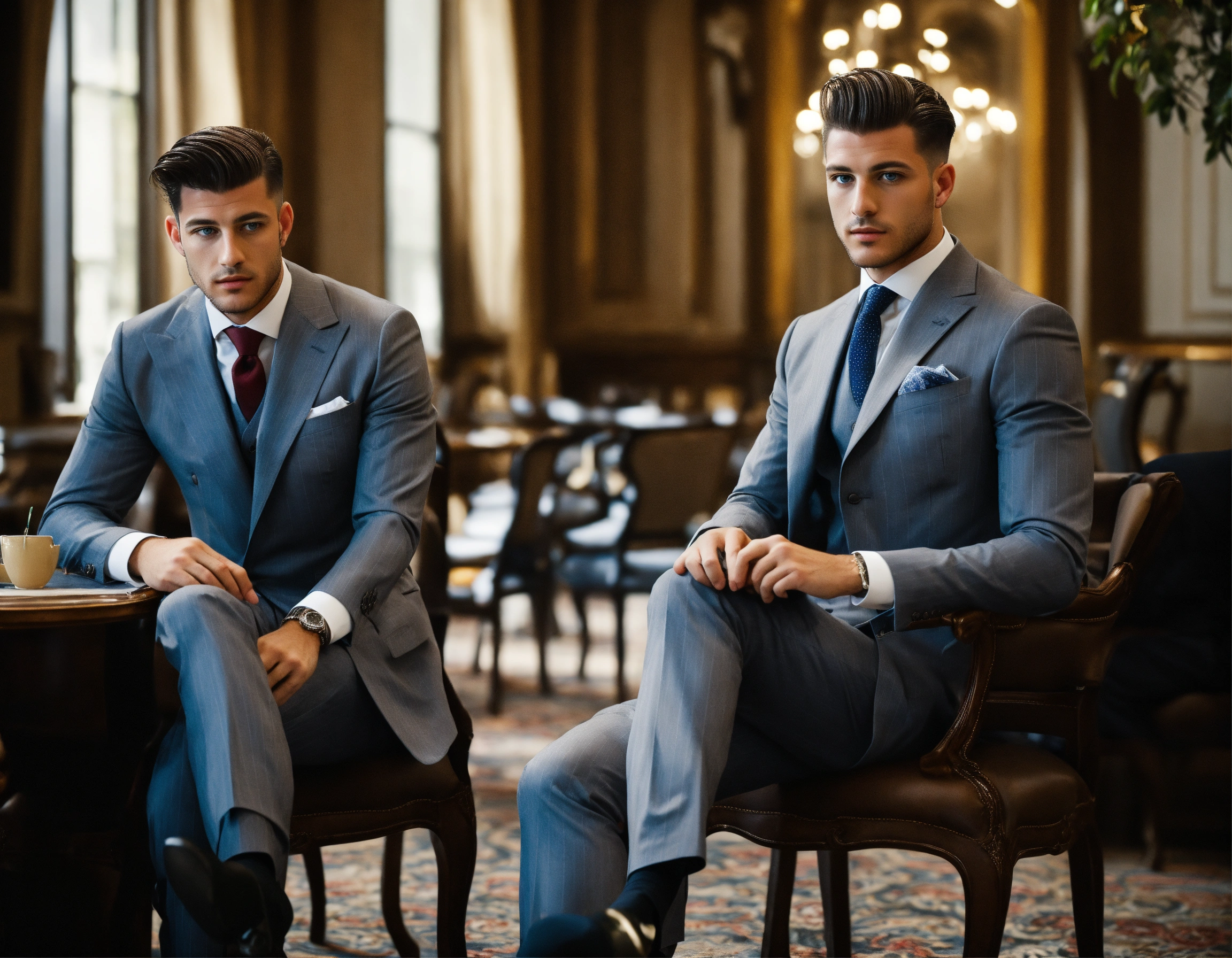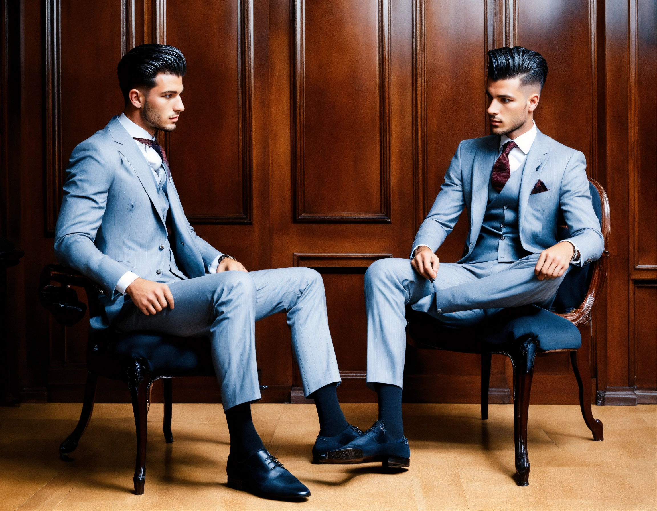 Two young italian businessmen in light grey pinstripe vested suit, blue eyes and pompadour haircut, seating on chairs