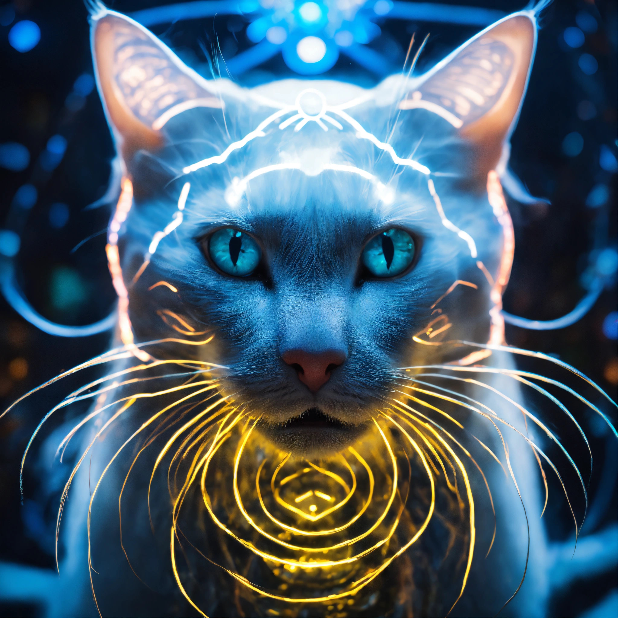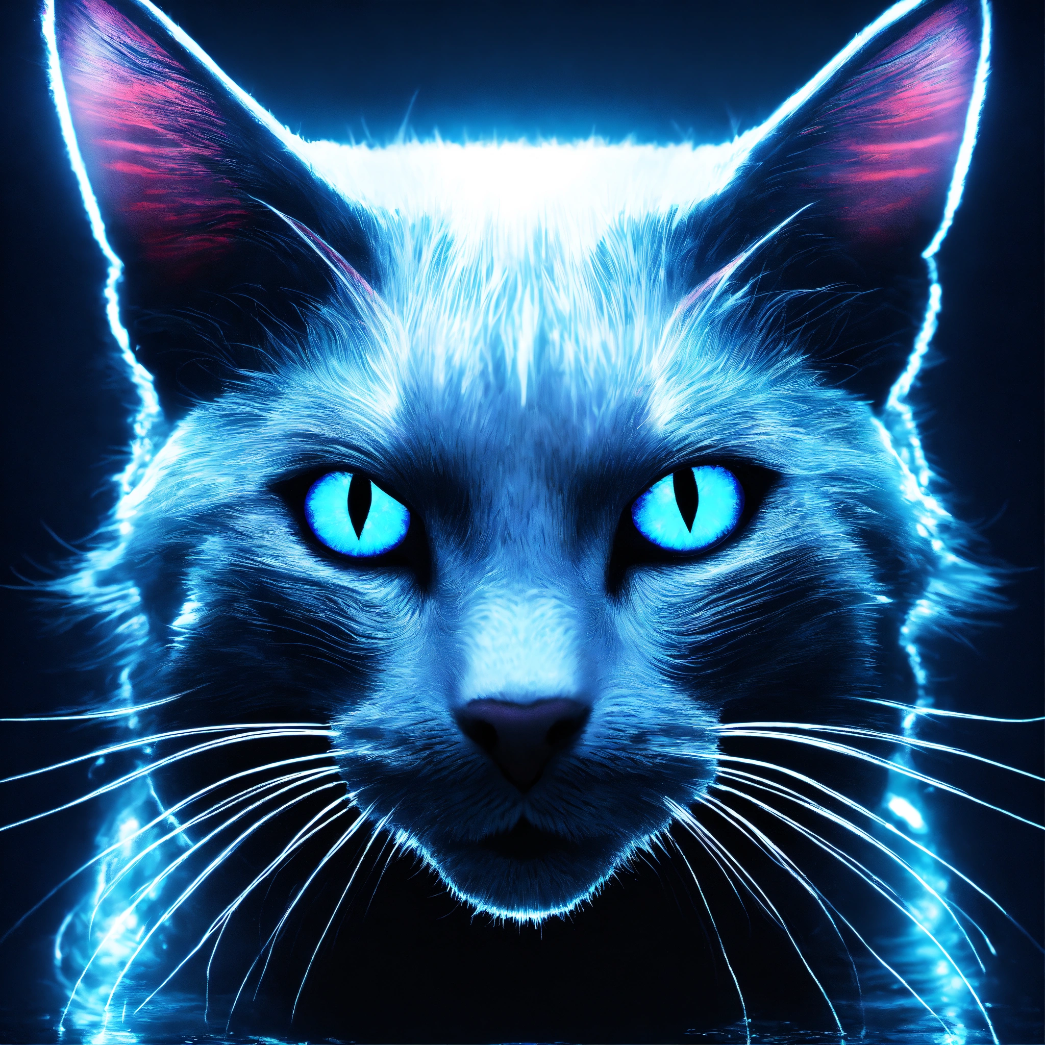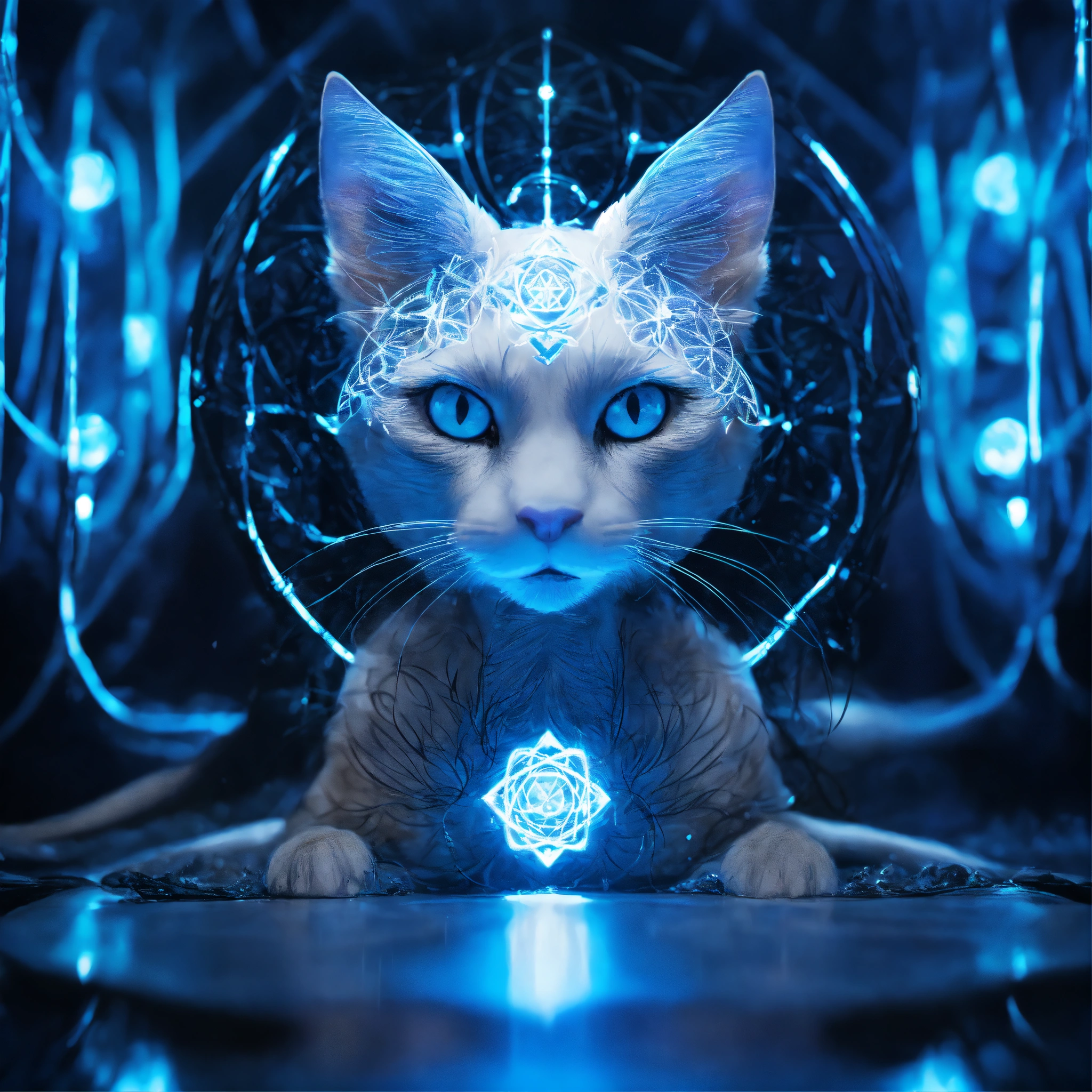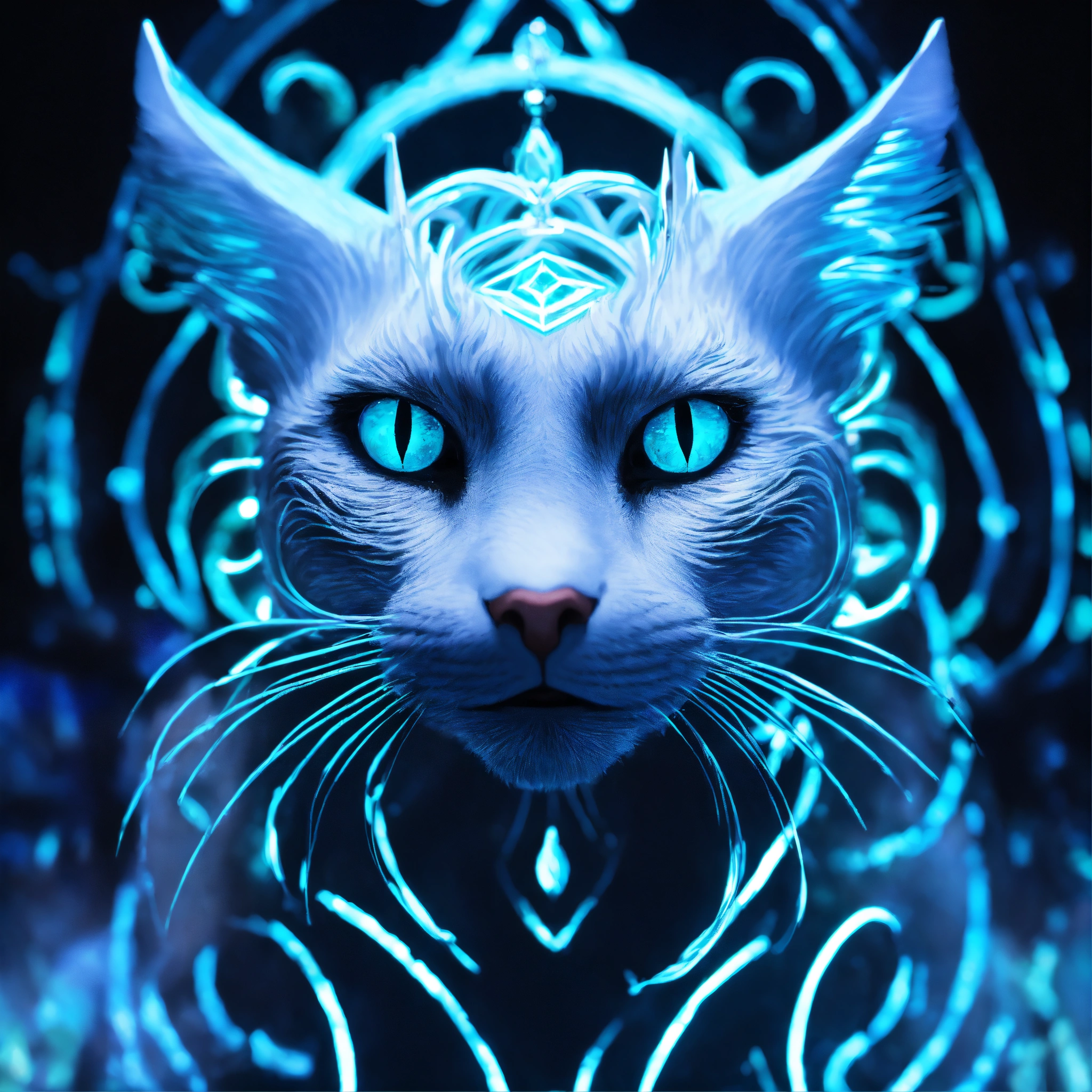 Underwater portrait photography, long exposure, powerful smiley mystic white and black cat face portrait facing front, blue eyes. front view. front portrait, no angle. backlit. white neon glow. angelic face. sacred geometry patterns on the face, in the style of disney, pixar, tim burton, chronicles of narnia, beauty and the beast, and peter pan. enchanting glowing orb aura. fractal, volumetric lighting, backlit. the power of the god. god-like, spirit-like.