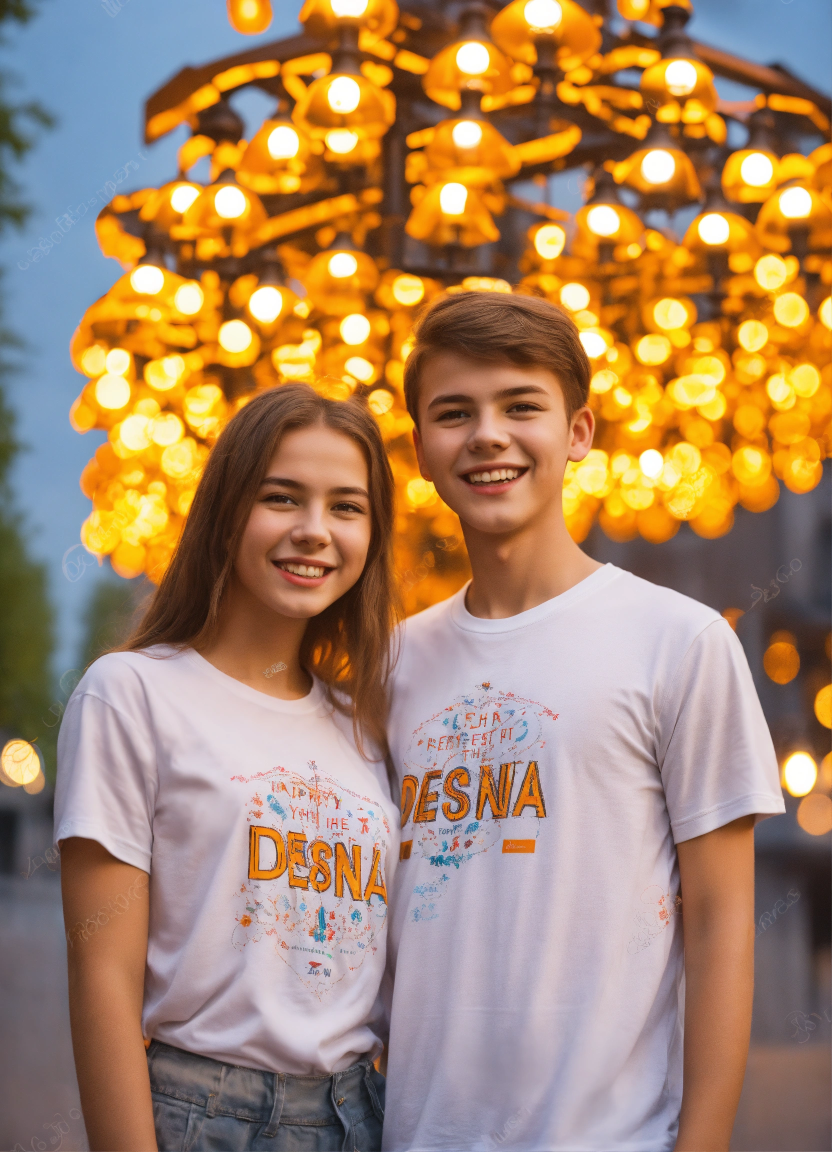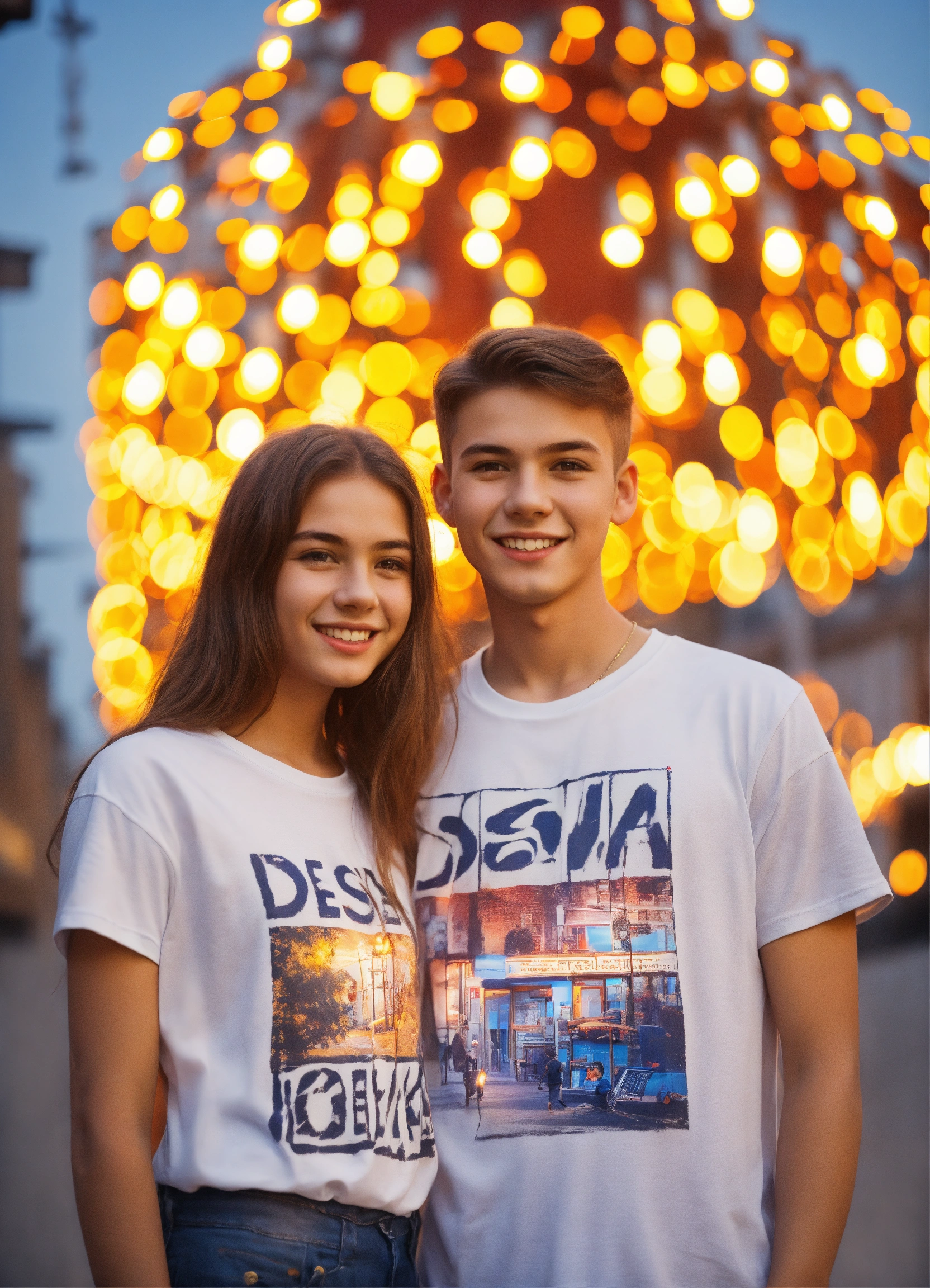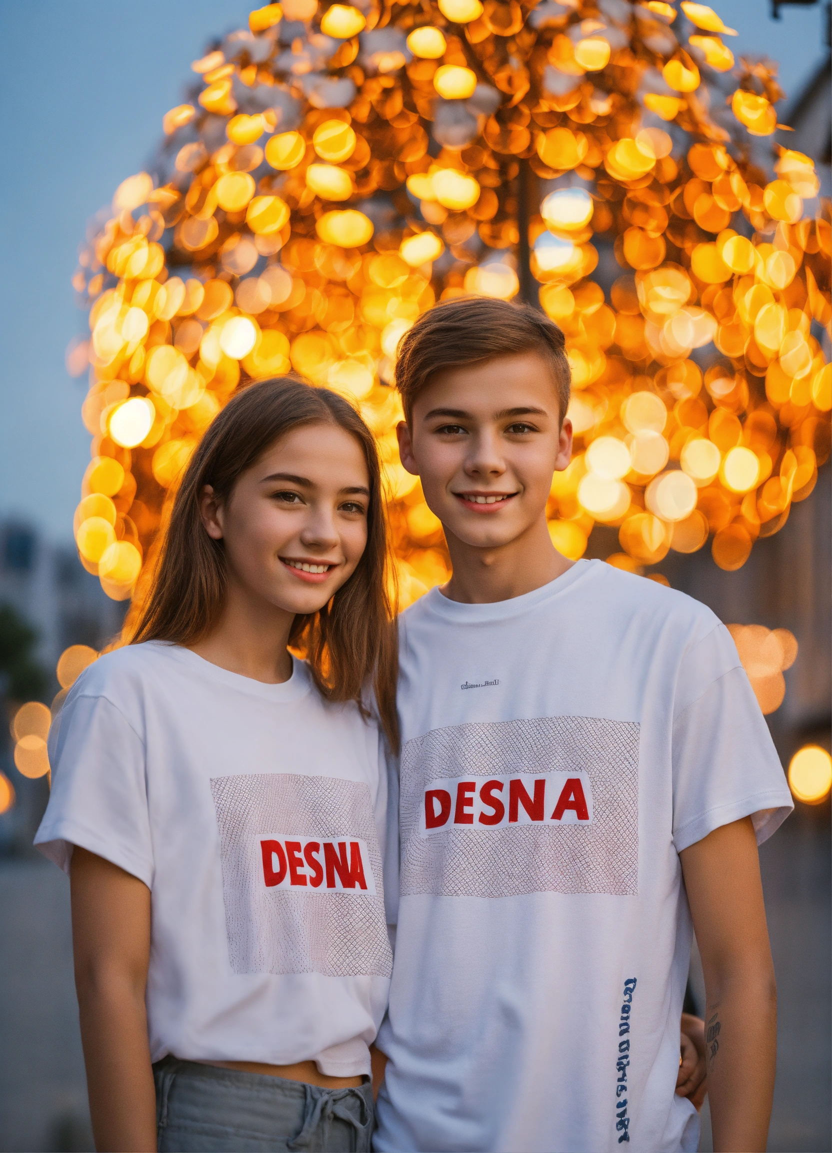 Happy young people boy and girl in white t-shirts with the inscription "desna light portrait against the background of street lamps