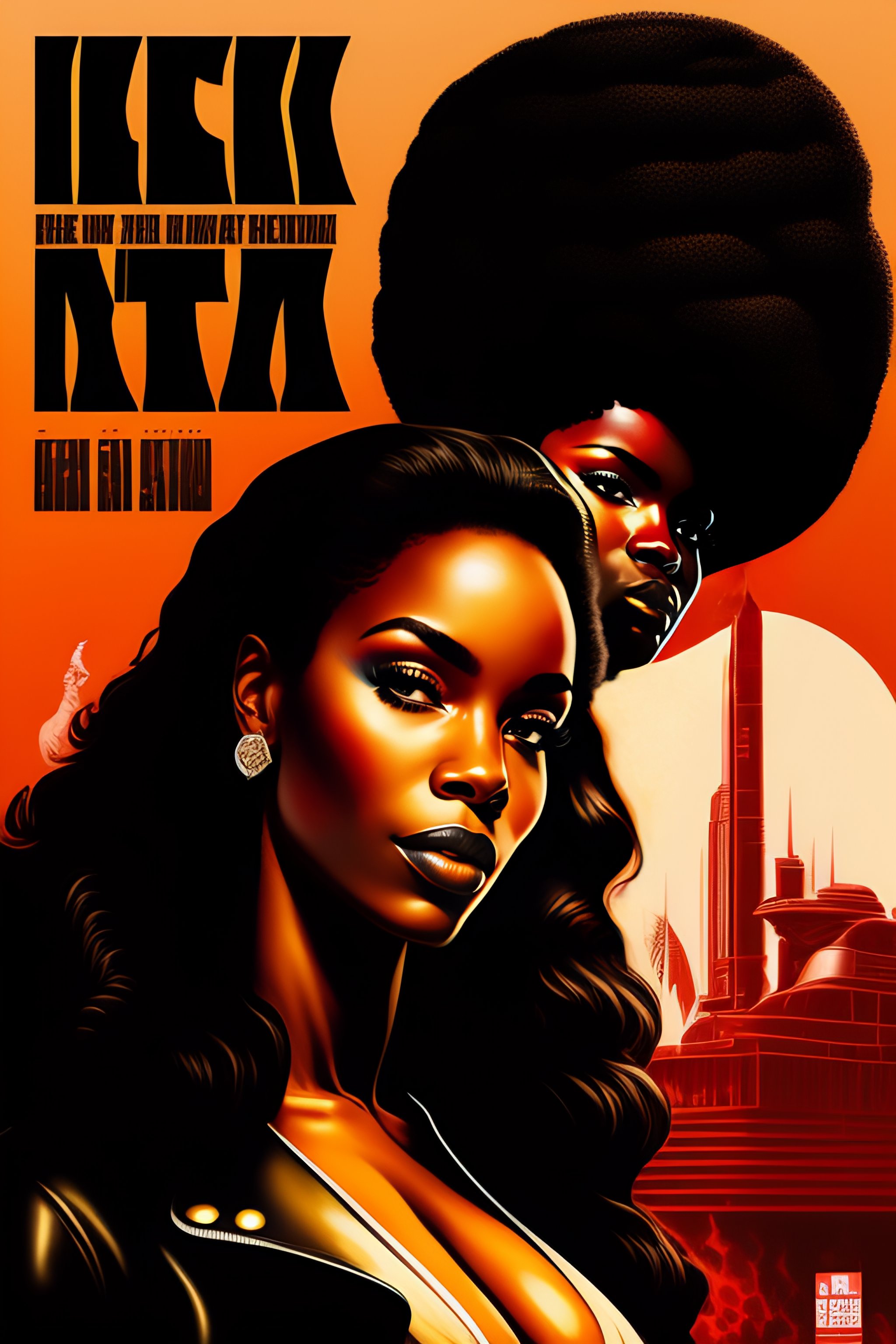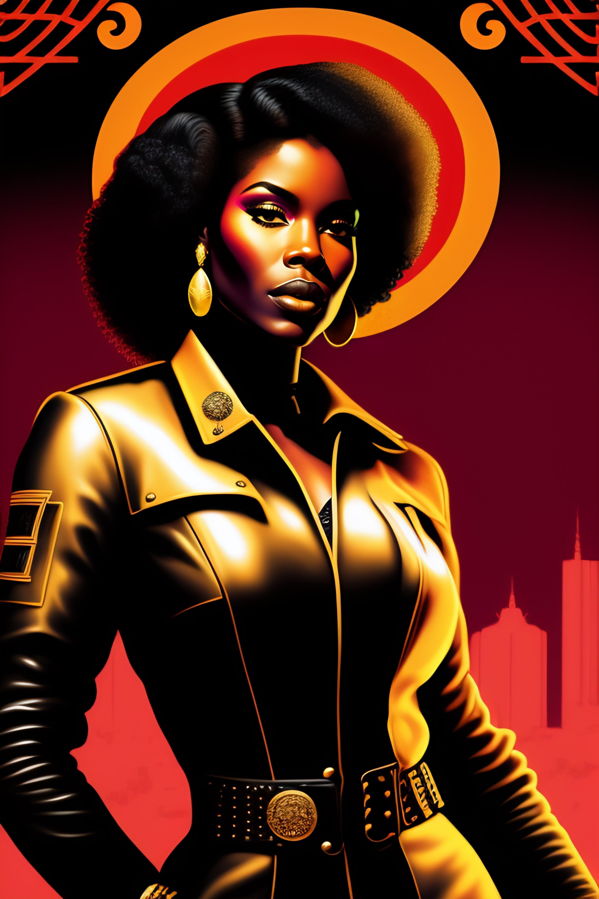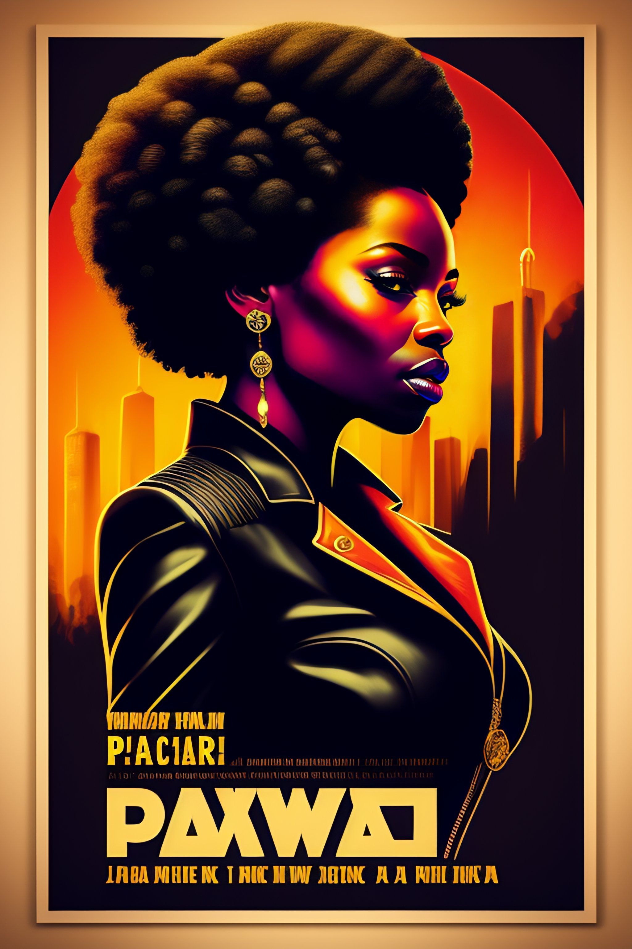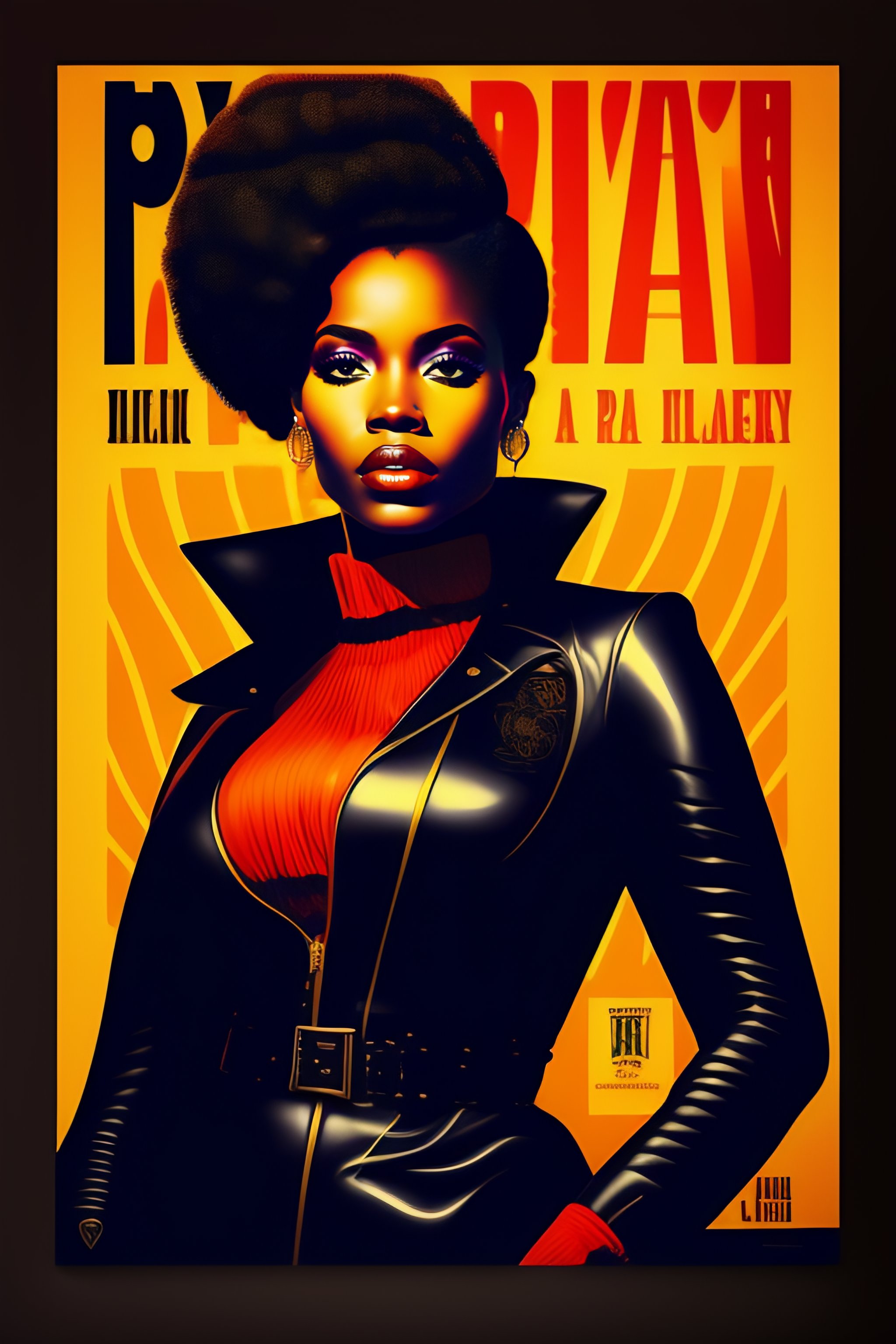 Black woman afro black panther party, political poster, leather suit, mercenary, retro cover, high details, intricate details 60s, inking, dark colors