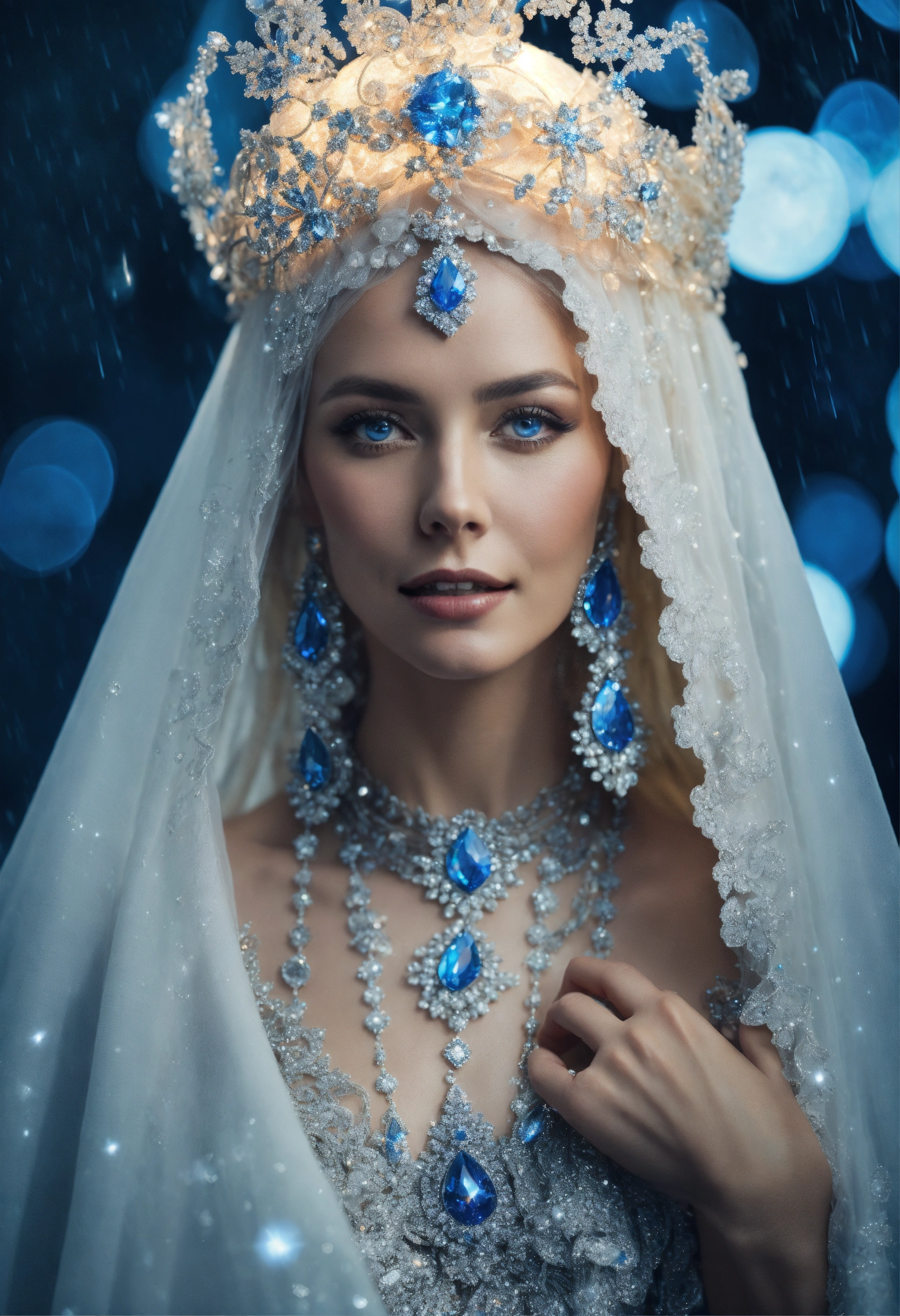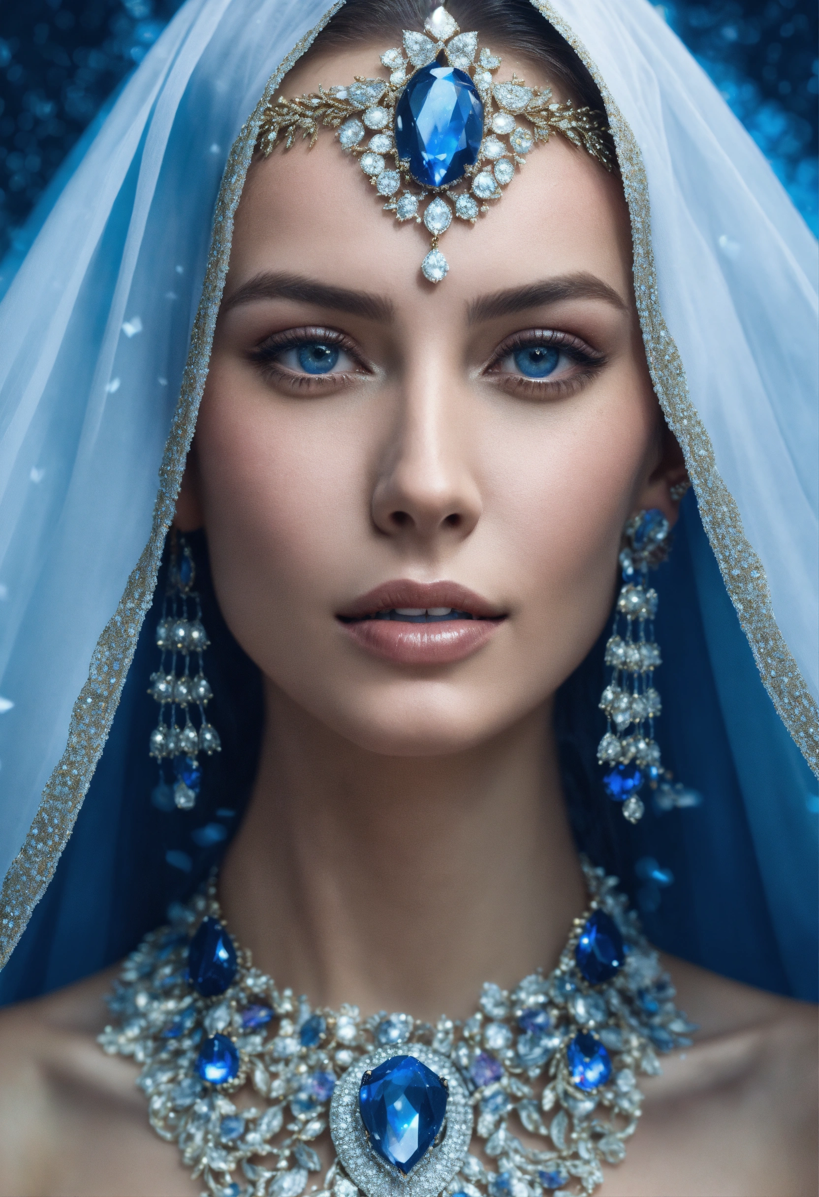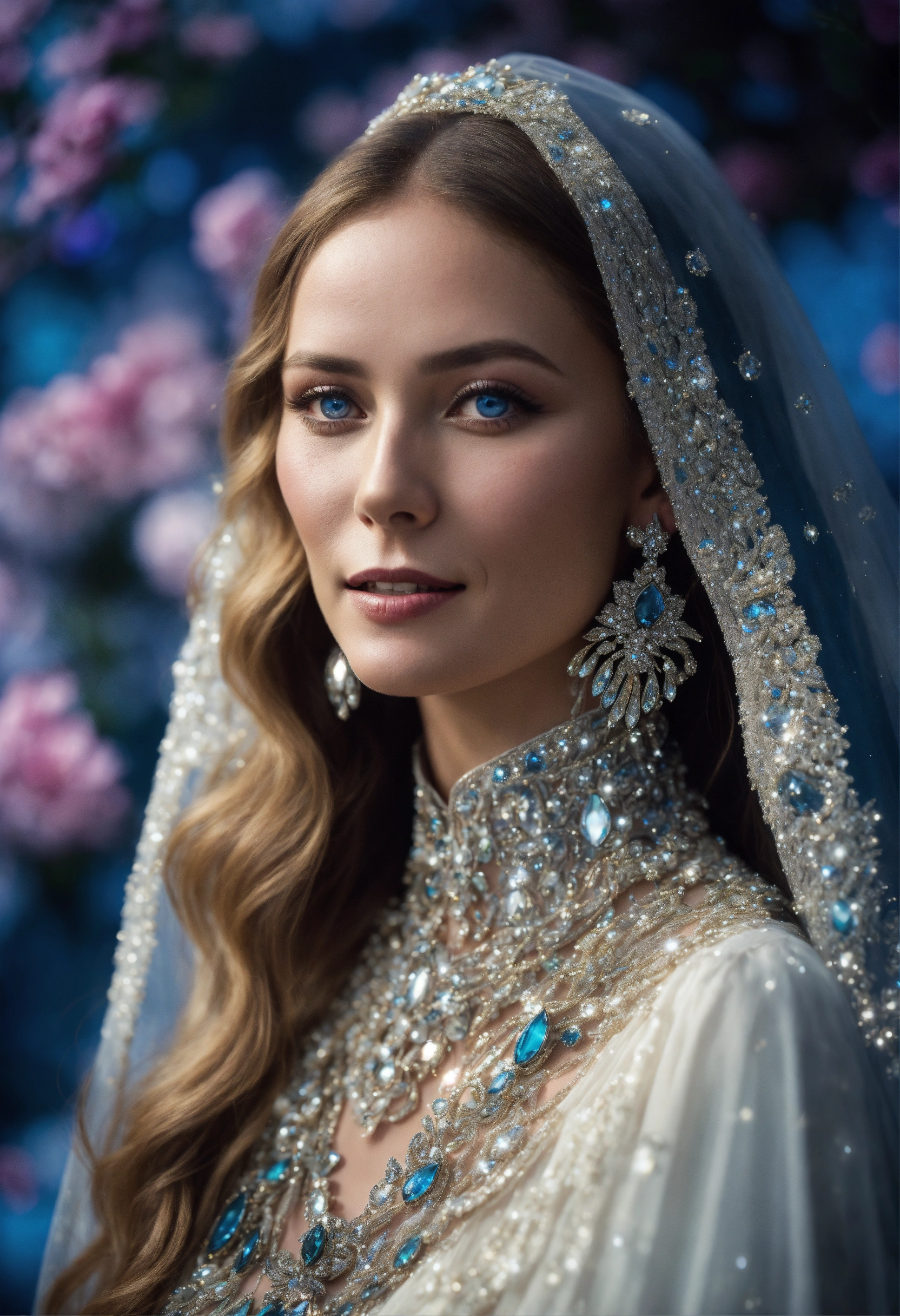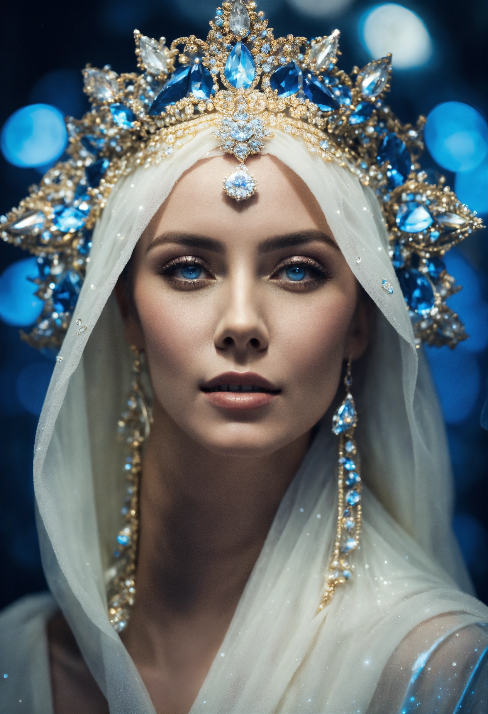 Iconoclastic surreal triumphant close up photograph of very thin elegant queenly white fashion supermodel glorified 40 year old virgin mary facing forward looking directly ahead into camera, elevated high cheek bones, stunningly gorgeous, staring lovingly straight ahead directly into camera at me with glowing blue eyes, beautiful kind smile with perfect teeth, empress of the universe, queen of the moon, long black hair covered by magical sparkling veil, wearing ethereal sparkling robes of galaxy blue and diamond white with high neckline and diamond collar, symmetrical, iconic, striking, award winning photo, powerful, emotional, glorious photo, background is heavenly-lit clouds and raining sparkling rose petals.