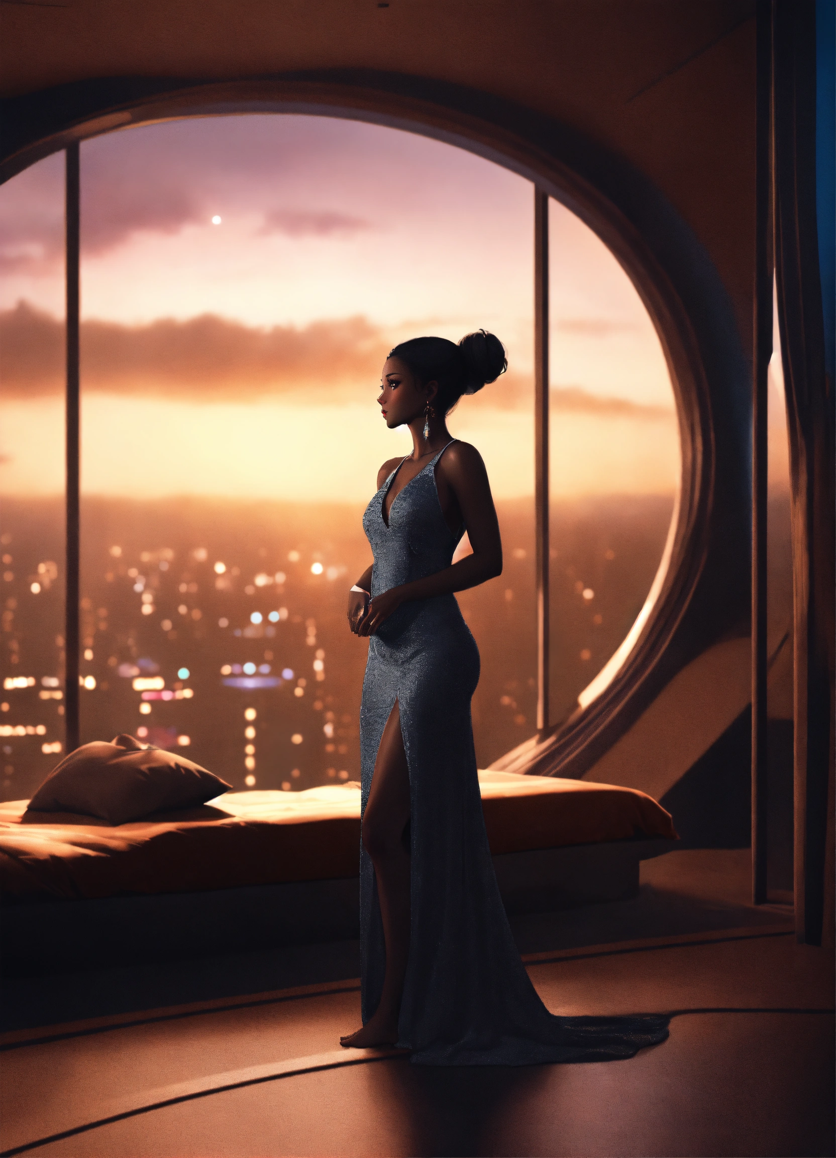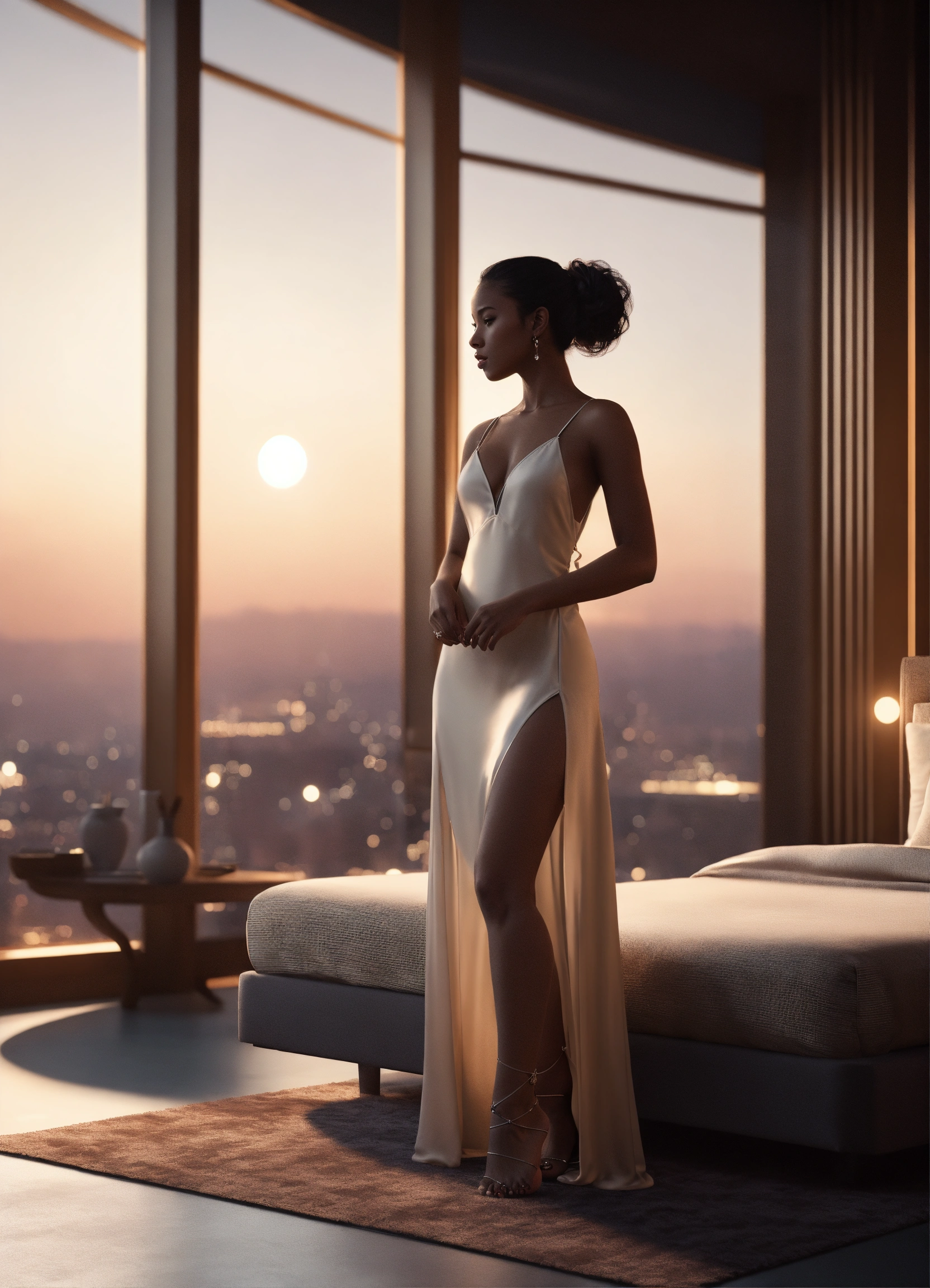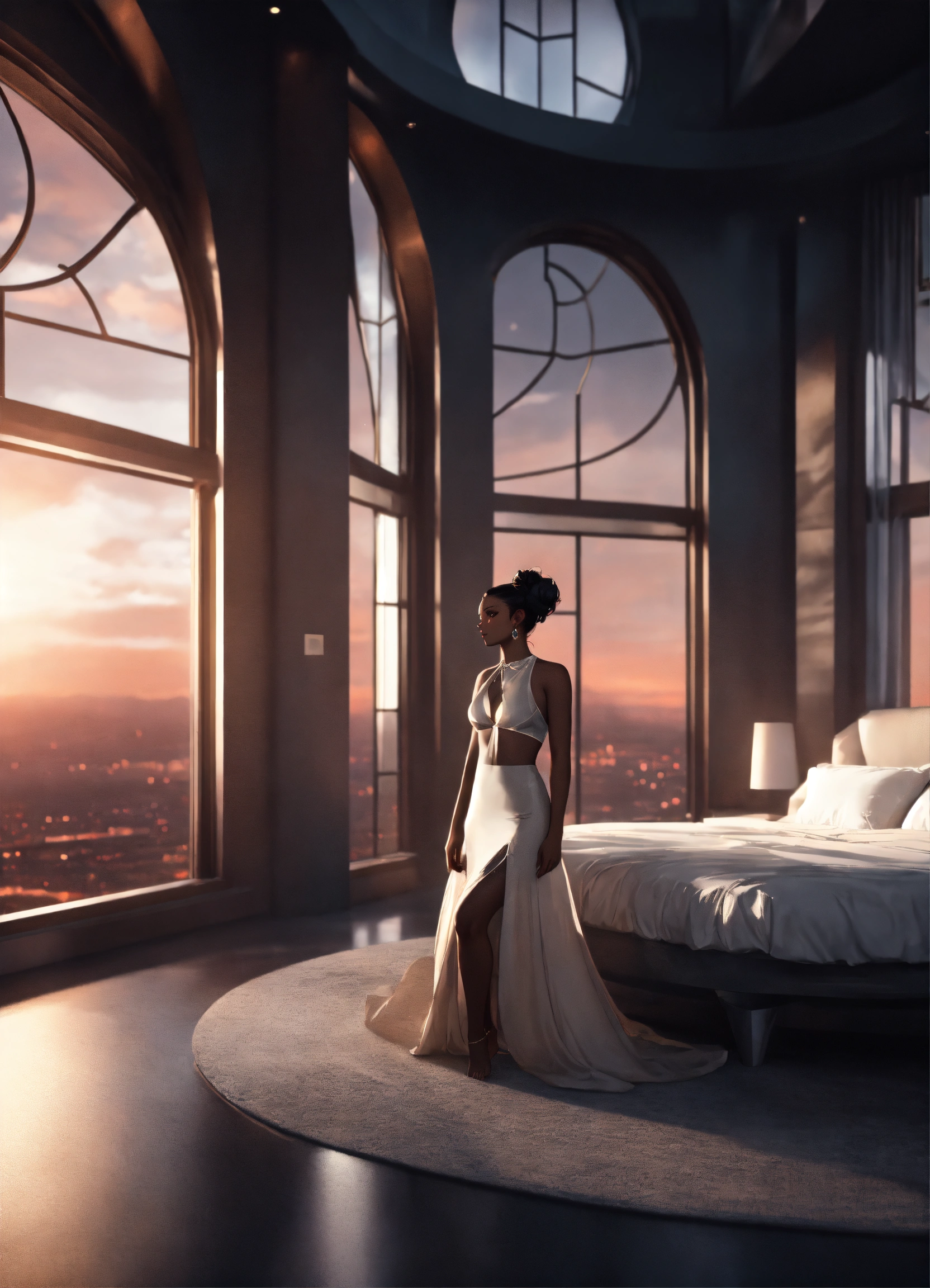30 years old, dark skin female, and long dark hair on bun, wide hips, dressed in alluring nighty, barefoot, in large upscale futuristic bedroom. bright monochrome furnishings large round windows, serious demeanor, night sky, 8k, unreal engine.