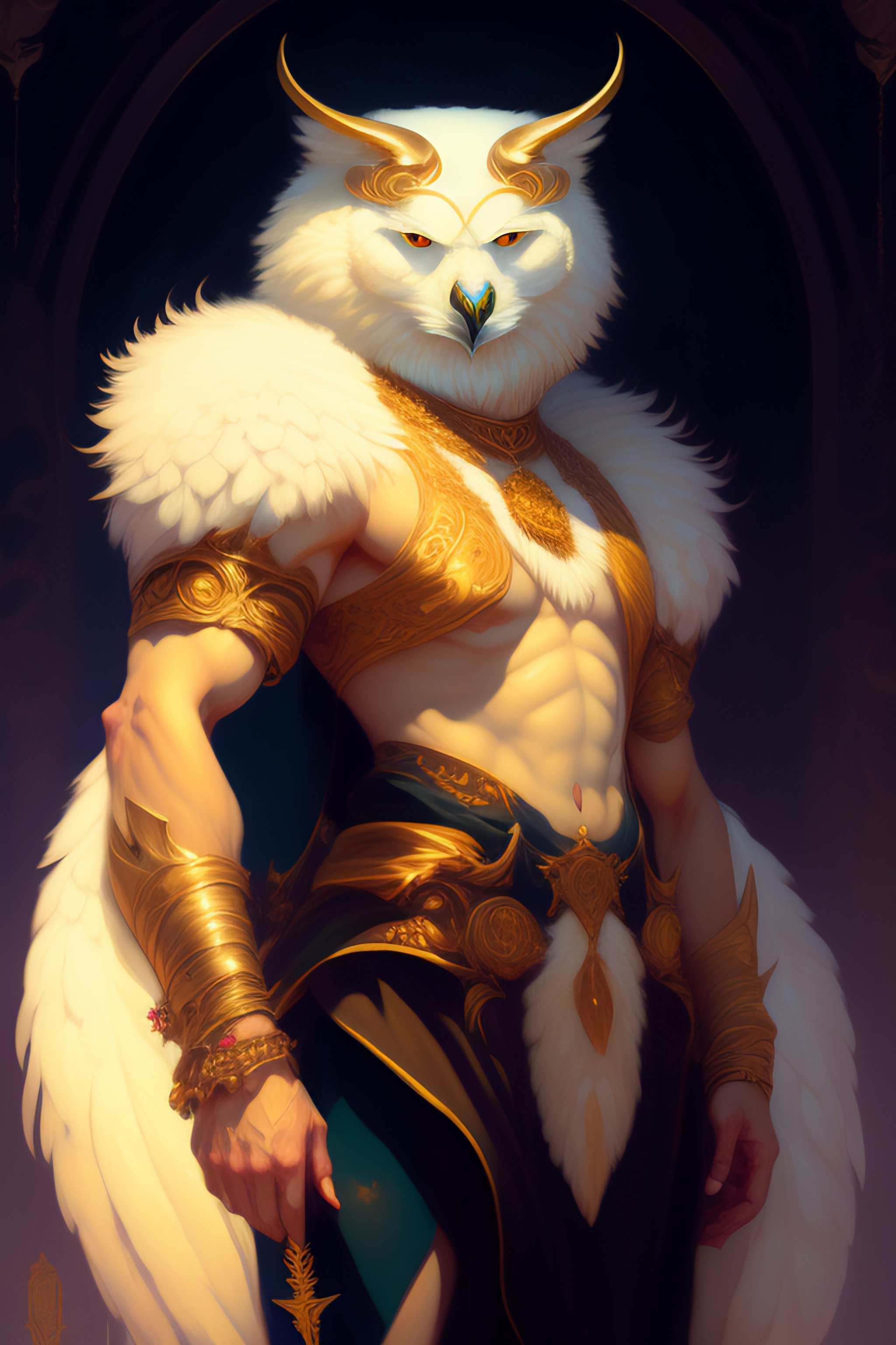A fullbody snow owl man monster, humanoid, big, clawy hands, fluffy, muscles, white fur, white feathers, slend, mesomorph, sharp focus, dungeons and dragons, rpg arstation, empty handed, illustration, concept art, on parchment., da vinci notes, ultradetailed, artstation, art by greg rutkovski and peter mohrbacher and alphonse mucha