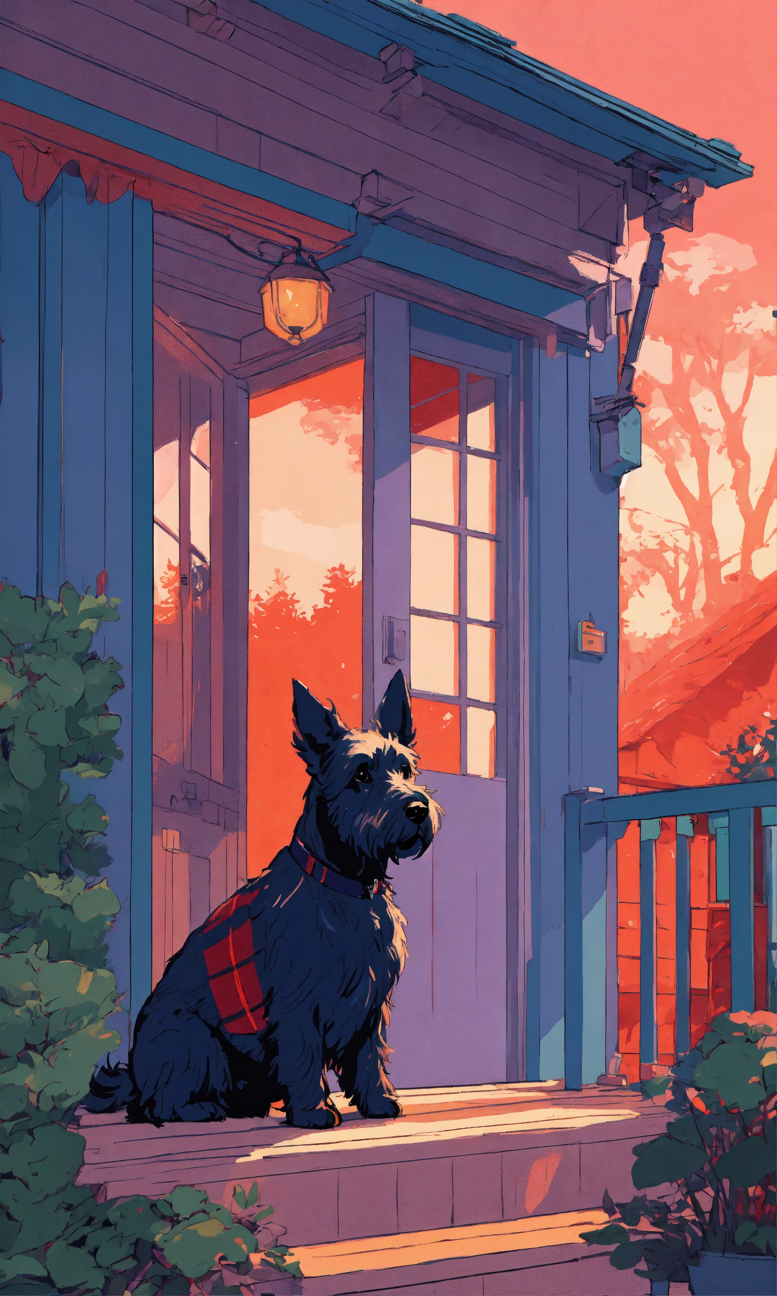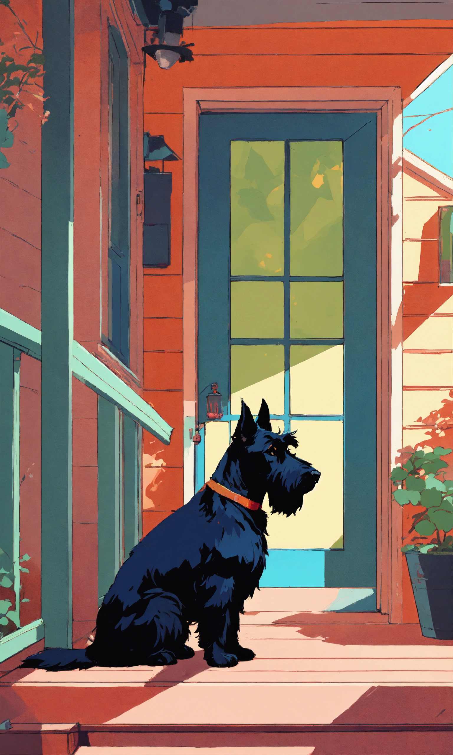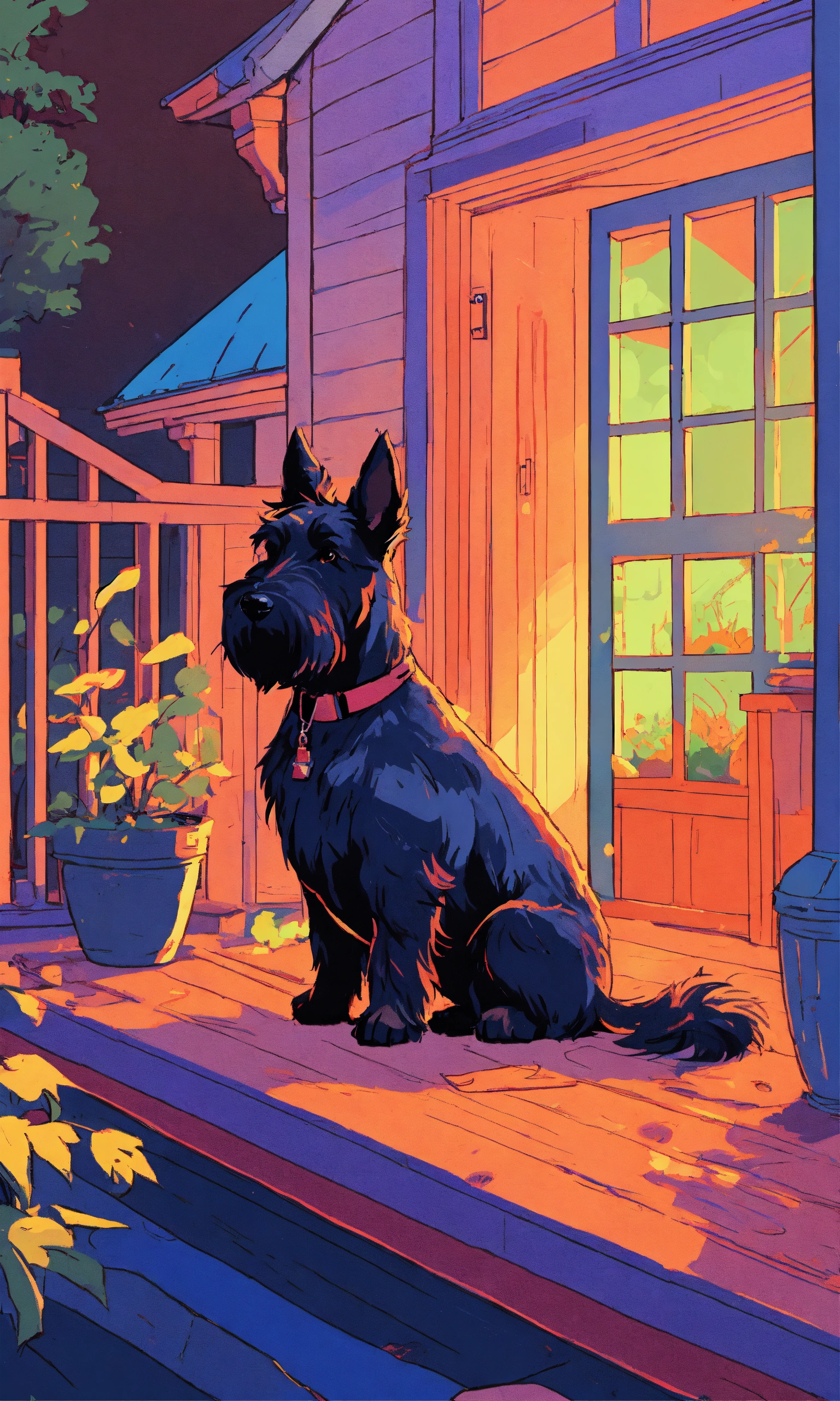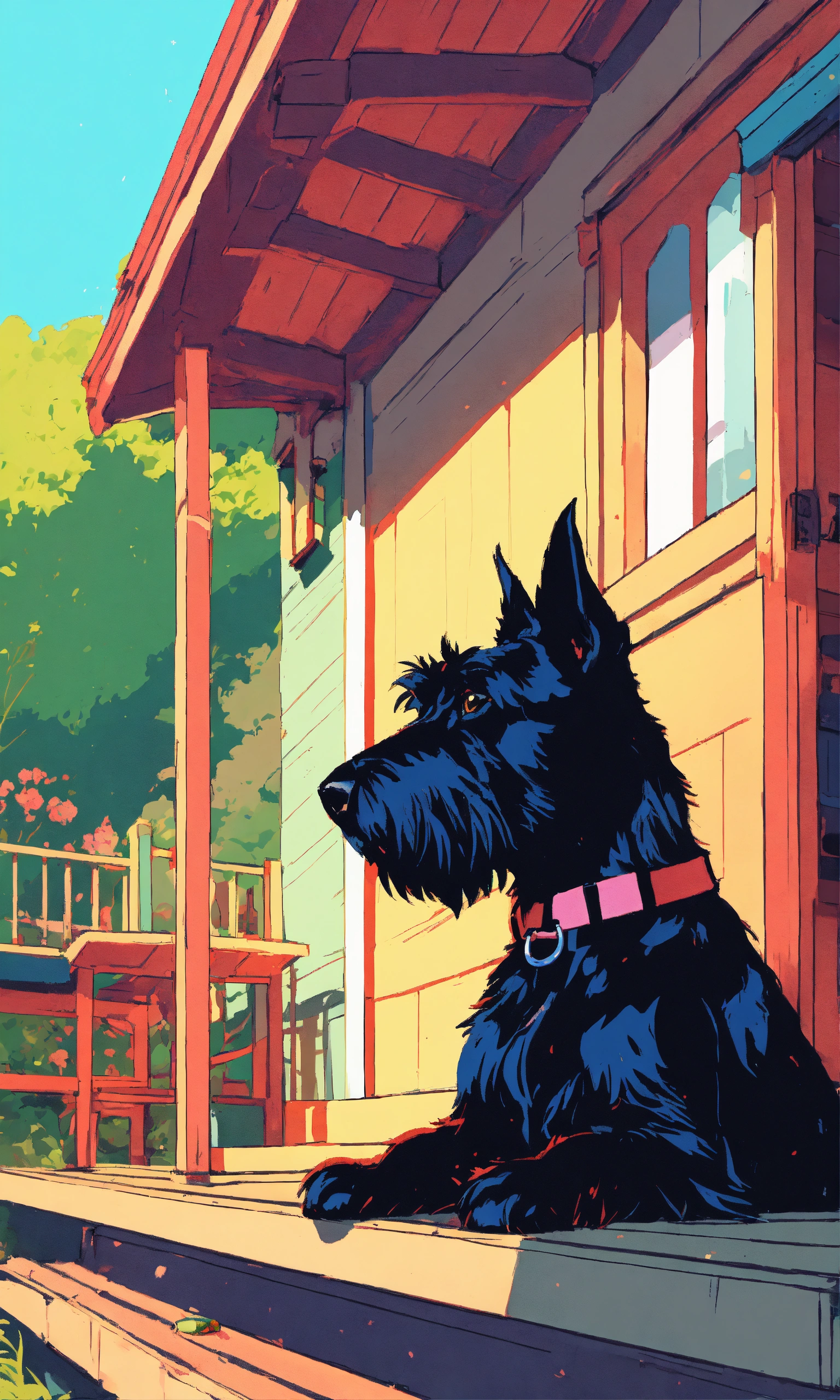 Risograph digital art of a scottish terrier on a porch, cartoony style of laurie greasley, studio ghibli, akira toriyama, james gilleard, genshin impact, trending pixiv fanbox, acrylic palette knife, 4k, vibrant colors, trending on artstation, low details