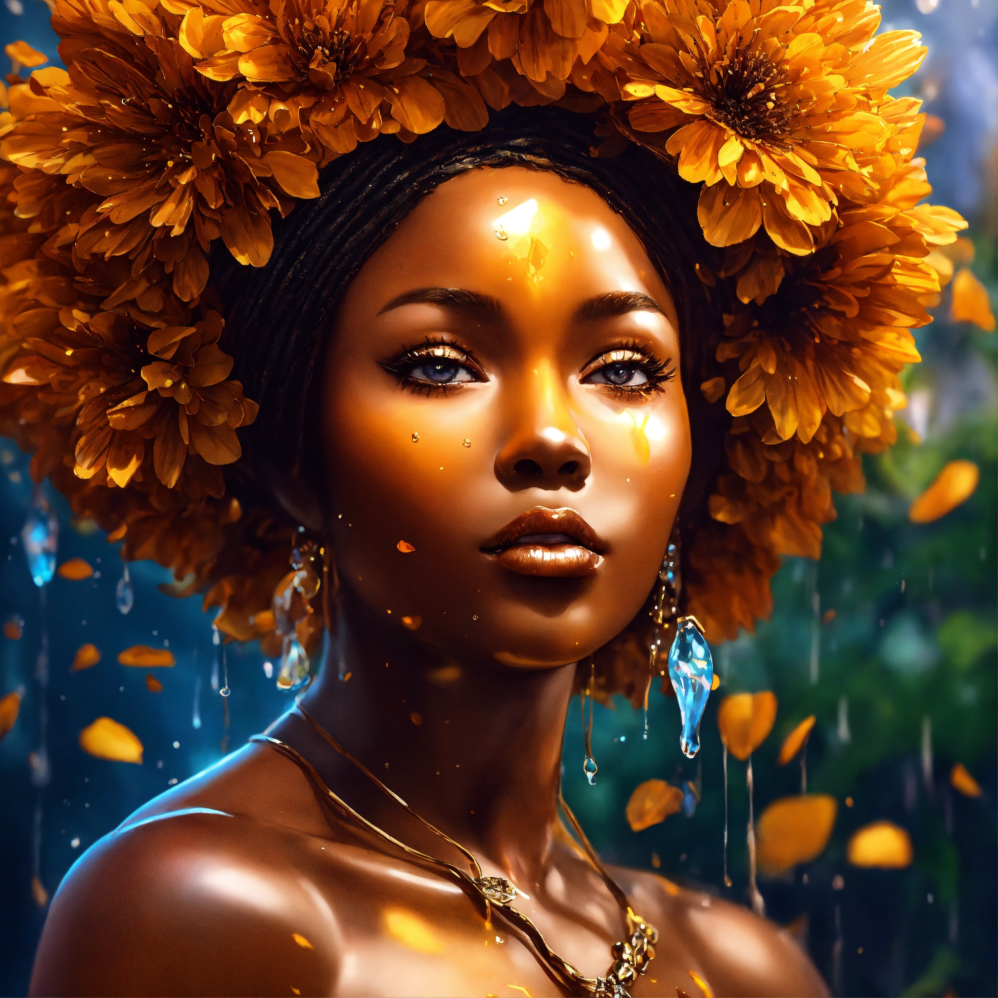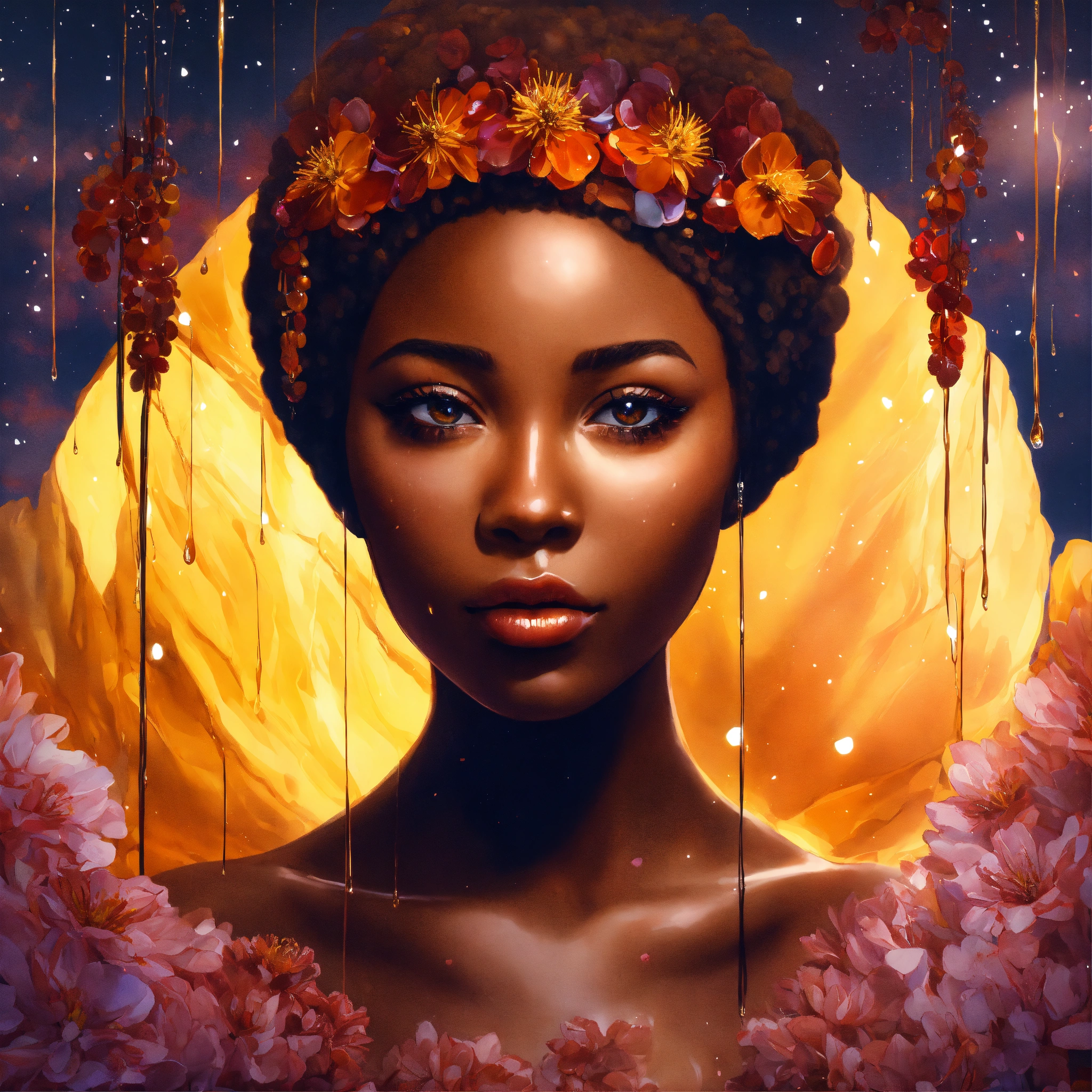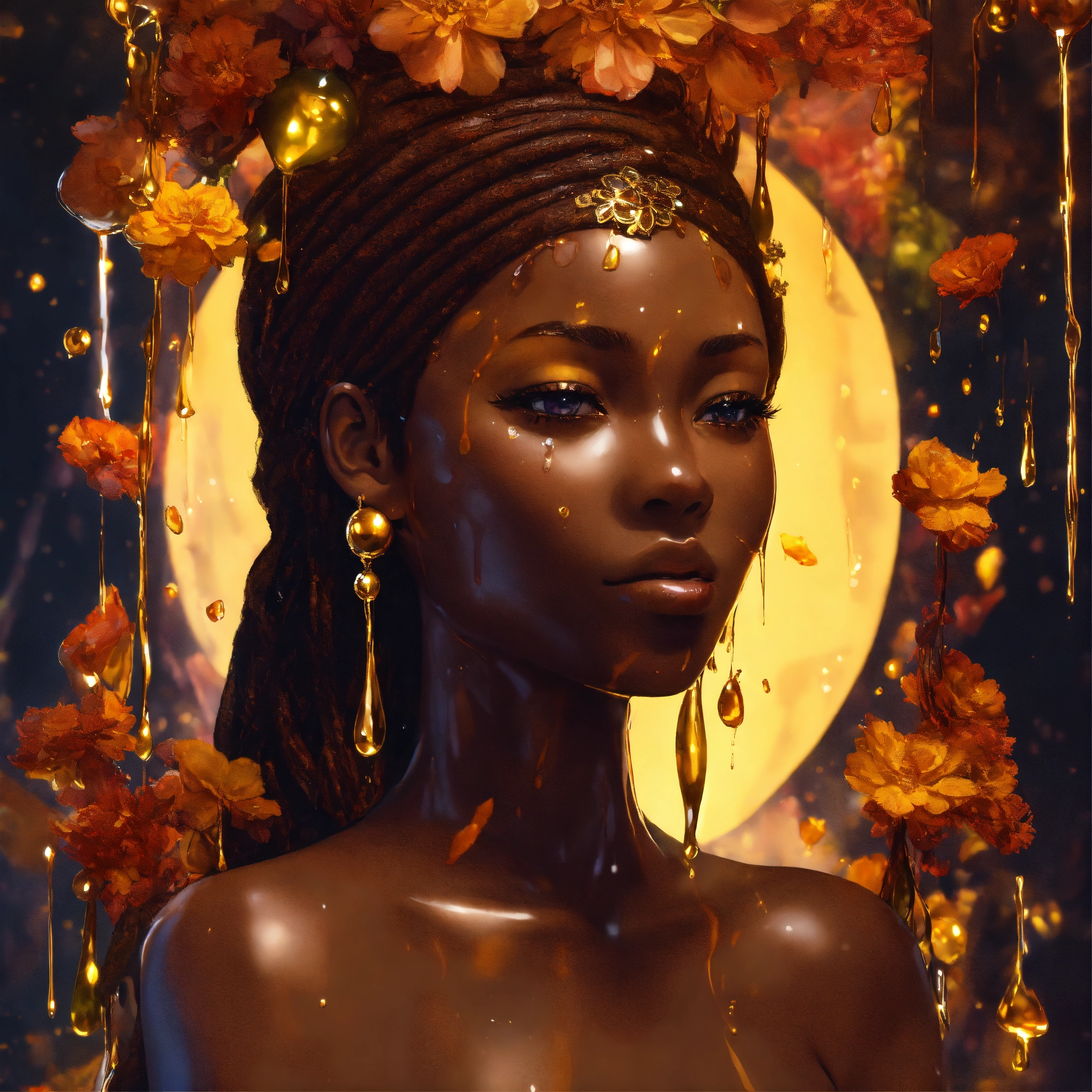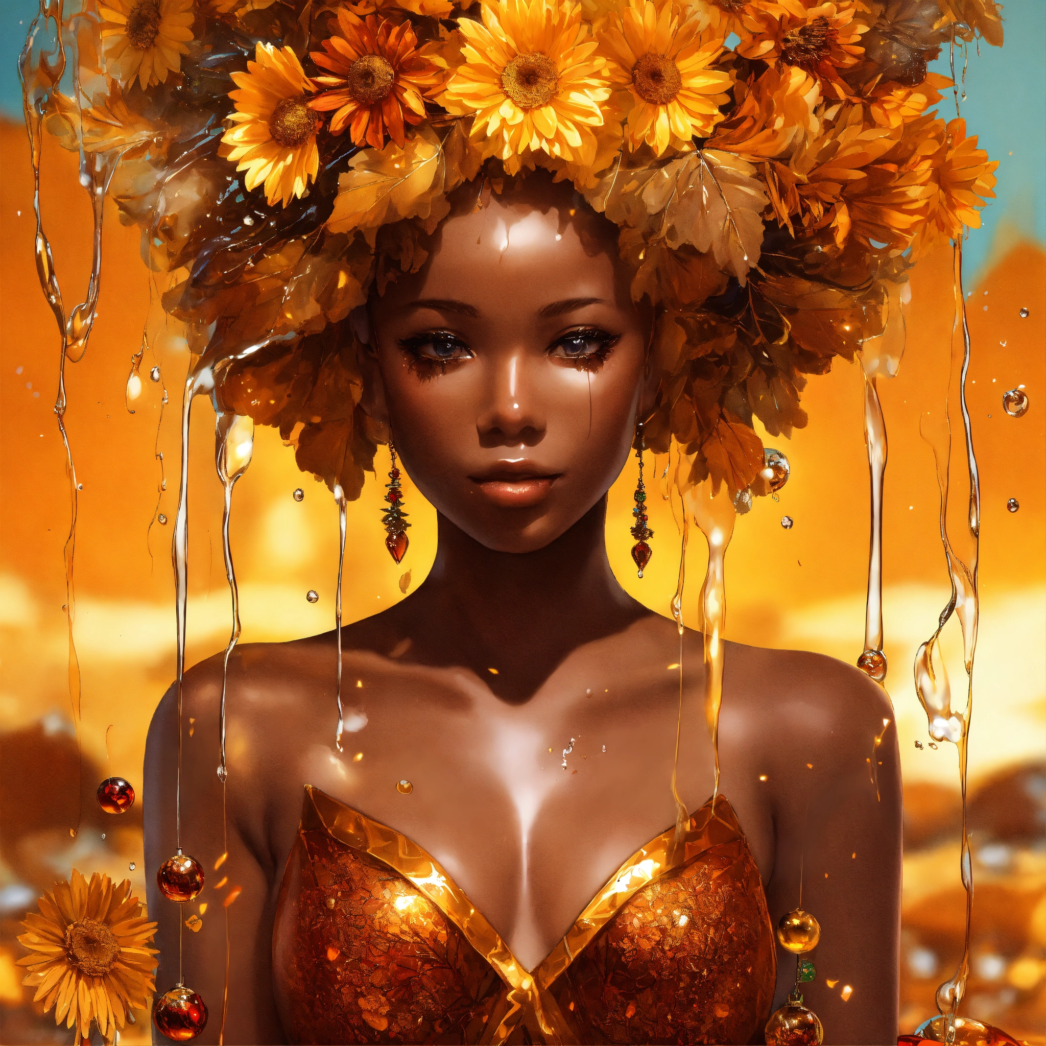 Deep mahogany dark complexion afrocentric woman, made of amber glass with honey flowing through her visible veins, waterfall of a dripping motor oil like substance flowing over her with winter seasonal flower petals sticking at various pulse points, 3d art, this art work tells a story of the beauty of women shining through and enduring strength. subject is facing towards the observer with slight smile and knowledgeable eyes. rule of thirds. front facing wide angle. kewpie kawaii. christmas theme