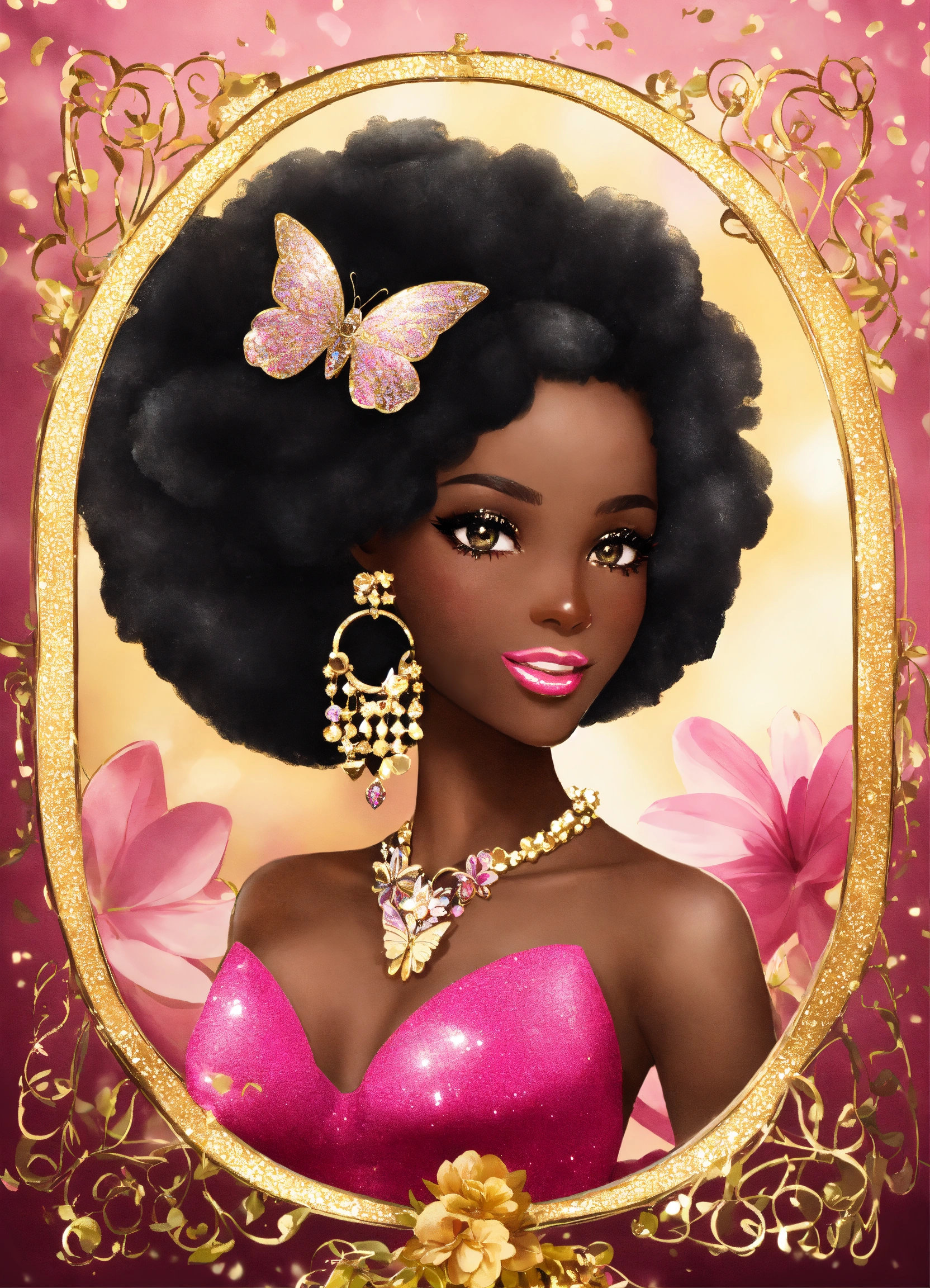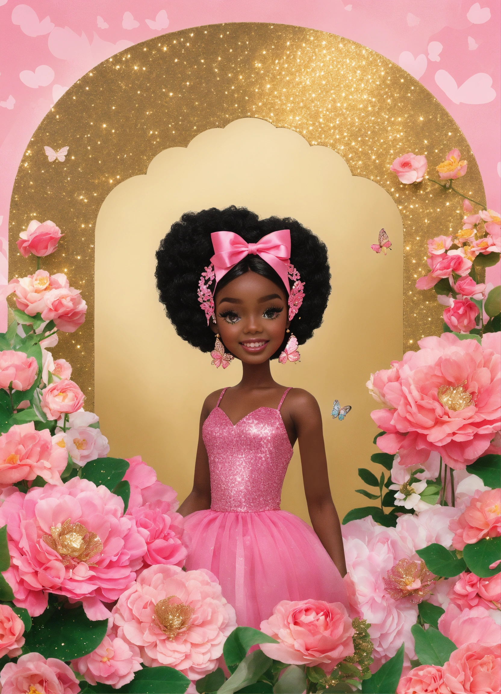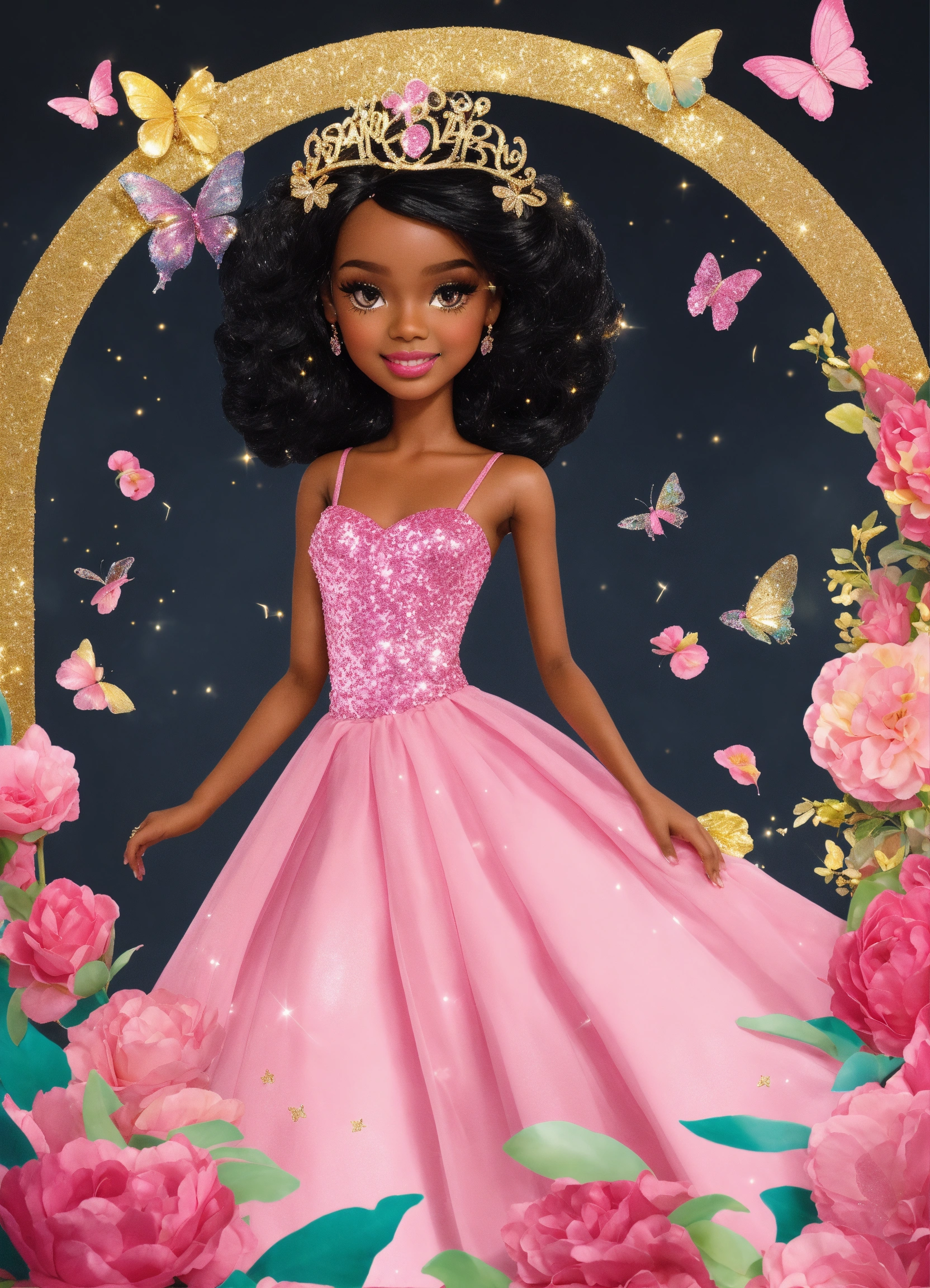 Develop a design concept for a 10 year old birthday party invitation inspired by the 'glittery glam barbie birthday bash.' the theme should continue to revolve around a black barbie doll, glittery elements, and shades of pink, gold, and silver. blank. this time, focus on incorporating the idea of a 'garden of glam' where black girl barbie is surrounded by glittery flowers, butterflies, and other enchanting garden-themed decor. the invitation should exude an air of elegance, charm, and whimsy. please ensure the design remains cute, unique, fun, and functional, with an emphasis on creating a visually stunning and unforgettable invitation.