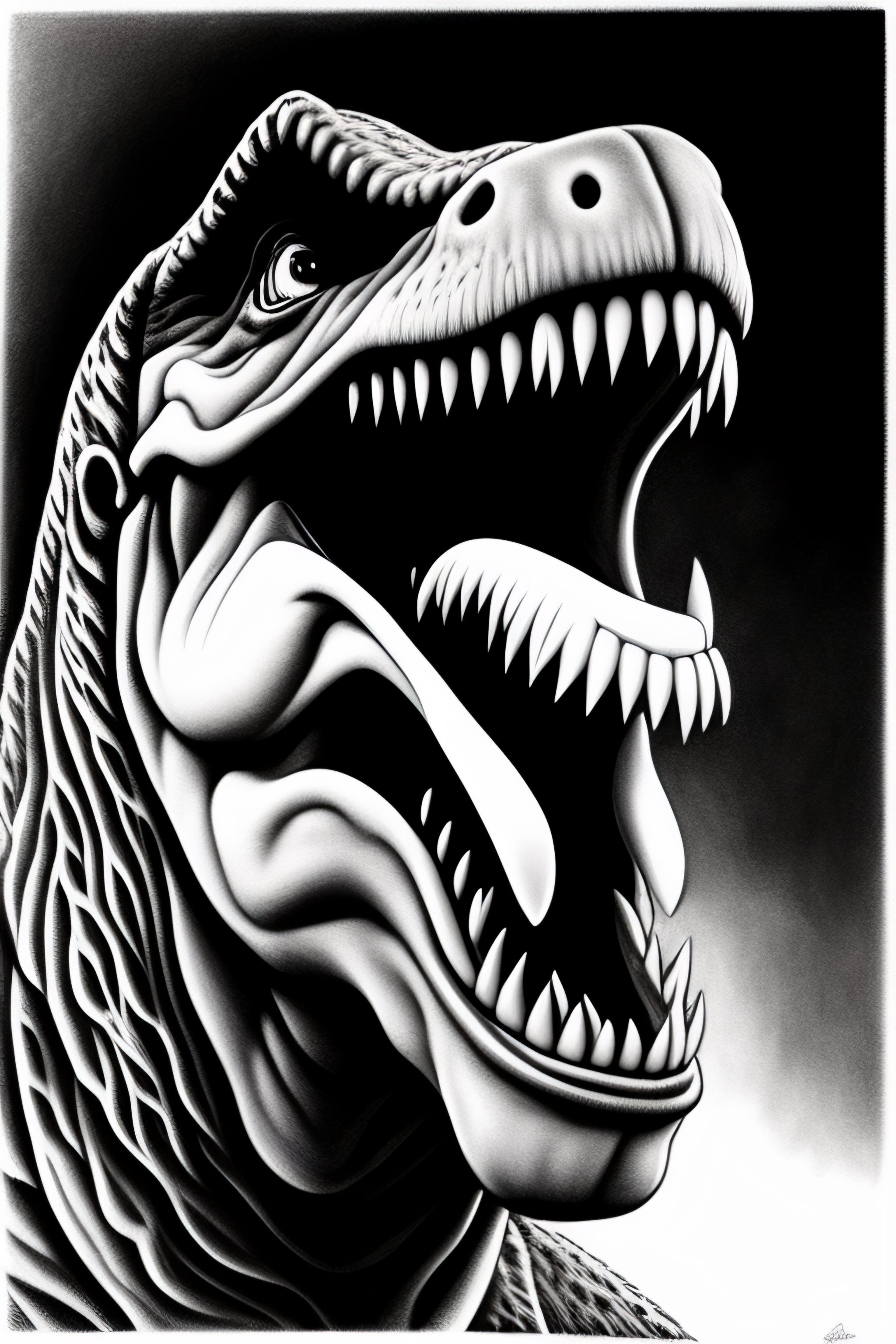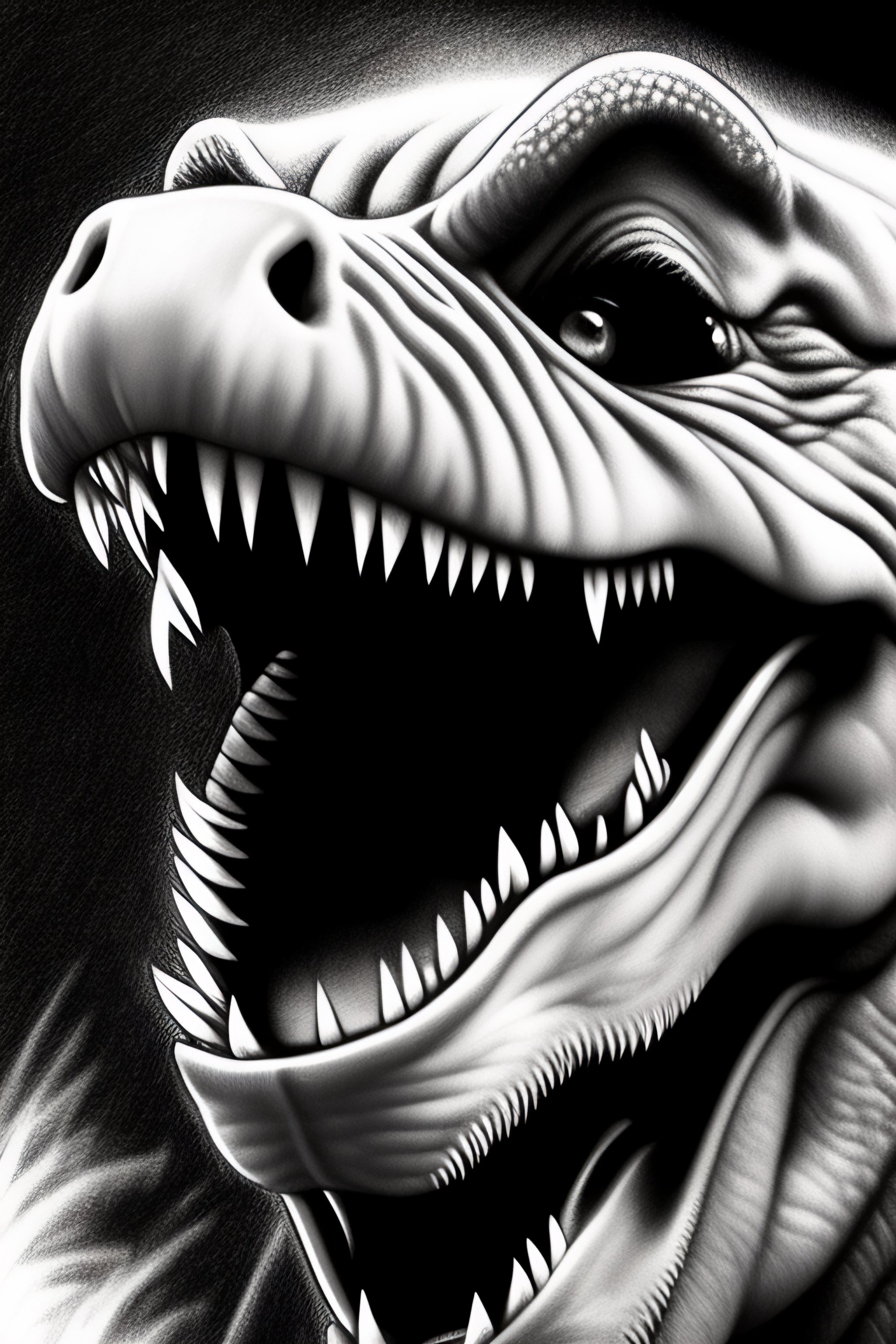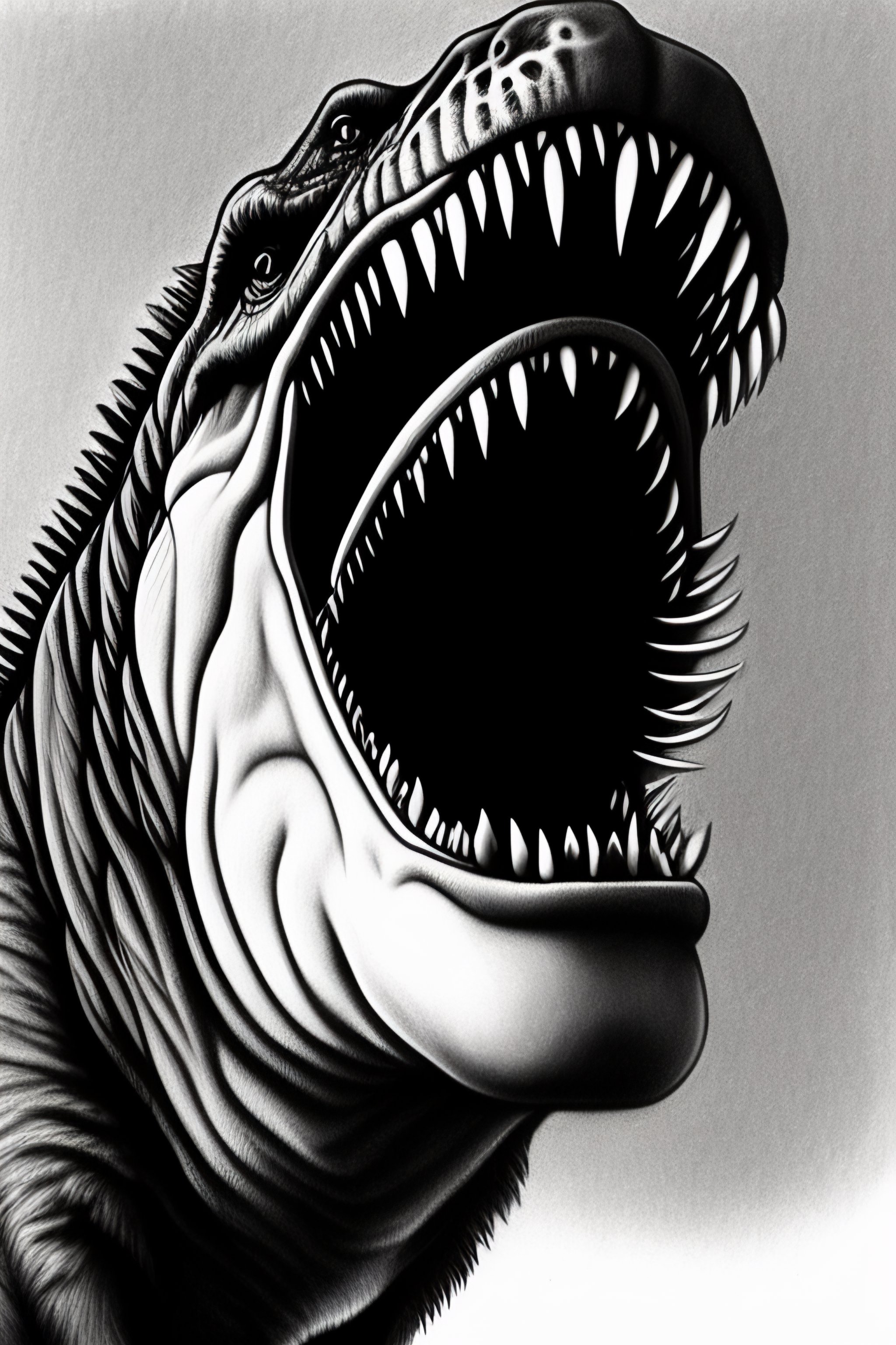 Close up head of a trex screaming, monochrome, manga, realistic, drawing, highly detailed, pencil, anime