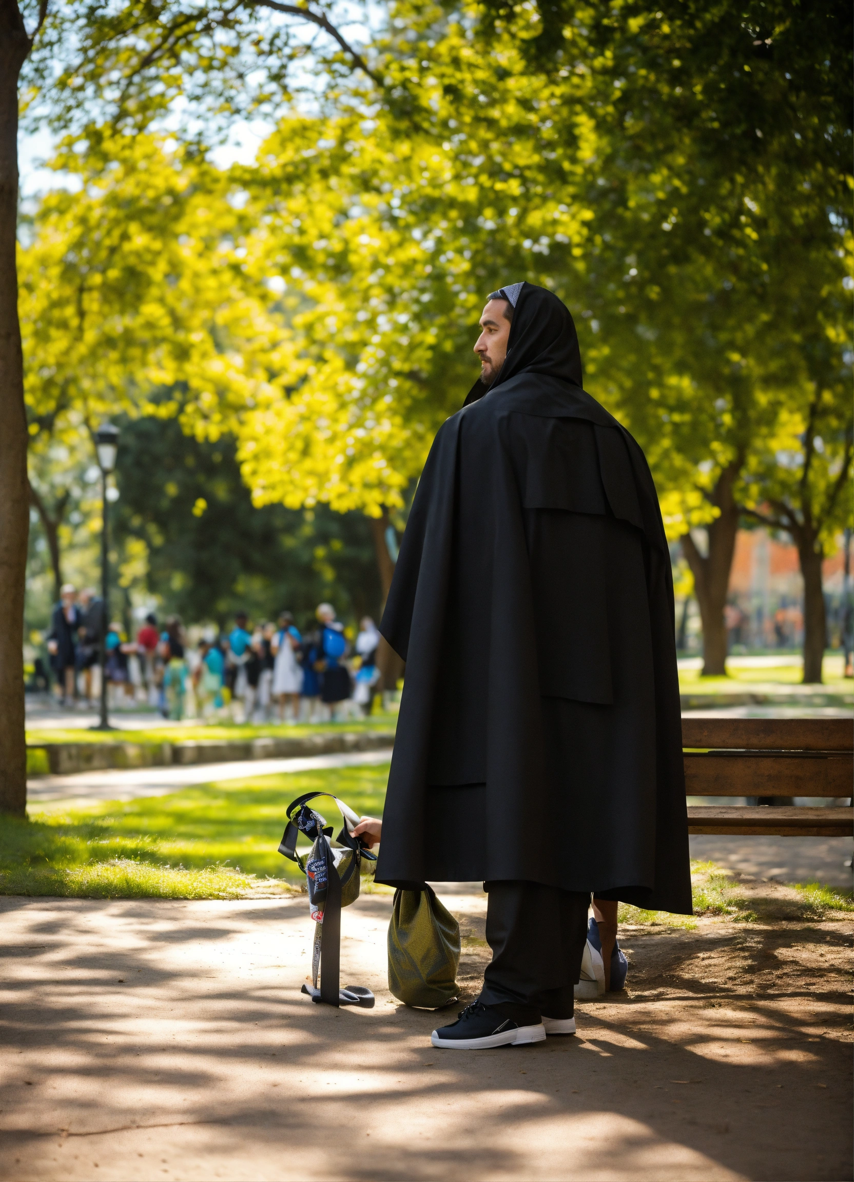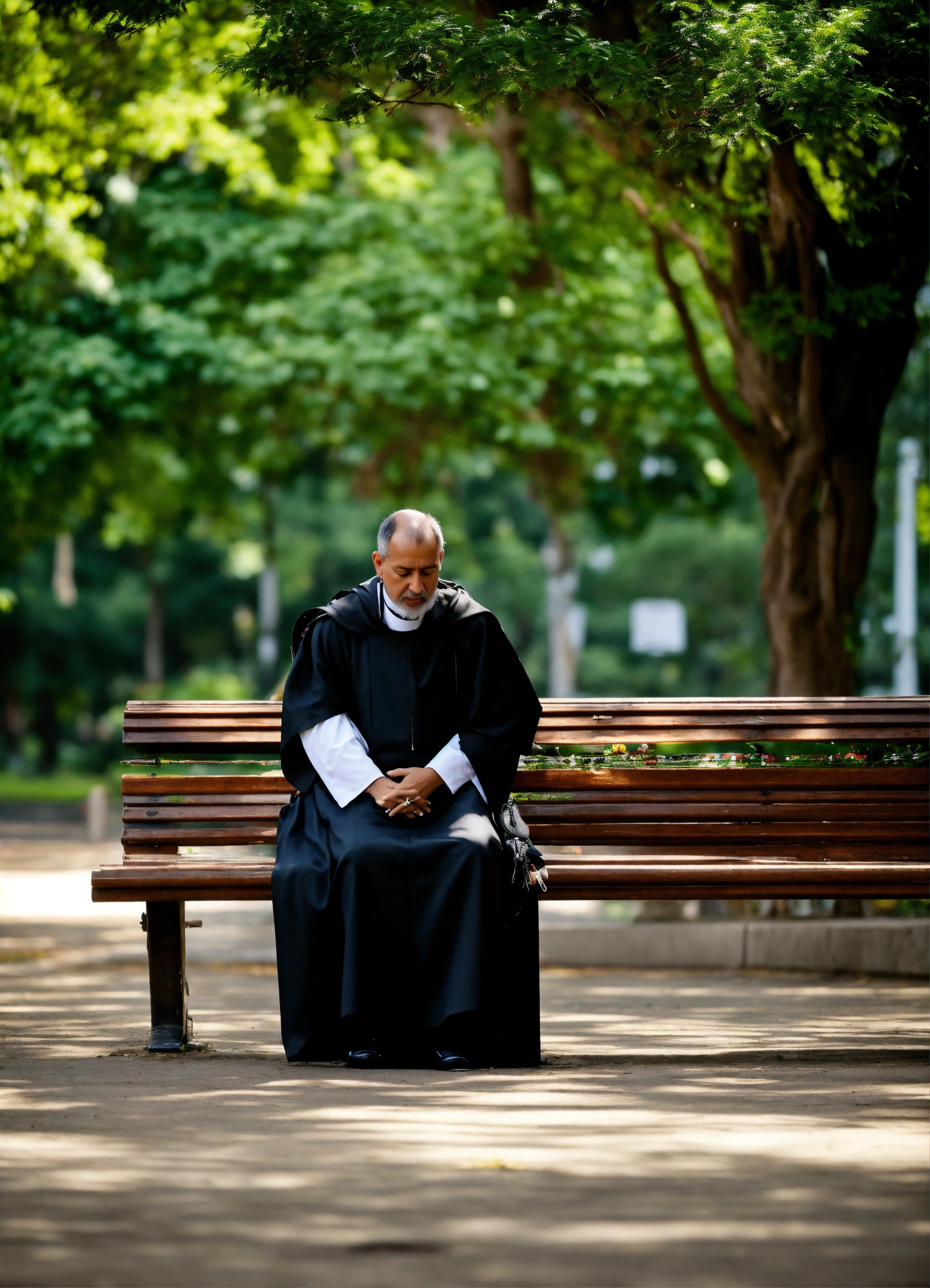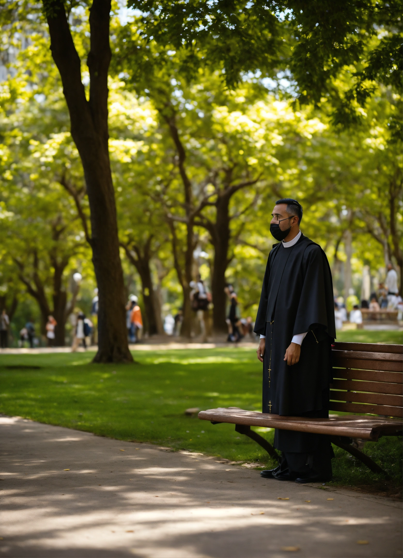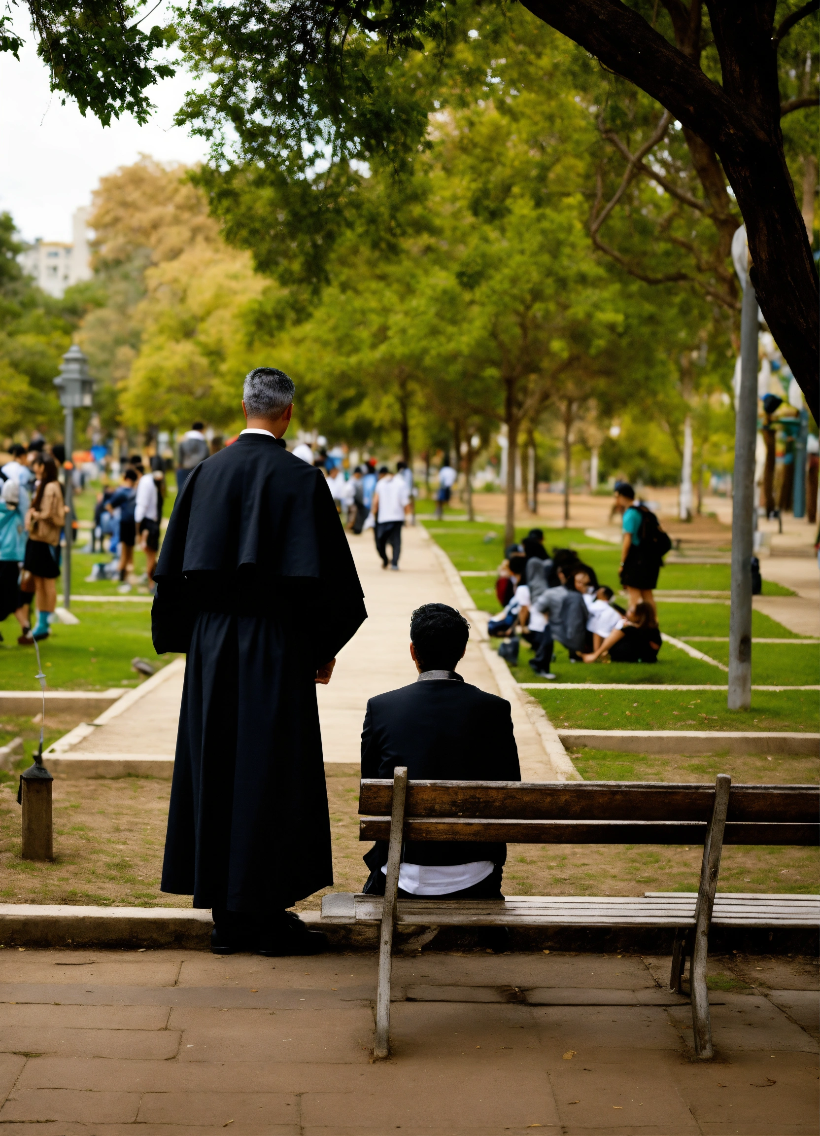 Un sacerdote católico sentando y vestido de negro, en un banco en el parque junto a un alumno de 15 años con una mochila, ambos se miran en actitud de diálogo.