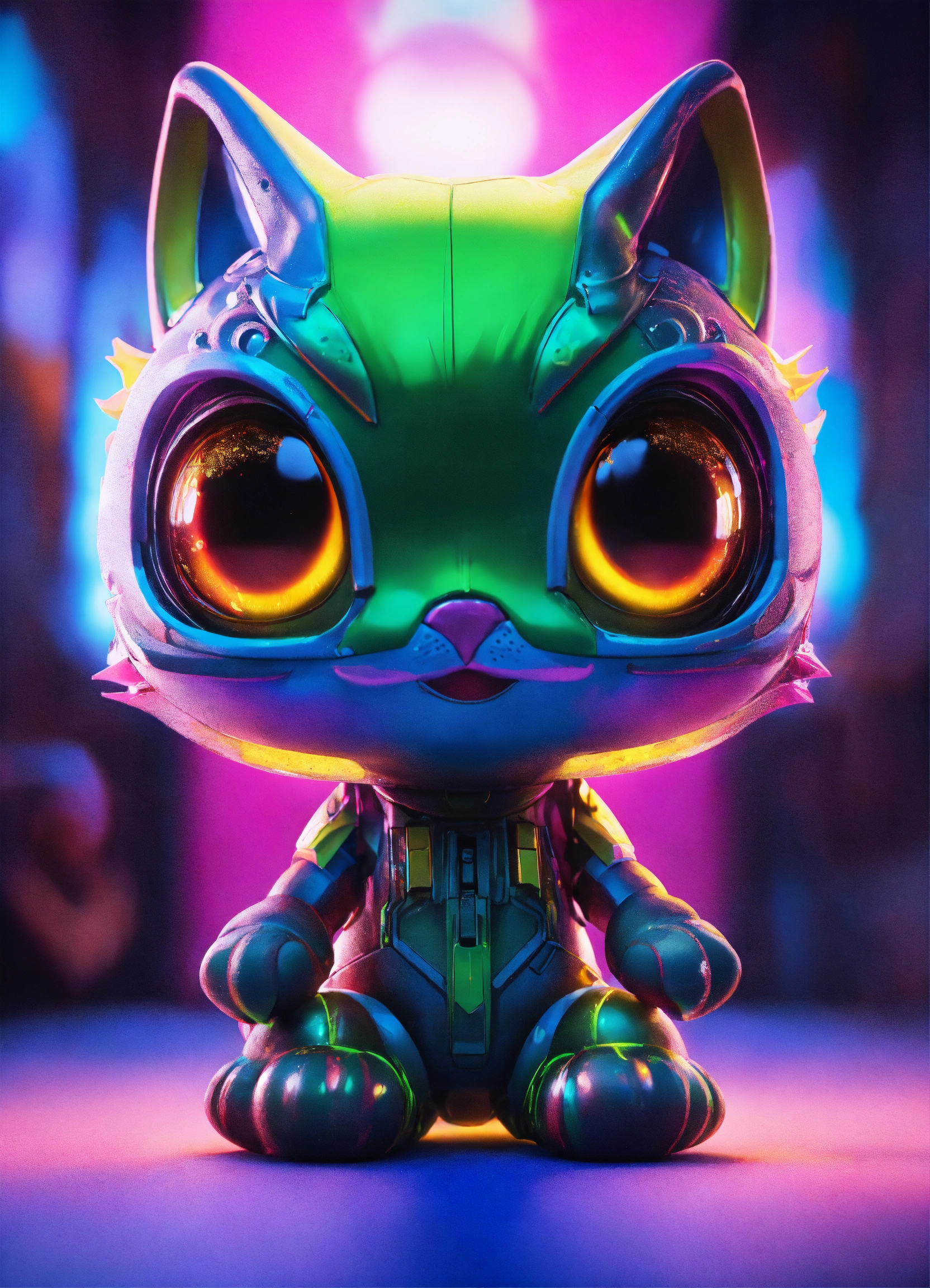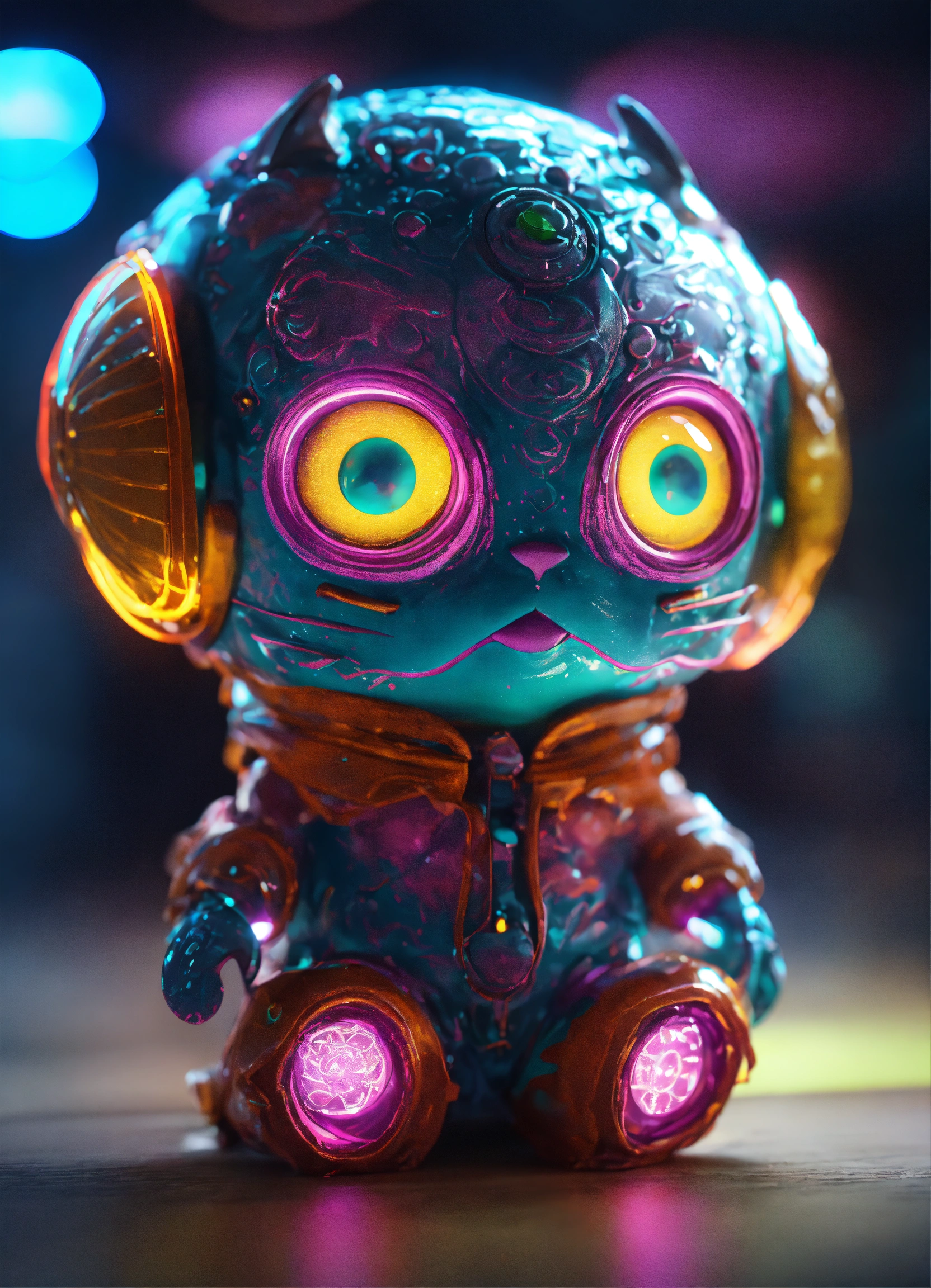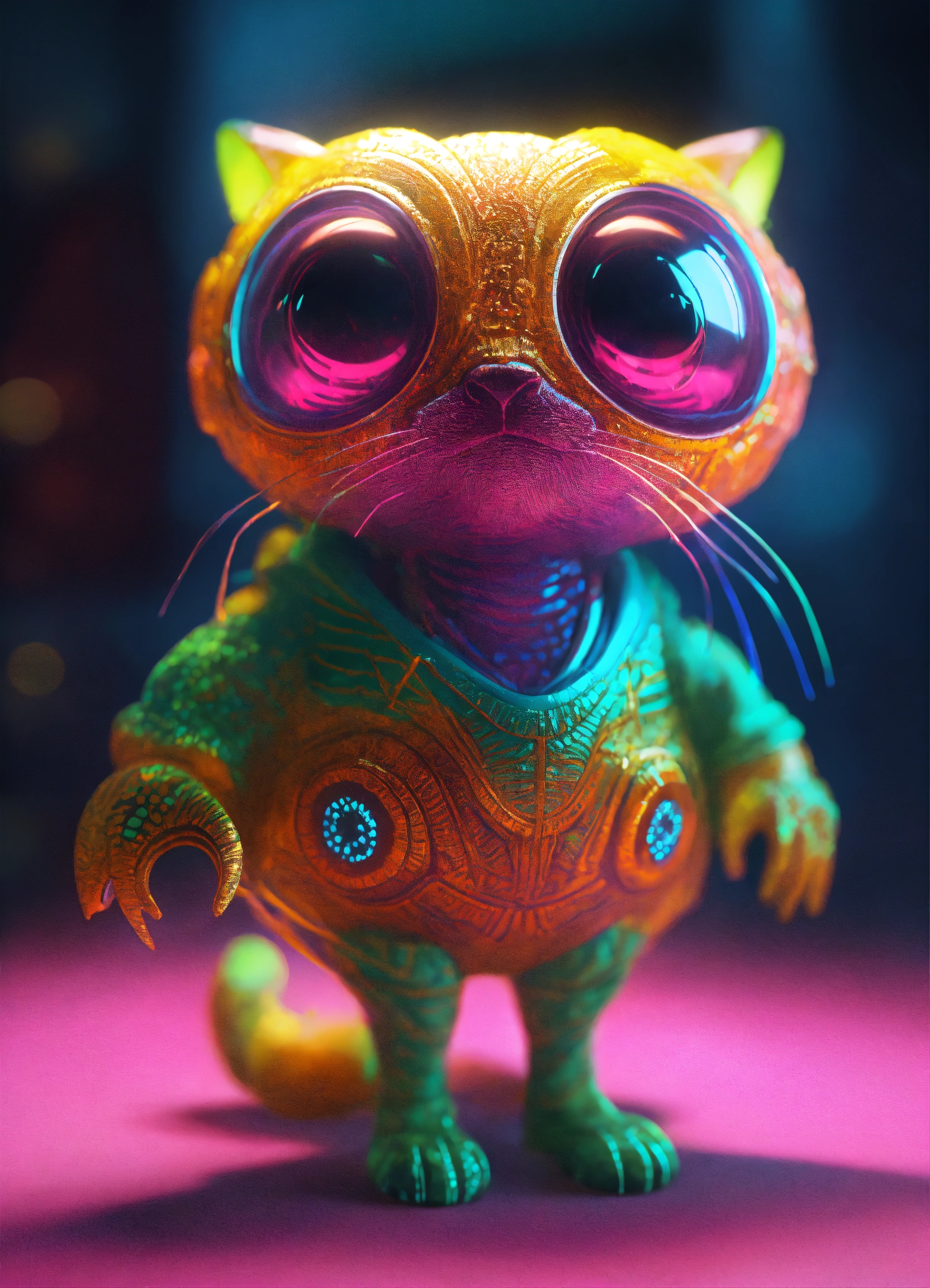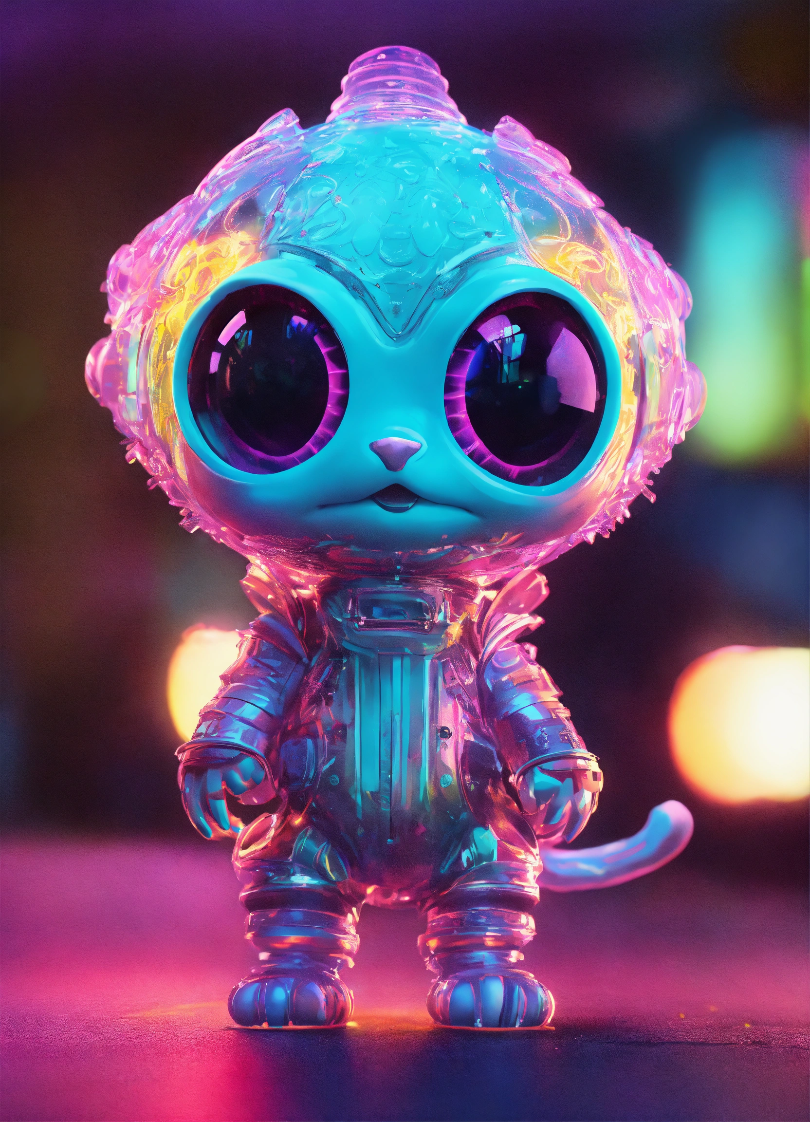 Gelly cute adorable alien monster, full-body, neon glow colours, highly intricate details, 3d, cgi, realistic light, trending on cgsociety, glowing eyes, facing camera, neon details, ultra realistic details, portrait, sci fi atmosphere, global illumination, shadows, octane render, 8 k, ultra sharp, cat attributes, friendly, glass like, white, symmetric, kind, bring some beatiful colours