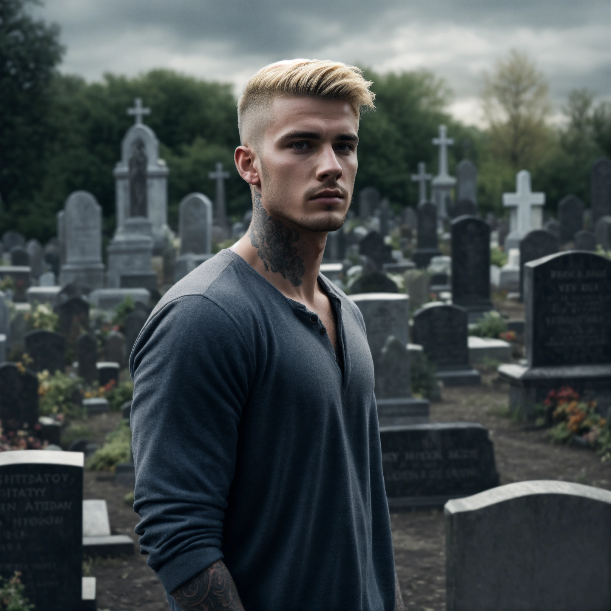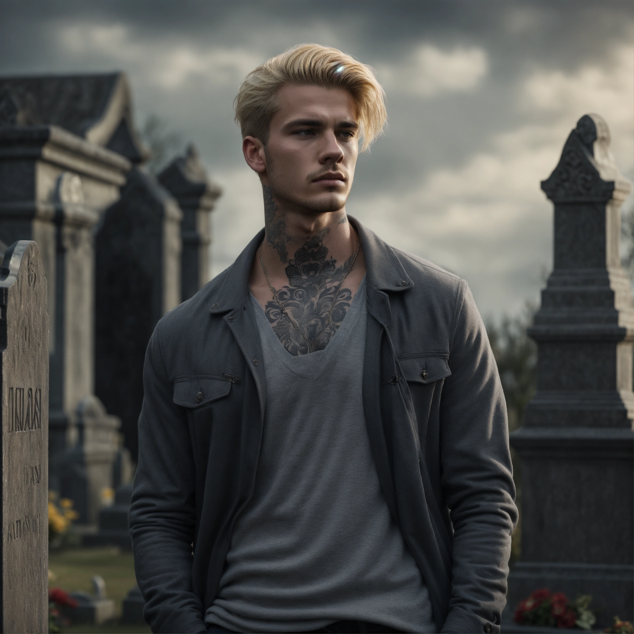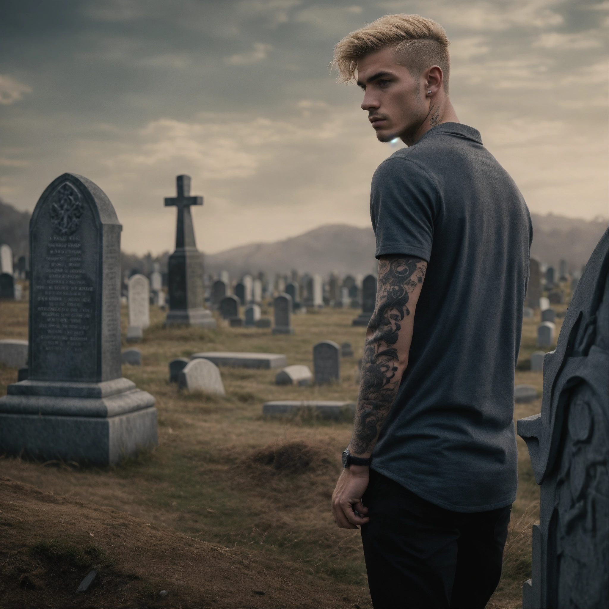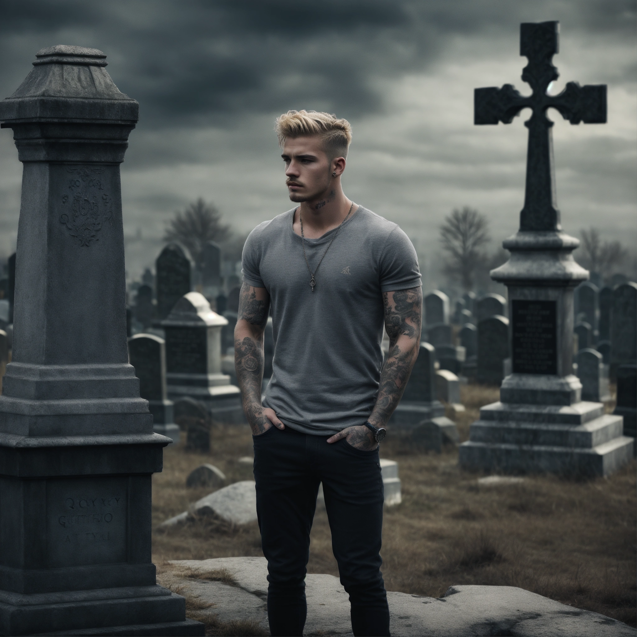 Photorealistic, grey colours, young handsome man standing a graveyard, in thoughts, rocky style, tatooed, blond hair, thinkful, sad, watching the camera, detailed, 8k, q2