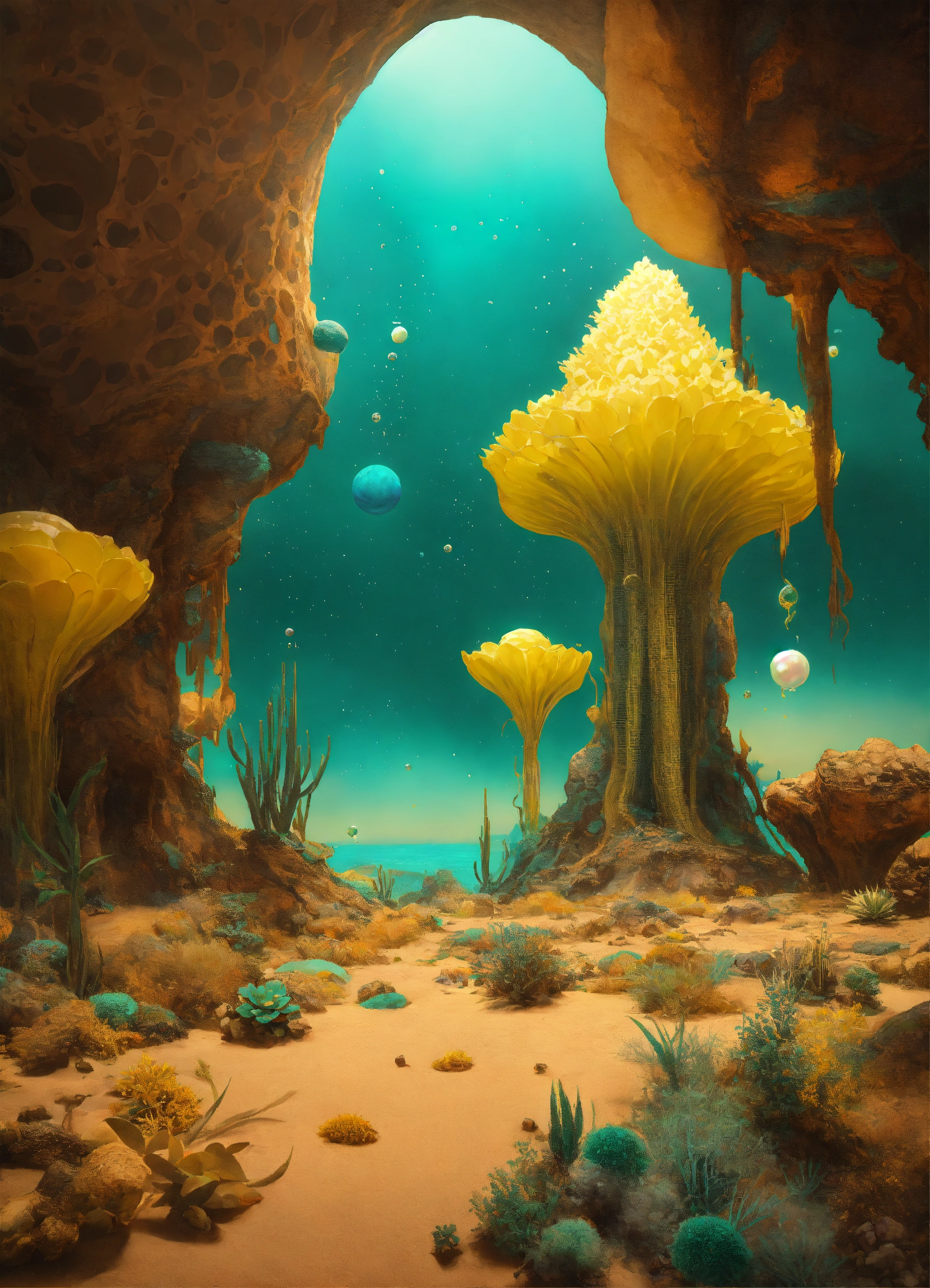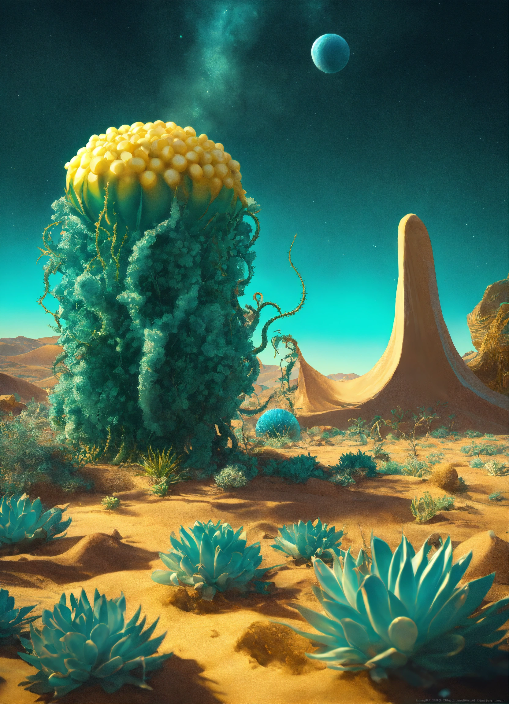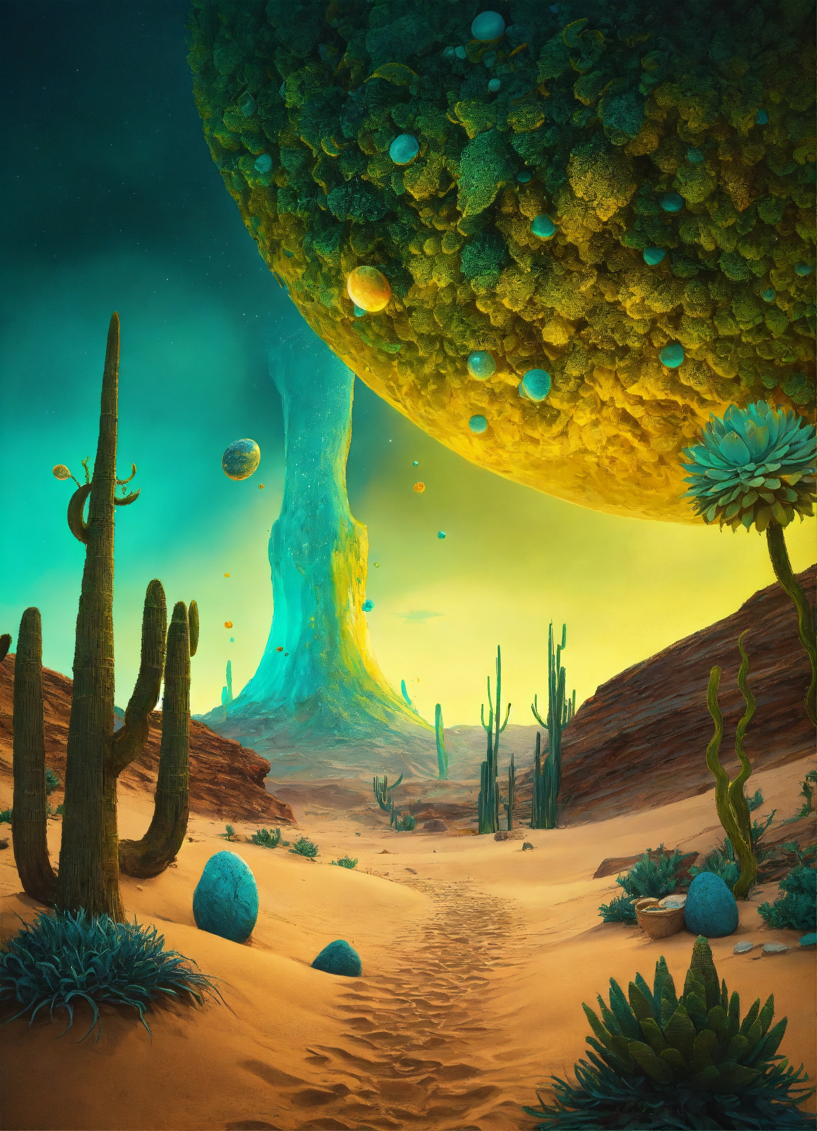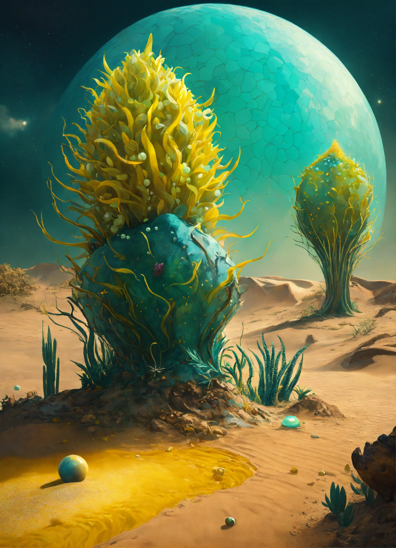 Create a surreal desert with alien plants, the plants are shaped like teal, canary_yellow_perlwhite, are partially transparent with tentacles and spines, in the sand laying pearls, backdrop is the storm of cosmic dust and cosmic clouds the heaven is dark colored unreal engine 6 color palette knives painting oel on canvas conzeptart, high qualty, cinema_stil, wide shot