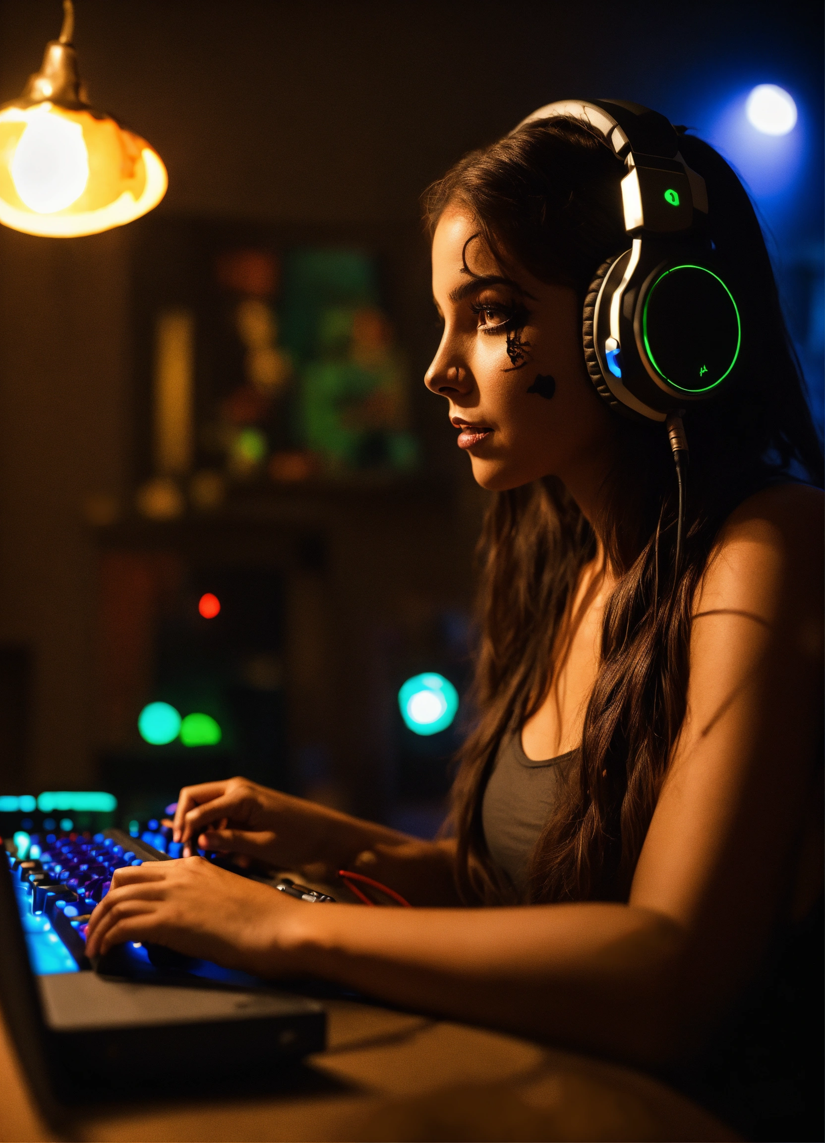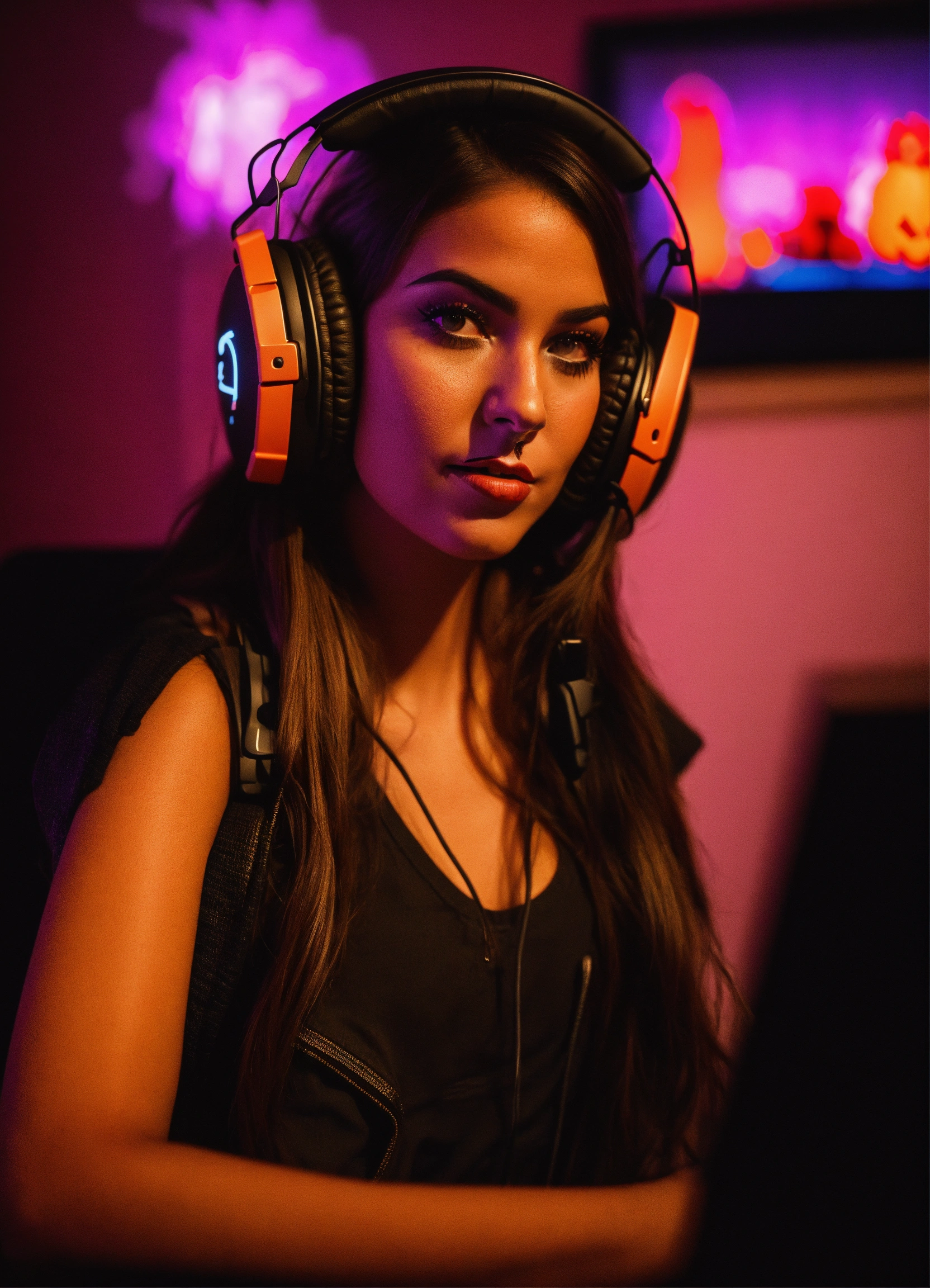Fille brune latina déguisé pour halloween avec un casque de gaming sur la tête et une ambiance horreur et sombre en arrière plan