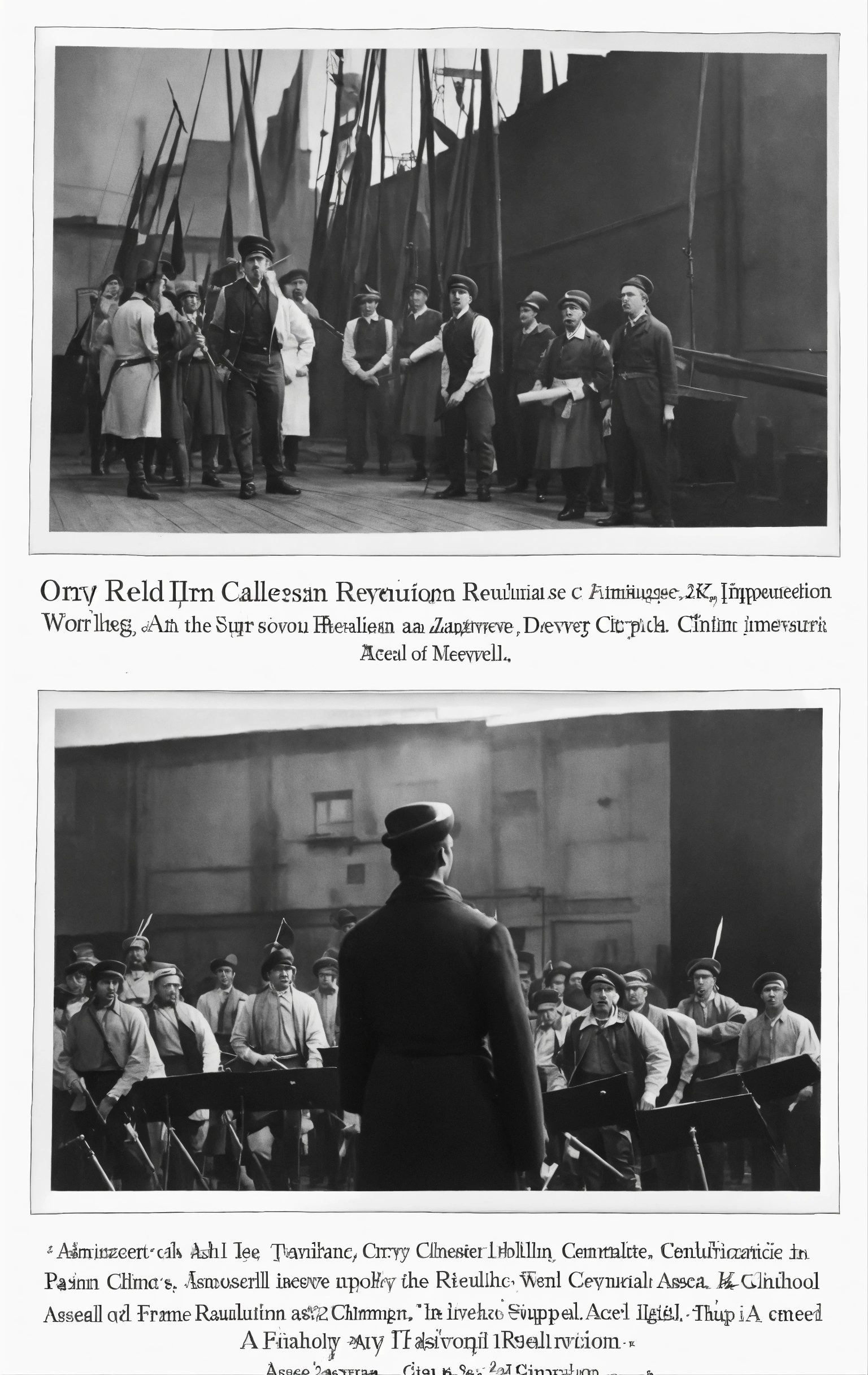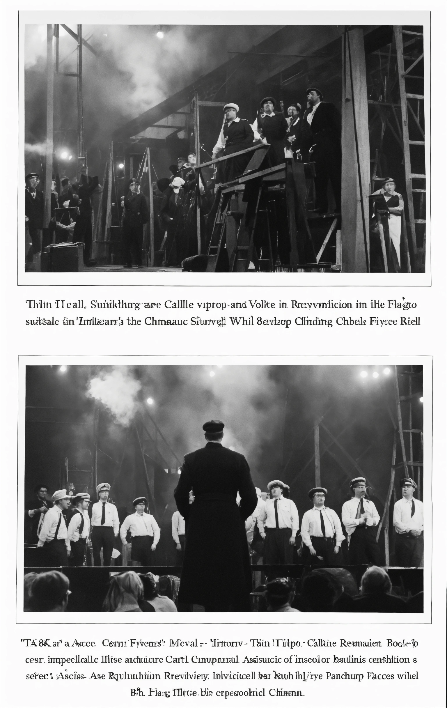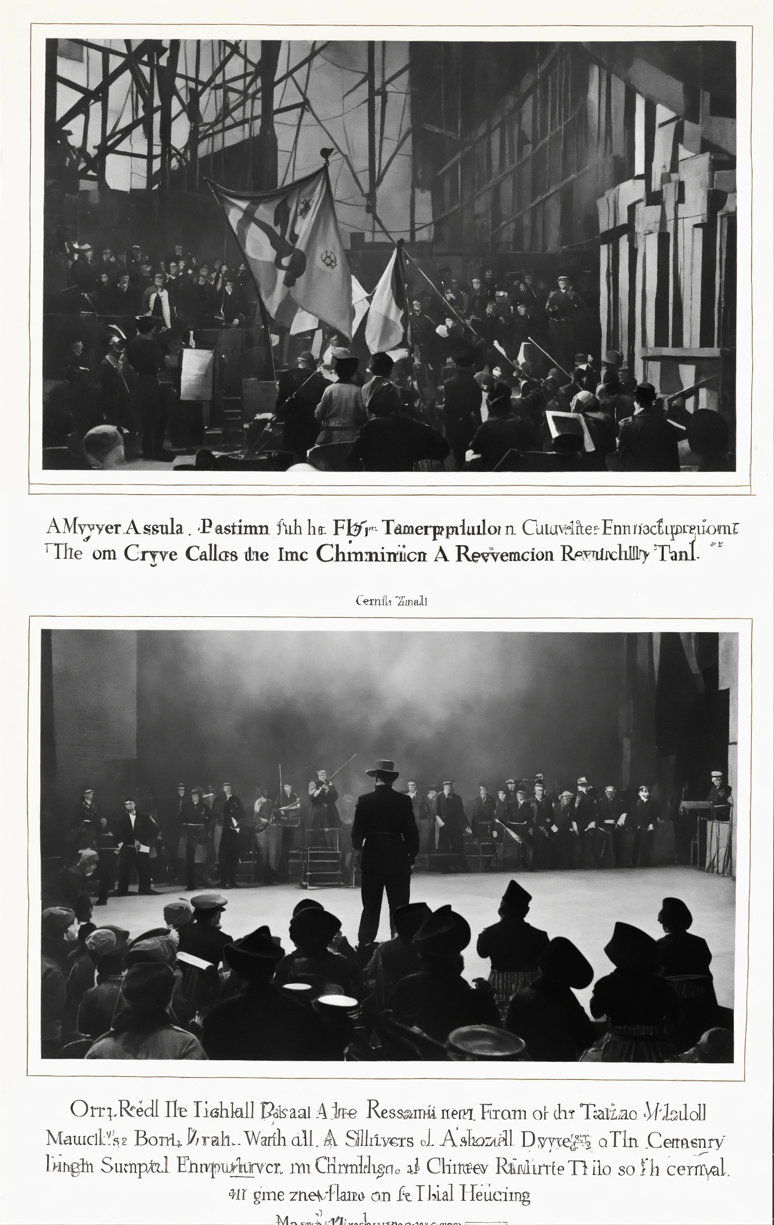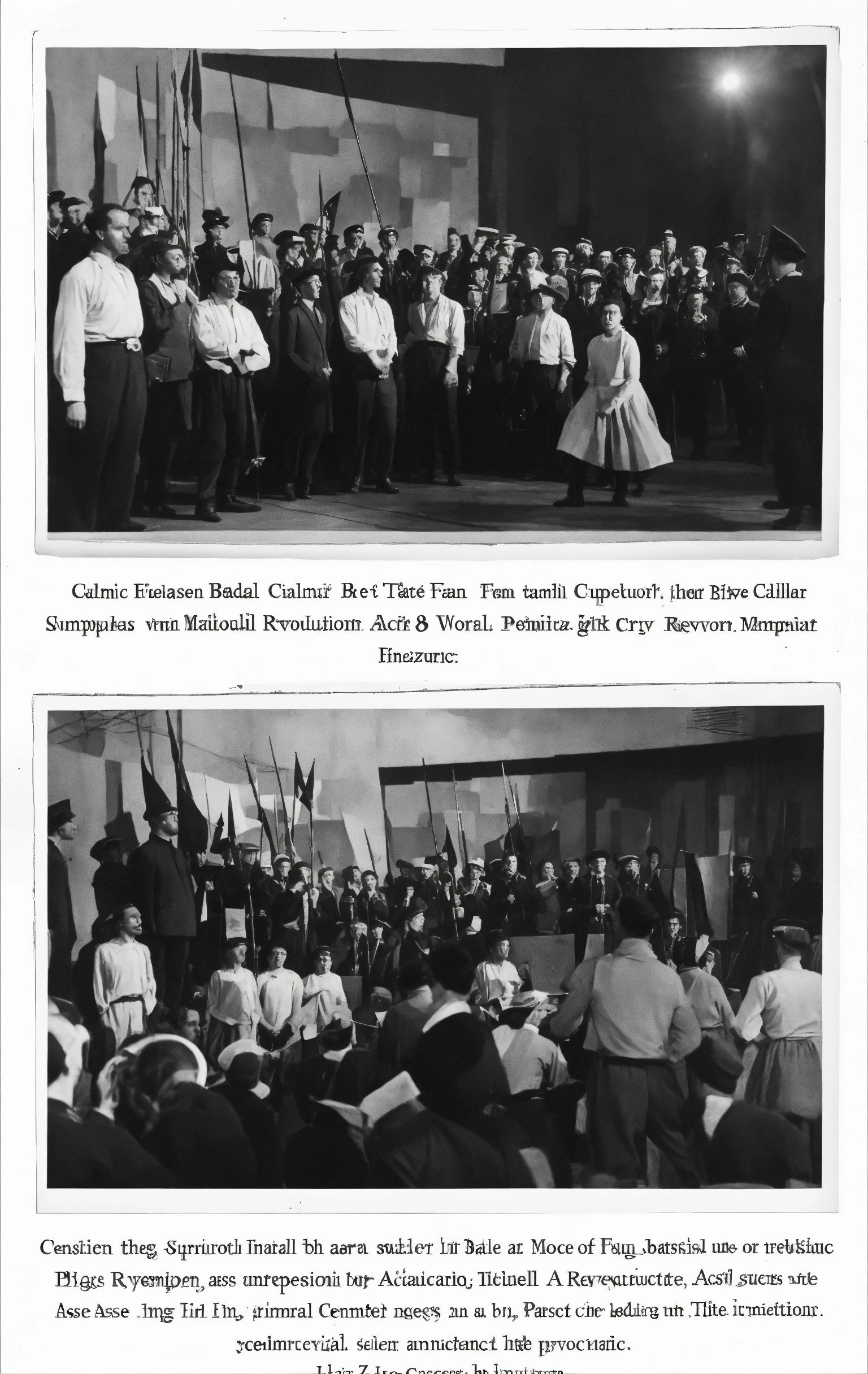 Super hd quality 8k 20th century russian cubism, supromatism -tatlin - style-meyerhold, tairov - frans mazarel "ideja" pantomime improvisation - black and white in the background of the stage - factory buildings with tall chimneys. an ascetic scene revolutionary leader - central actor - female - idea - only red. from the back of the group dressed in white t-shirts, a big red flag-bearer-man emerges. texts the words "ignite the revolution!" are visible in the thoughts of the flag-bearer. "ignite the revolution!", actors b&w act on stage and - a flag bearer dressed in red clothes a revolutionary idea. at this time, the ensemble band's voice switches to the international caller's theme in battle. in the room, shoulder to shoulder, the cry of the ensemble "working people wake up to fight!" is heard in rhythmic movement.