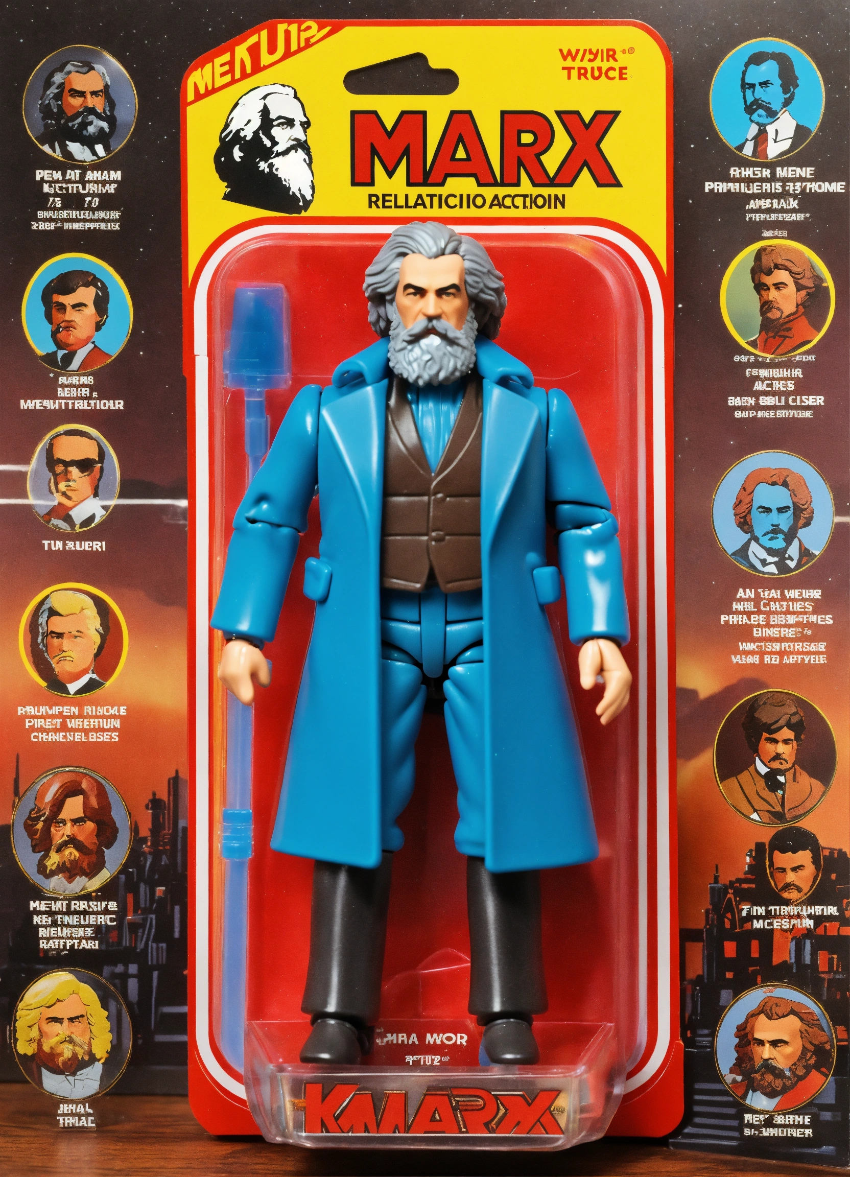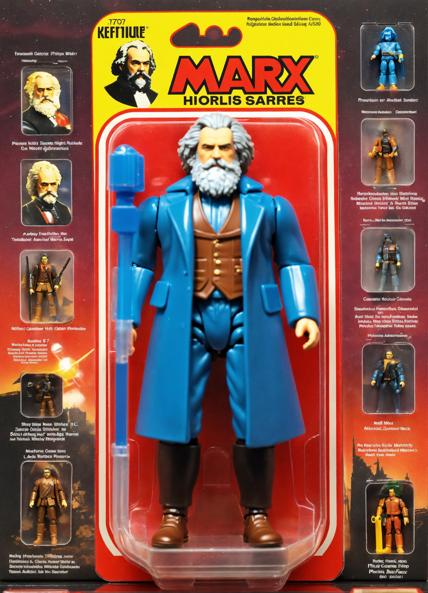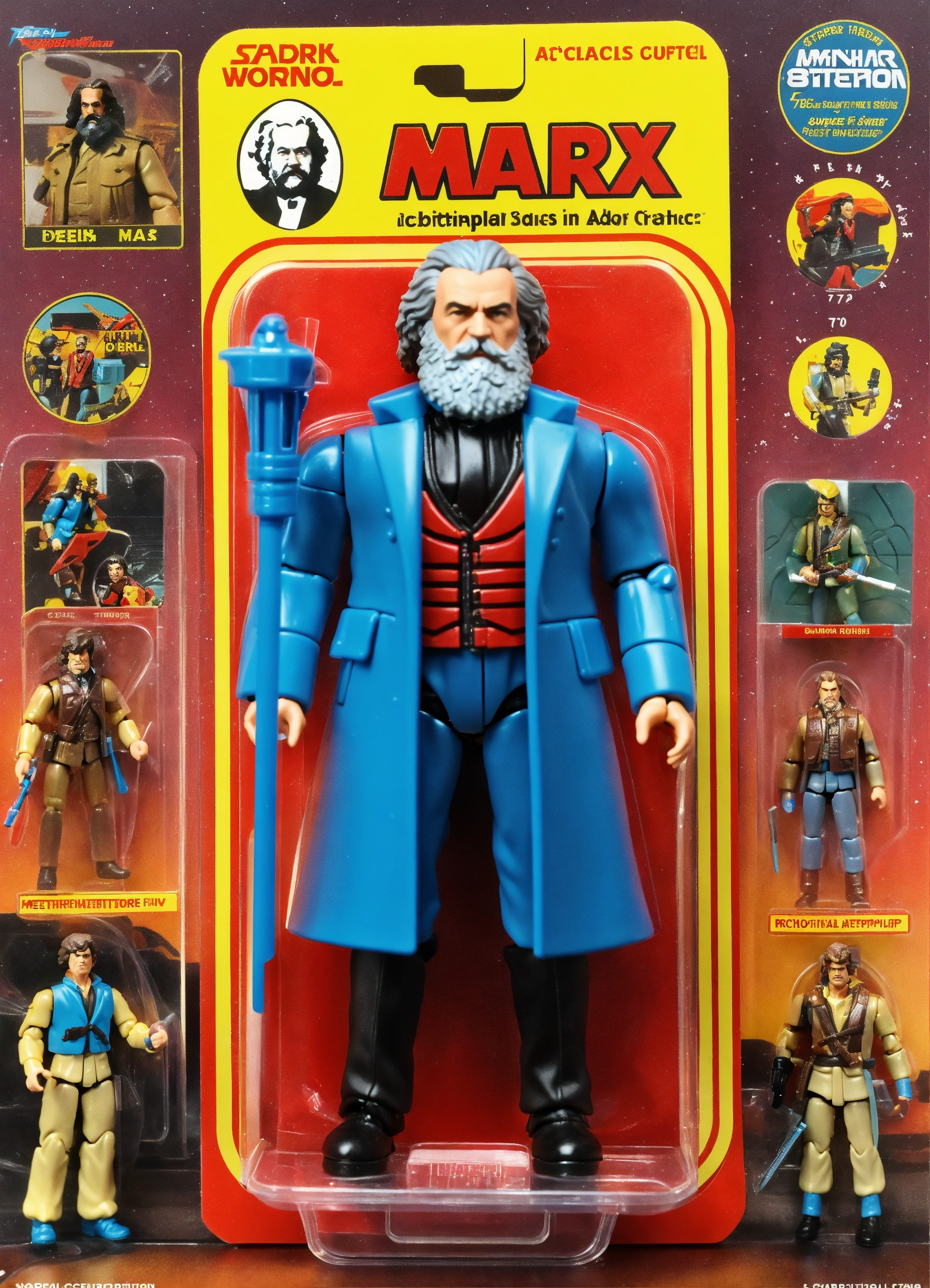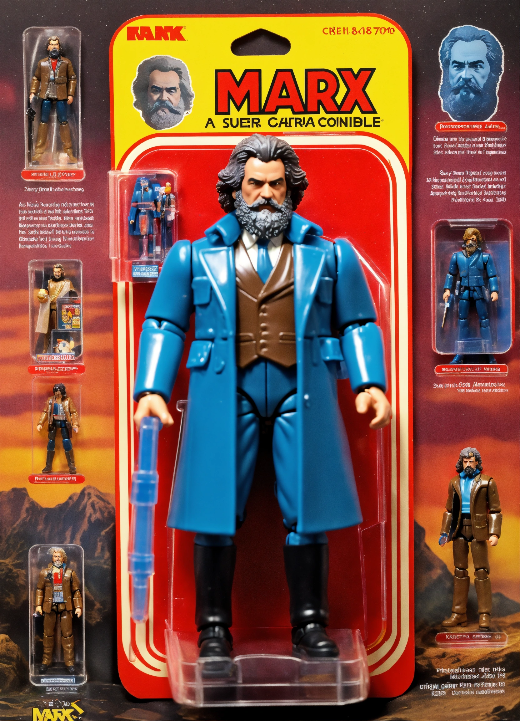 Create a kenner-style action figure or a super 7 reaction figure based on the iconic revolutionary philosopher karl marx. the figure should capture the retro aesthetic reminiscent of classic '70s and '80s kenner action figures, with meticulous attention to fine details such as his attire, distinctive hairstyle, and features. stay true to the high-quality craftsmanship and attention to detail characteristic of kenner's action figures from the '70s and '80s. additionally, design packaging in the style of either kenner or super 7 reaction packaging.