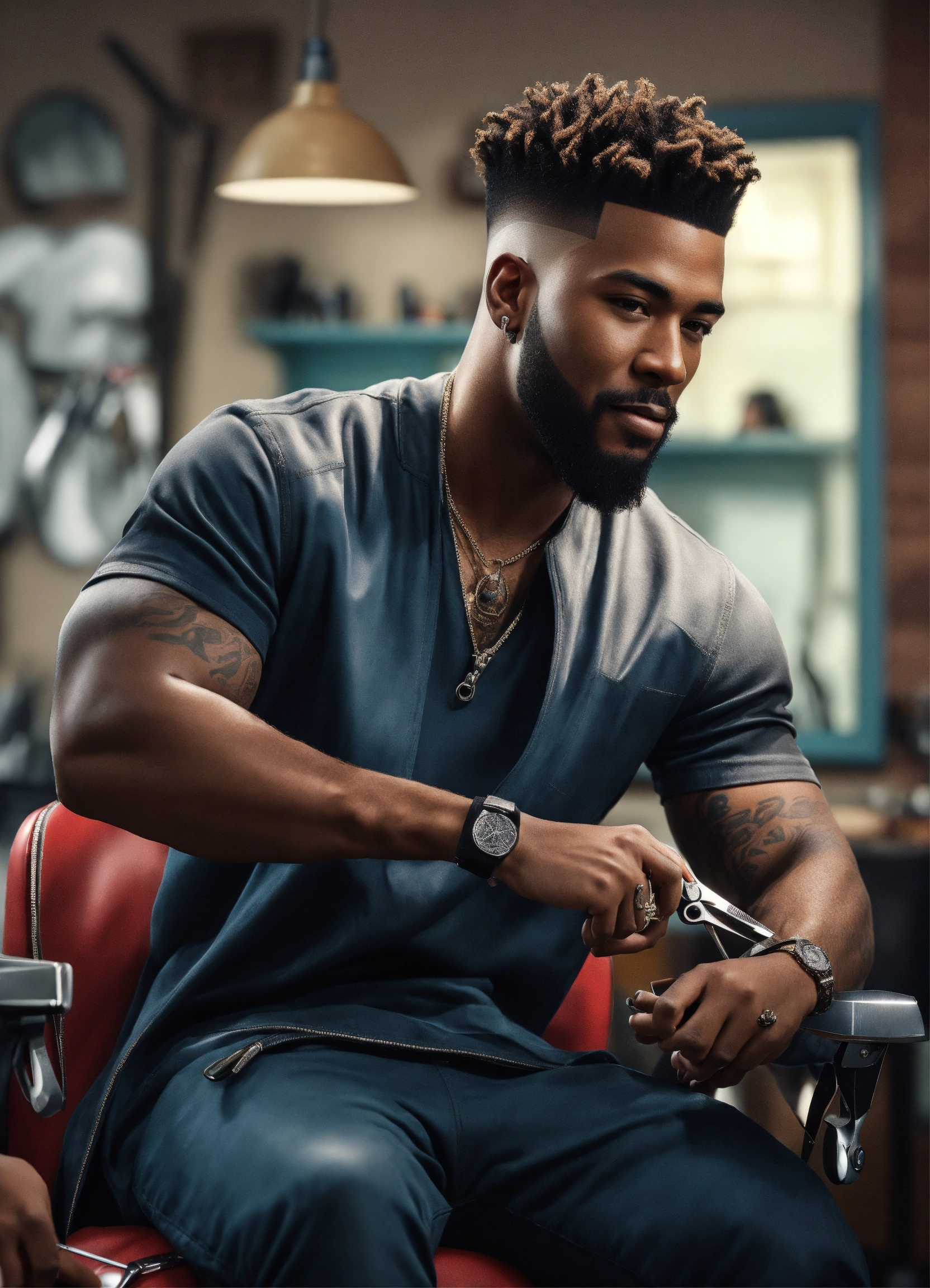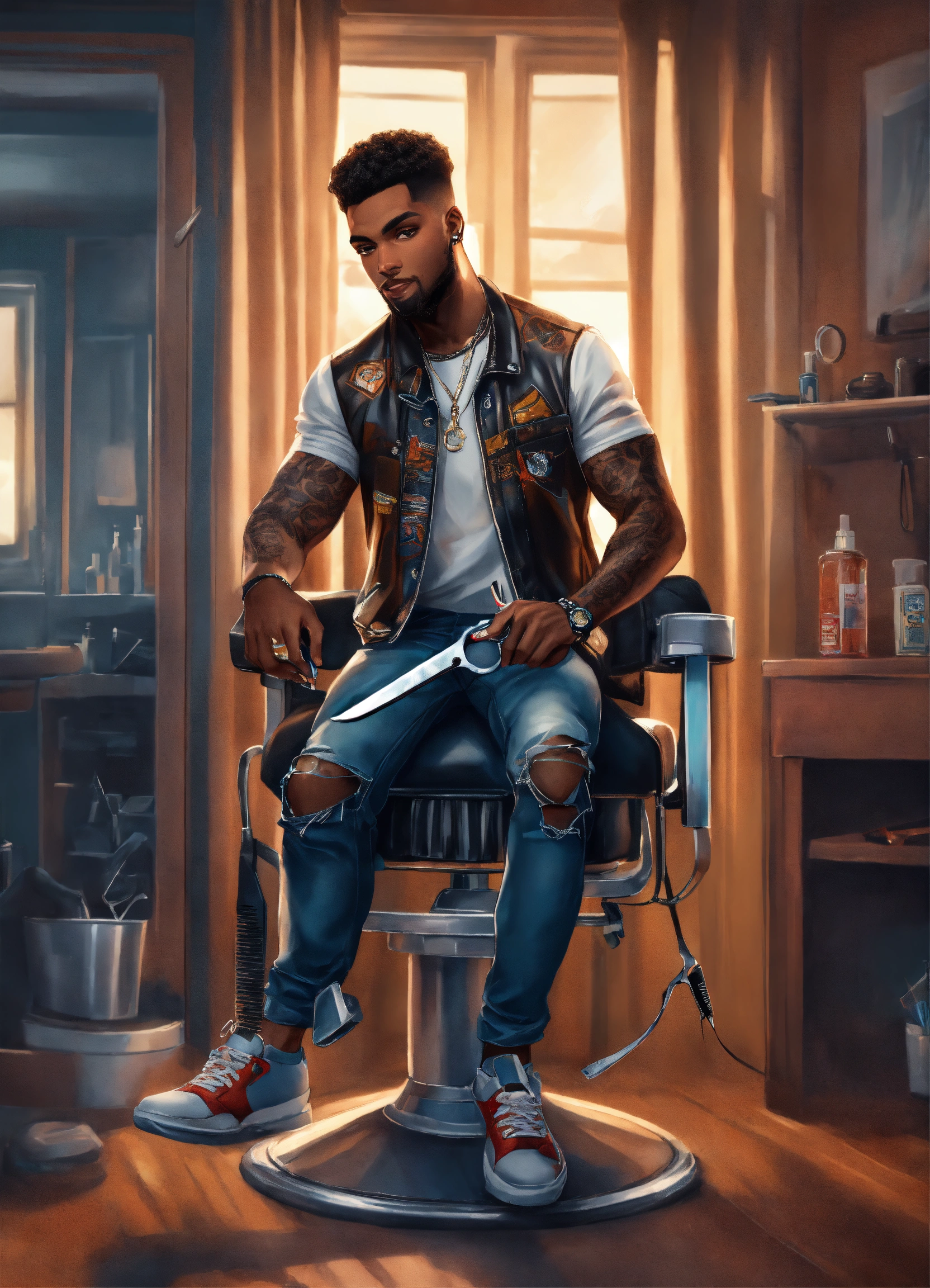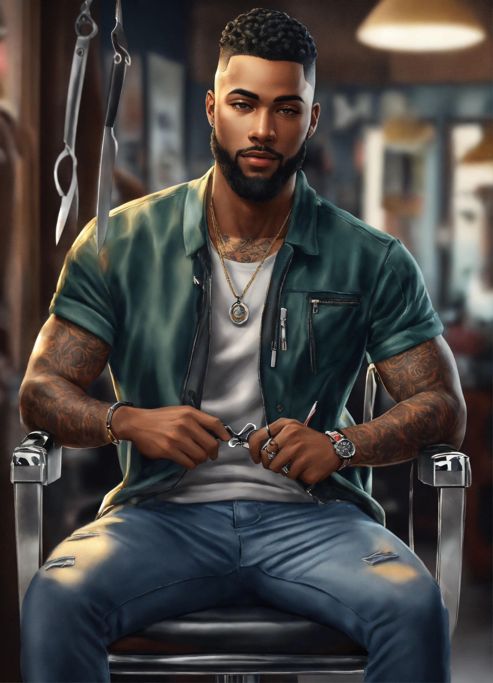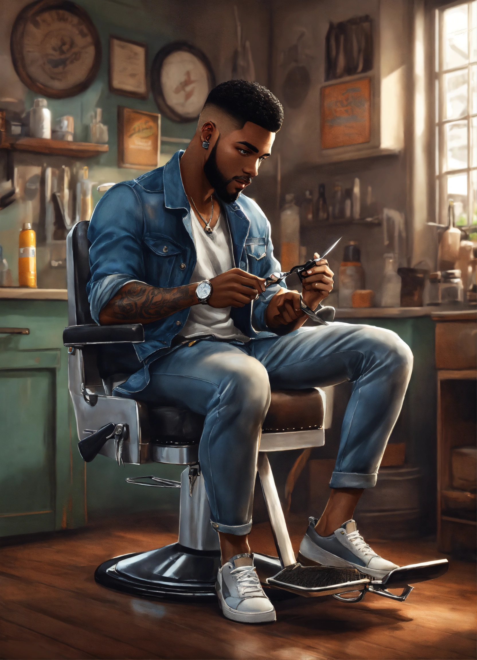 Photorealistic illustration of a handsome black barber with striking features, dressed in casual streetwear, squatting on a barber chair with a playful expression. in one hand he holds a pair of clippers and in the other hand he holds scissors. his hair showcases a fresh and stylish haircut, with clean lines and a well-defined shape.