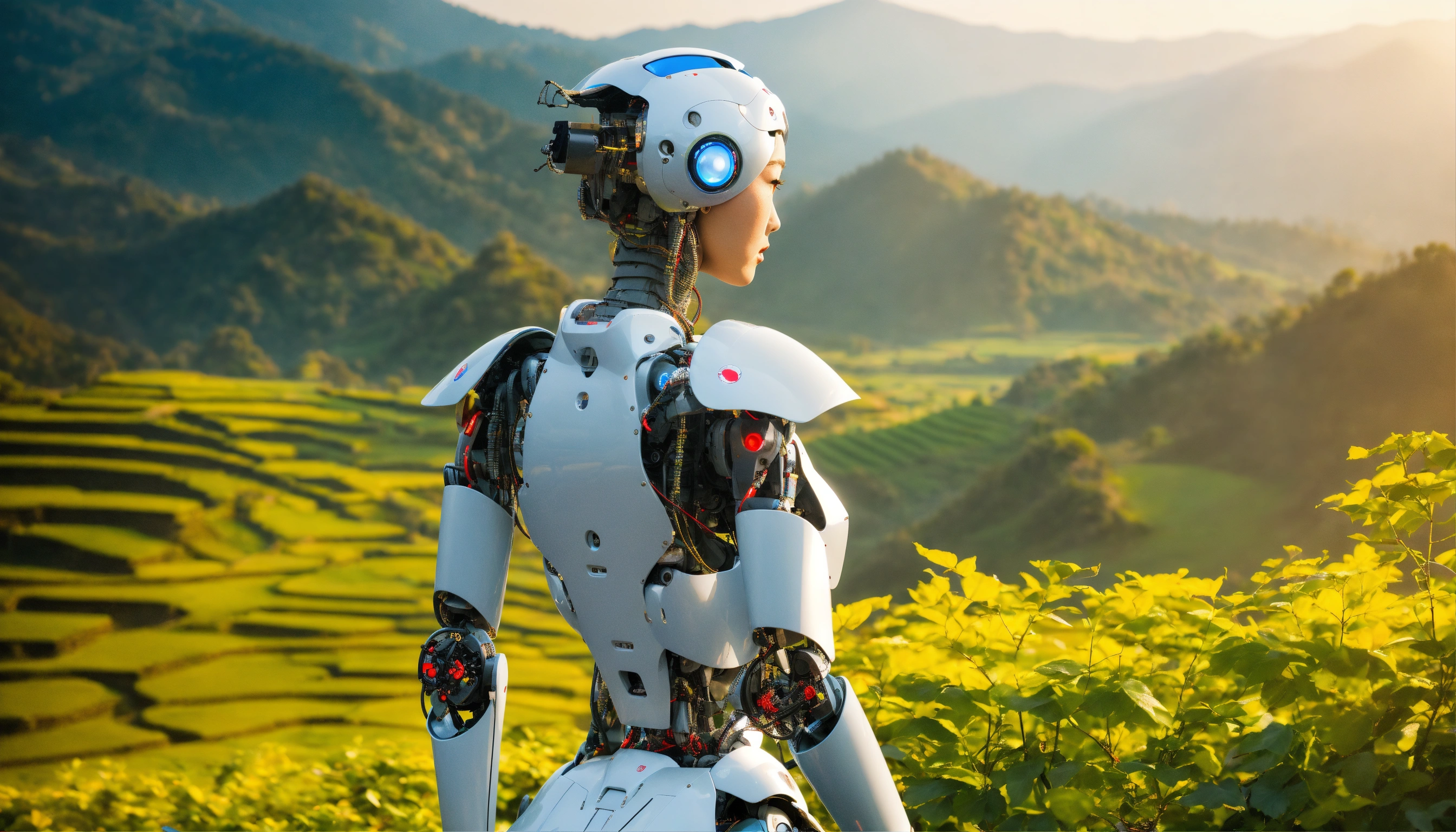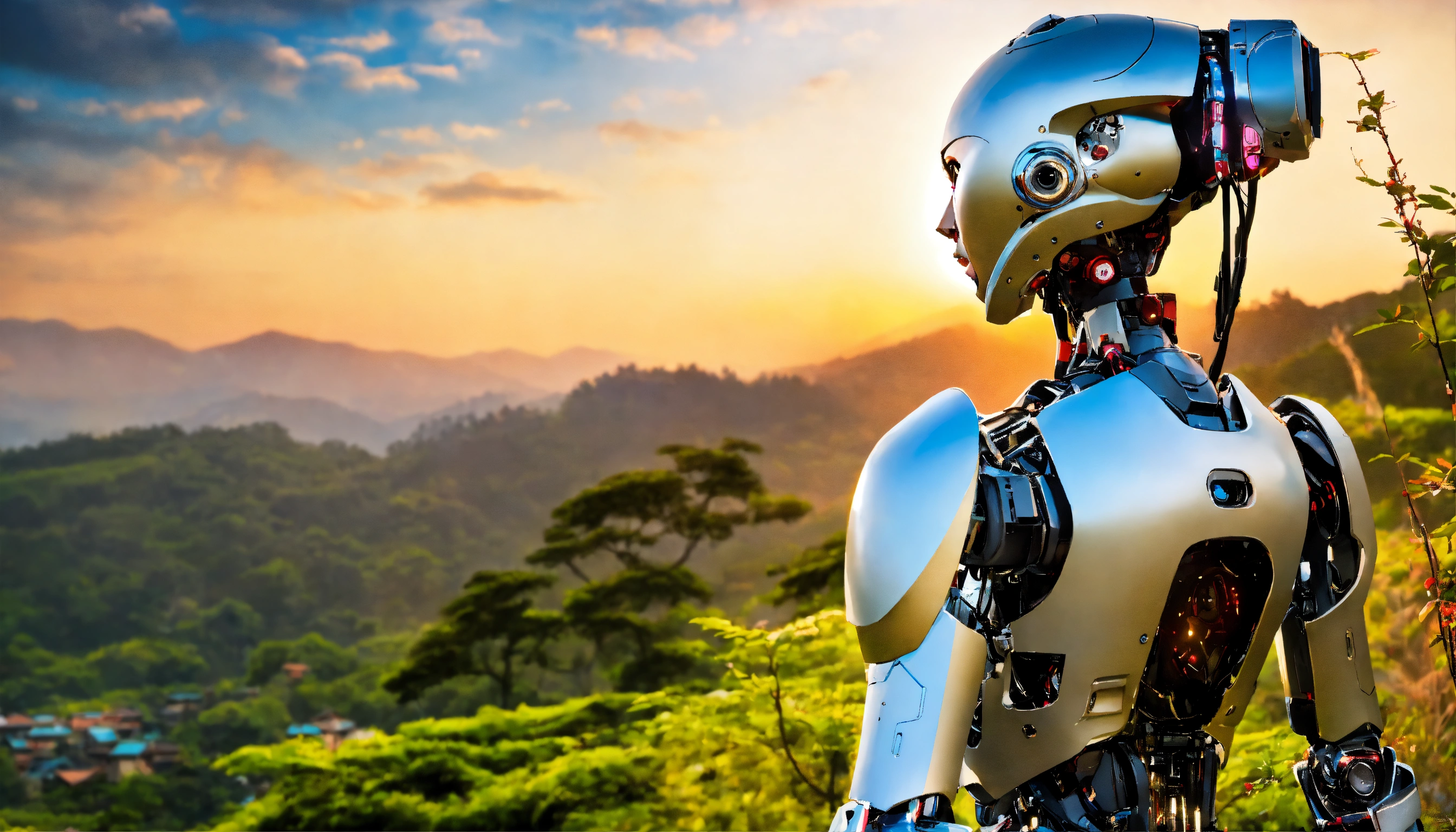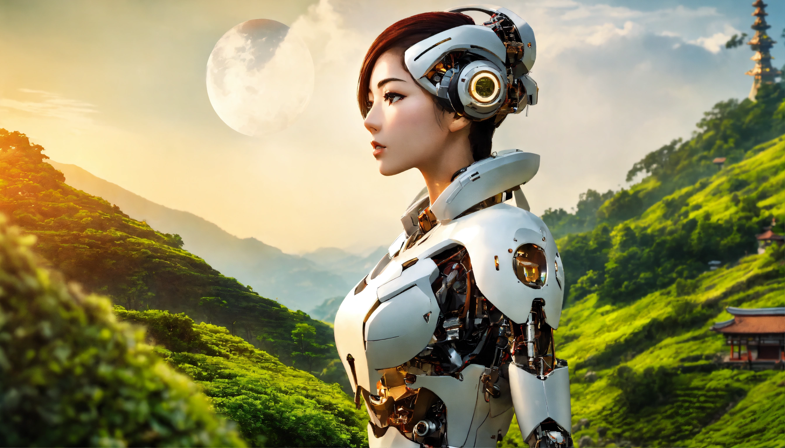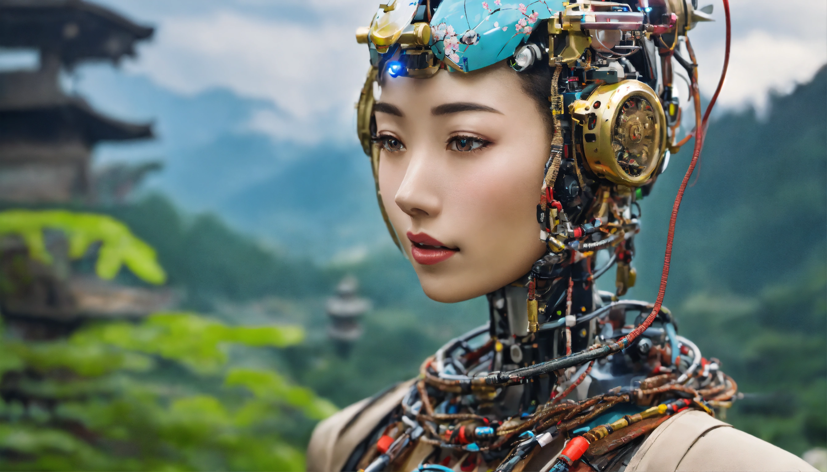 Beautiful woman in japanese style, humanoid robot, the back part of the head is robotic with a horizontal big hole, the face is human, 38d cup, in nepal landscape