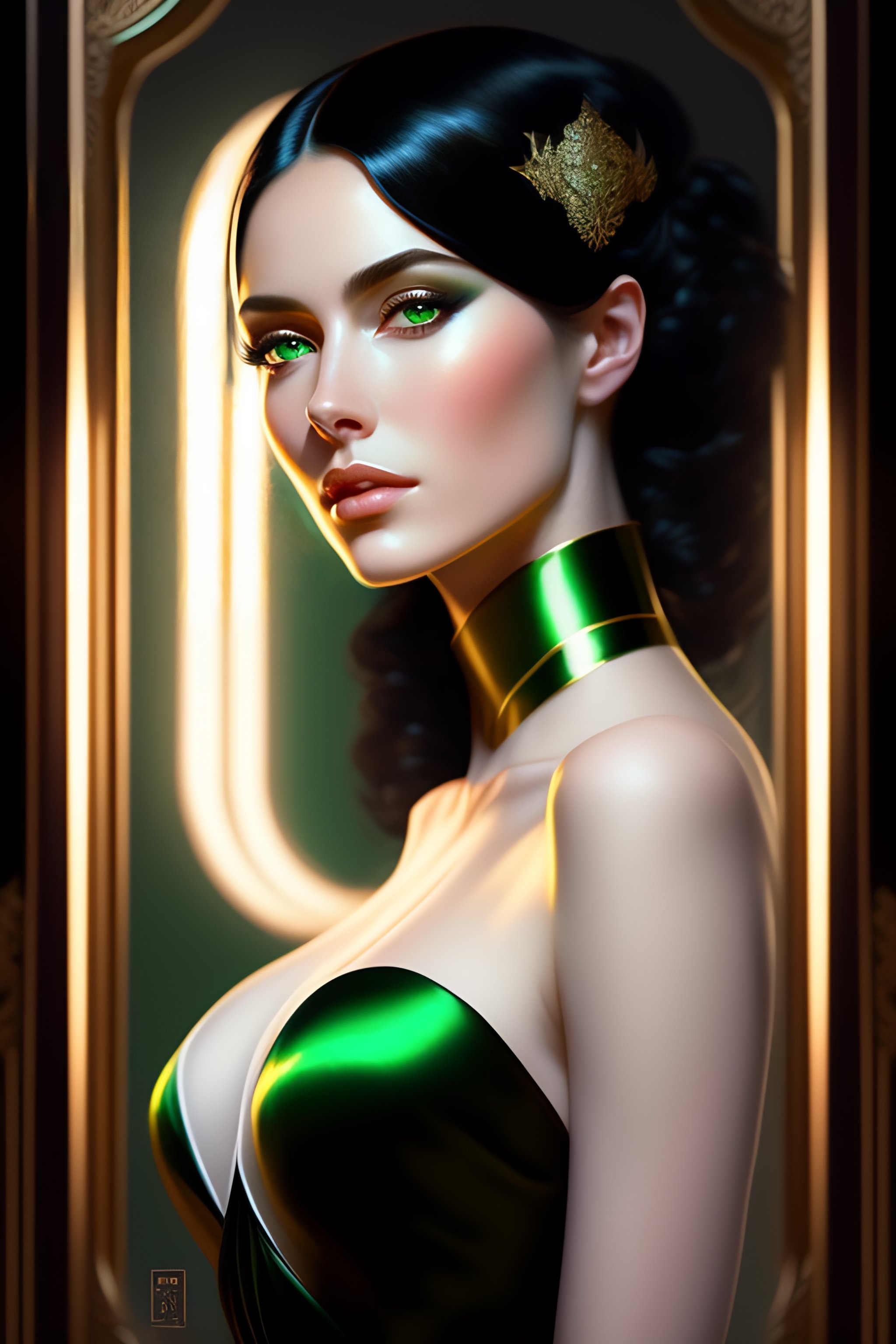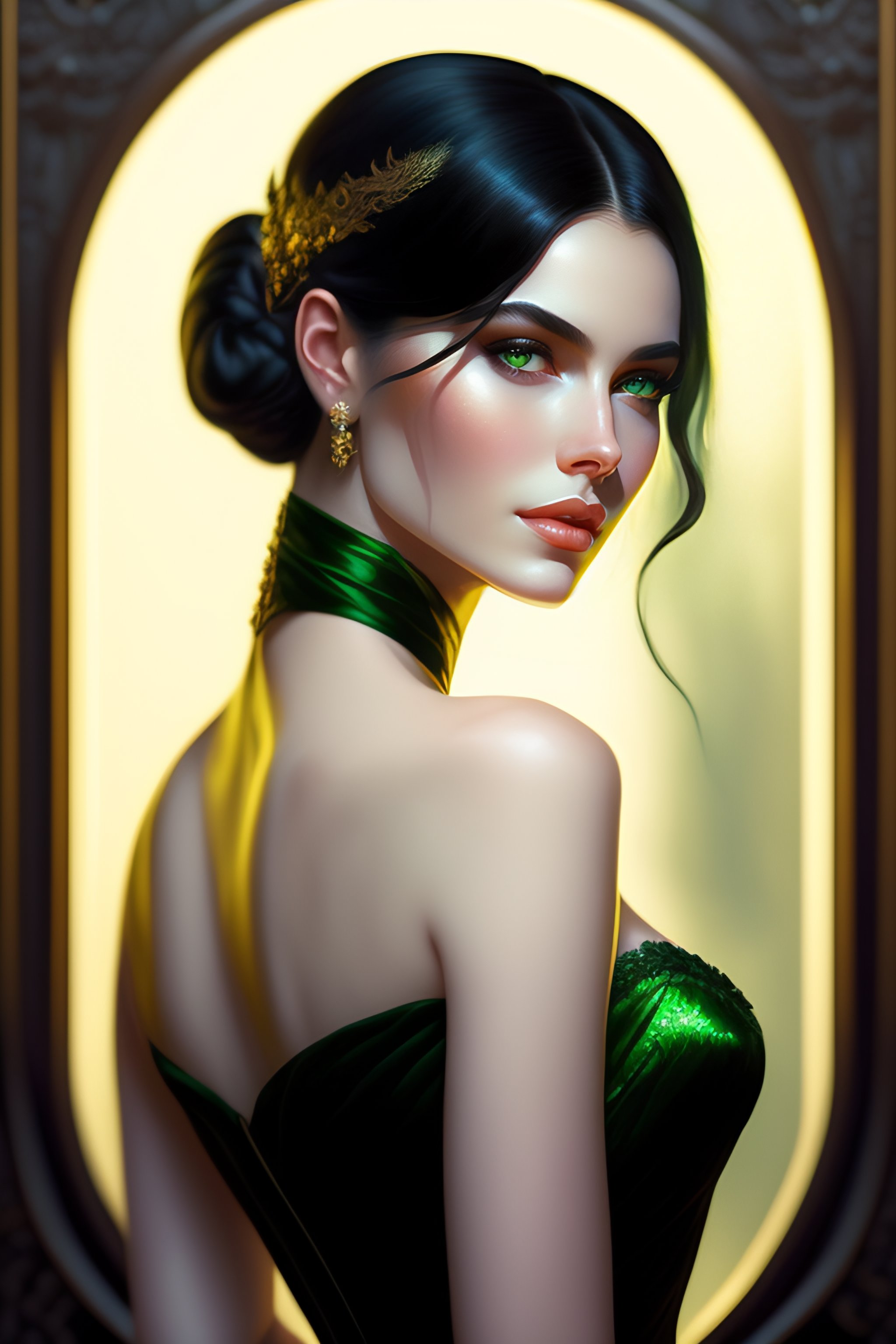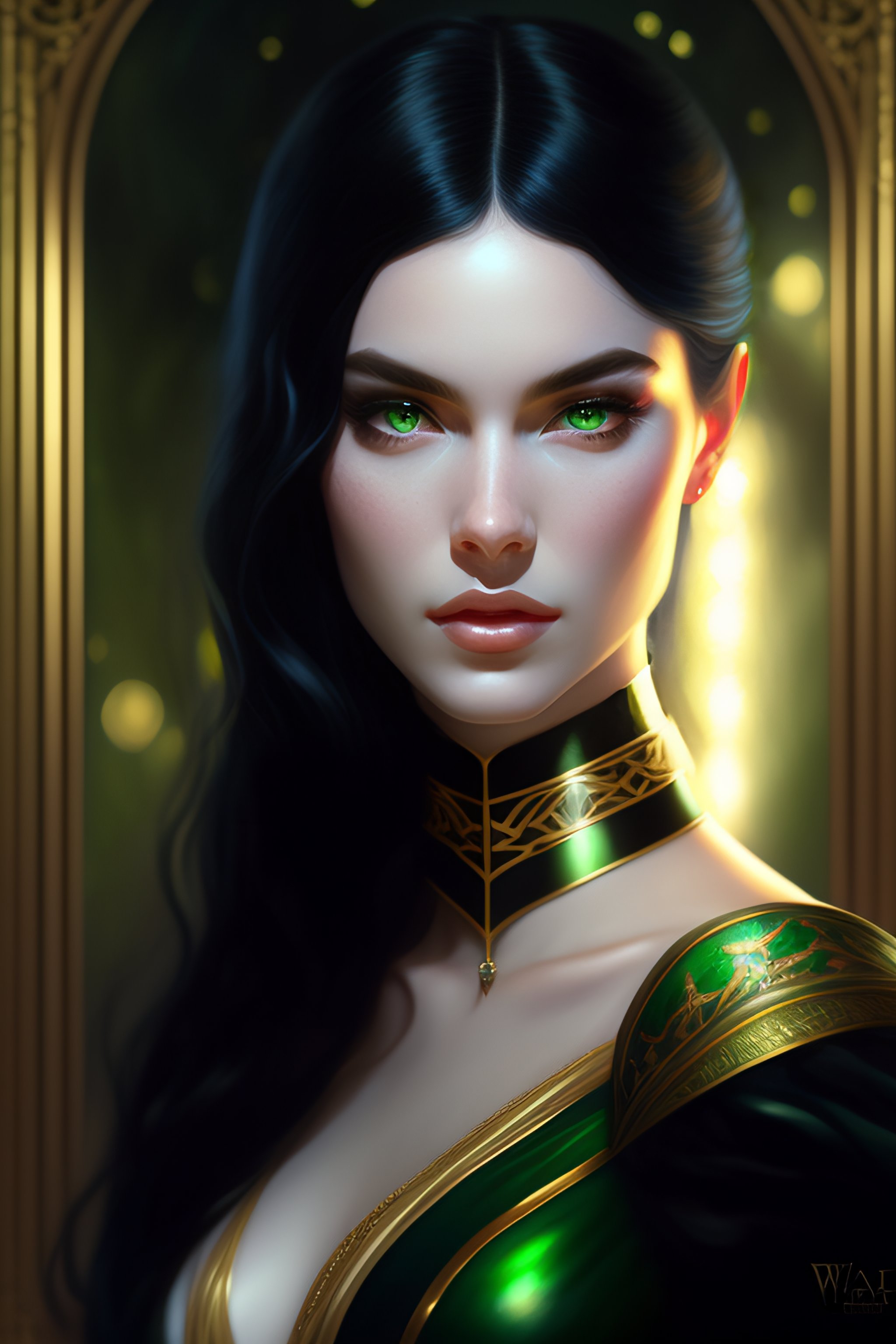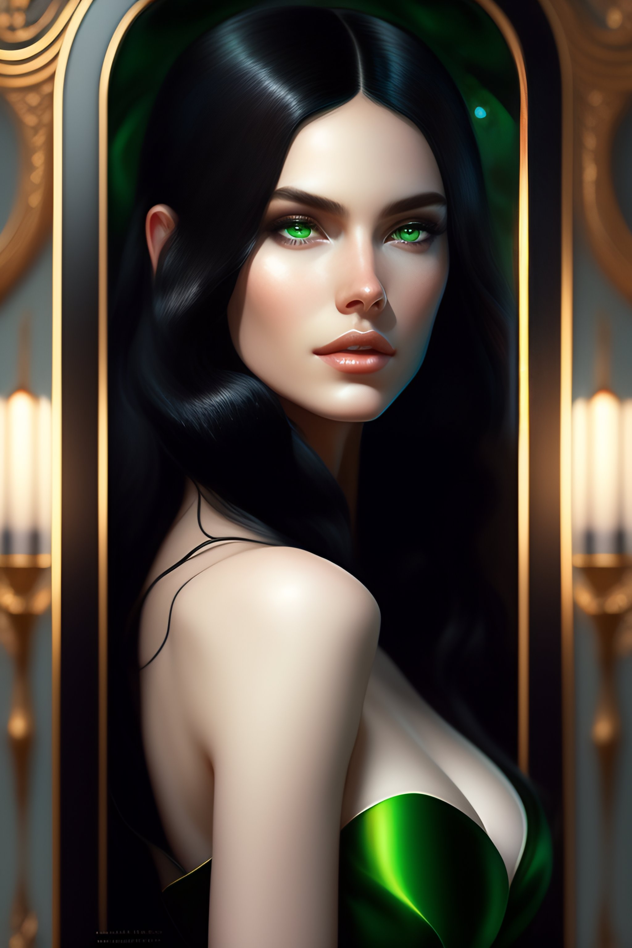 Black hair woman, pale skin, white skin, green eyes through the mirror, fantasy magic, dark pin-up style hair, dark light night, intricate, elegant, sharp focus, illustration, highly detailed, digital painting, concept art, matte, art by wlop and artgerm and greg rutkowski and alphonse mucha, masterpiece