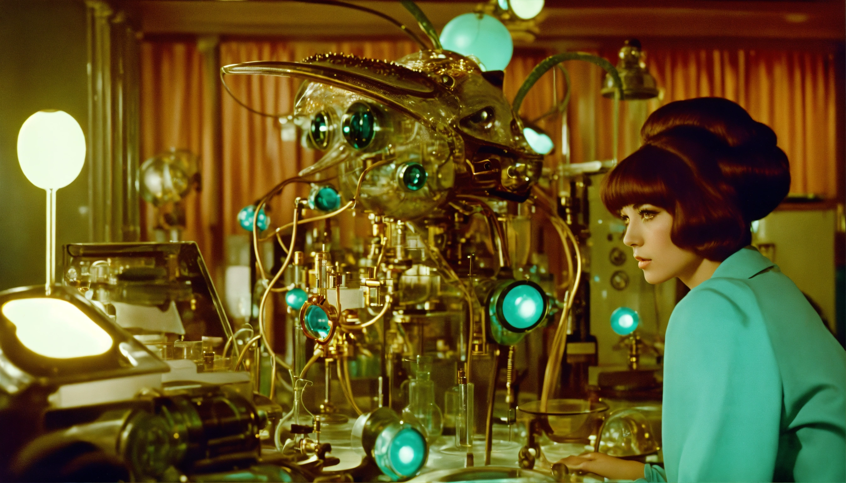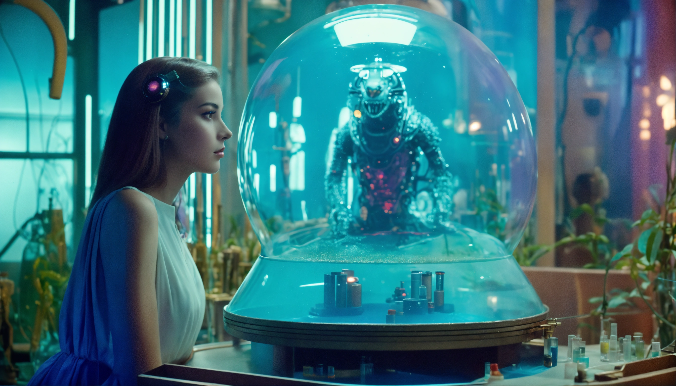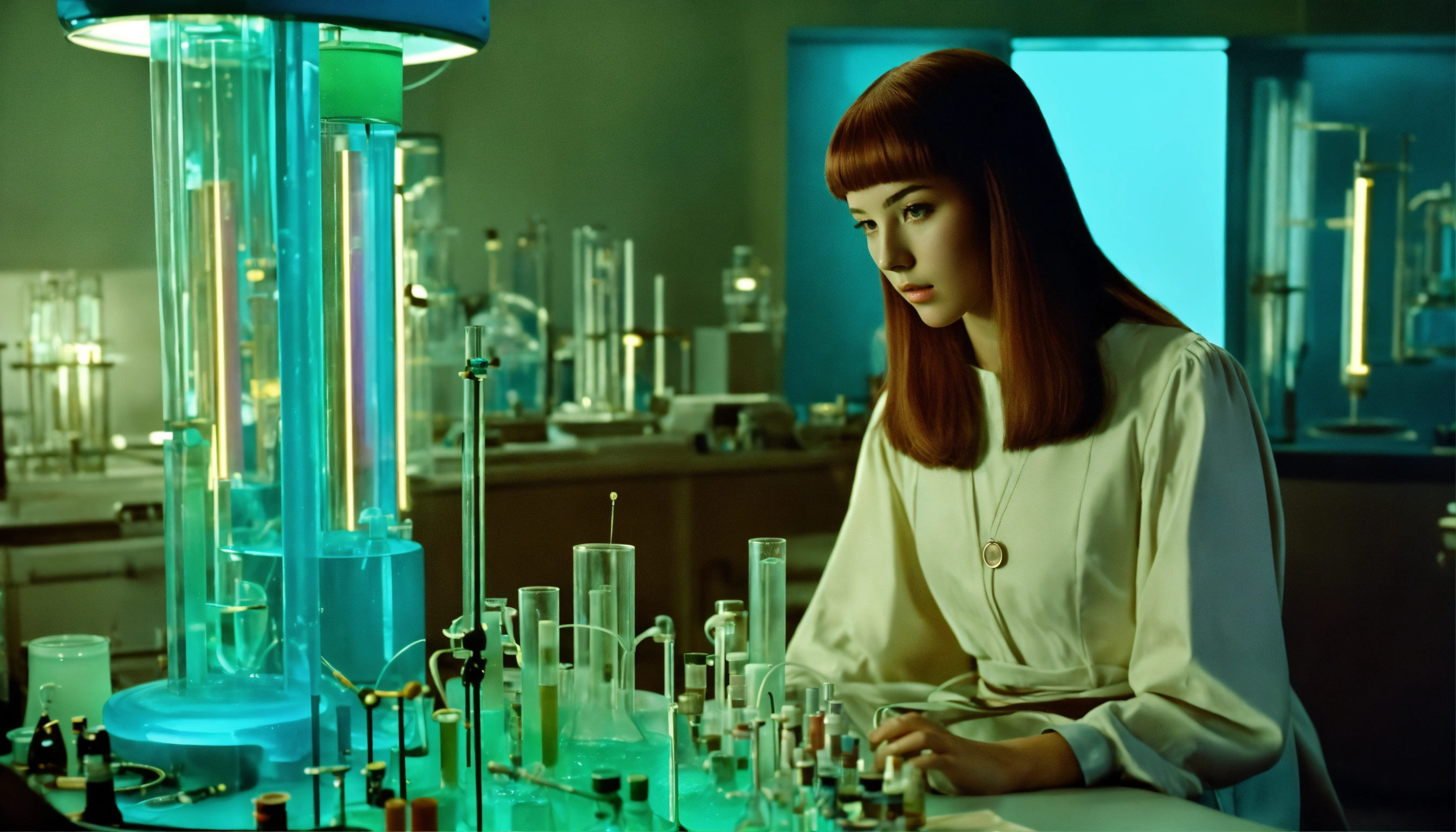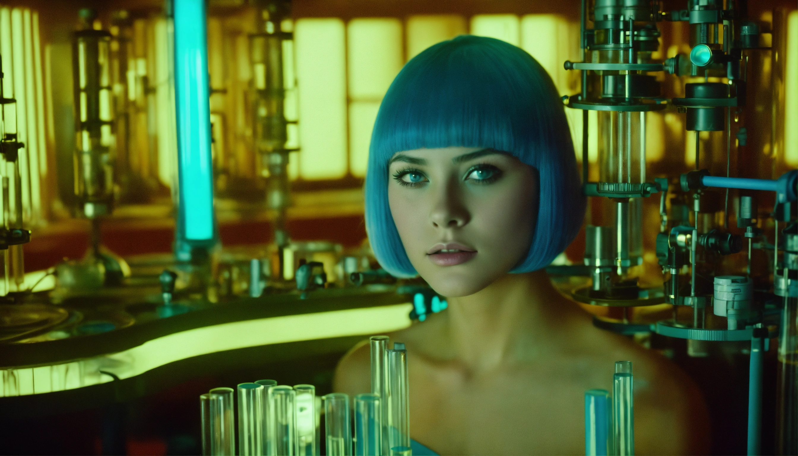 1964, old photography, kodak film colour, surreal sci fi, old film, unknown handsome 18 years old futuristic fortune teller girl with a big unknown fantasy beast monster, futuristic glass lab with myriad of research instruments, a myriad of futuristic test tubes, pale cyan blue and pale purple, regenerative plants and ai
