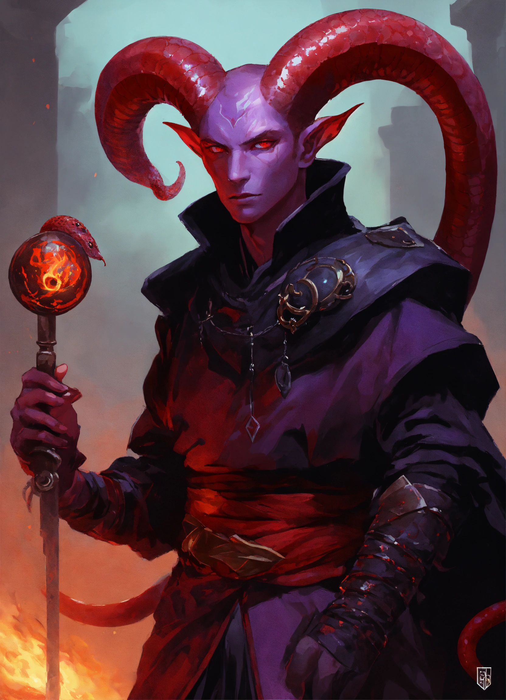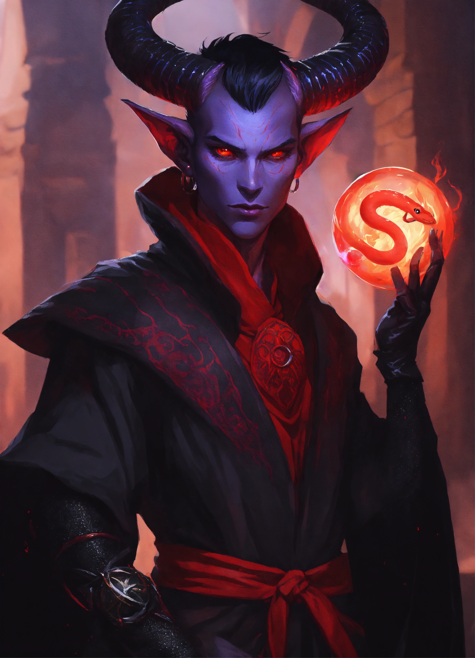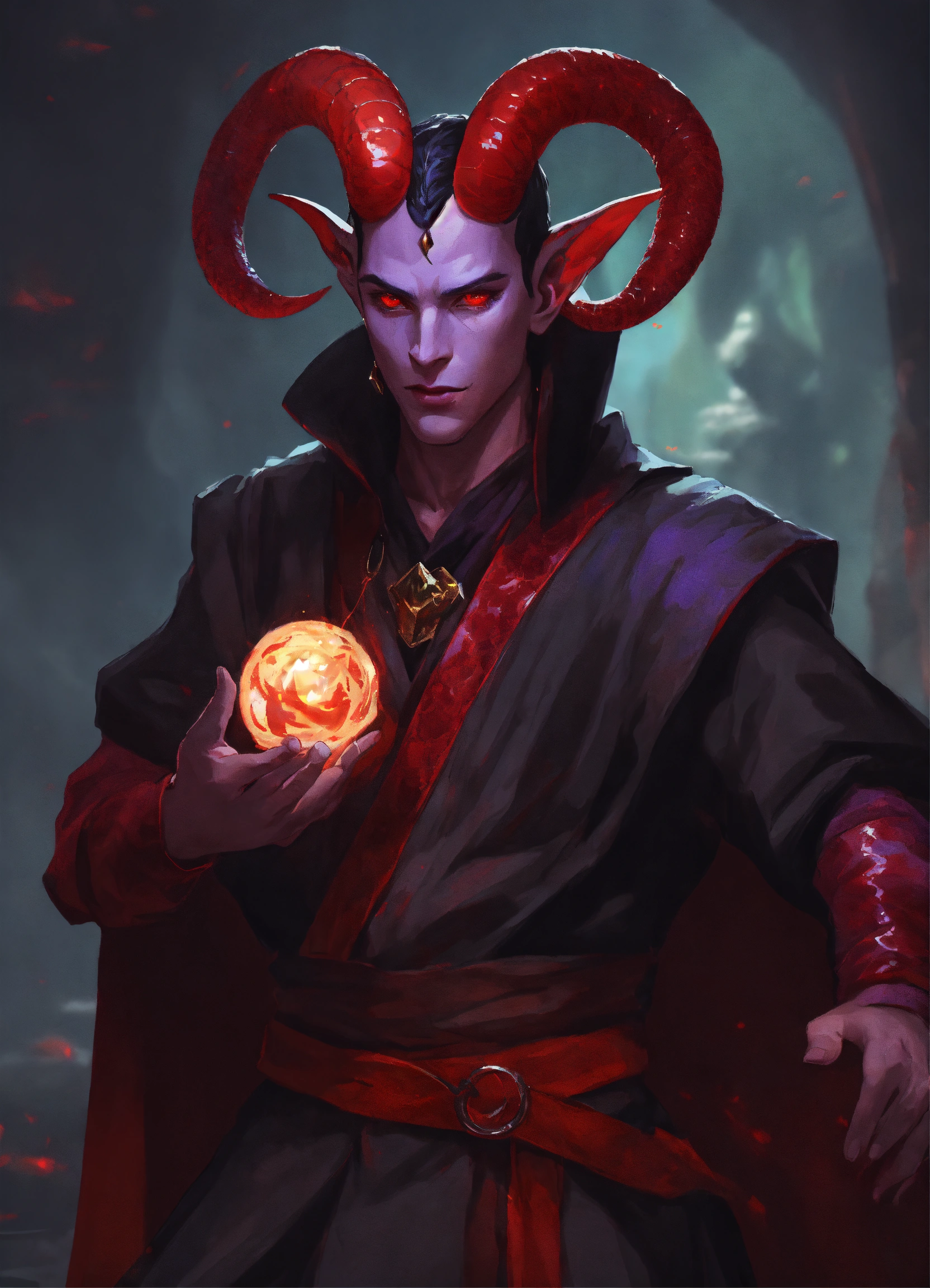 A d&d tiefling with pale red skin and red snake like eyes, he has small black horns, one of his two horns is snapped in half, he is wearing black robes with red and purple as secondary colours, he is holding a fireball, he has short black hair which reaches just above his shoulders, his skin is a pale red colour