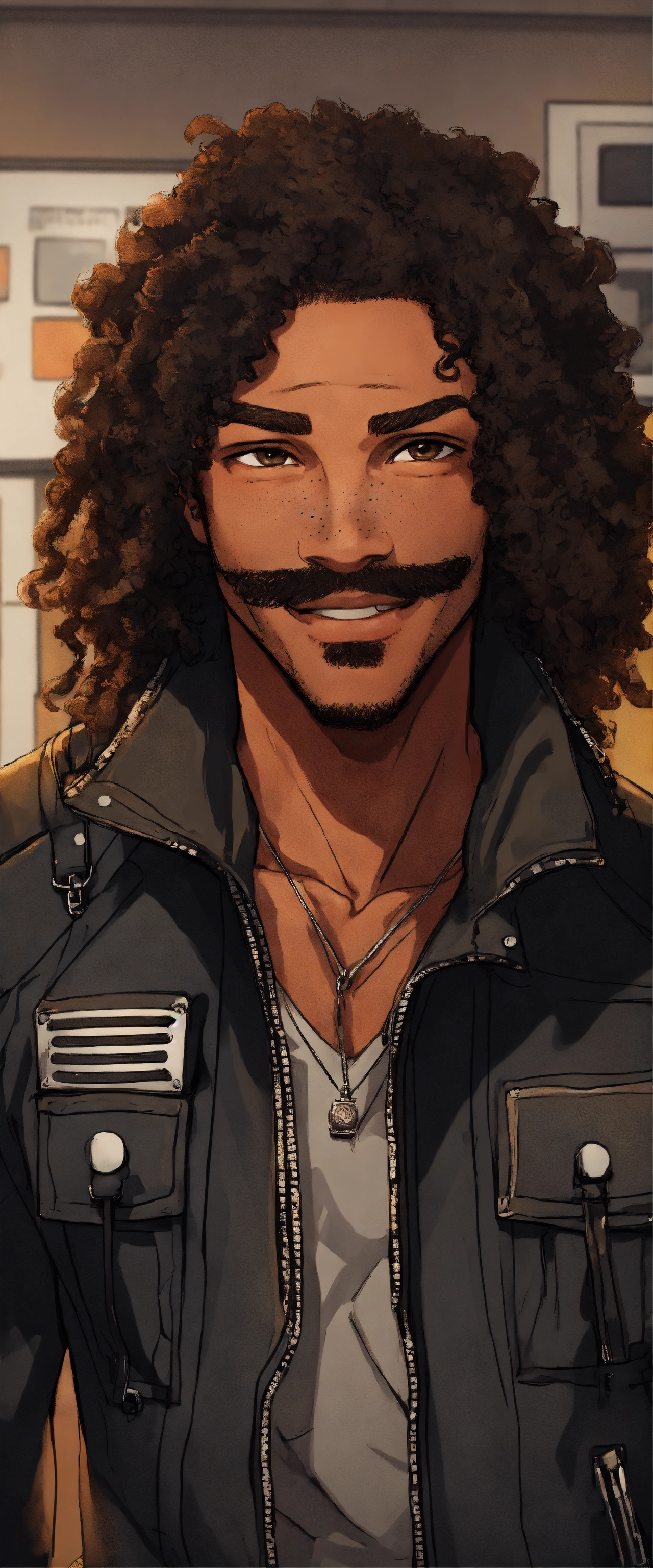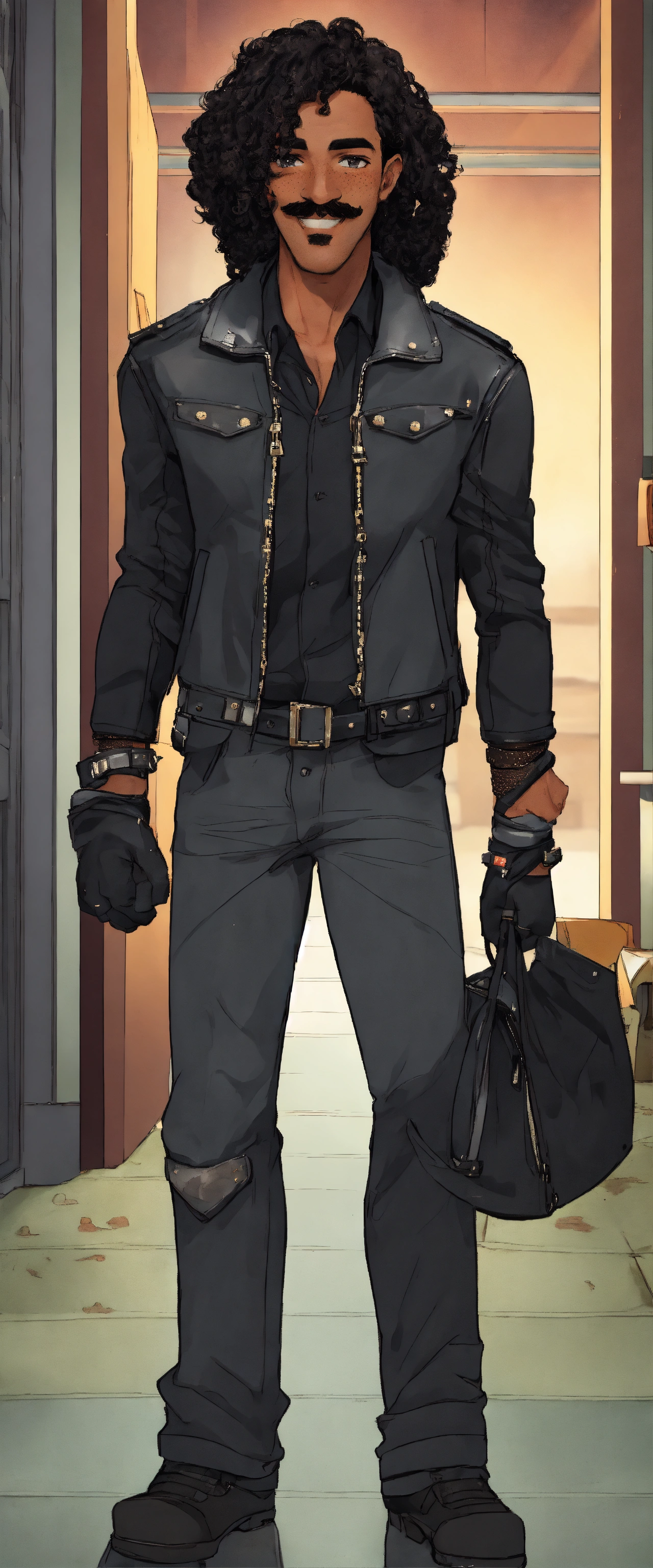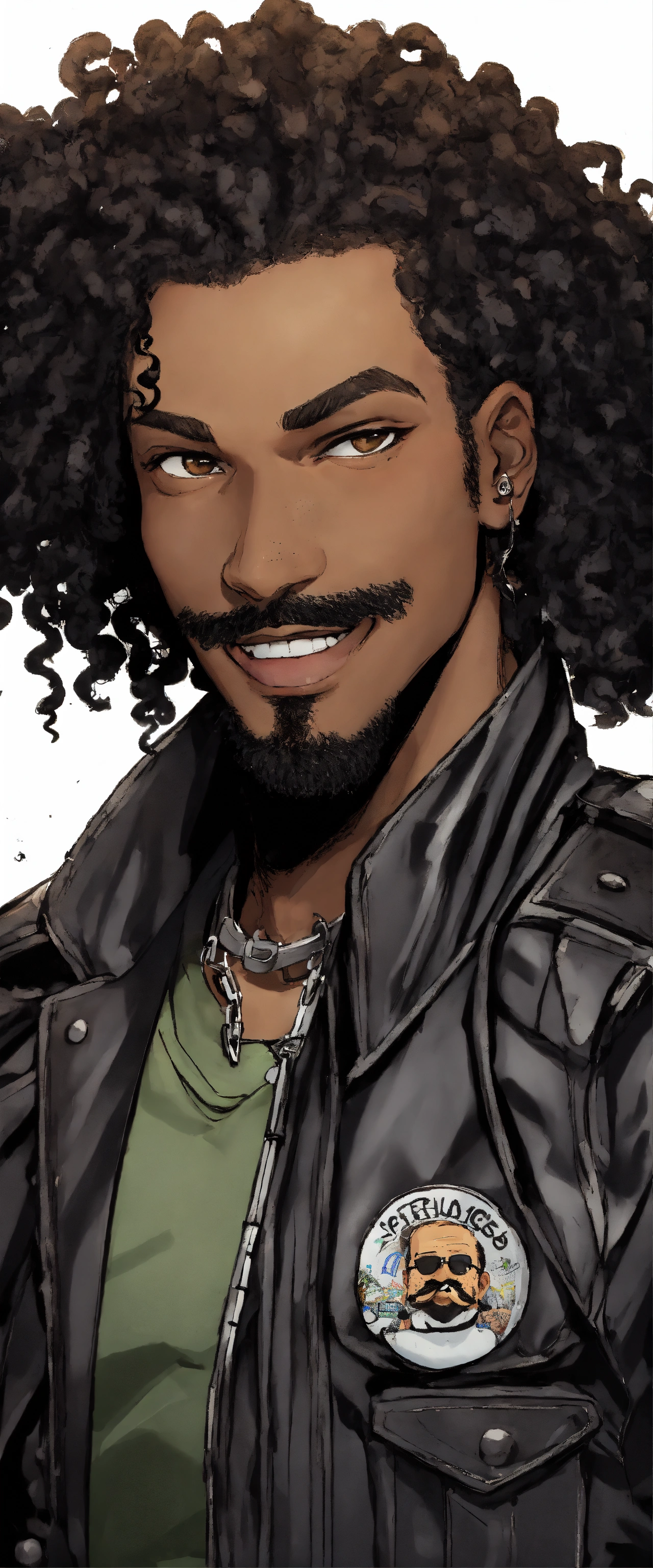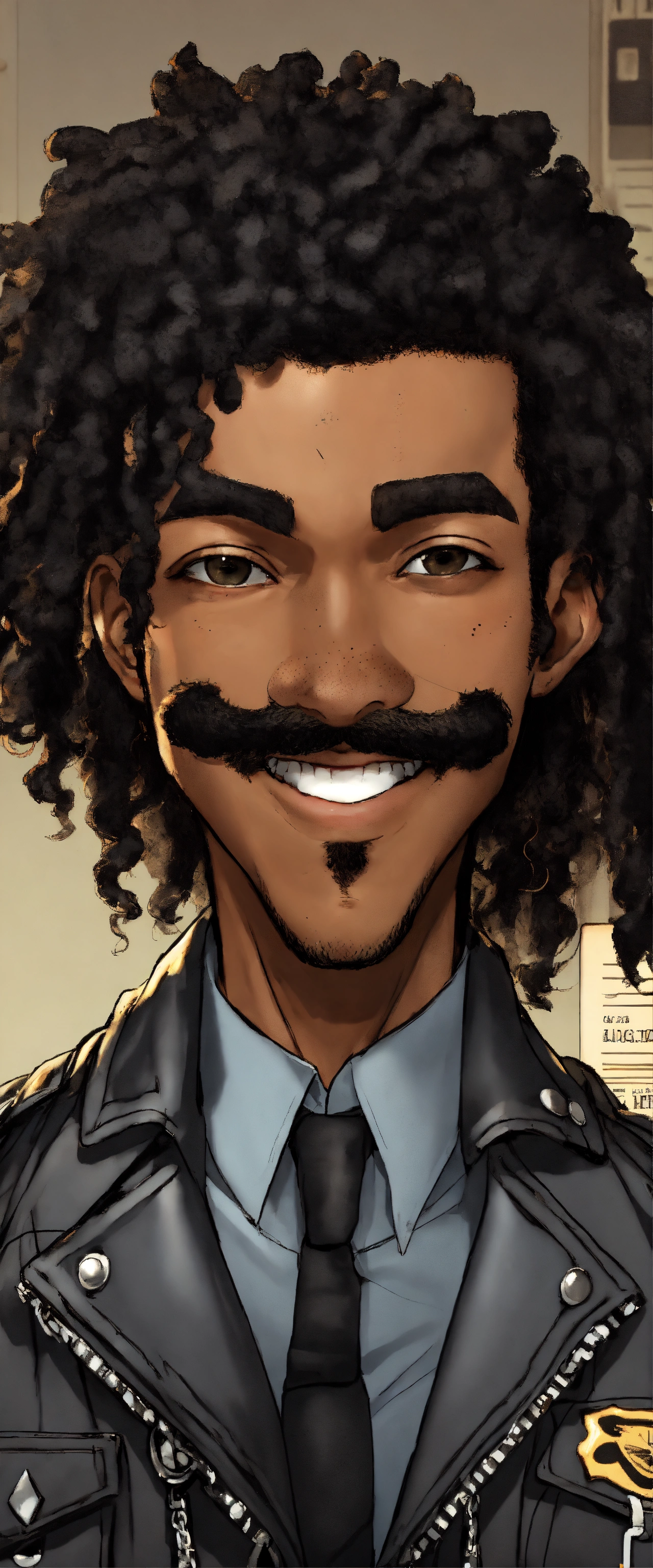 Medium height black male, long curly hair, braces, mustache, freckles, black leather jacket, worn clothing, fingerless gloves, mugshot, grin, cartoon