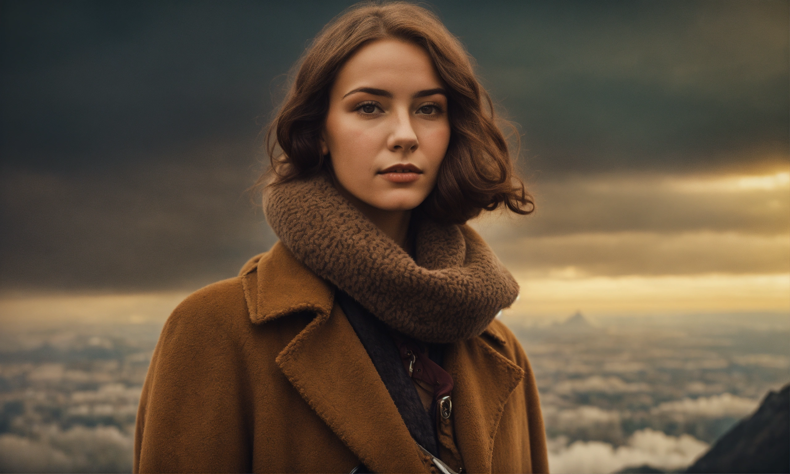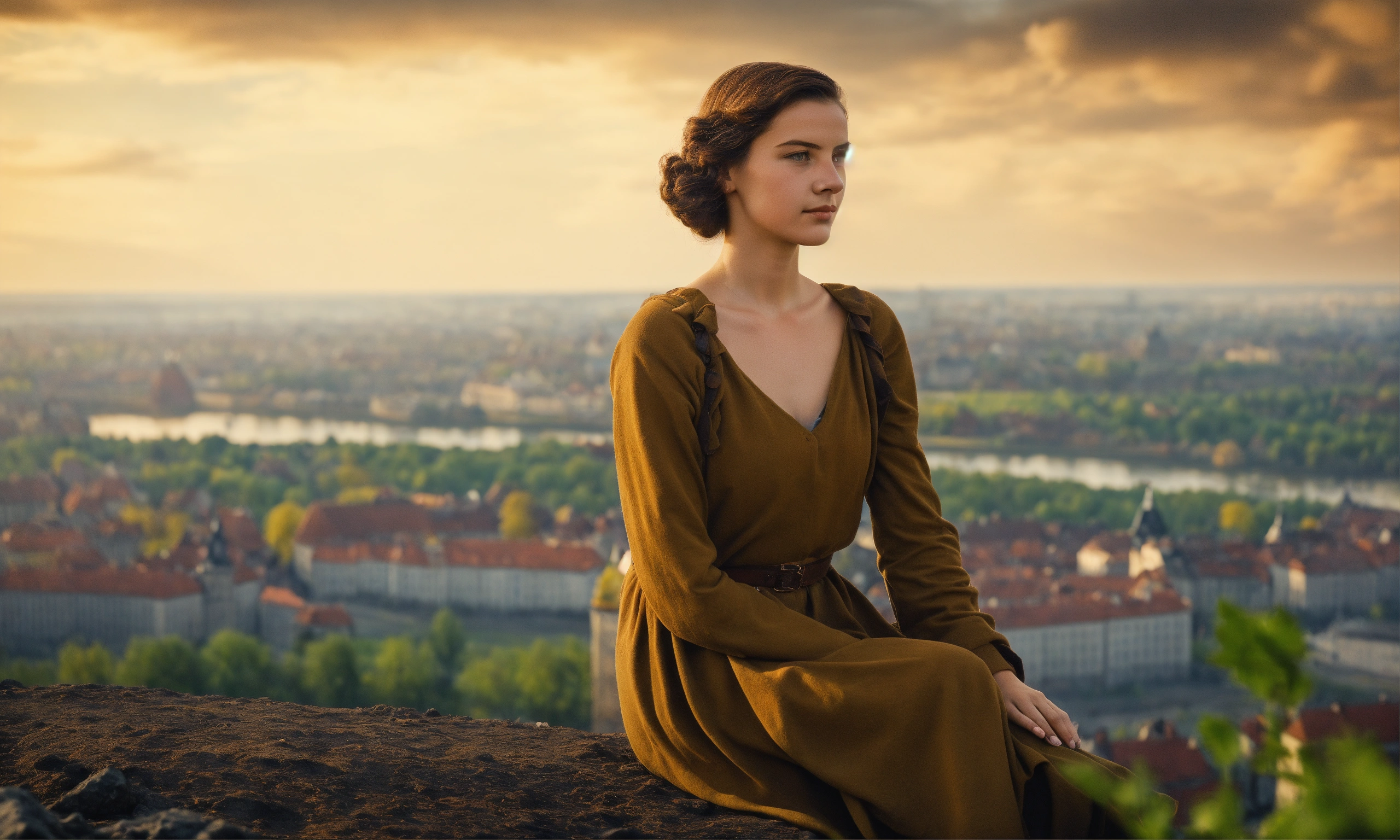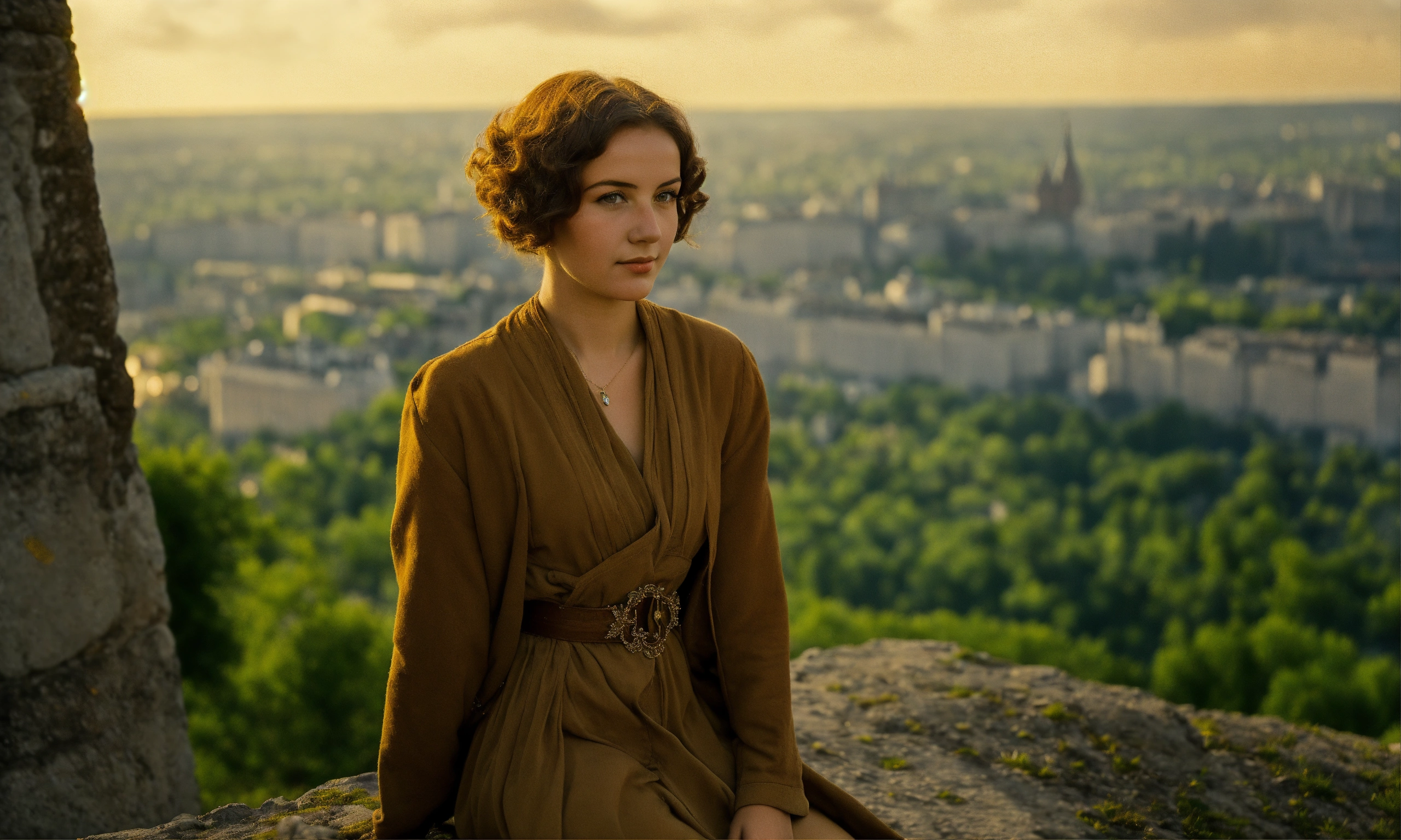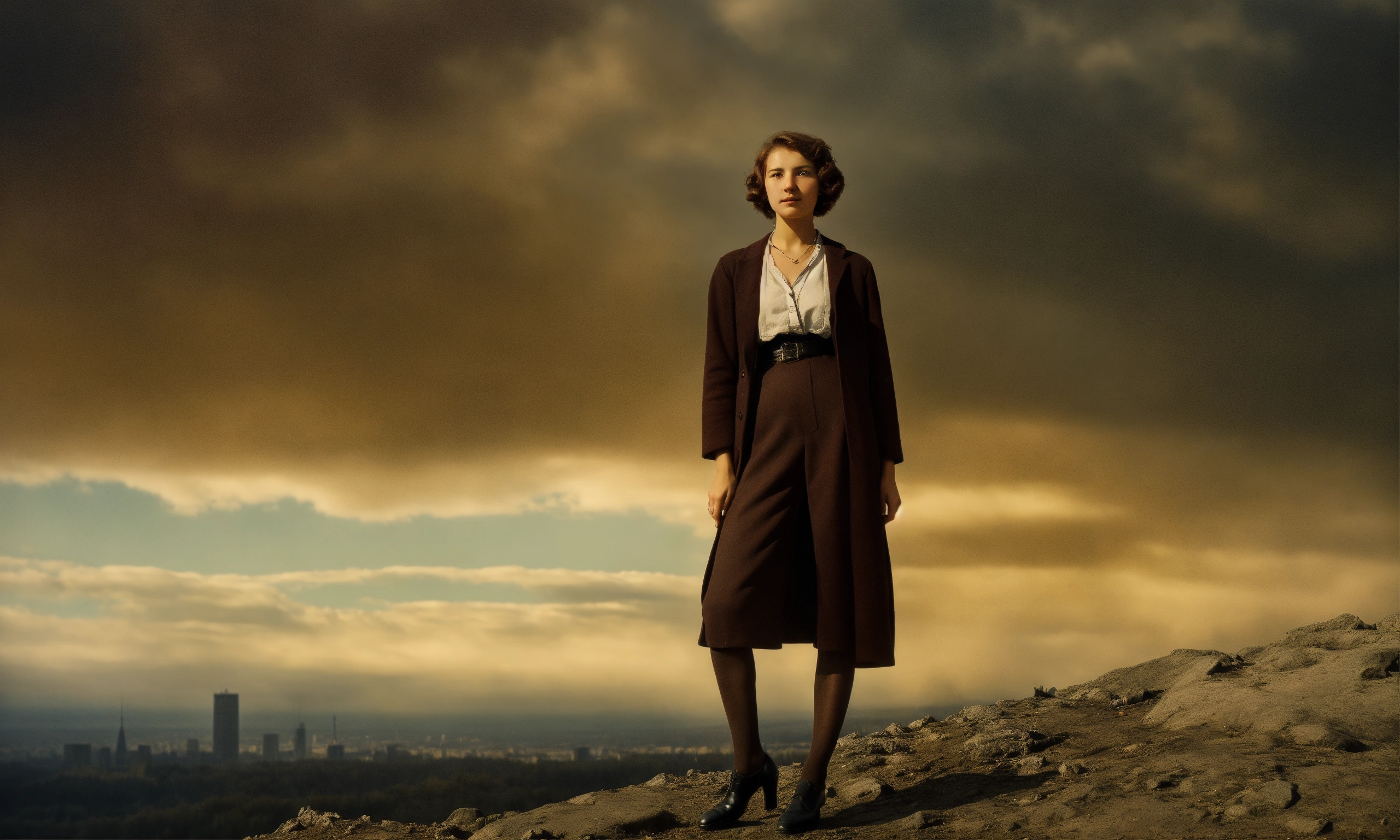 Warszawa 1920-1930, europian woman age 20, on top of a mountain, looks at the camera at full height, bald, modern style. brown hair.