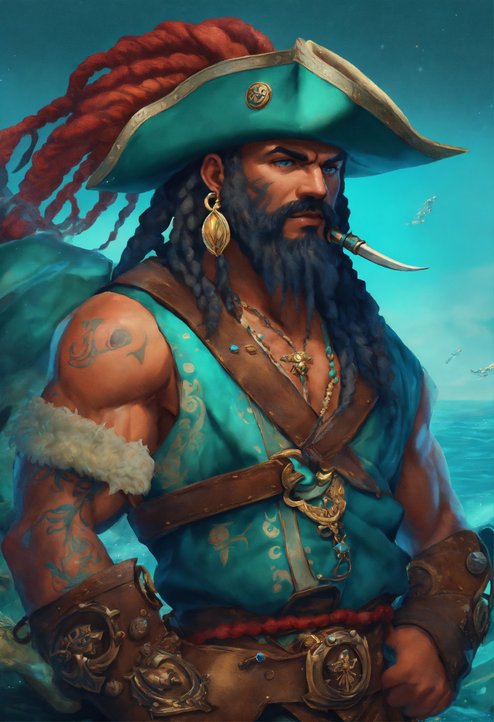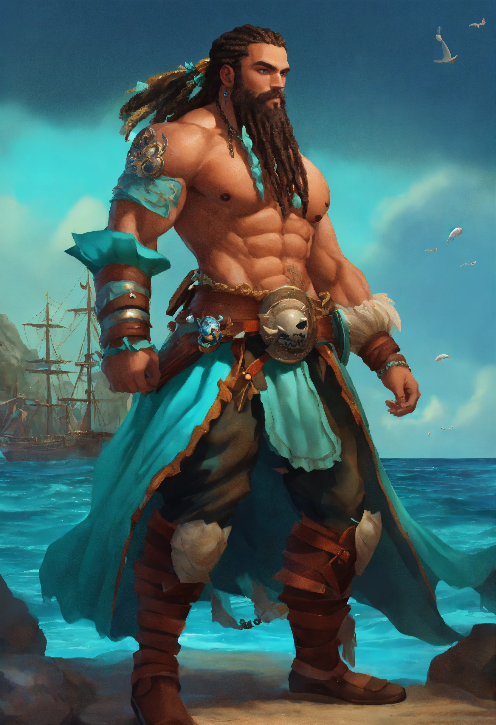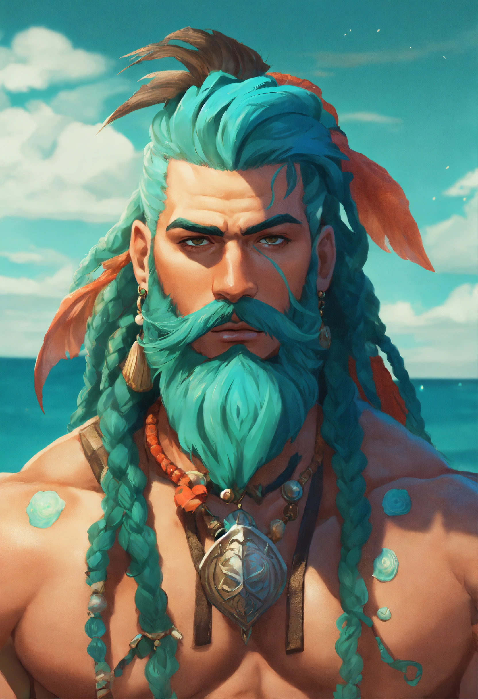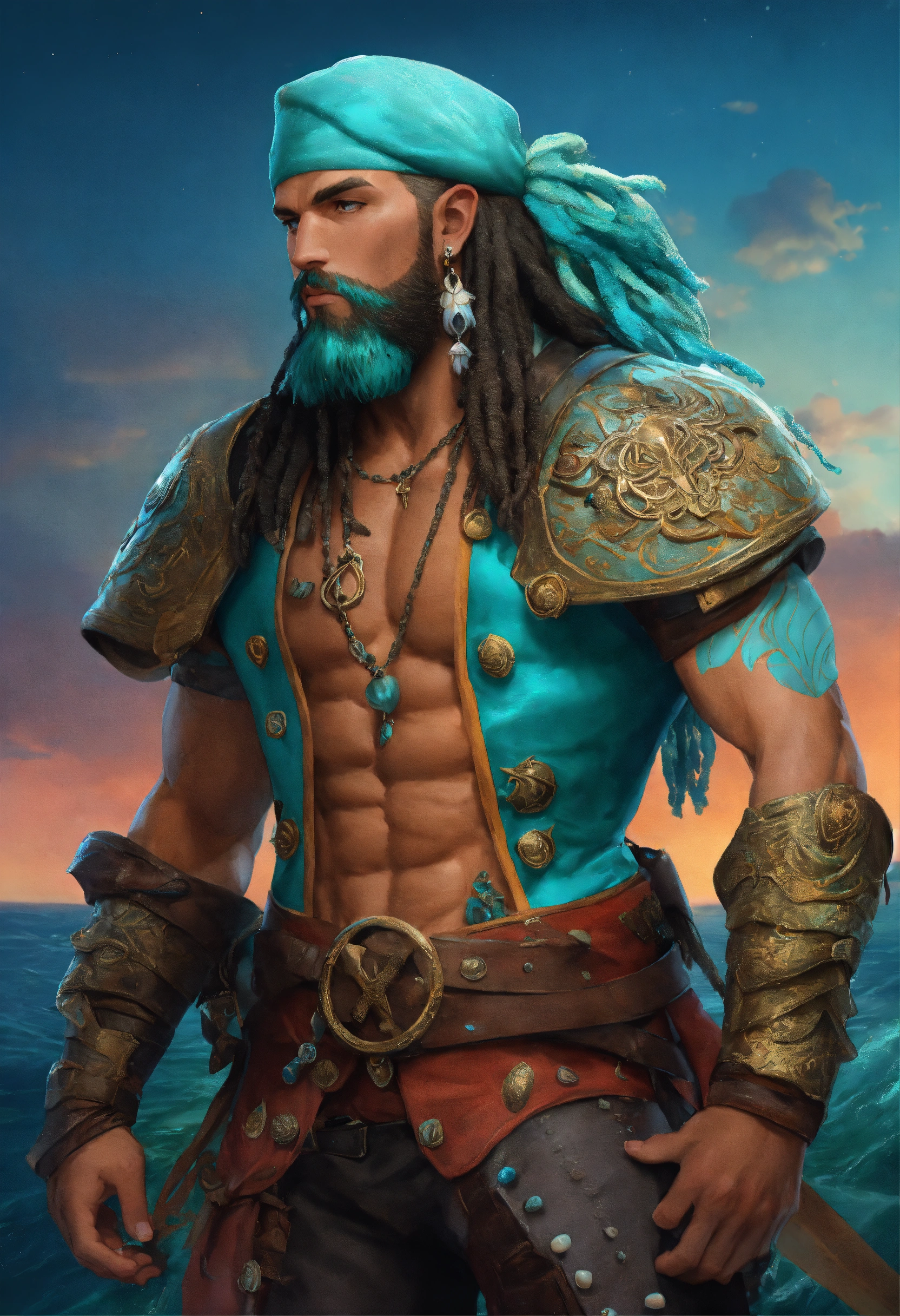 A buff muscular blue skinned triton pirate, he wears coral and leather armor, long seafoam colored dreadlocks with shells in them matching his well groomed short beard