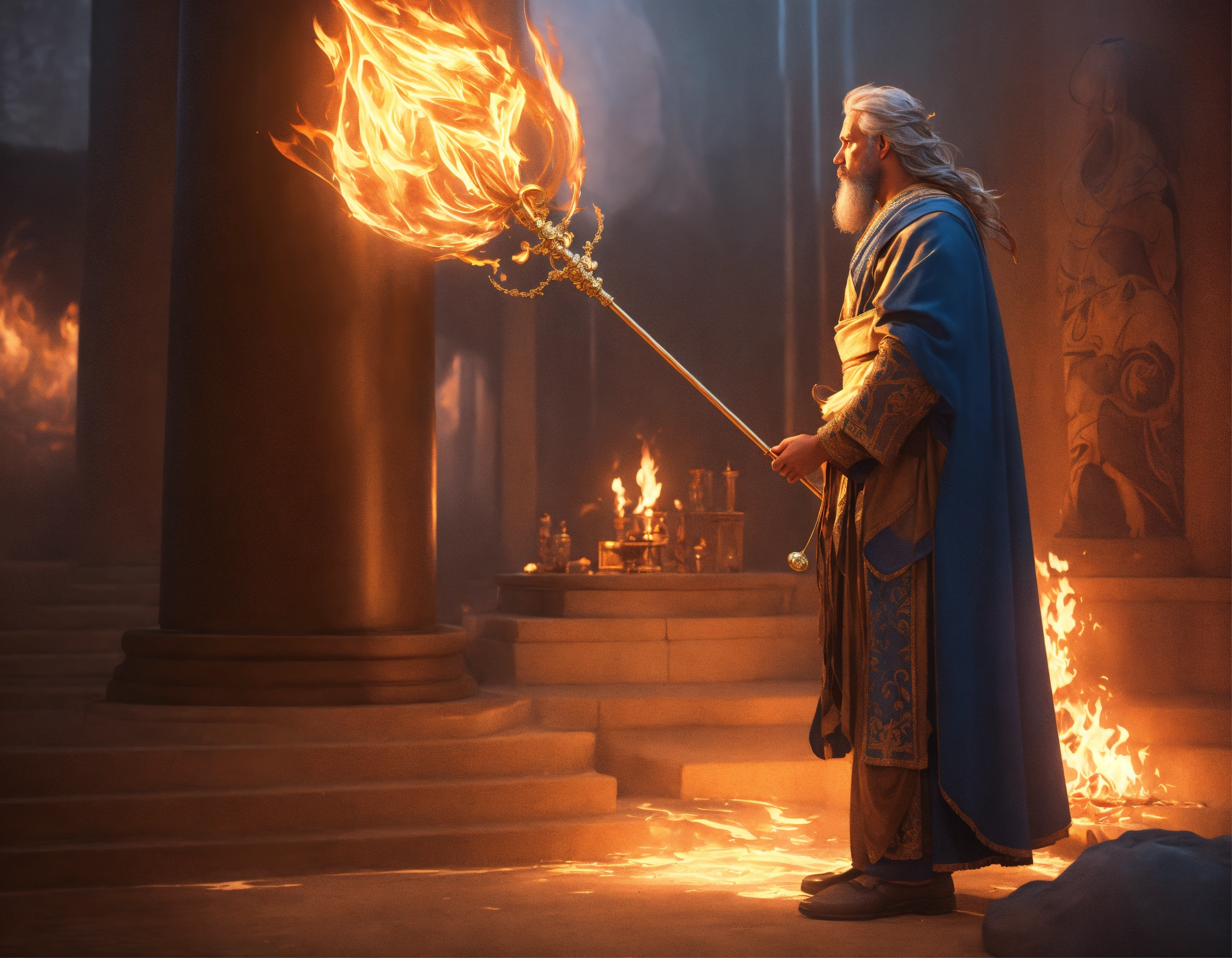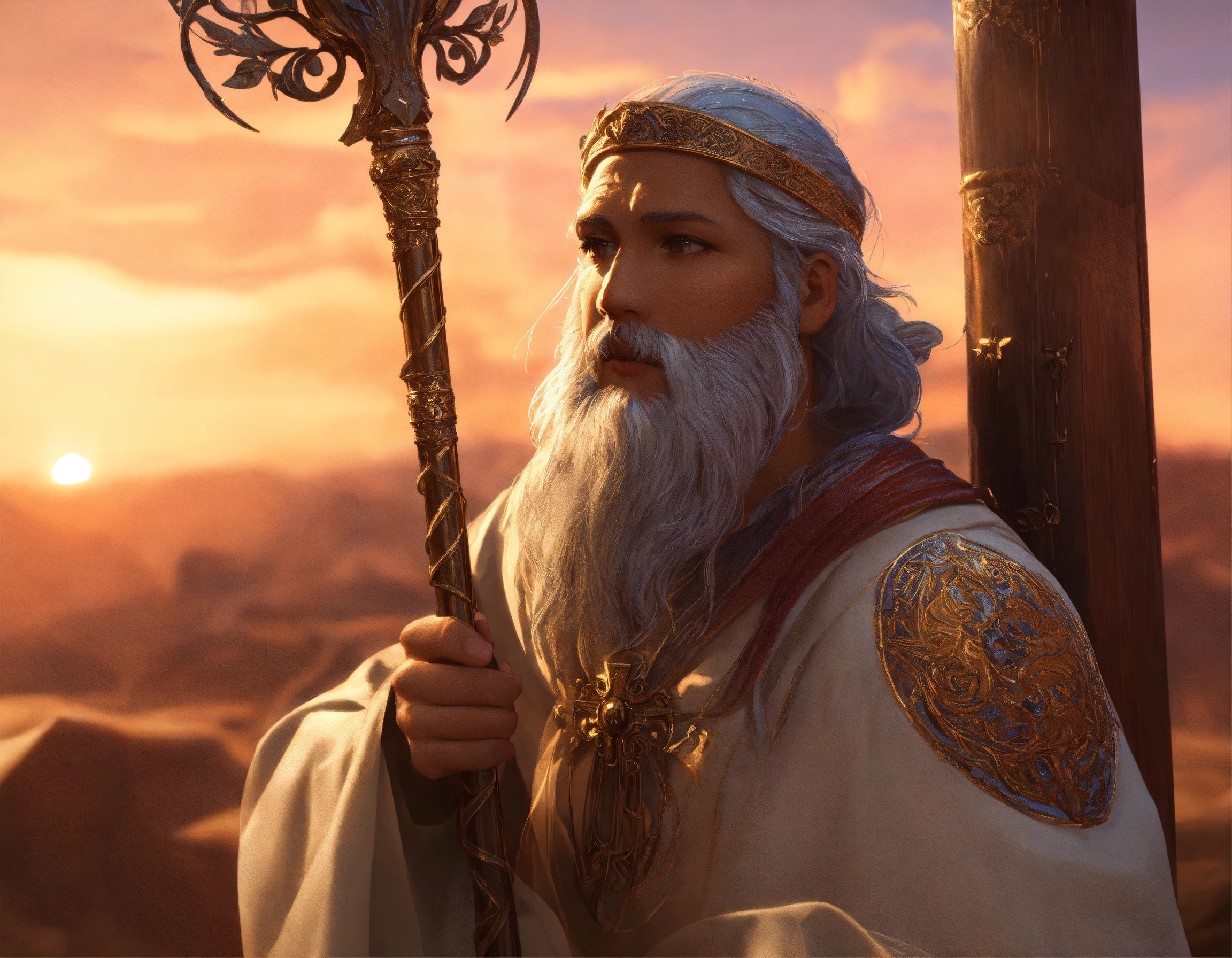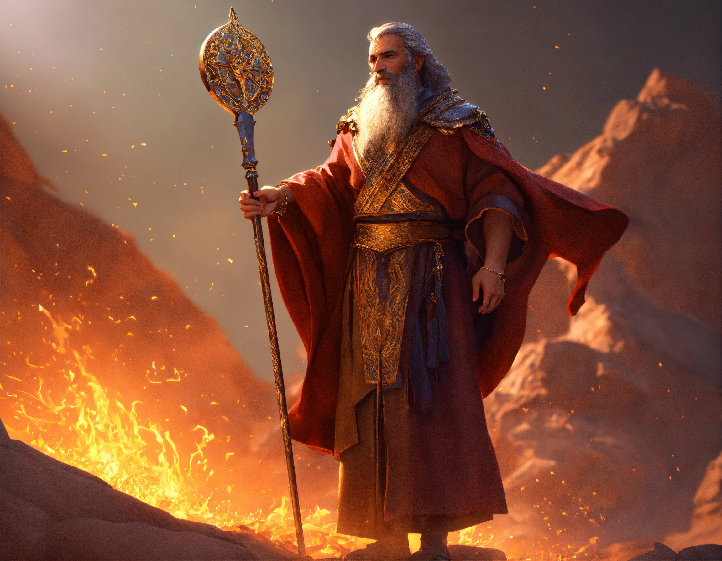 Moses with staff, talks to god at burning bush, cinematic lighting, complex, elegant, super detailed, art station, concept art, smooth, sharp focus, no blur, no dof, extreme illustration, unreal engine 5, photorealism, hd quality, 8k resolution, cinema 4d, 3d, beautiful, delicate, art by artgerm and greg rutkowski and alphonse mucha and loish and wlop