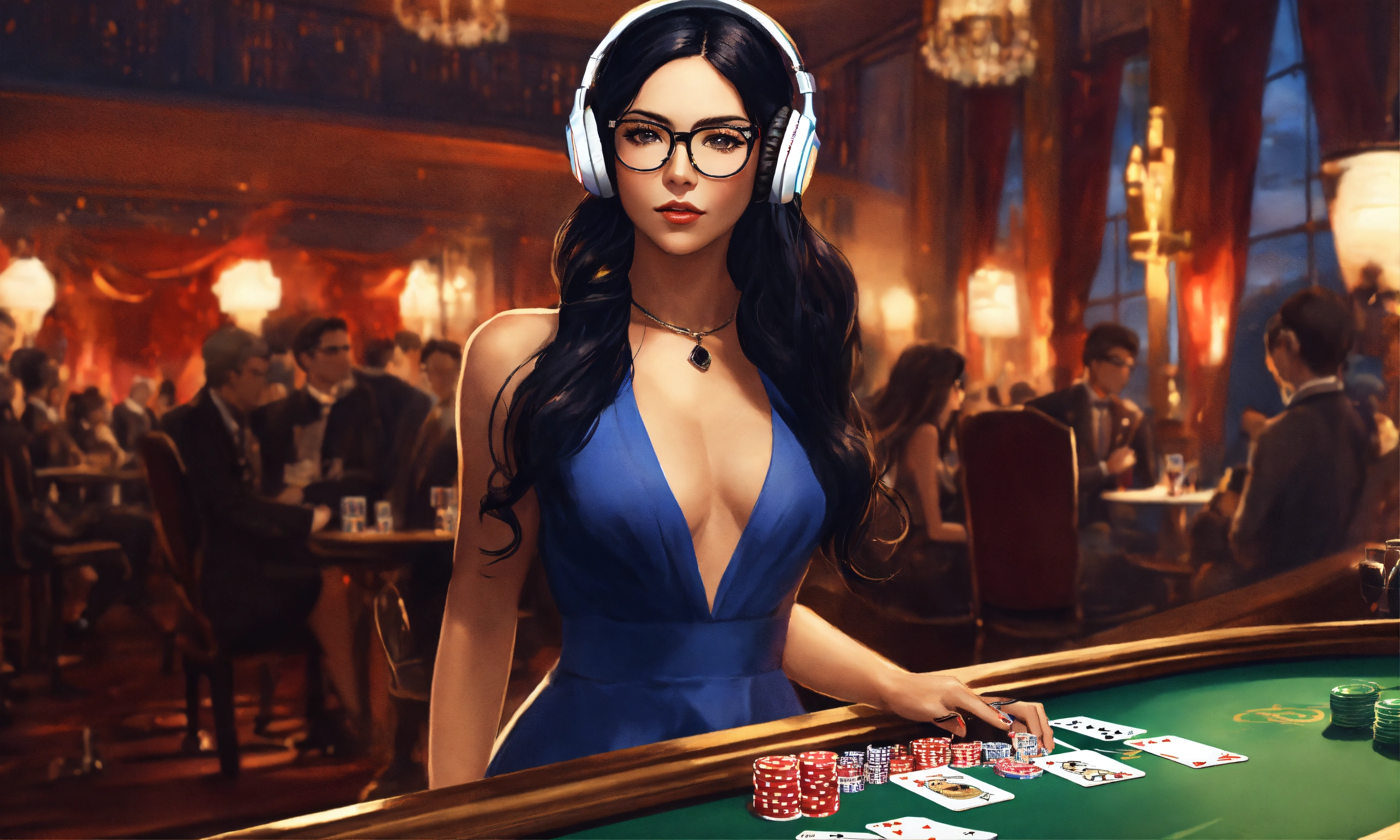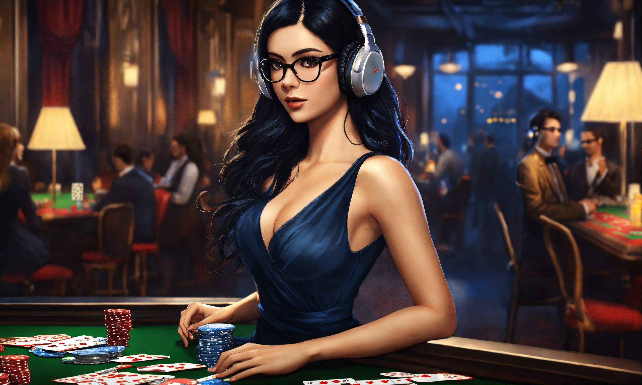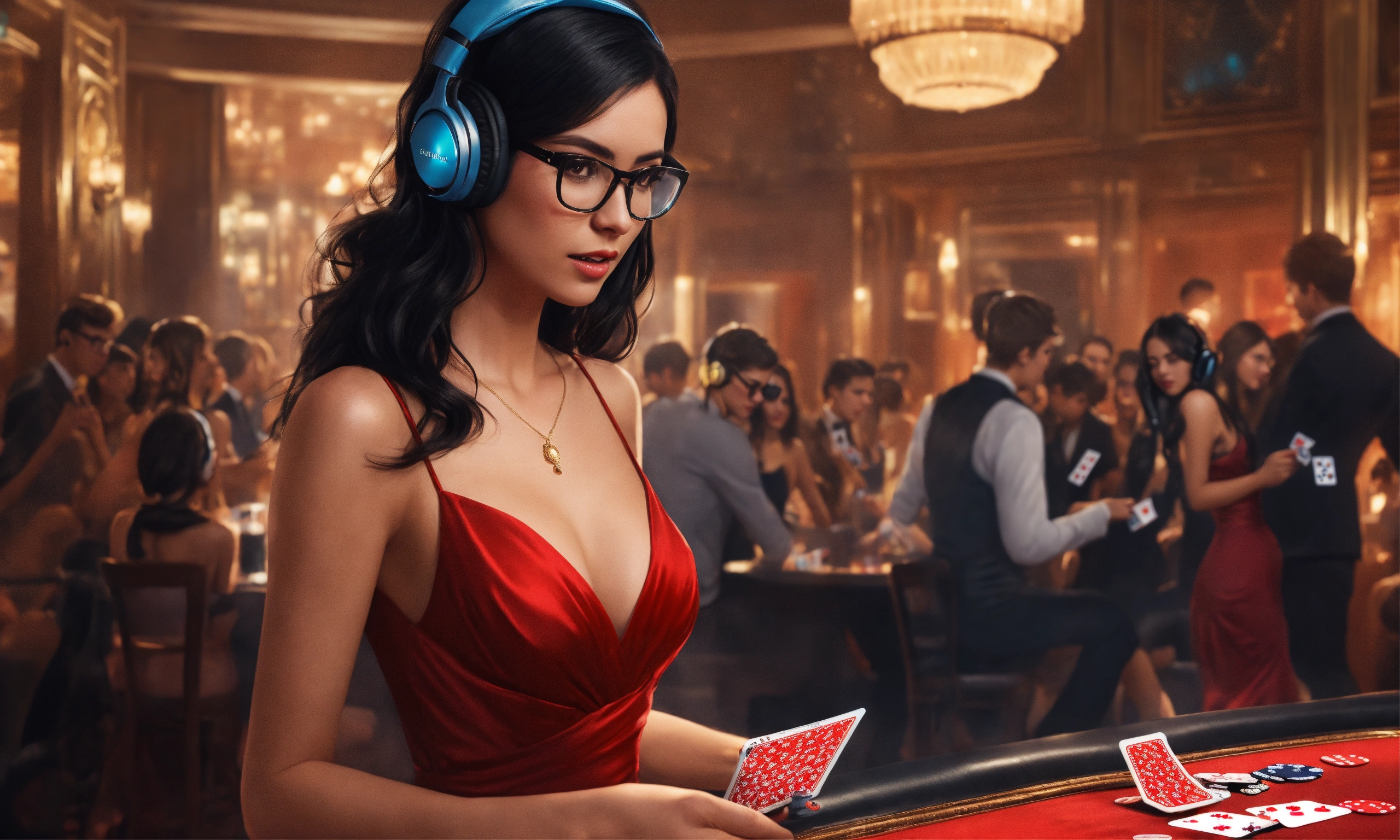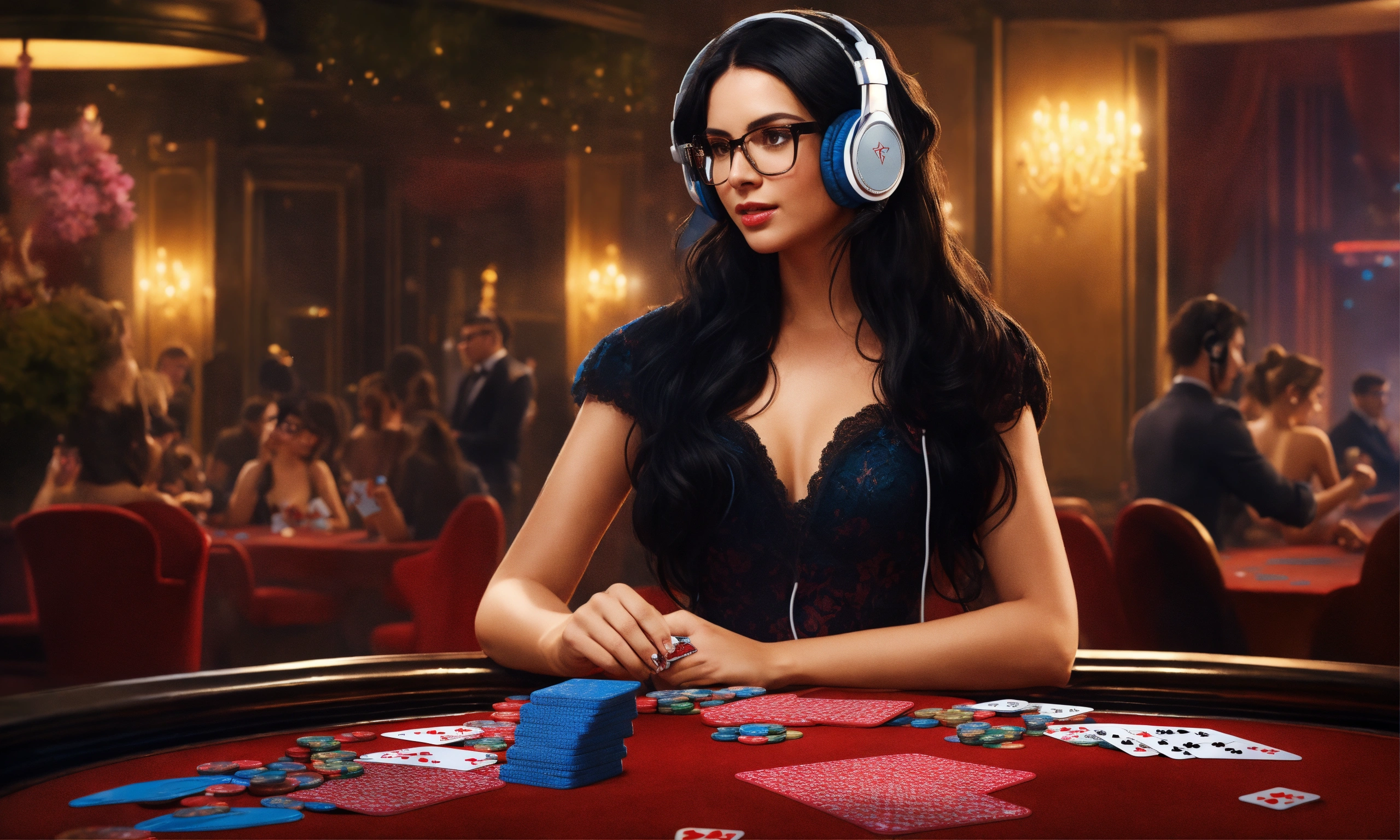 A realistic woman with black long hair, wearing glasses and headphones, in an elegant dress, enters a club and playing cards are spilled around her.