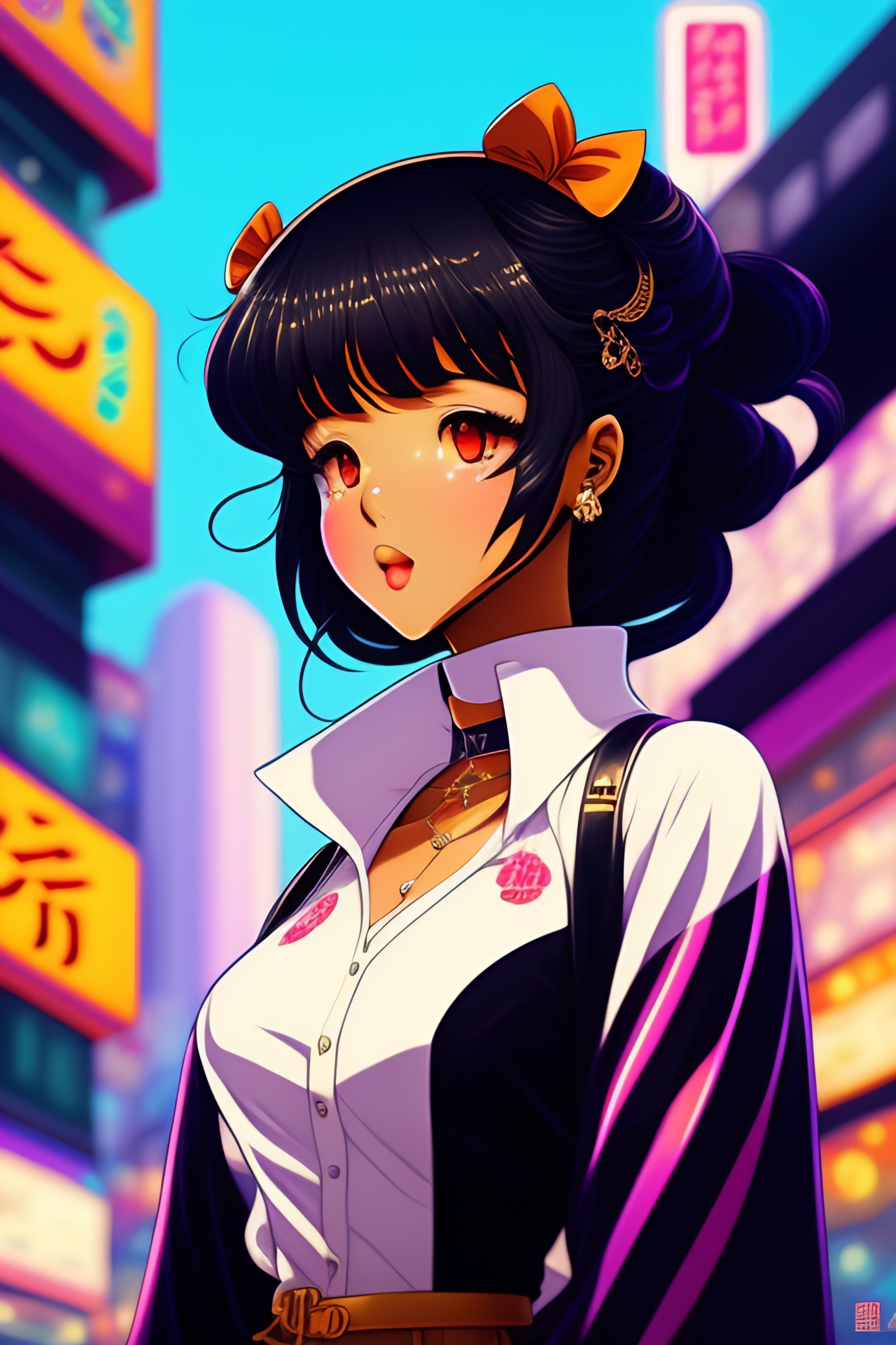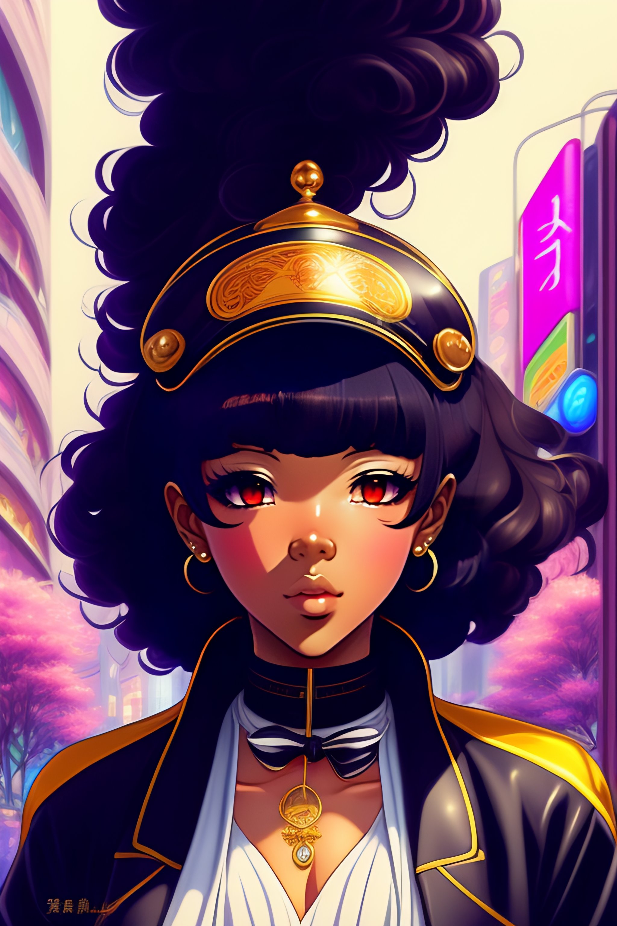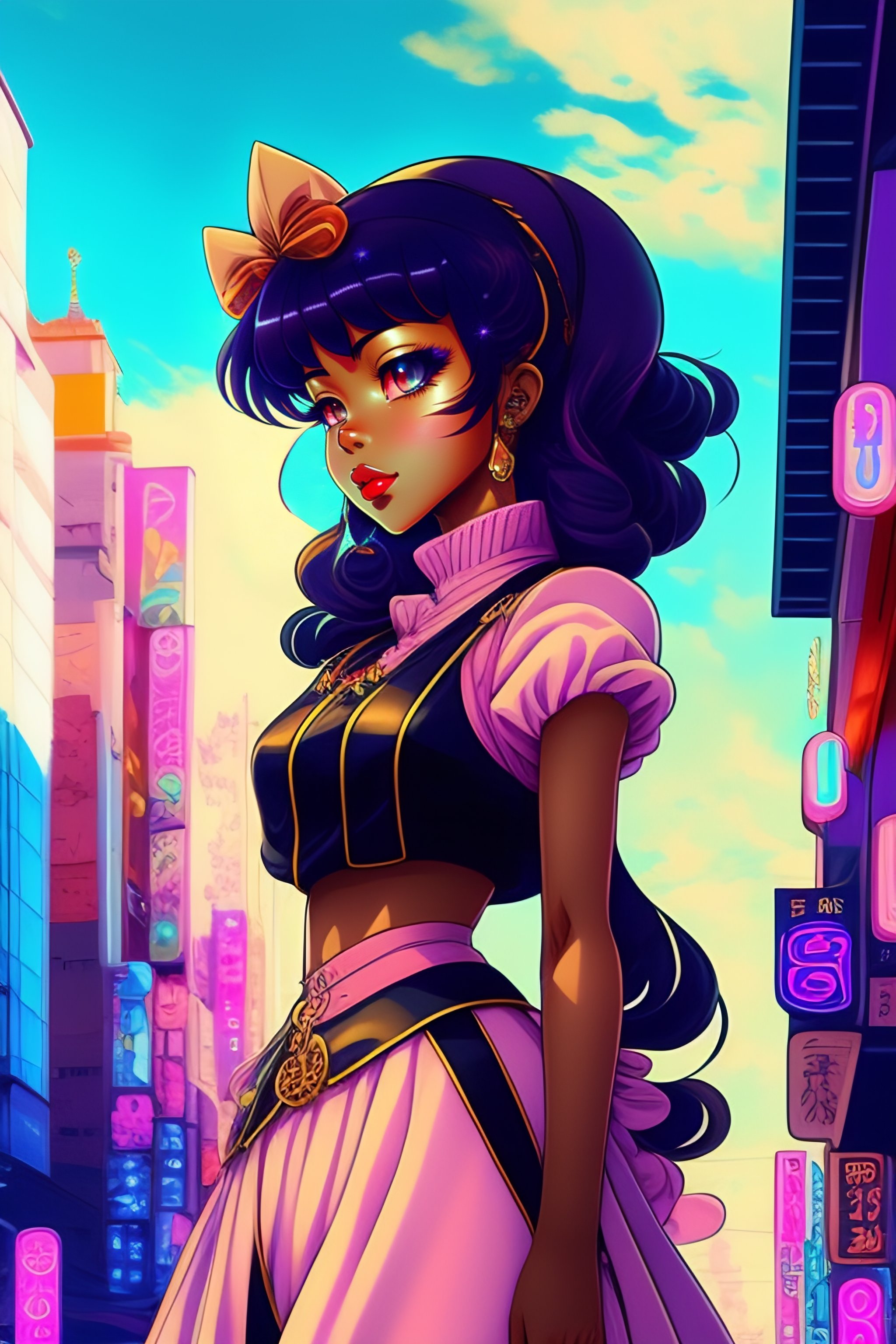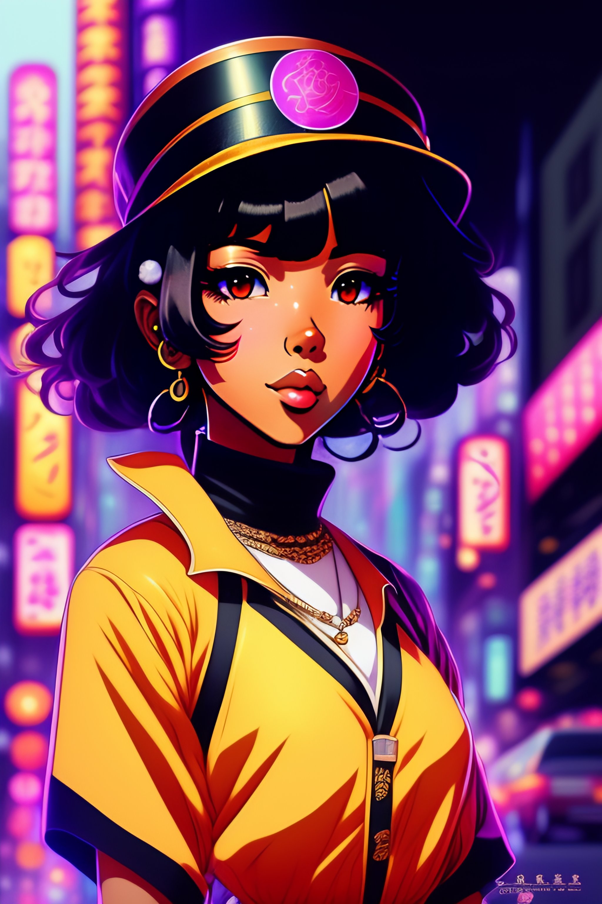 In the style of 90's vintage, anime art of a stylish black magical girl in tokyo city street, detailed art, fine line art 90’s vintage anime