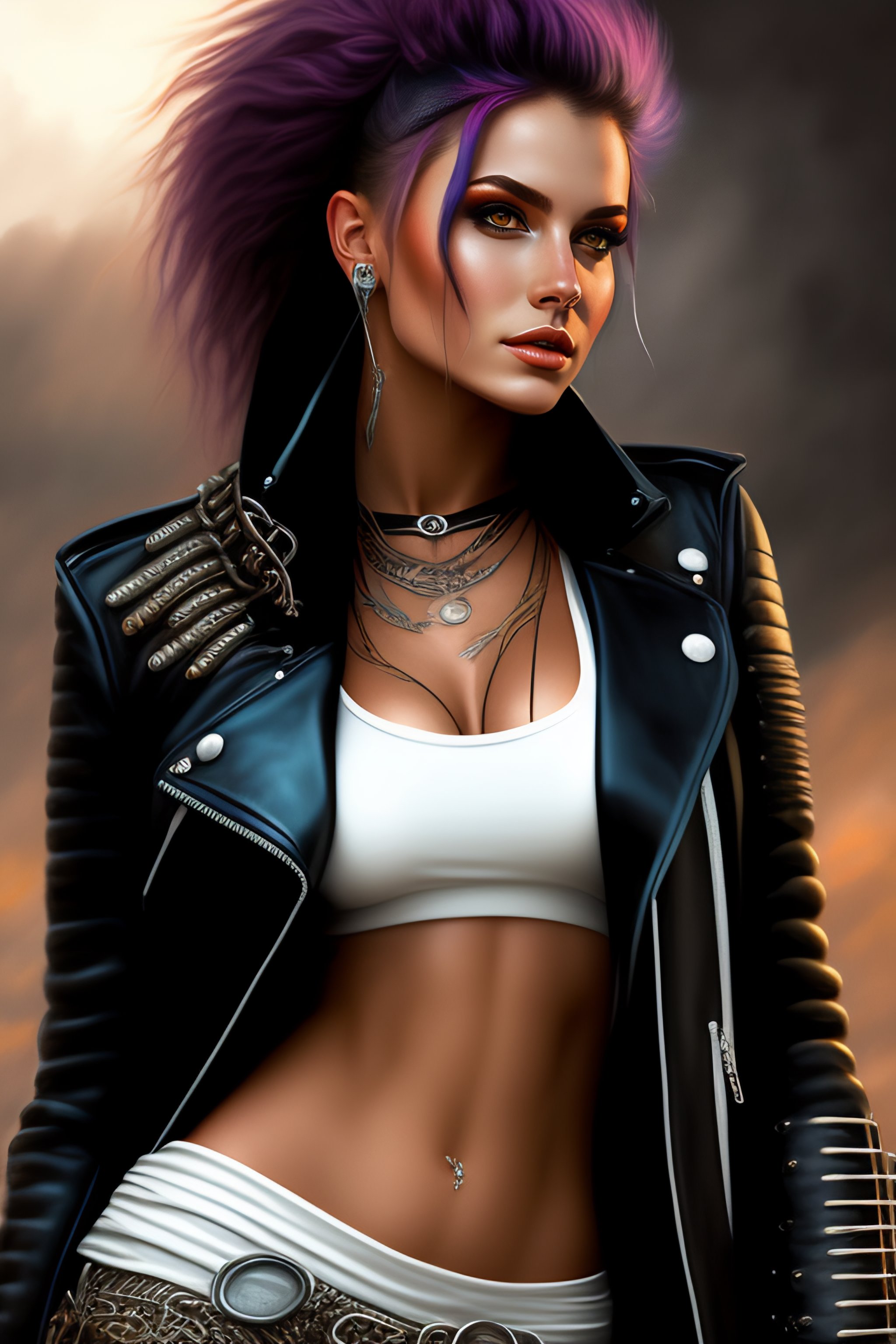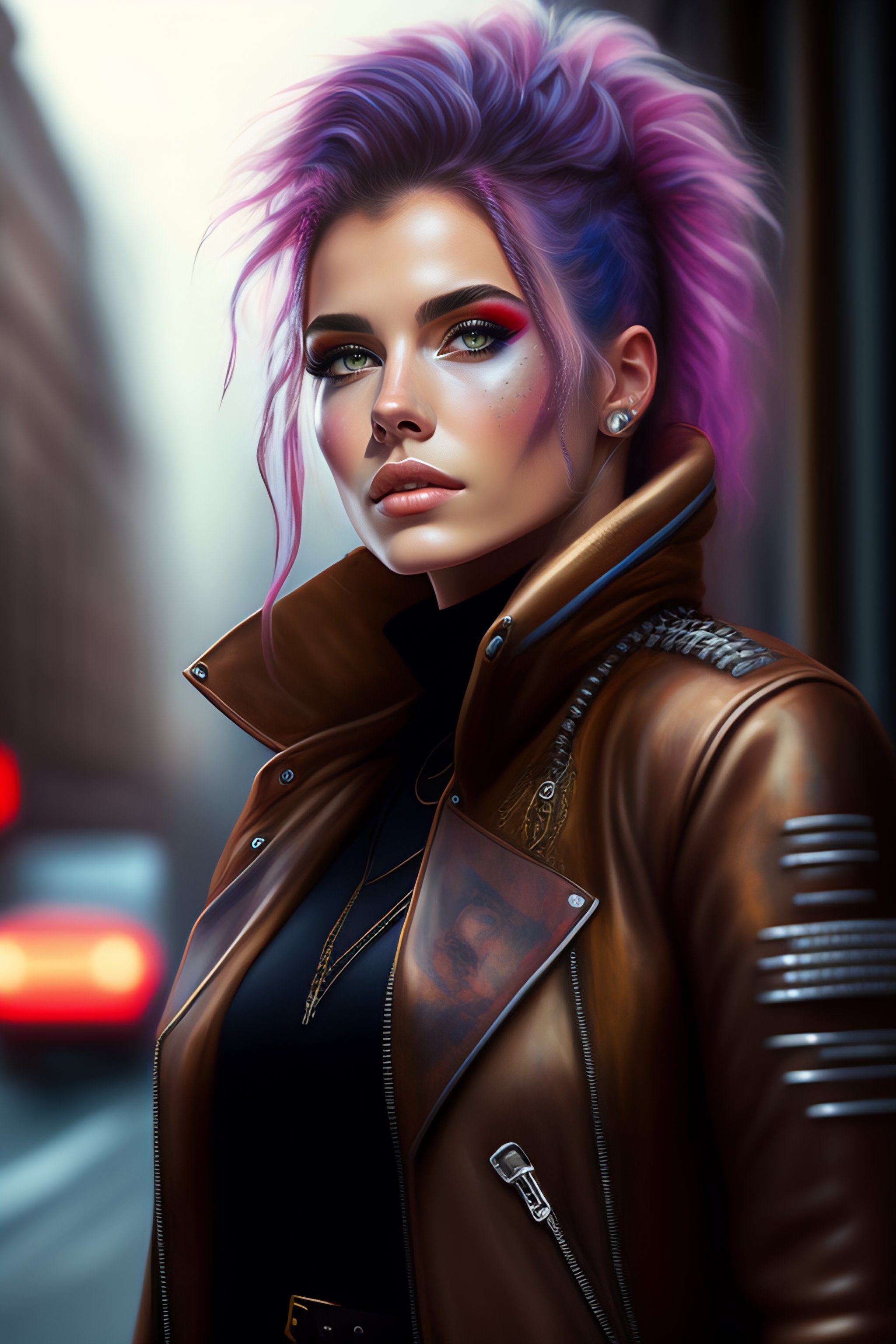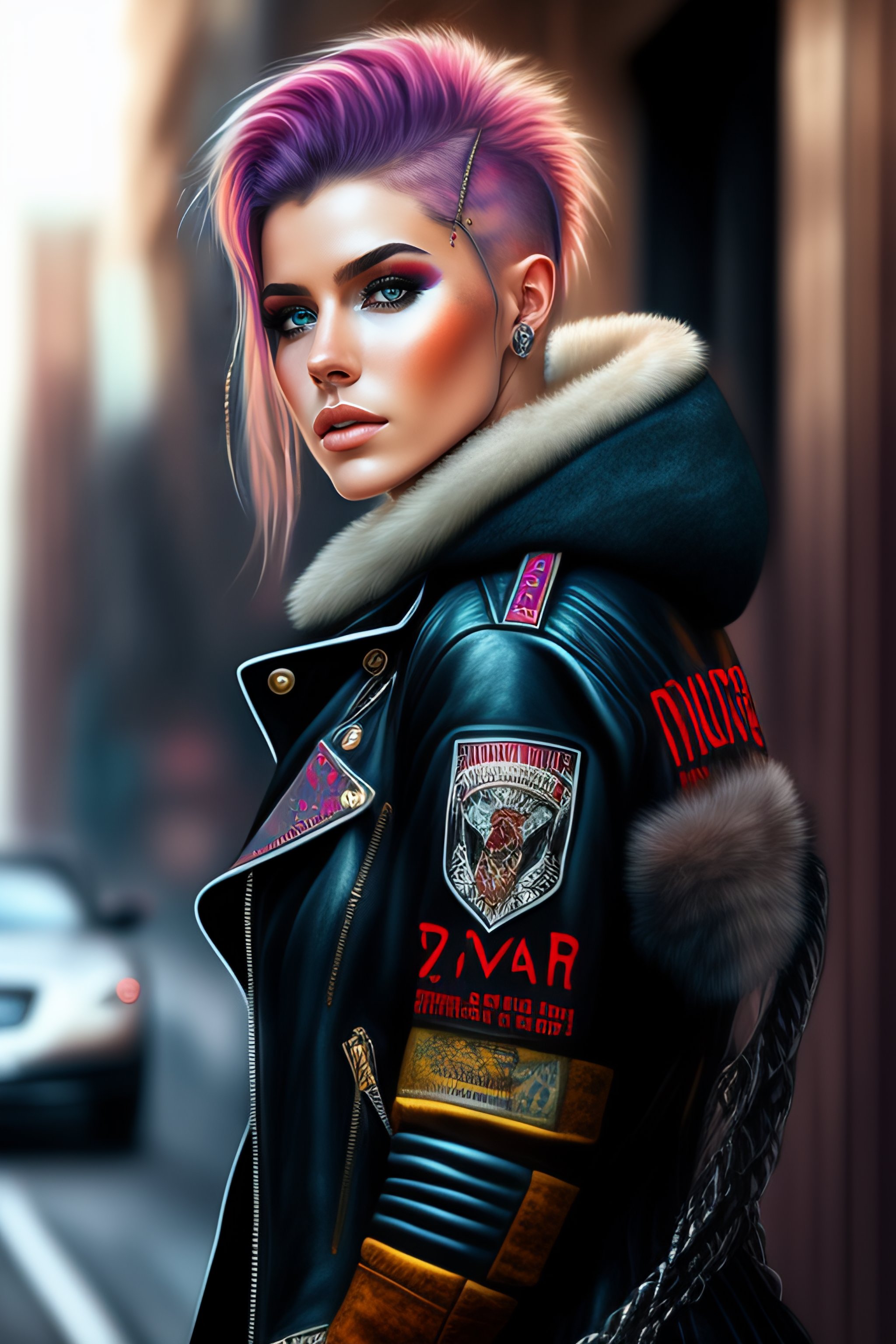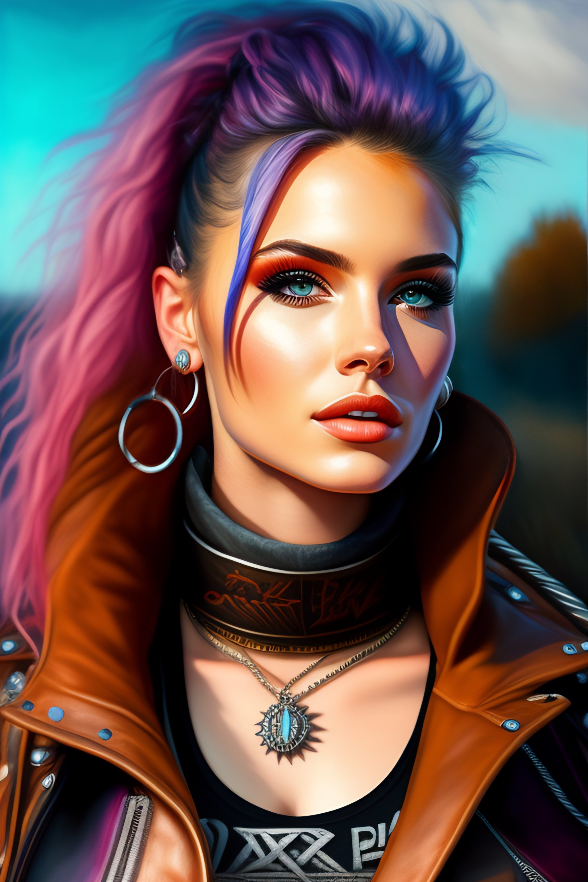 Cute punk rock girl, mad max jacket, renaissance, cables on her body, hyper realistic style, oil painting, fantasy by zivert