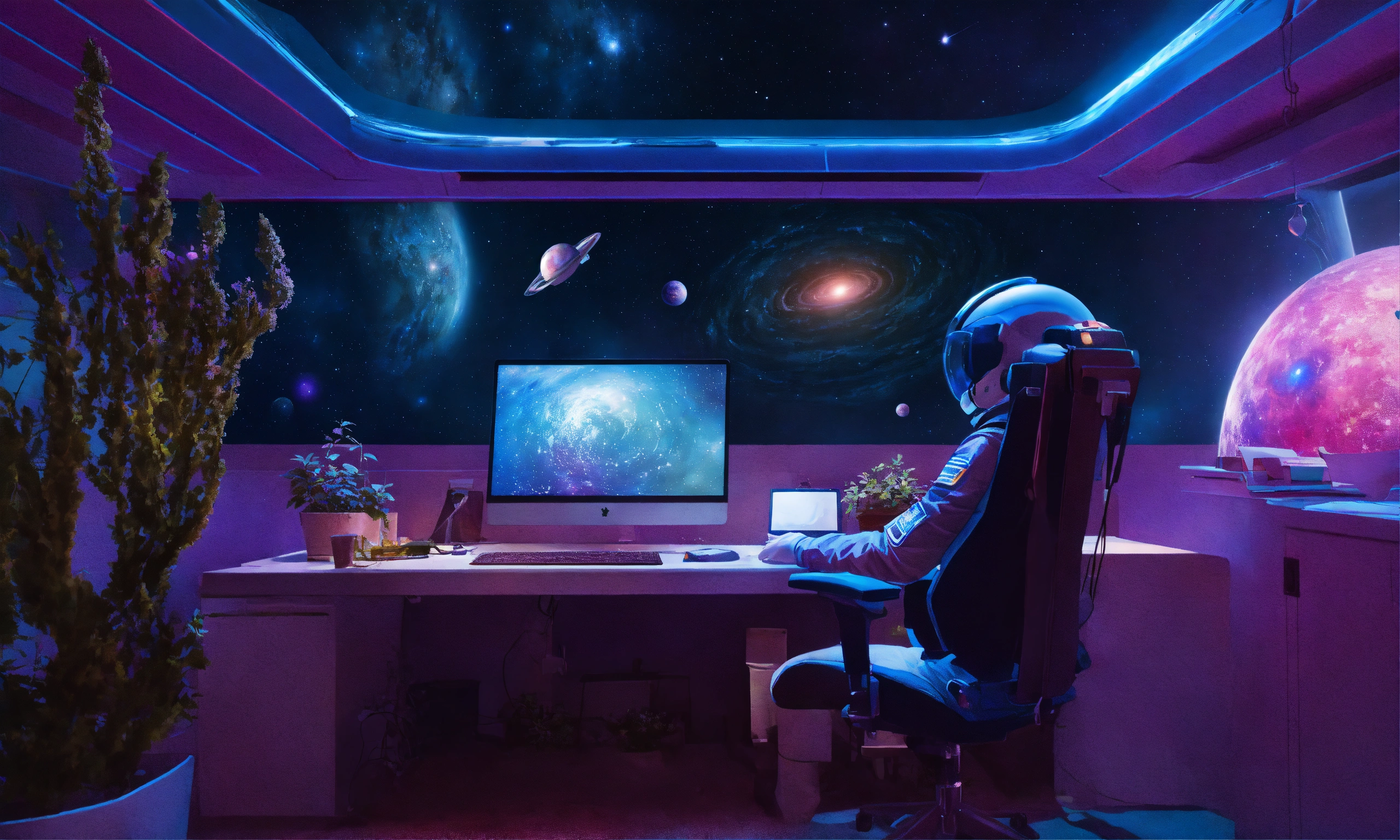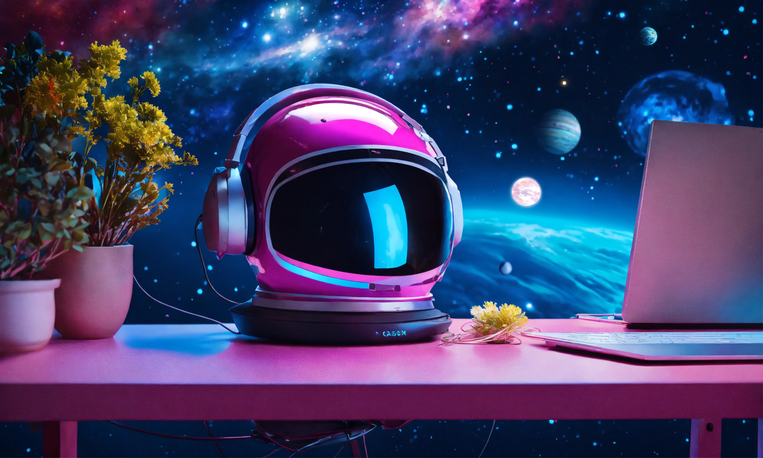 Casque de l'astronaute pas de corp posé sur un bureau ayant à l'intérieur le cosmos, une galaxie et neptune de couleur bleu ciel et nocturne avec du magenta et autour du casque des outils et des plantes en 8k