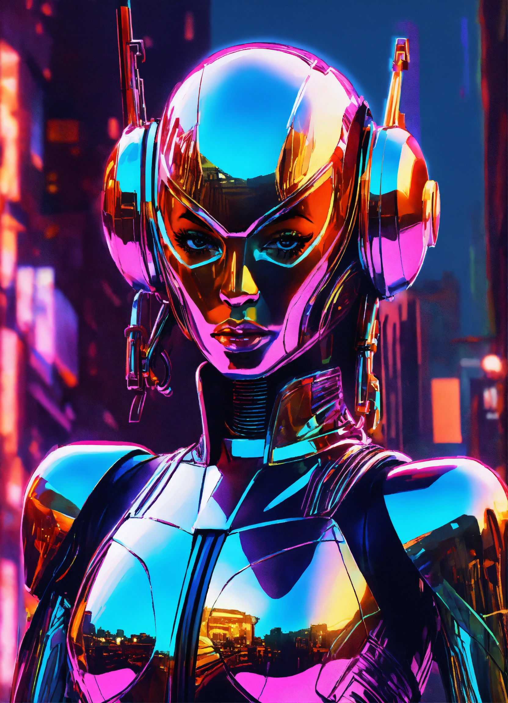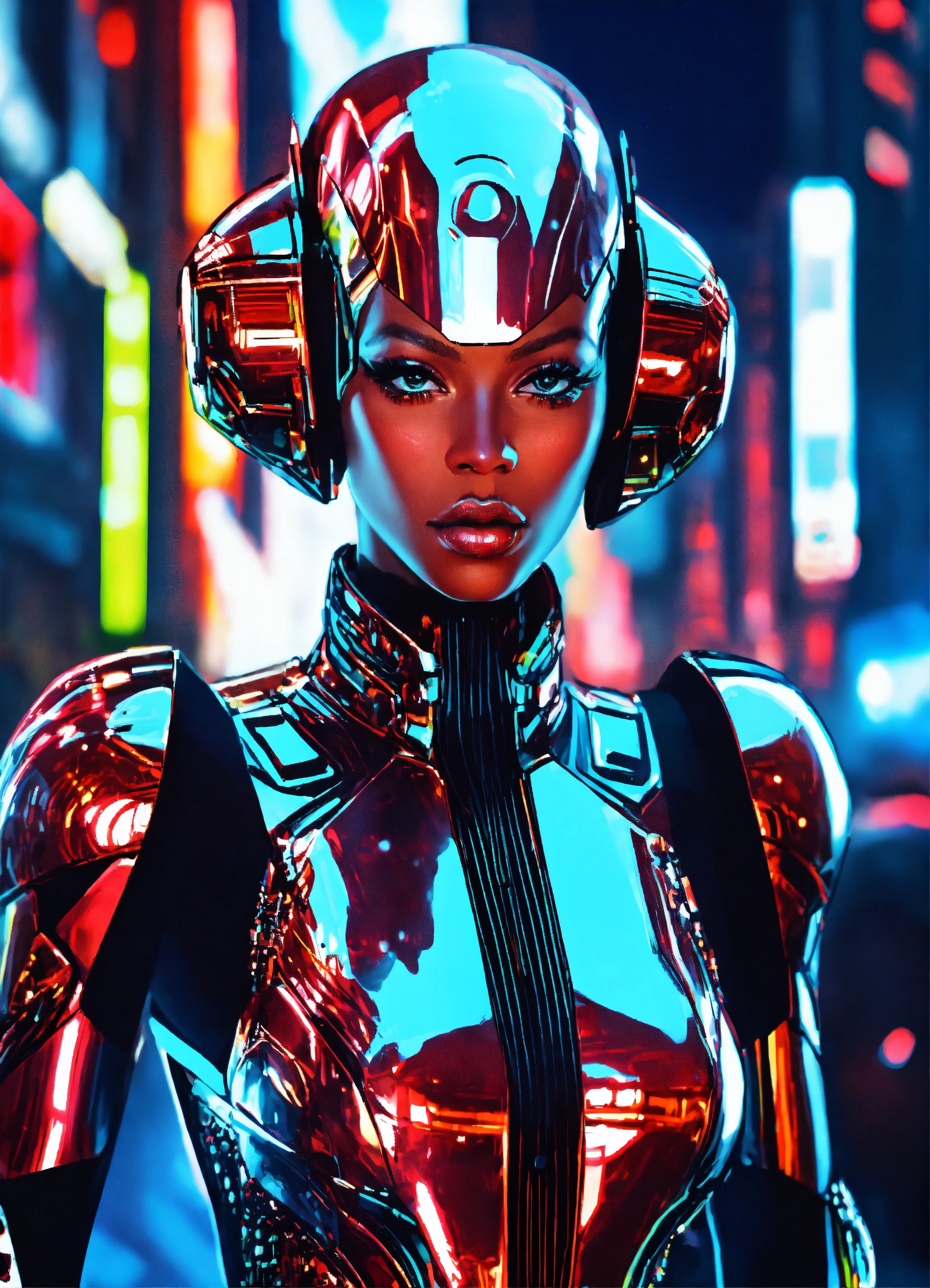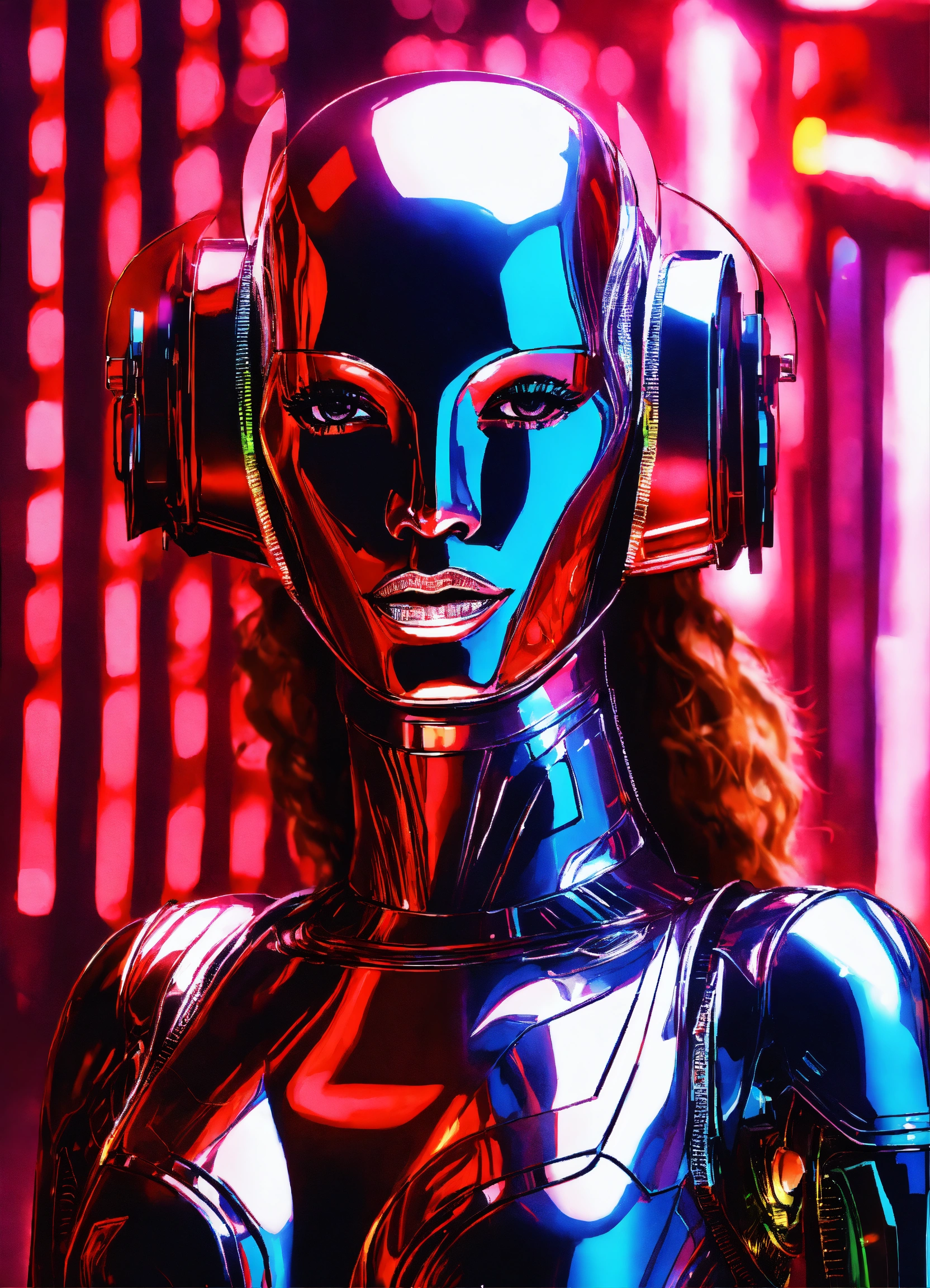 Draw beyonce as a silver futuristic robot with shiny reflective material background is a neon dark red city