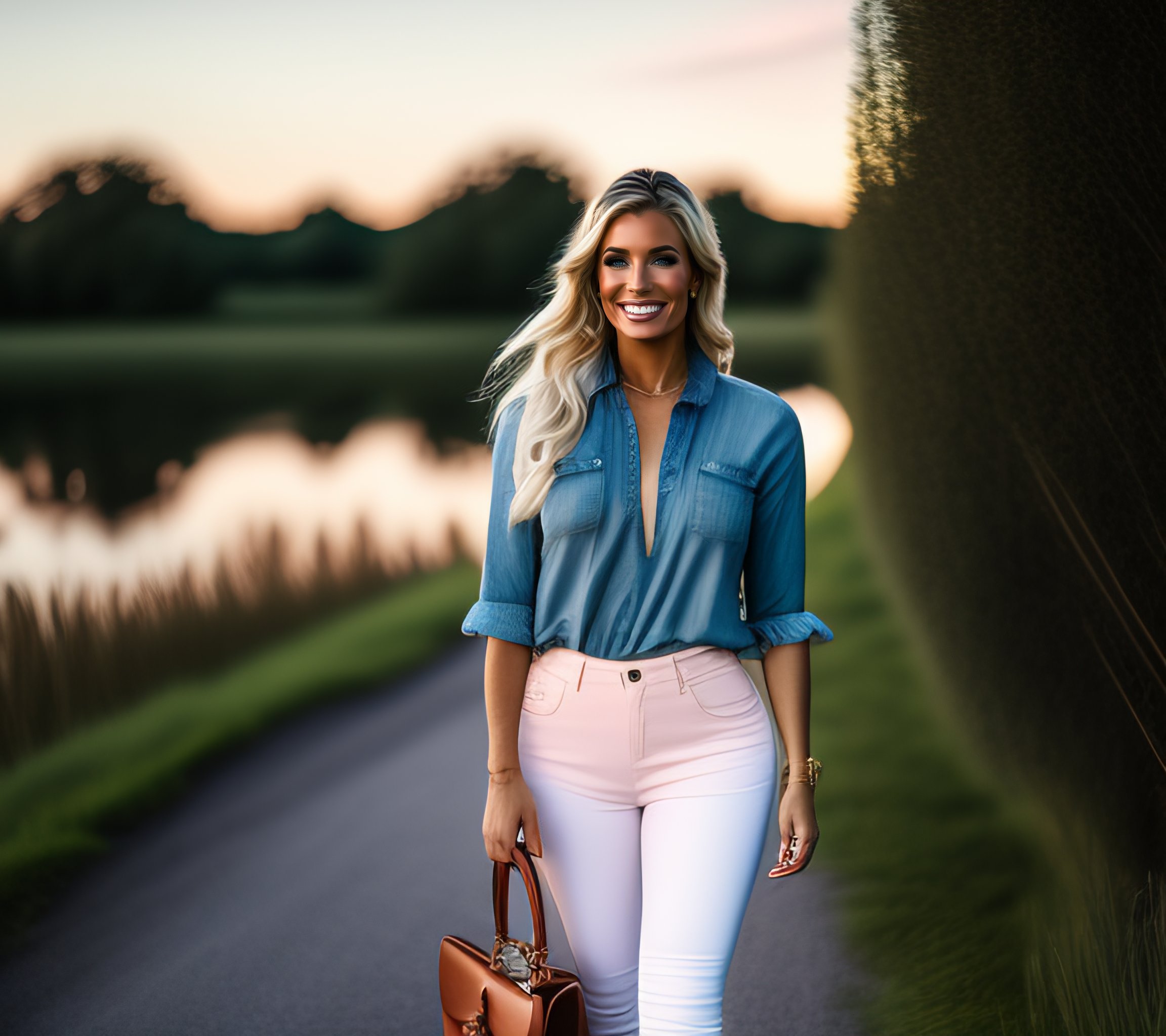 Blonde woman with large buxumous bottom jeans